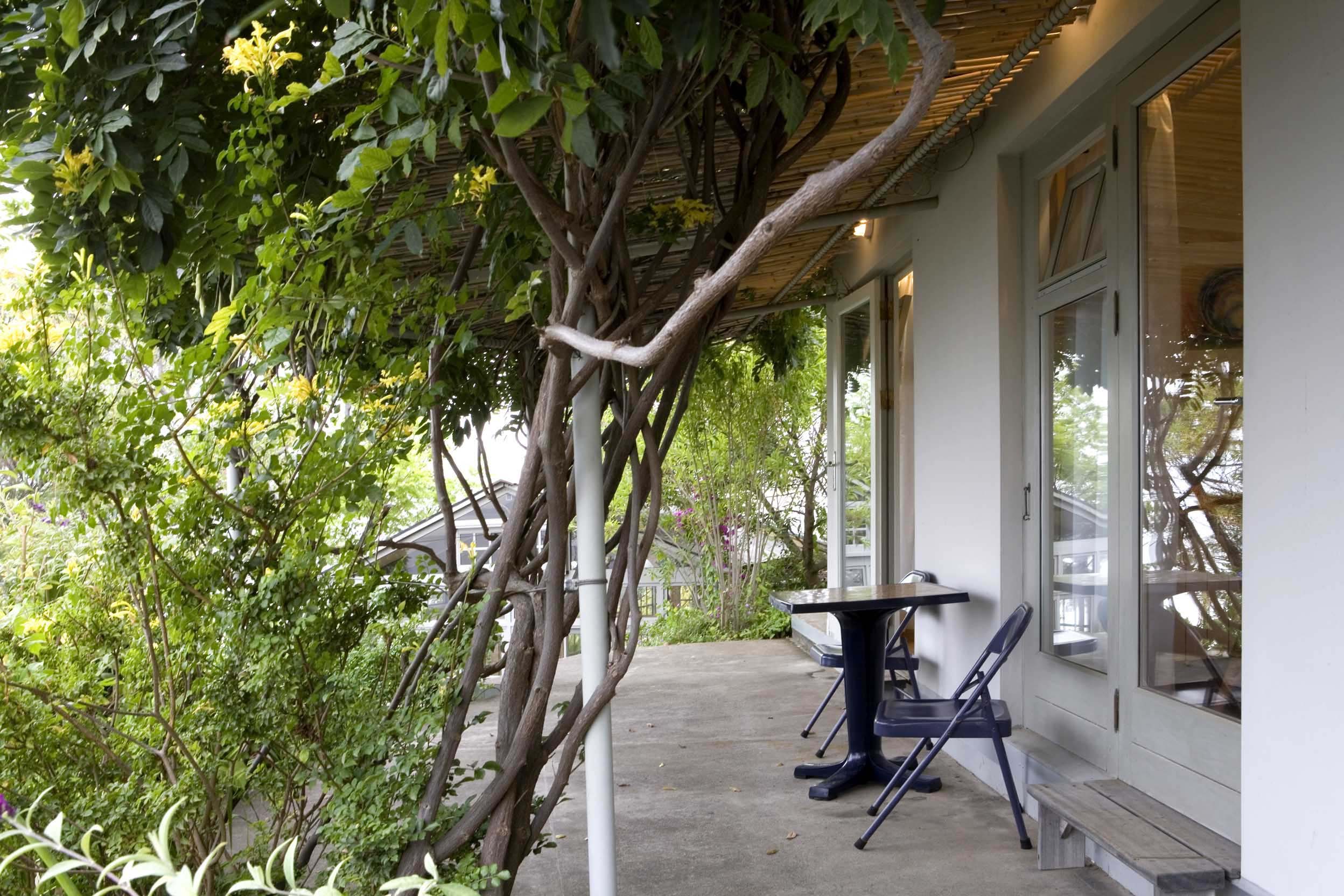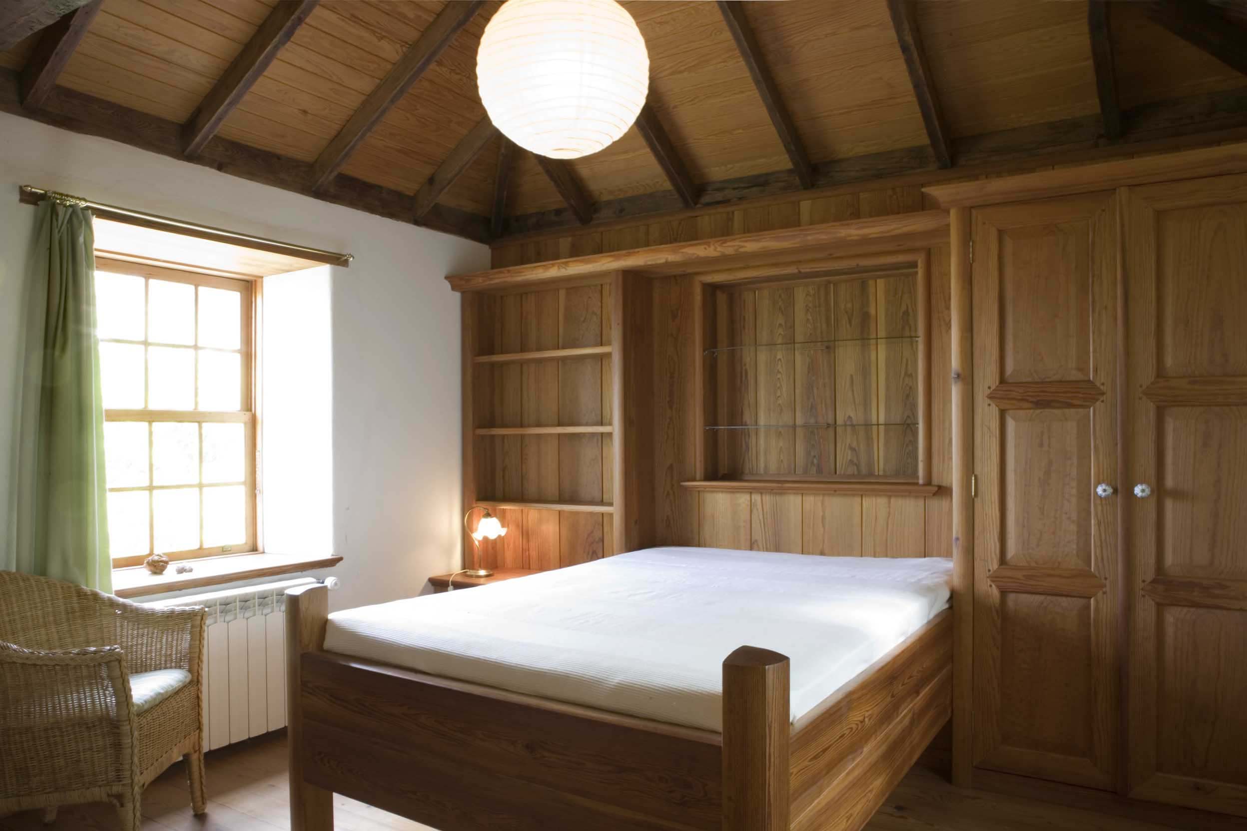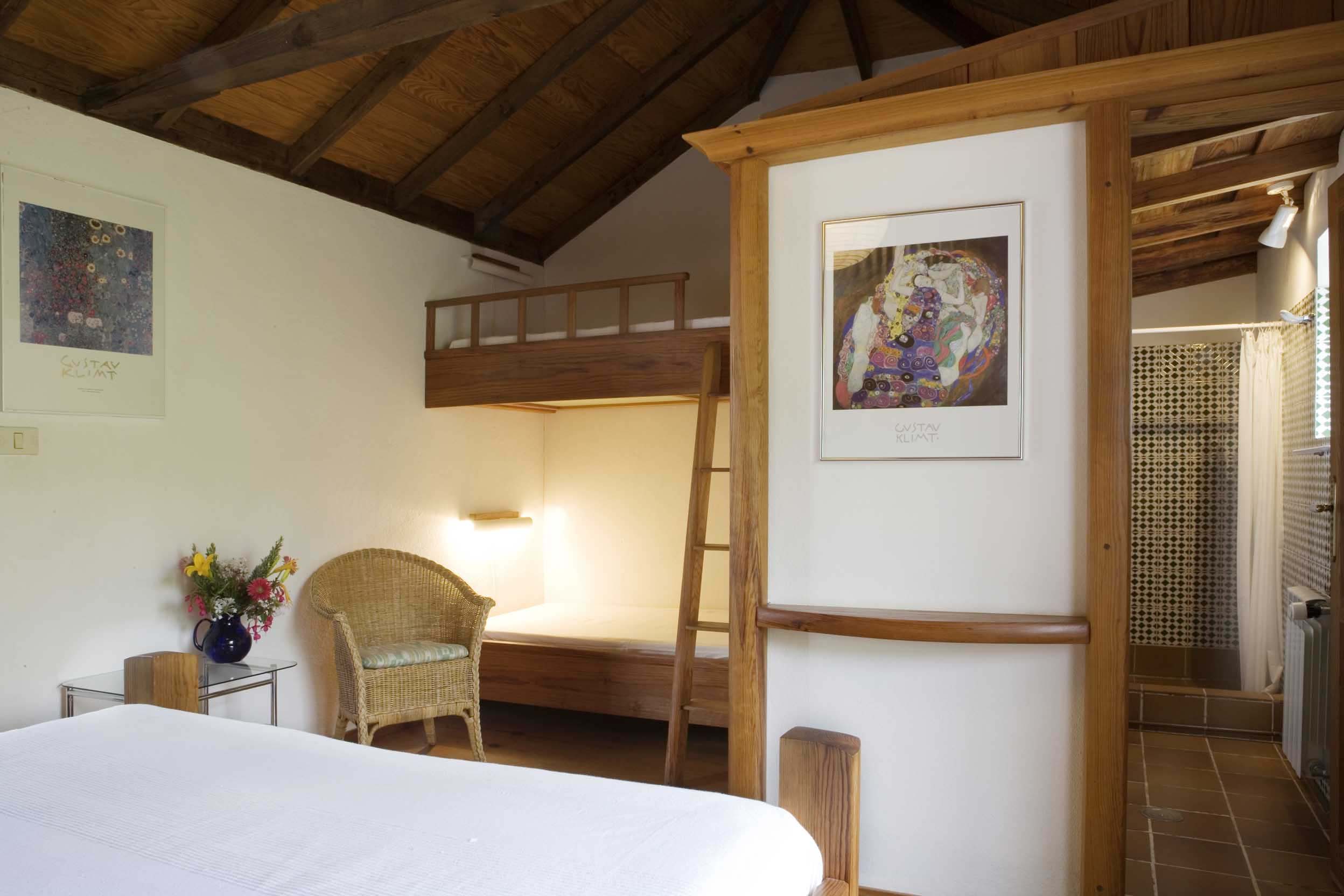 Den Mittelpunkt bildet dennoch der Gemeinschaftsraum in großzügiger Küche mit Kamin, Sitzplätzen für zwanzig Personen sowie Musik und Lesestoff. Die mit Wein überwachsene Gartenlaube als Vorplatz bietet an einer langen Tafel ebenfalls Platz für zwanzig Personen.