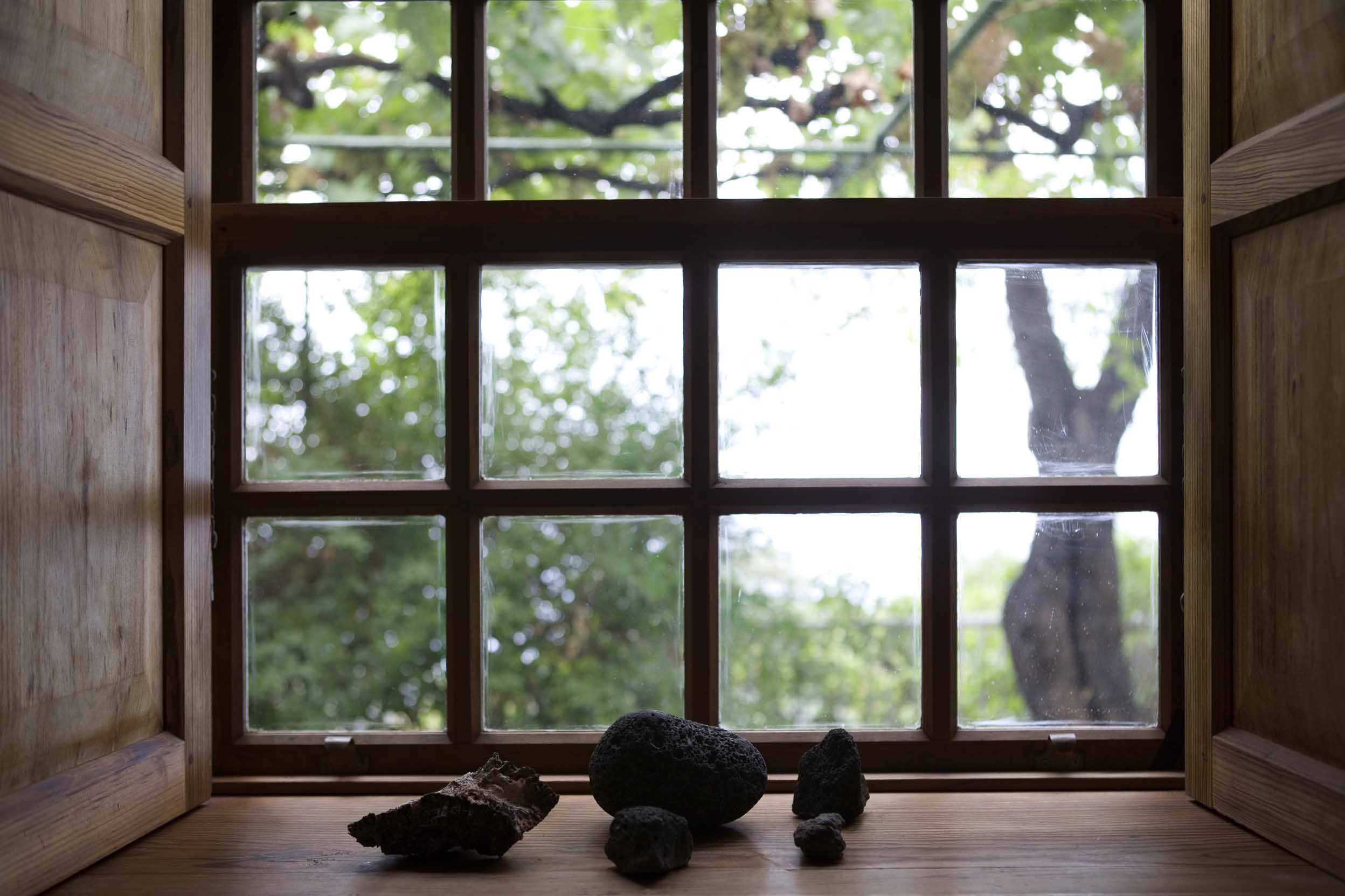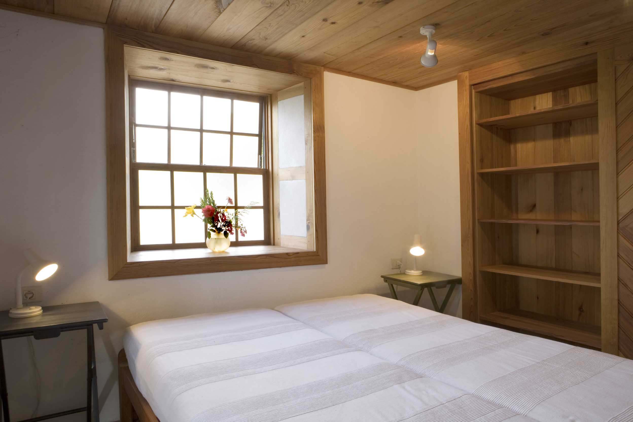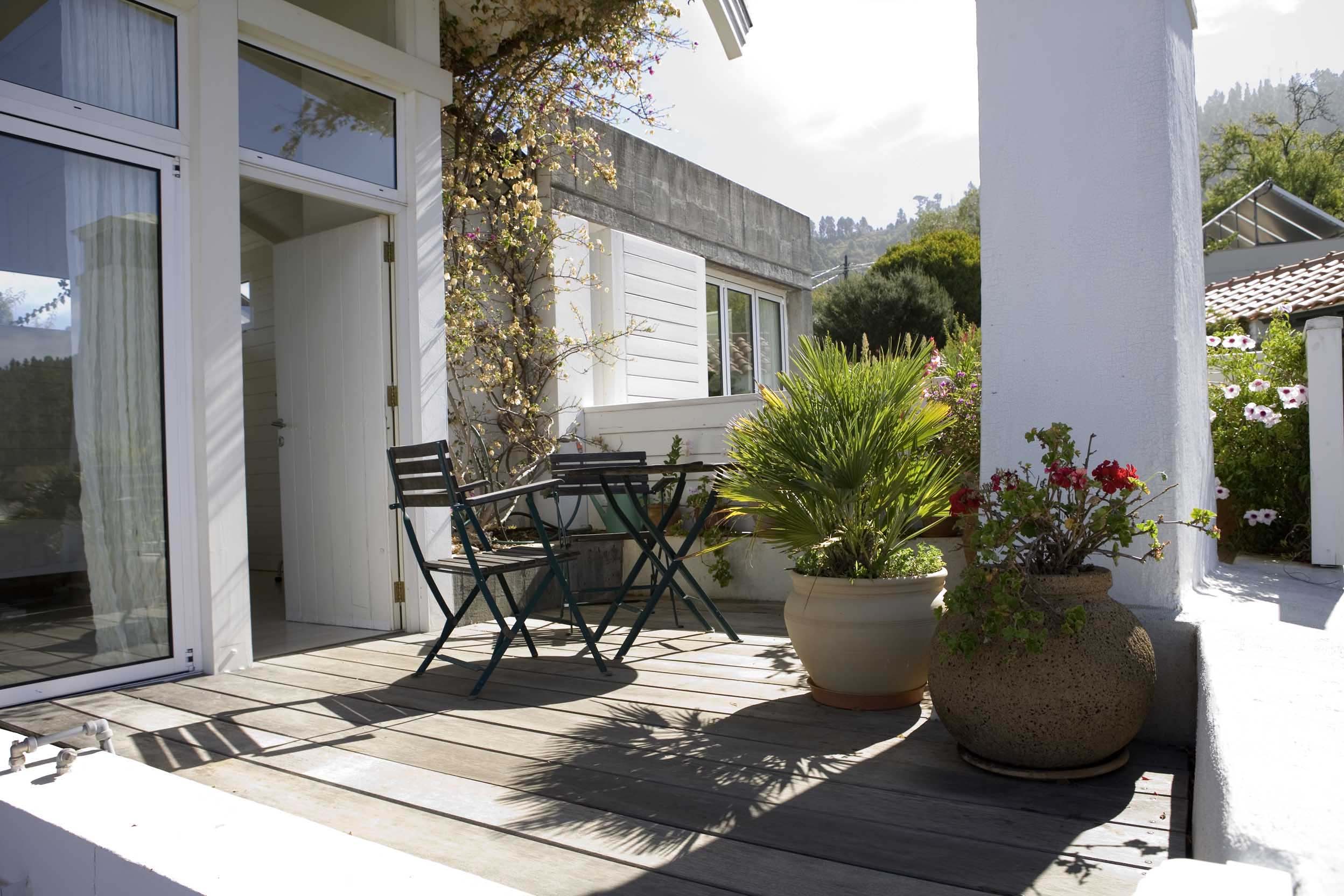 Den Mittelpunkt bildet dennoch der Gemeinschaftsraum in großzügiger Küche mit Kamin, Sitzplätzen für zwanzig Personen sowie Musik und Lesestoff. Die mit Wein überwachsene Gartenlaube als Vorplatz bietet an einer langen Tafel ebenfalls Platz für zwanzig Personen.