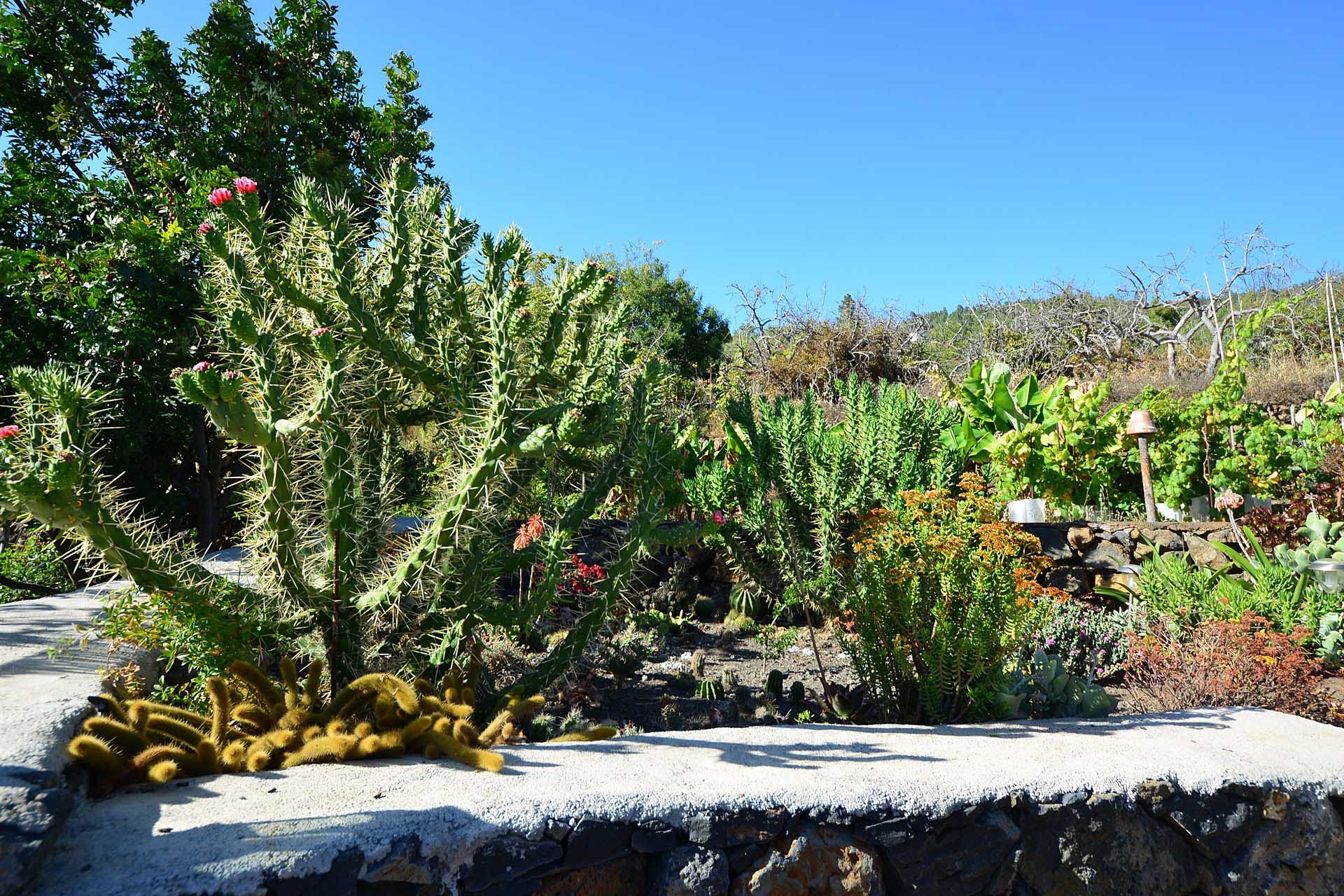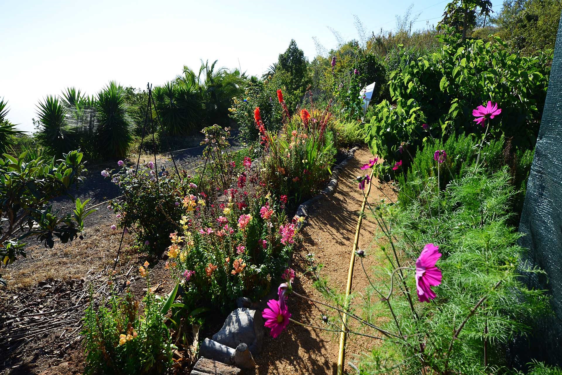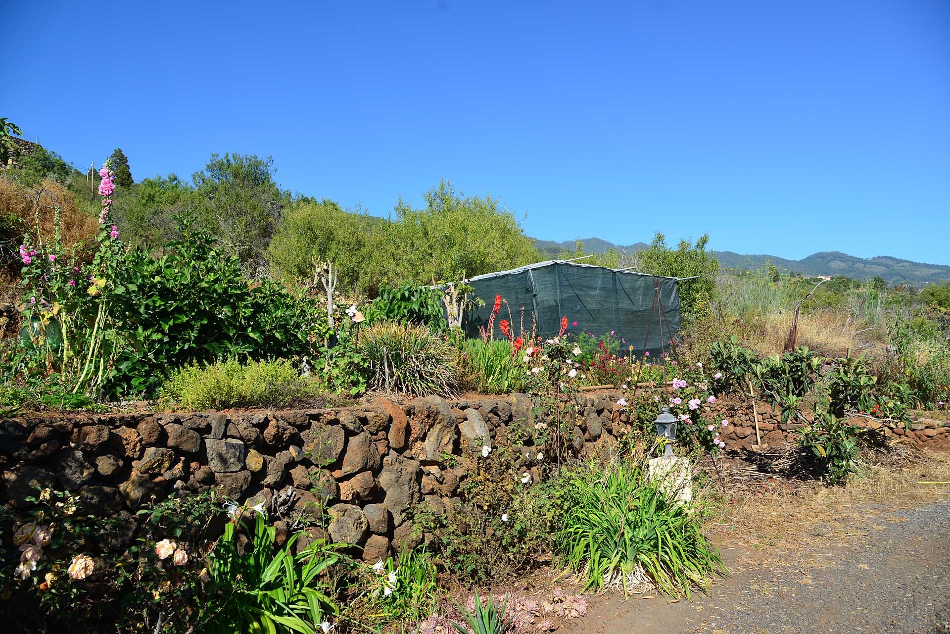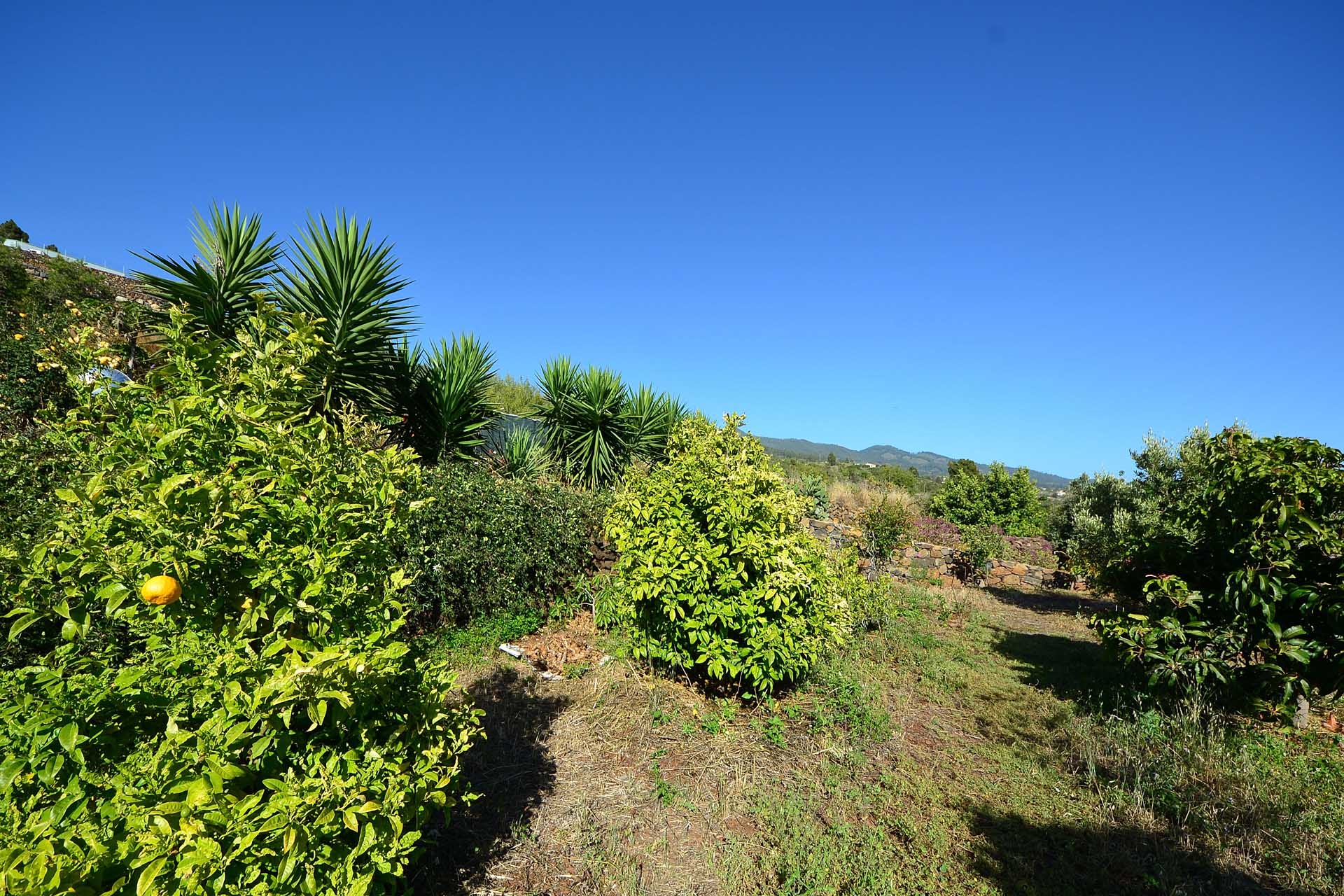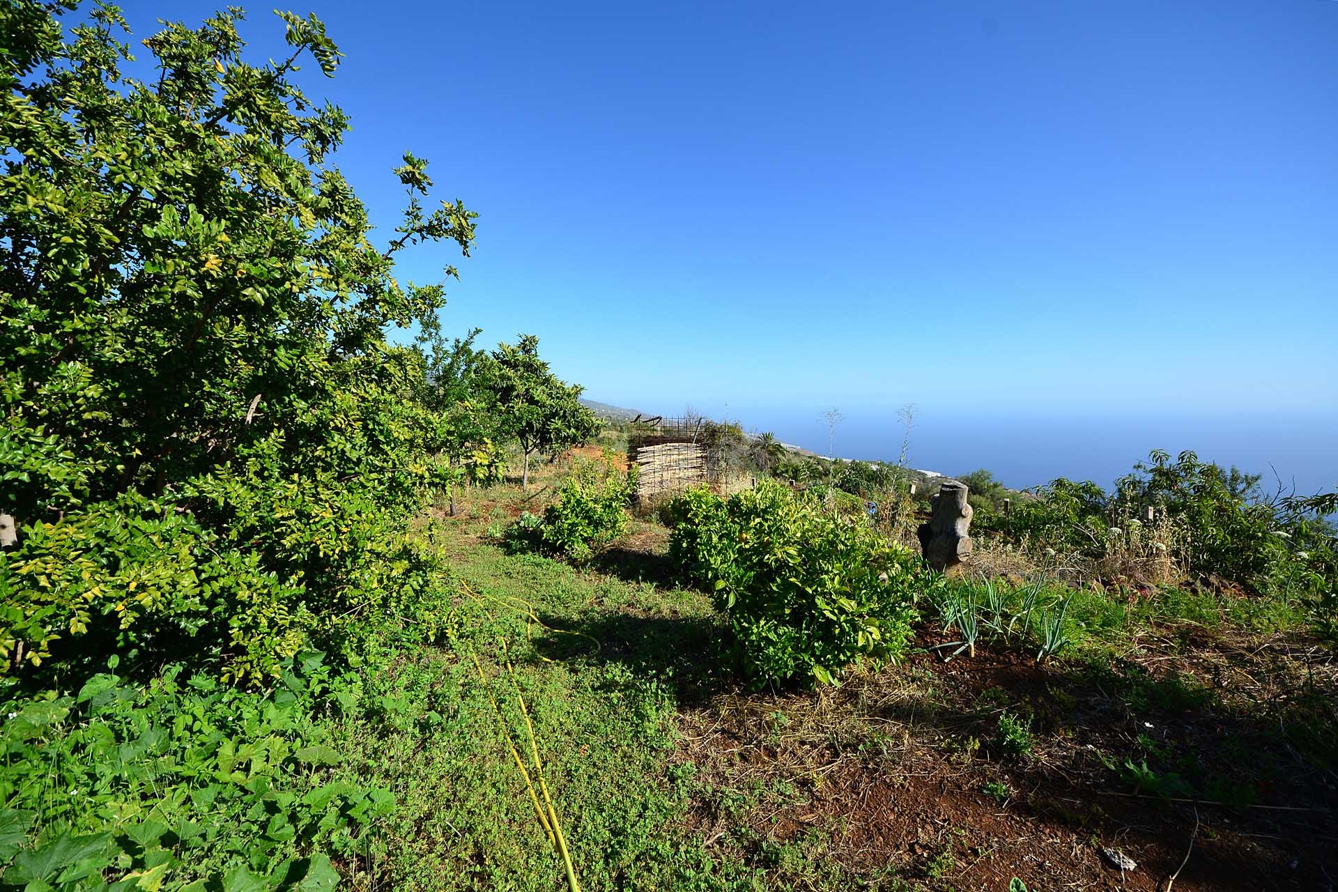 Das Grundstück lässt das Herz eines jeden Gartenfreundes höher schlagen: Der Garten wurde auf wenigen, langgestreckten und ebenen Terrassen angelegt, so dass er einfach zu bewirtschaften ist und von überall einen herrlichen Blick auf den Atlantik bietet. Gehen Sie in ihrem eigenen Garten spazieren, verweilen Sie zwischen subtropischen Obstbäumen, Palmen und botanischen Raritäten aus aller Welt und genießen Sie die Aussicht auf die Insel und das Meer. Der Garten wurde von einem deutschen Landwirt vorbildlich kultiviert und der Boden mit viel Humus besonders fruchtbar gemacht. Für Gemüse und Erdbeeren wurde ein Bereich rundum mit halbdurchlässigem speziellem Beschattungsgewebe gegen allzu harte Sonneneinstrahlung und Fressfeinde wie Amseln, Eidechsen und Kaninchen geschützt. Selbstverständlich wurde und wird er ausschließlich ökologisch bewirtschaftet. Wer möchte, kann sich von diesem Grundstück gut selbst versorgen.