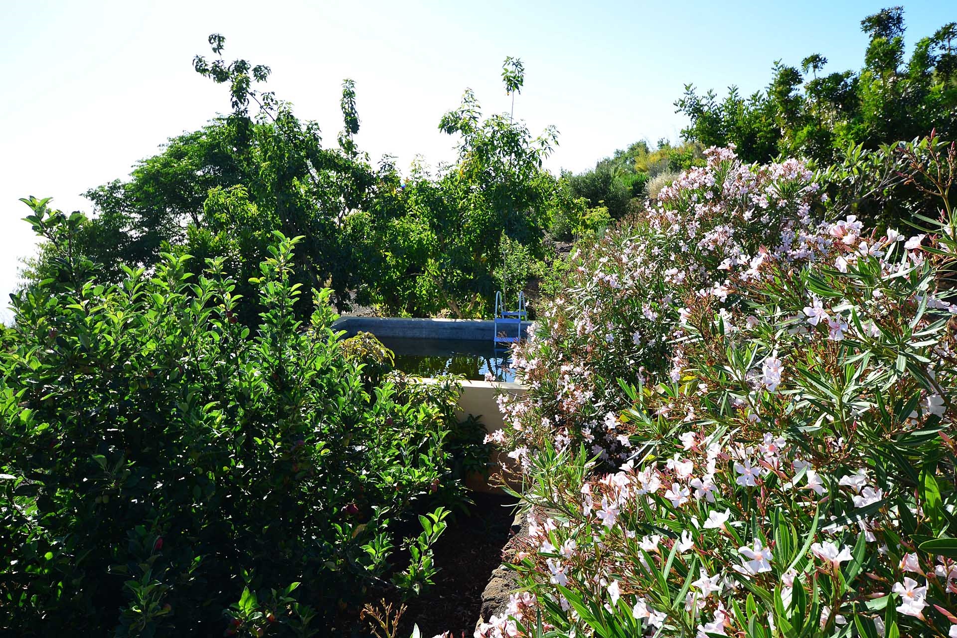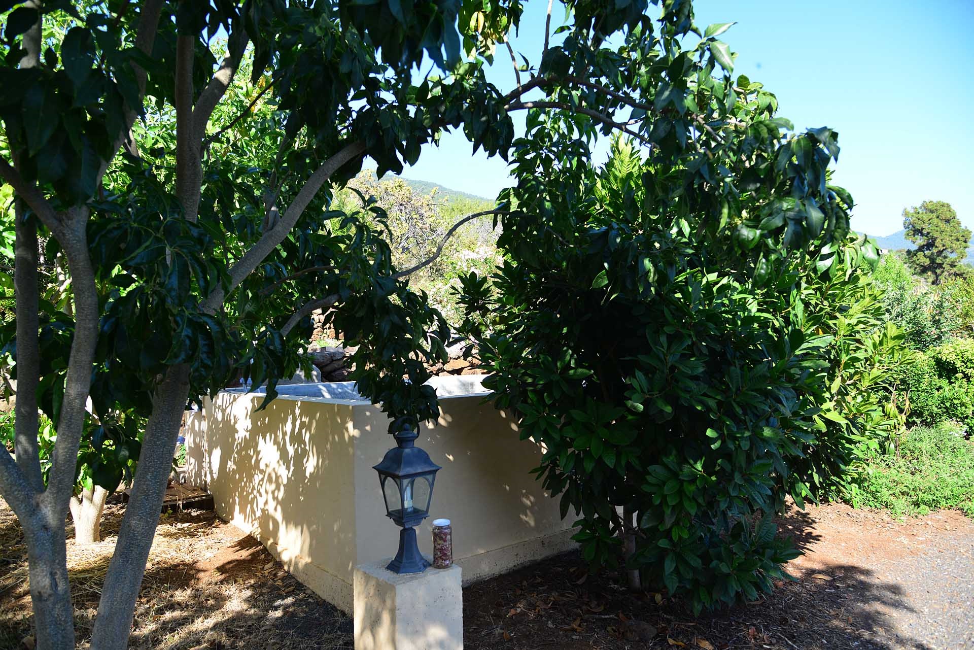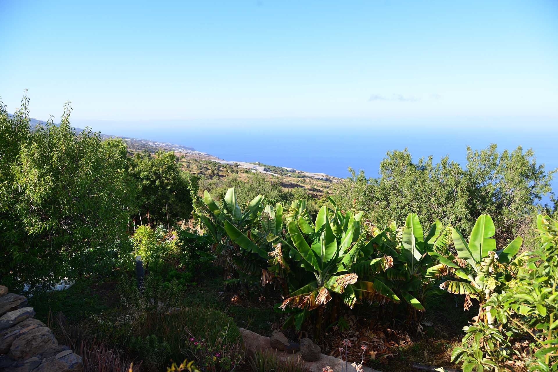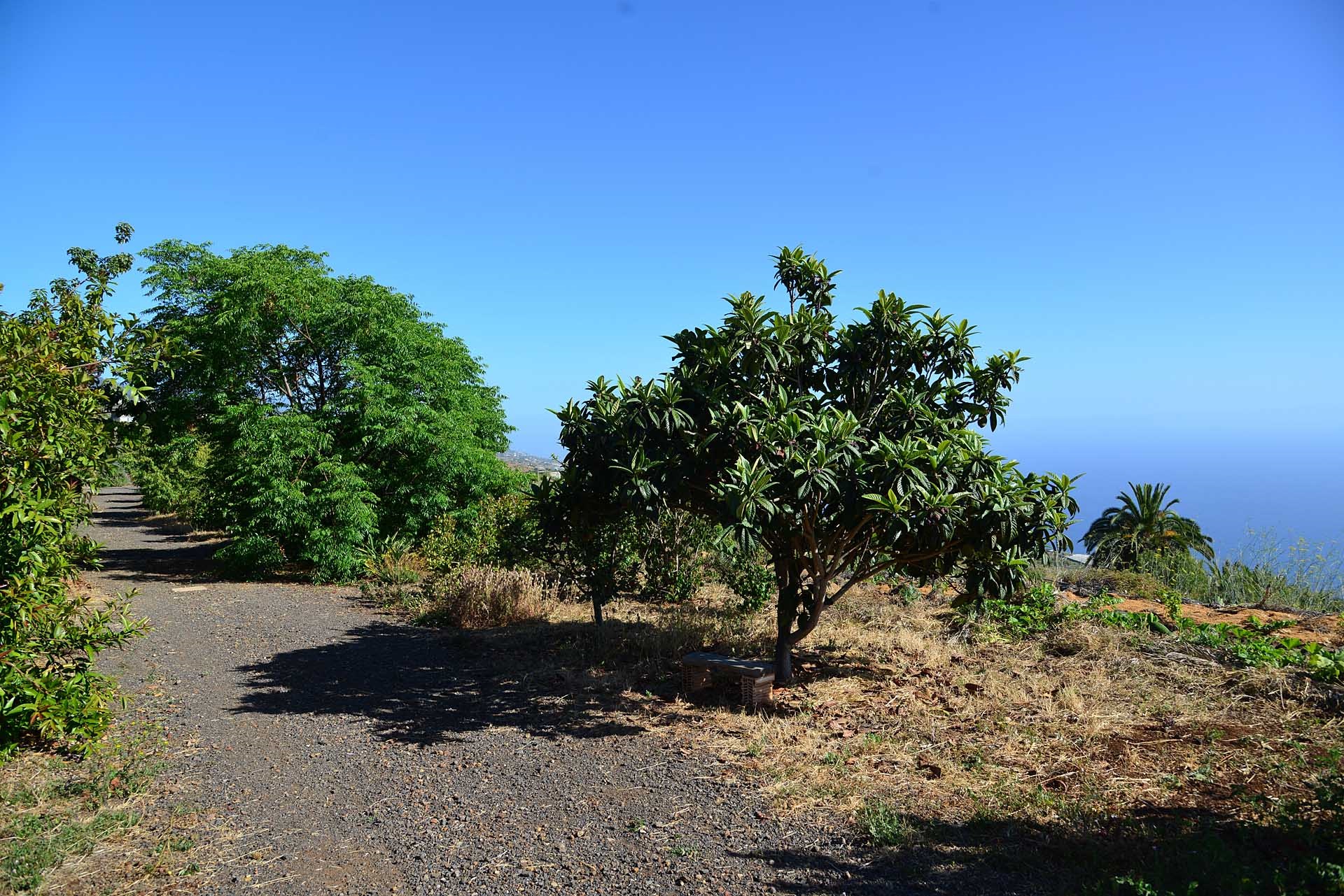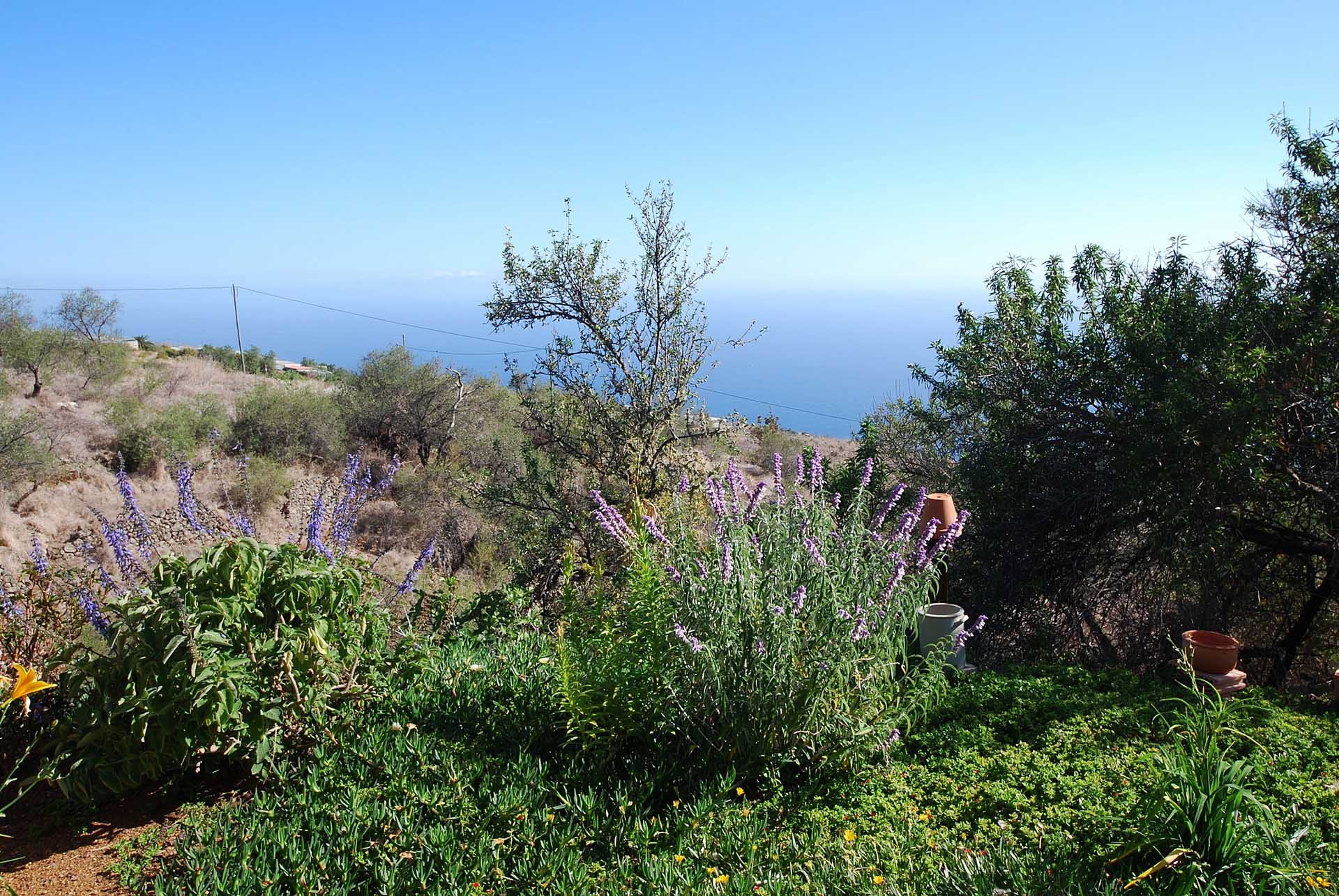 Das Grundstück lässt das Herz eines jeden Gartenfreundes höher schlagen: Der Garten wurde auf wenigen, langgestreckten und ebenen Terrassen angelegt, so dass er einfach zu bewirtschaften ist und von überall einen herrlichen Blick auf den Atlantik bietet. Gehen Sie in ihrem eigenen Garten spazieren, verweilen Sie zwischen subtropischen Obstbäumen, Palmen und botanischen Raritäten aus aller Welt und genießen Sie die Aussicht auf die Insel und das Meer. Der Garten wurde von einem deutschen Landwirt vorbildlich kultiviert und der Boden mit viel Humus besonders fruchtbar gemacht. Für Gemüse und Erdbeeren wurde ein Bereich rundum mit halbdurchlässigem speziellem Beschattungsgewebe gegen allzu harte Sonneneinstrahlung und Fressfeinde wie Amseln, Eidechsen und Kaninchen geschützt. Selbstverständlich wurde und wird er ausschließlich ökologisch bewirtschaftet. Wer möchte, kann sich von diesem Grundstück gut selbst versorgen.