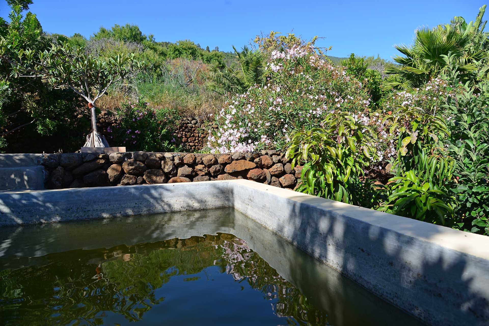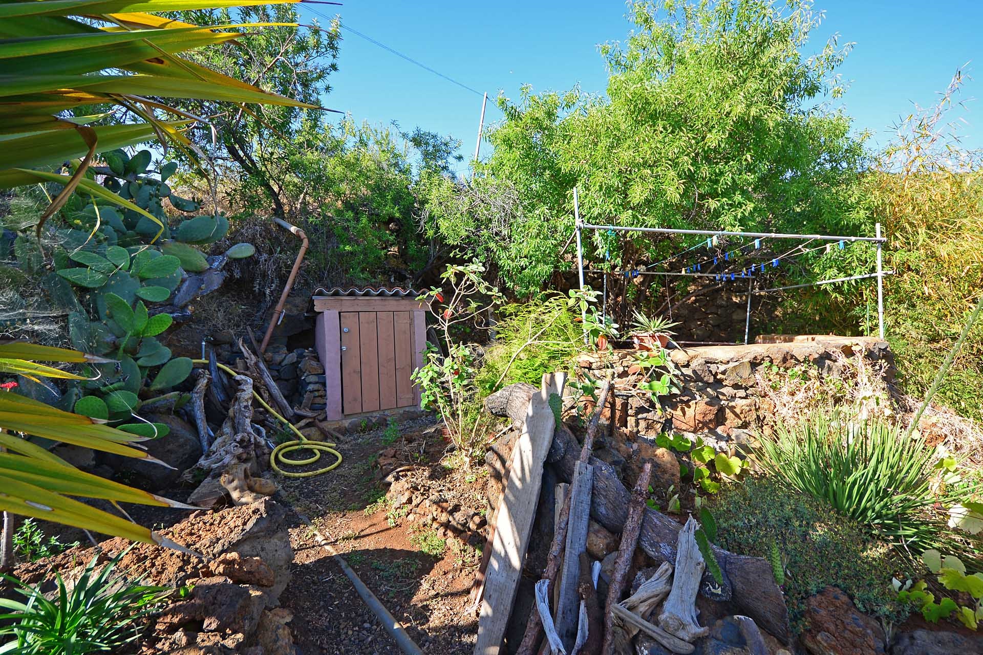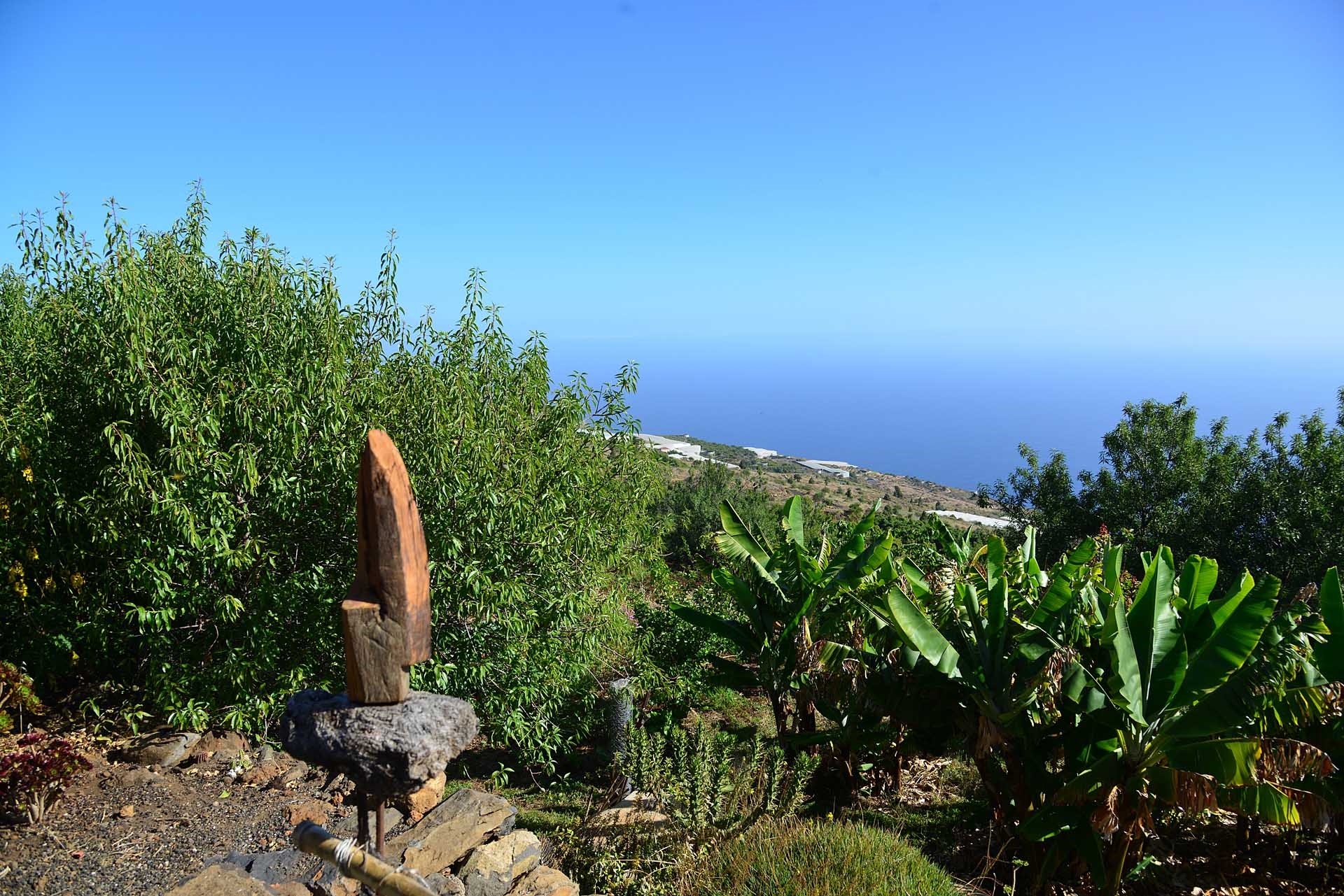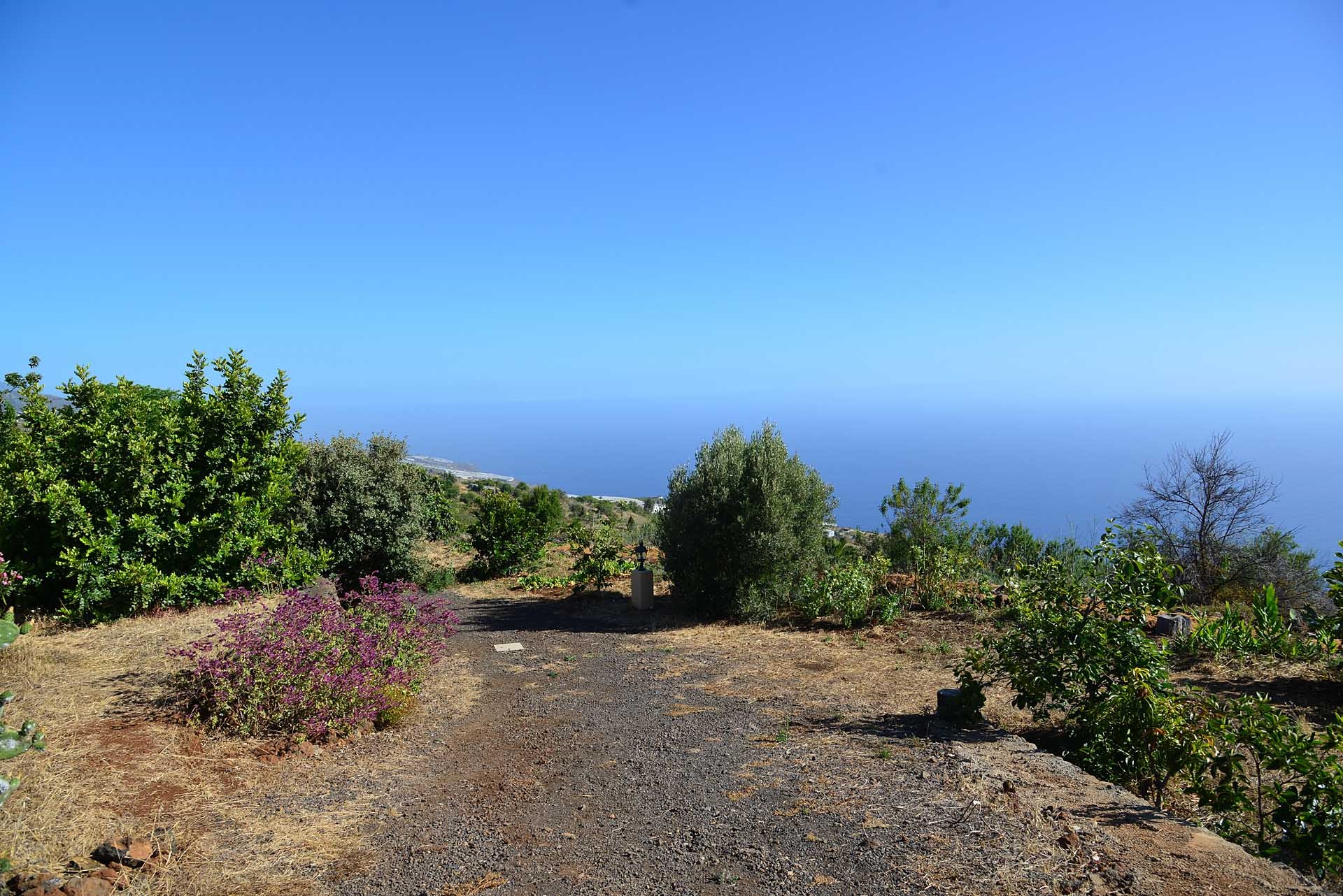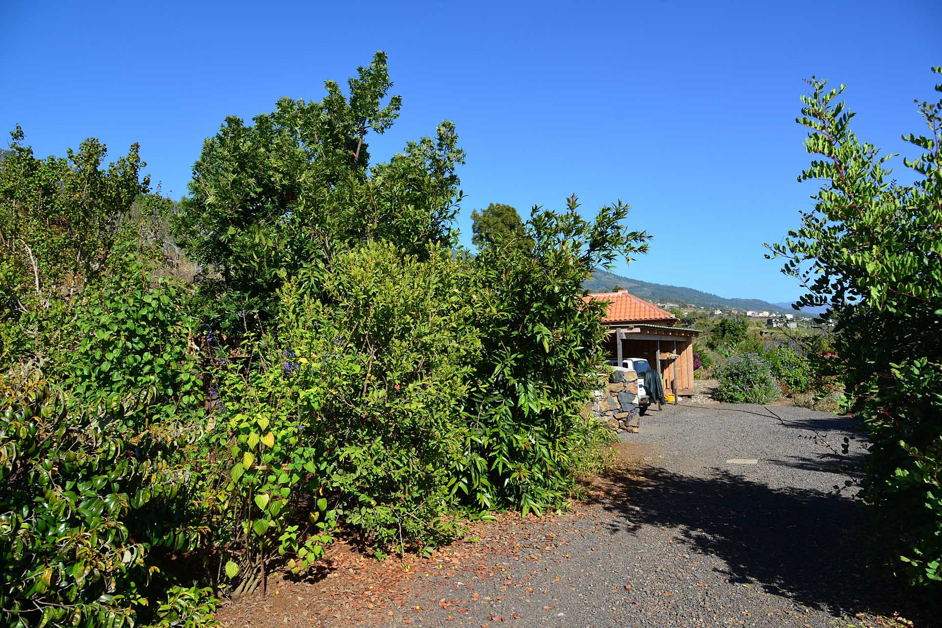 Das Grundstück lässt das Herz eines jeden Gartenfreundes höher schlagen: Der Garten wurde auf wenigen, langgestreckten und ebenen Terrassen angelegt, so dass er einfach zu bewirtschaften ist und von überall einen herrlichen Blick auf den Atlantik bietet. Gehen Sie in ihrem eigenen Garten spazieren, verweilen Sie zwischen subtropischen Obstbäumen, Palmen und botanischen Raritäten aus aller Welt und genießen Sie die Aussicht auf die Insel und das Meer. Der Garten wurde von einem deutschen Landwirt vorbildlich kultiviert und der Boden mit viel Humus besonders fruchtbar gemacht. Für Gemüse und Erdbeeren wurde ein Bereich rundum mit halbdurchlässigem speziellem Beschattungsgewebe gegen allzu harte Sonneneinstrahlung und Fressfeinde wie Amseln, Eidechsen und Kaninchen geschützt. Selbstverständlich wurde und wird er ausschließlich ökologisch bewirtschaftet. Wer möchte, kann sich von diesem Grundstück gut selbst versorgen.