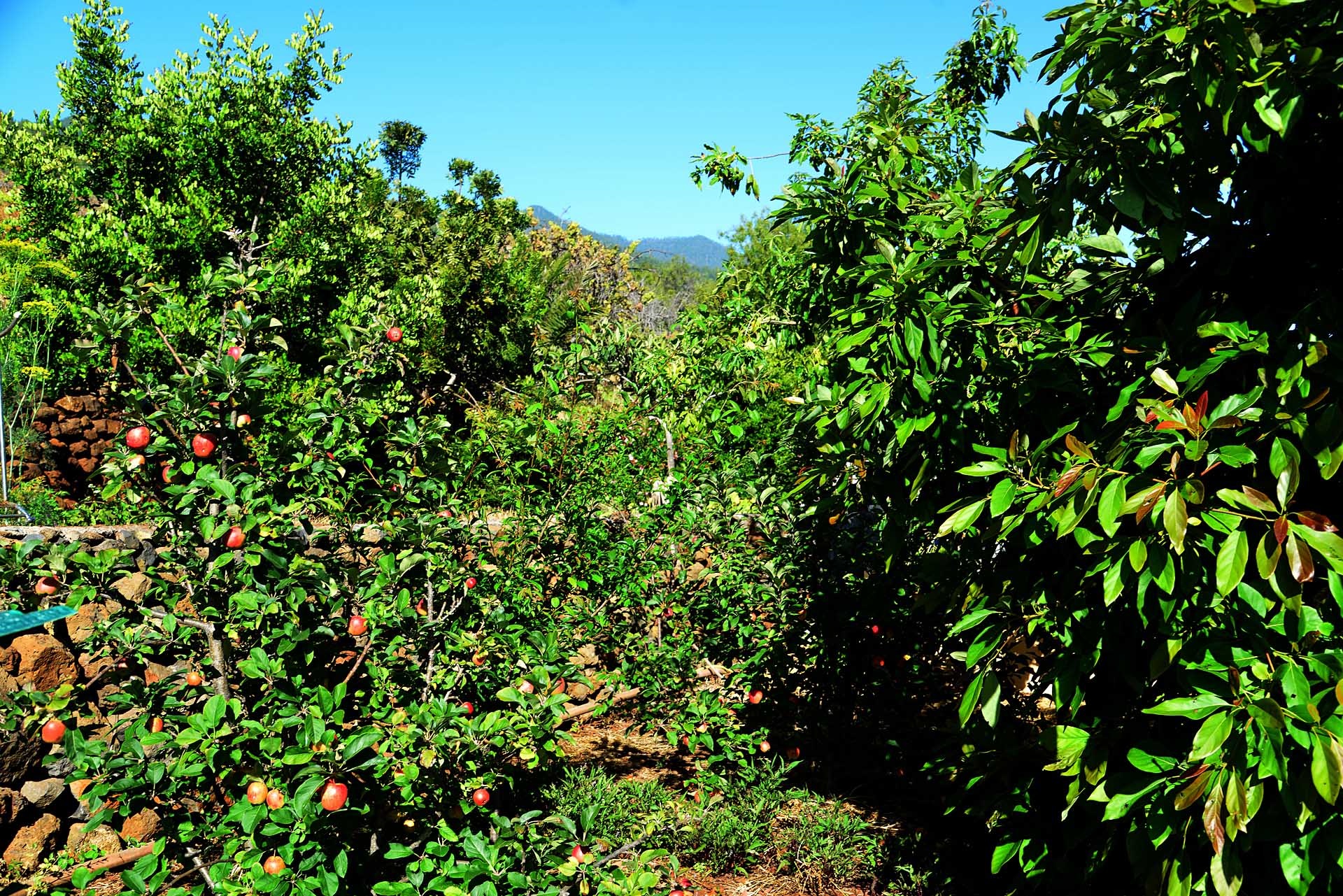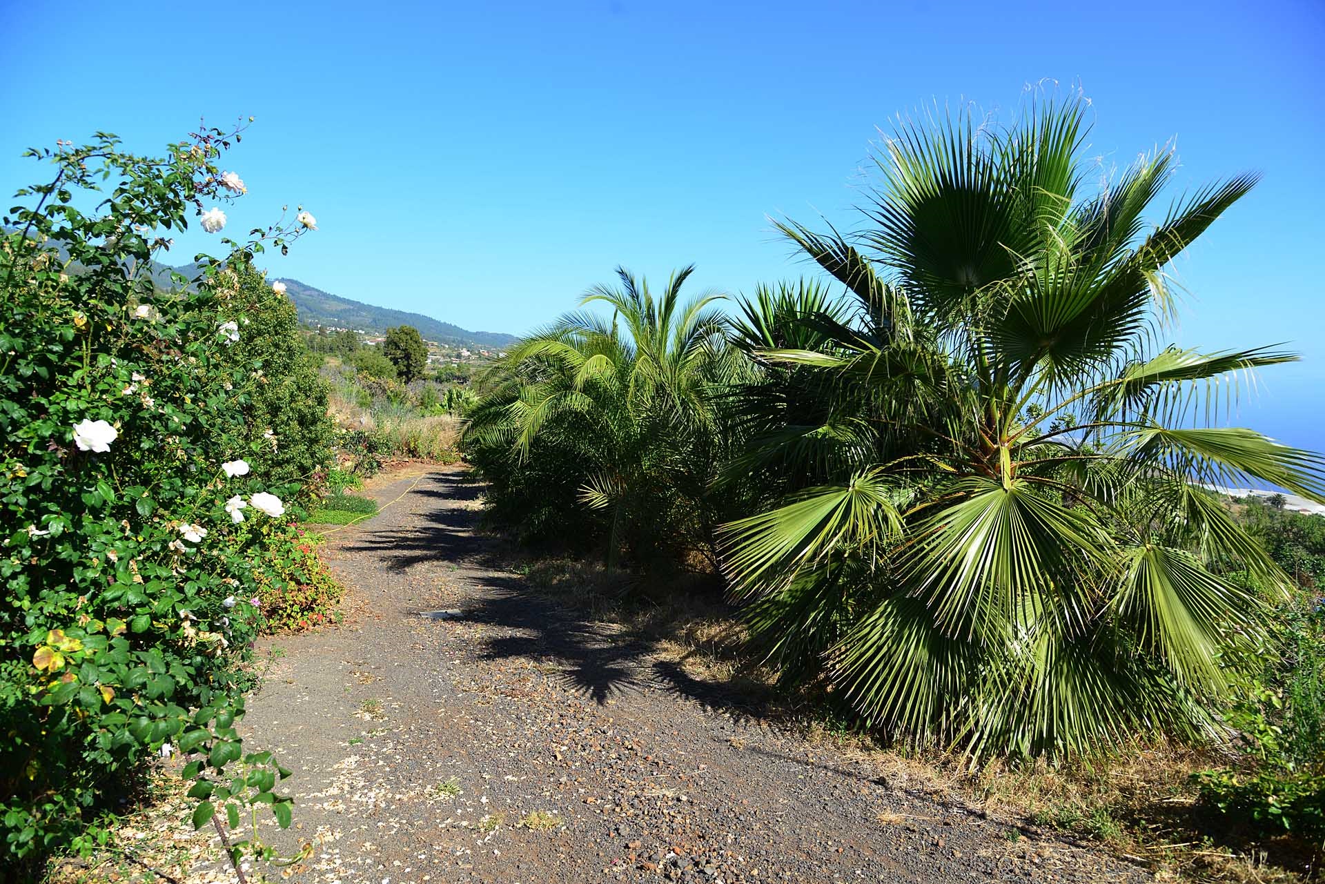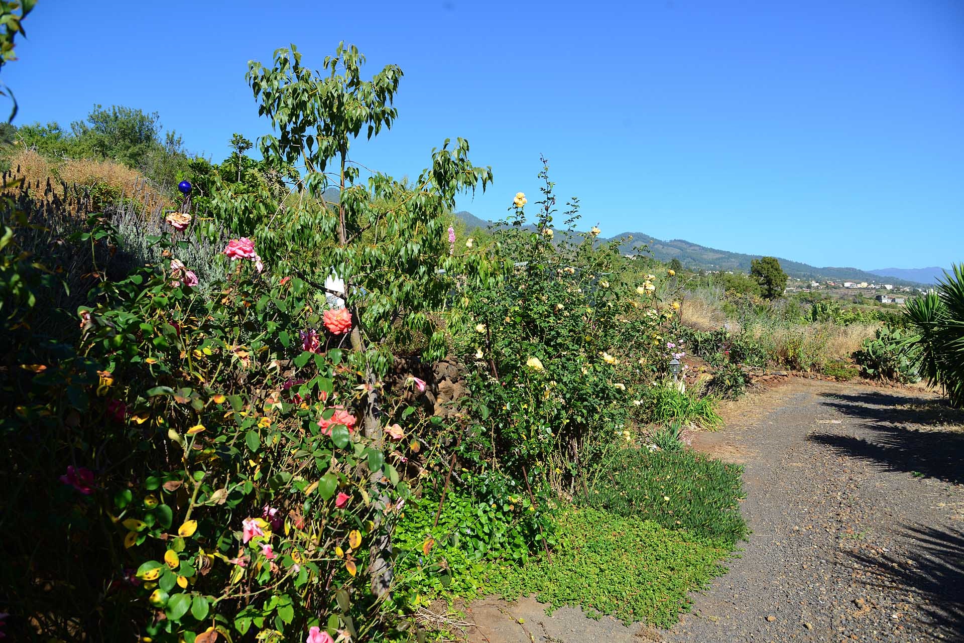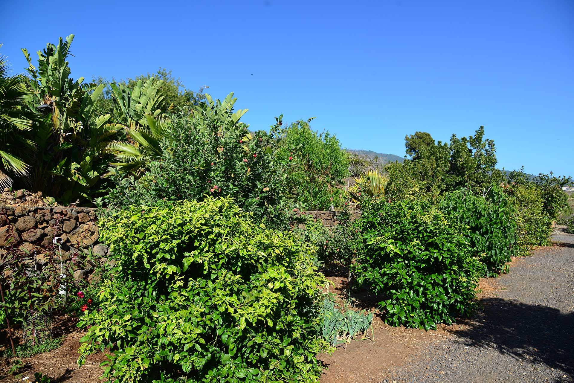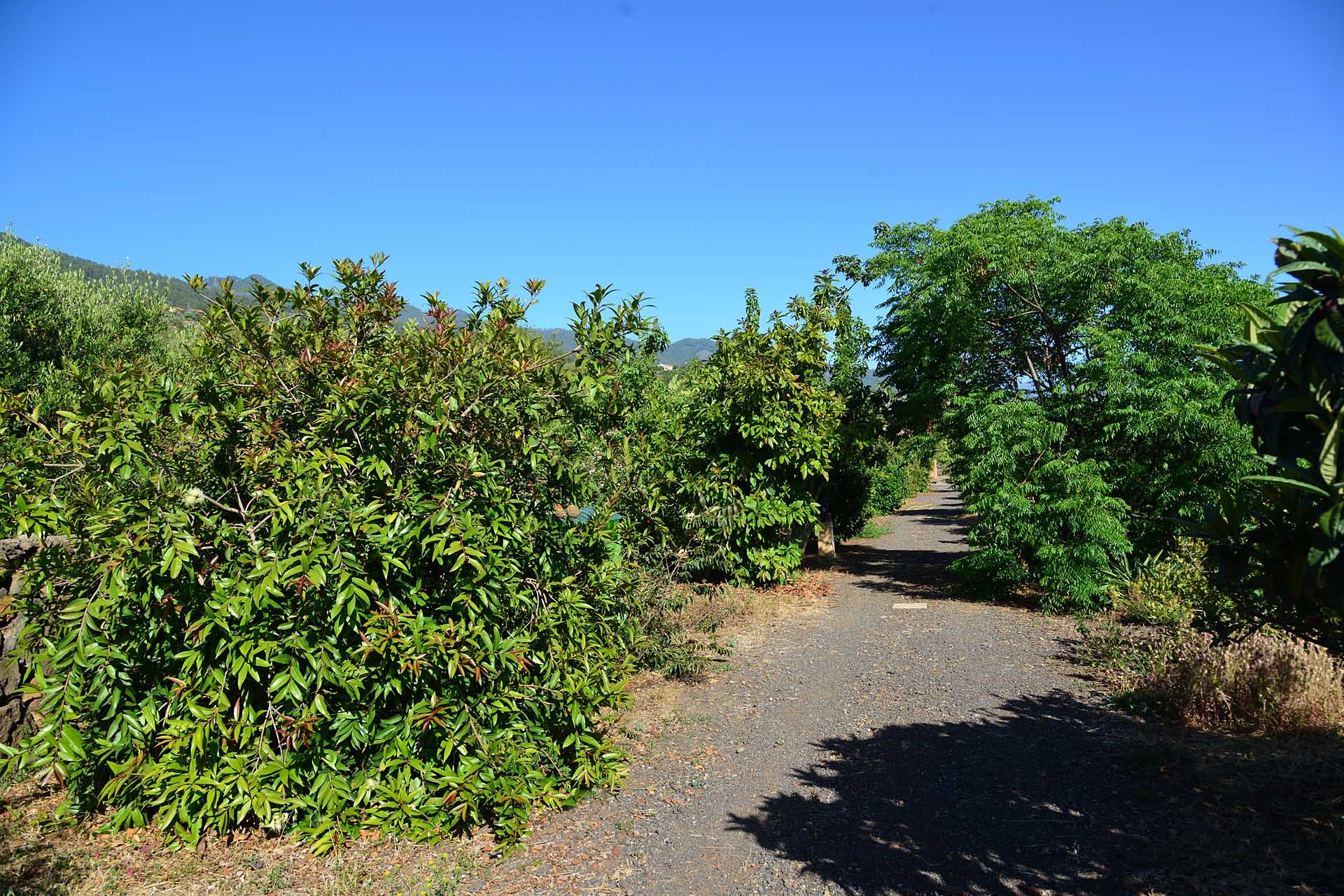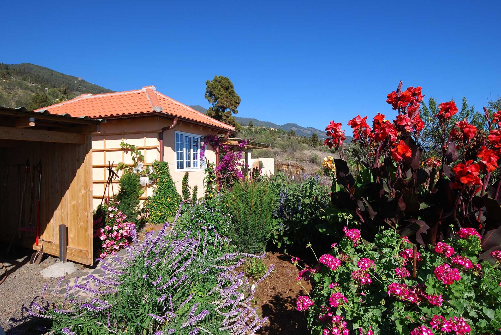 Das Grundstück lässt das Herz eines jeden Gartenfreundes höher schlagen: Der Garten wurde auf wenigen, langgestreckten und ebenen Terrassen angelegt, so dass er einfach zu bewirtschaften ist und von überall einen herrlichen Blick auf den Atlantik bietet. Gehen Sie in ihrem eigenen Garten spazieren, verweilen Sie zwischen subtropischen Obstbäumen, Palmen und botanischen Raritäten aus aller Welt und genießen Sie die Aussicht auf die Insel und das Meer. Der Garten wurde von einem deutschen Landwirt vorbildlich kultiviert und der Boden mit viel Humus besonders fruchtbar gemacht. Für Gemüse und Erdbeeren wurde ein Bereich rundum mit halbdurchlässigem speziellem Beschattungsgewebe gegen allzu harte Sonneneinstrahlung und Fressfeinde wie Amseln, Eidechsen und Kaninchen geschützt. Selbstverständlich wurde und wird er ausschließlich ökologisch bewirtschaftet. Wer möchte, kann sich von diesem Grundstück gut selbst versorgen.