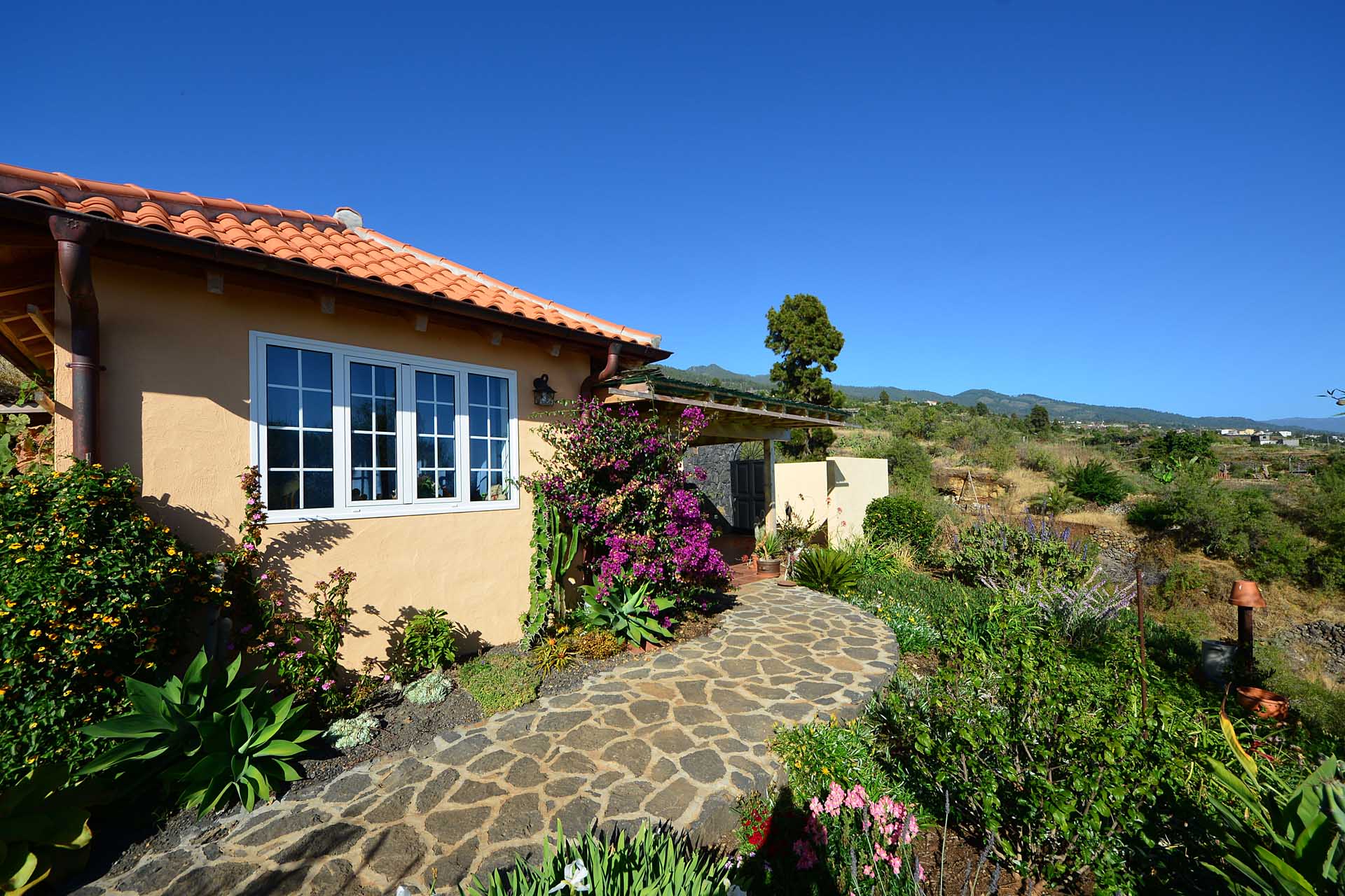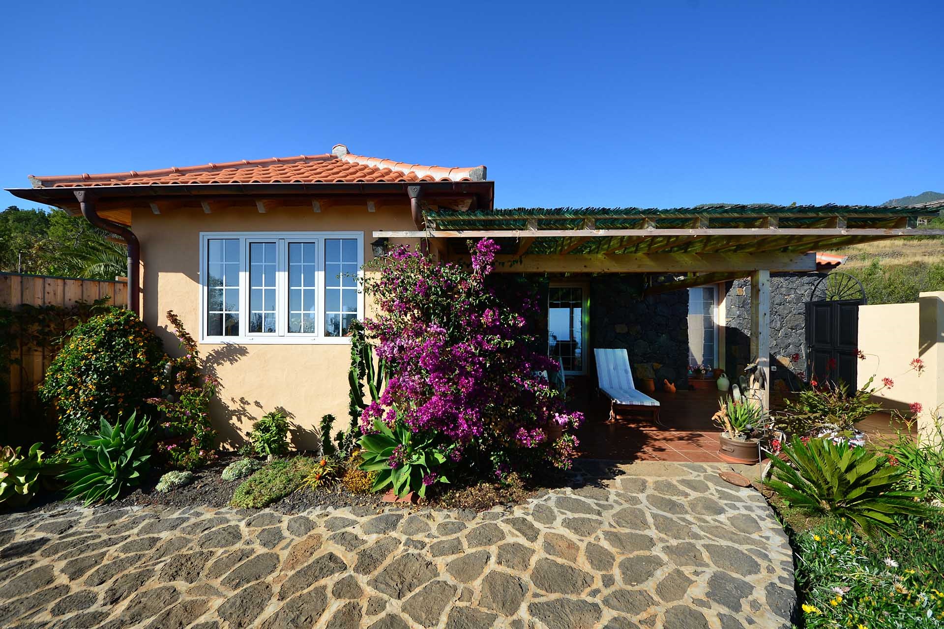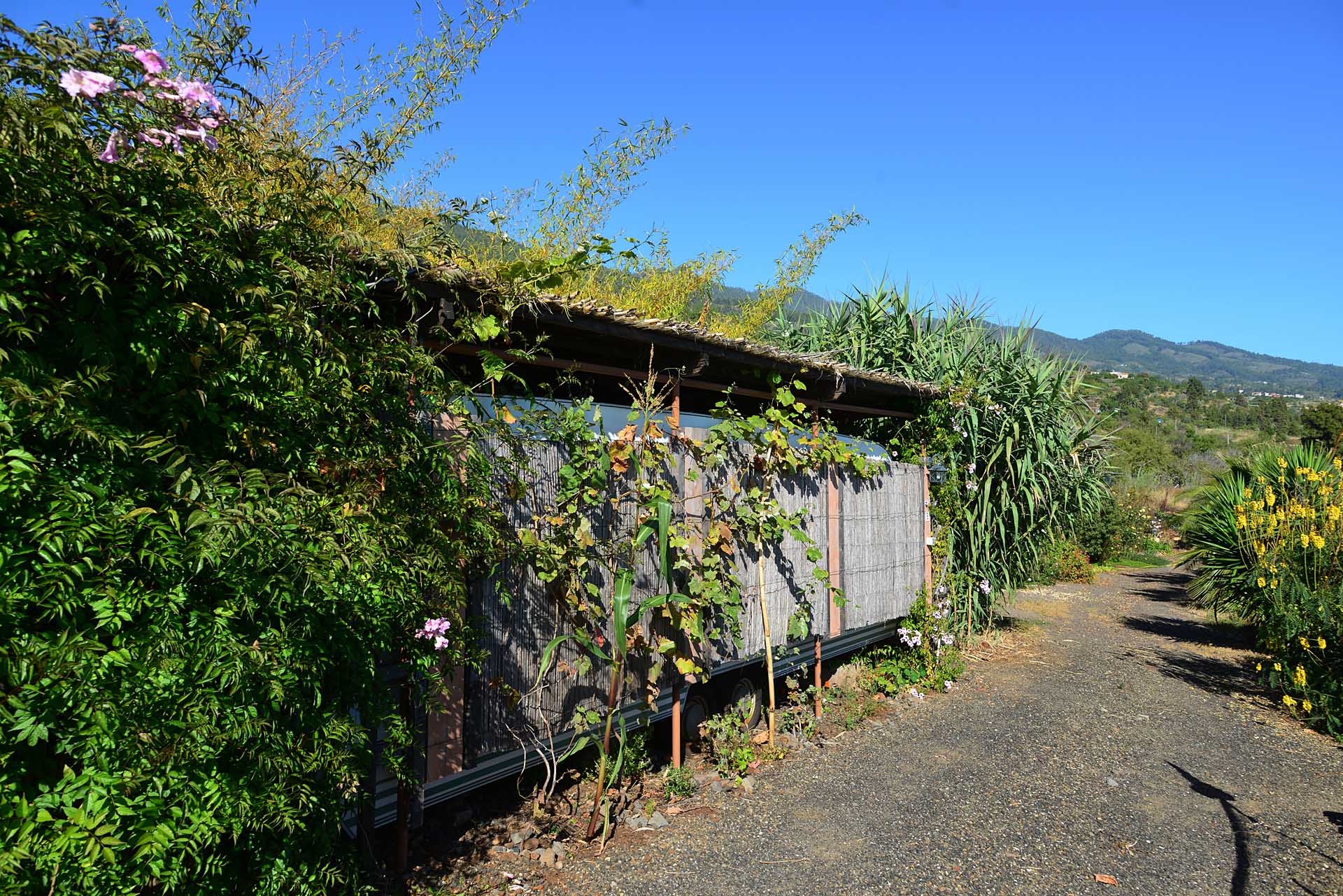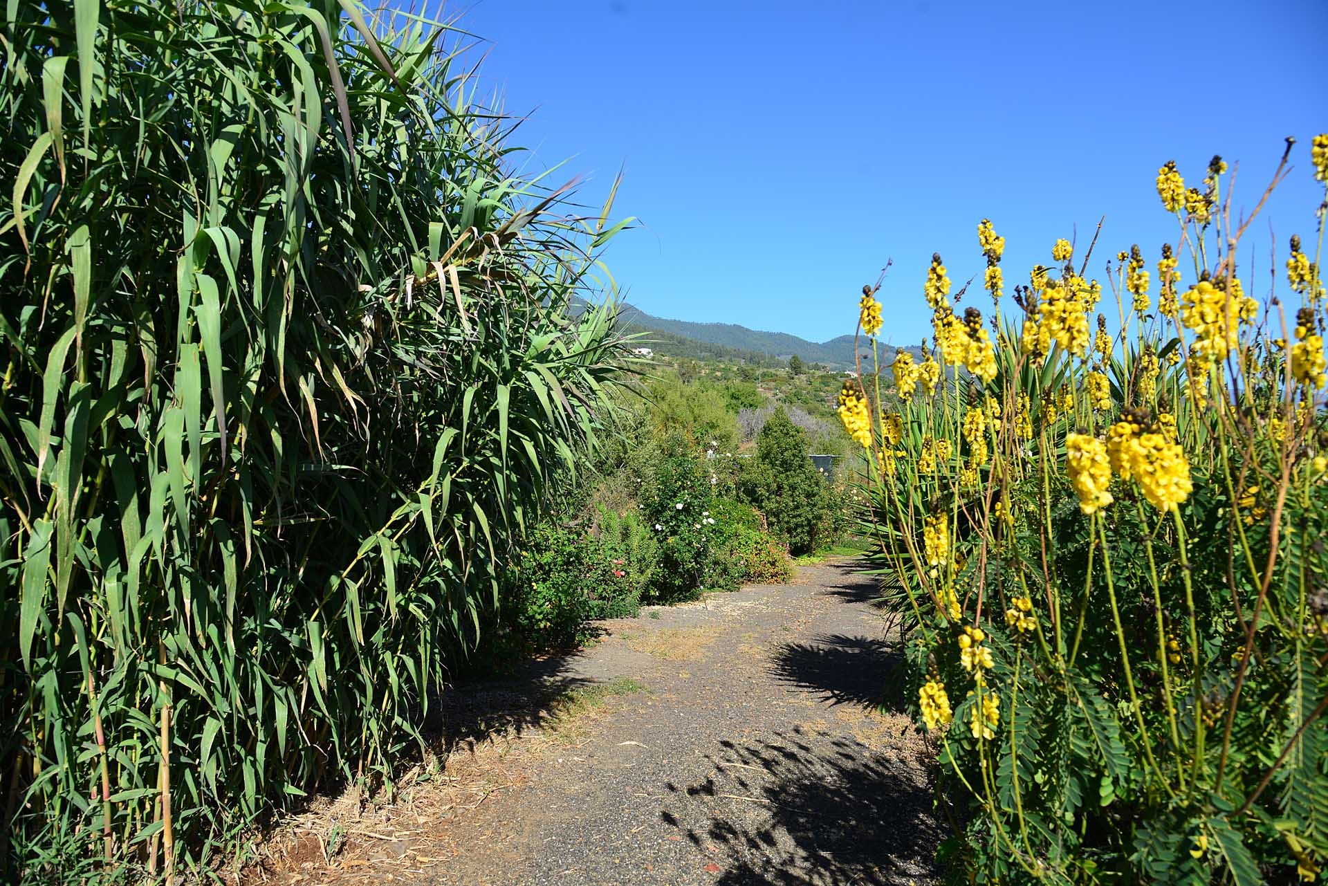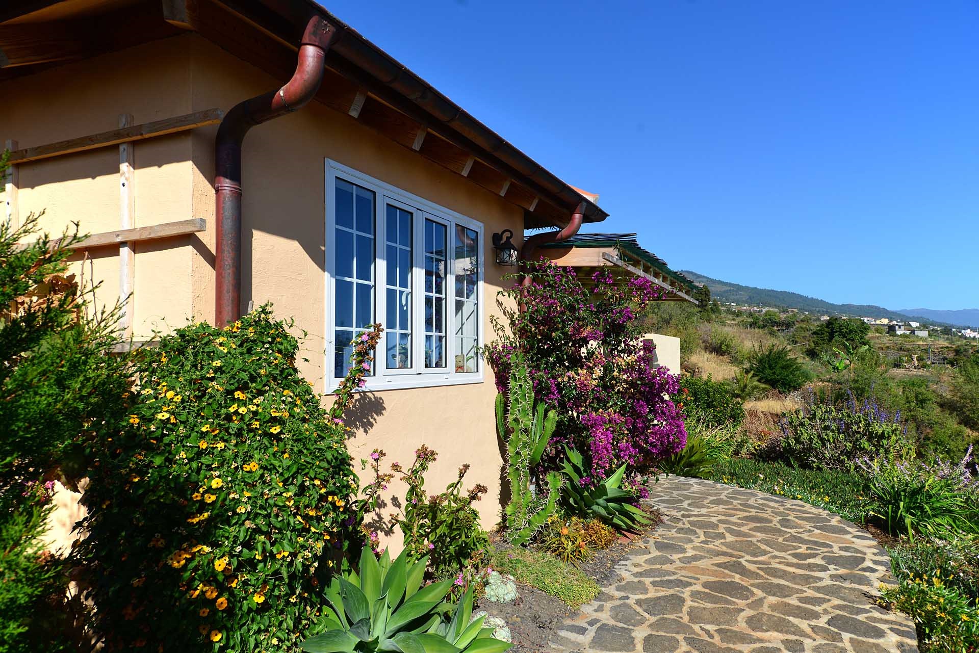 Das Grundstück lässt das Herz eines jeden Gartenfreundes höher schlagen: Der Garten wurde auf wenigen, langgestreckten und ebenen Terrassen angelegt, so dass er einfach zu bewirtschaften ist und von überall einen herrlichen Blick auf den Atlantik bietet. Gehen Sie in ihrem eigenen Garten spazieren, verweilen Sie zwischen subtropischen Obstbäumen, Palmen und botanischen Raritäten aus aller Welt und genießen Sie die Aussicht auf die Insel und das Meer. Der Garten wurde von einem deutschen Landwirt vorbildlich kultiviert und der Boden mit viel Humus besonders fruchtbar gemacht. Für Gemüse und Erdbeeren wurde ein Bereich rundum mit halbdurchlässigem speziellem Beschattungsgewebe gegen allzu harte Sonneneinstrahlung und Fressfeinde wie Amseln, Eidechsen und Kaninchen geschützt. Selbstverständlich wurde und wird er ausschließlich ökologisch bewirtschaftet. Wer möchte, kann sich von diesem Grundstück gut selbst versorgen.