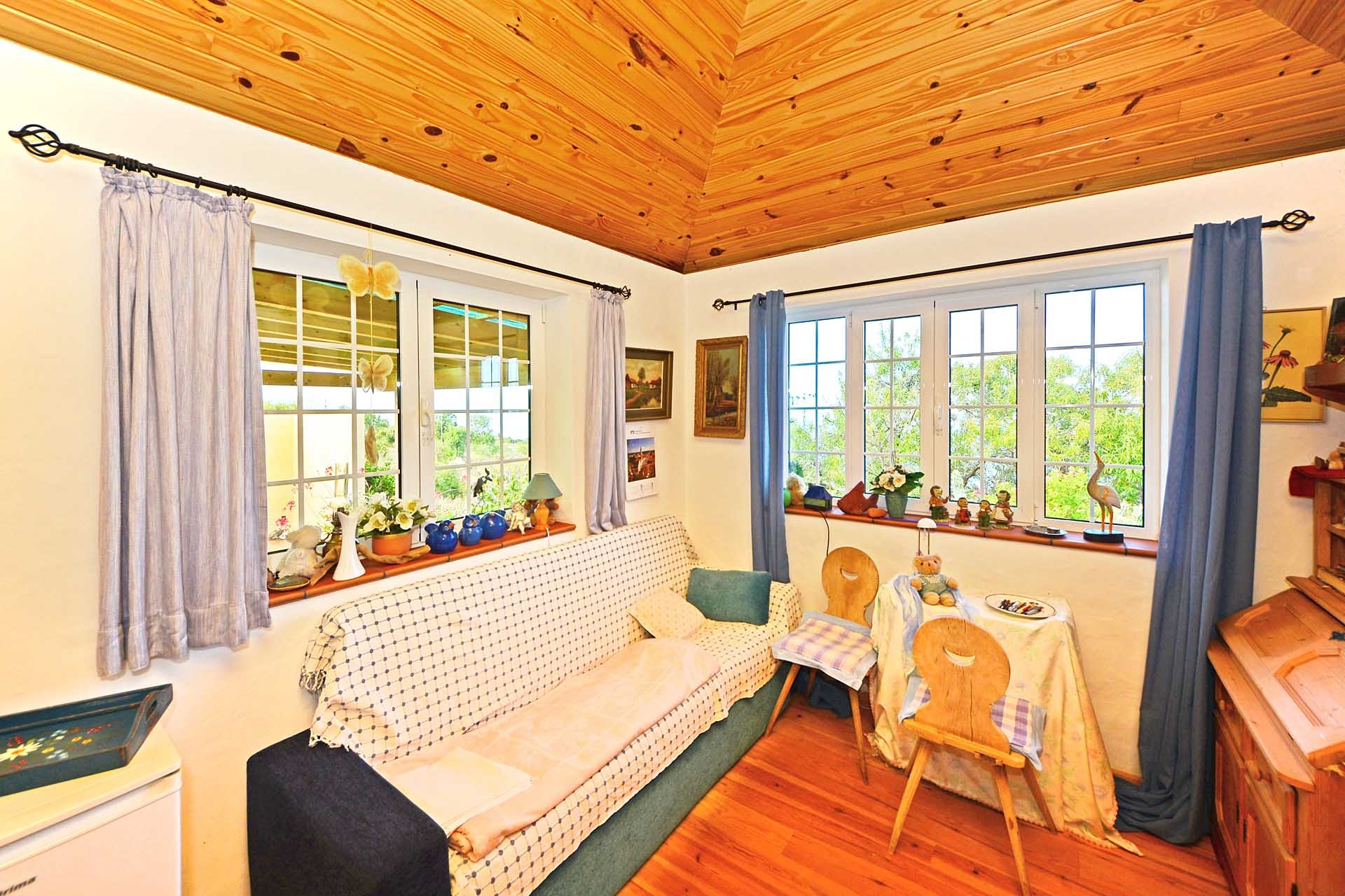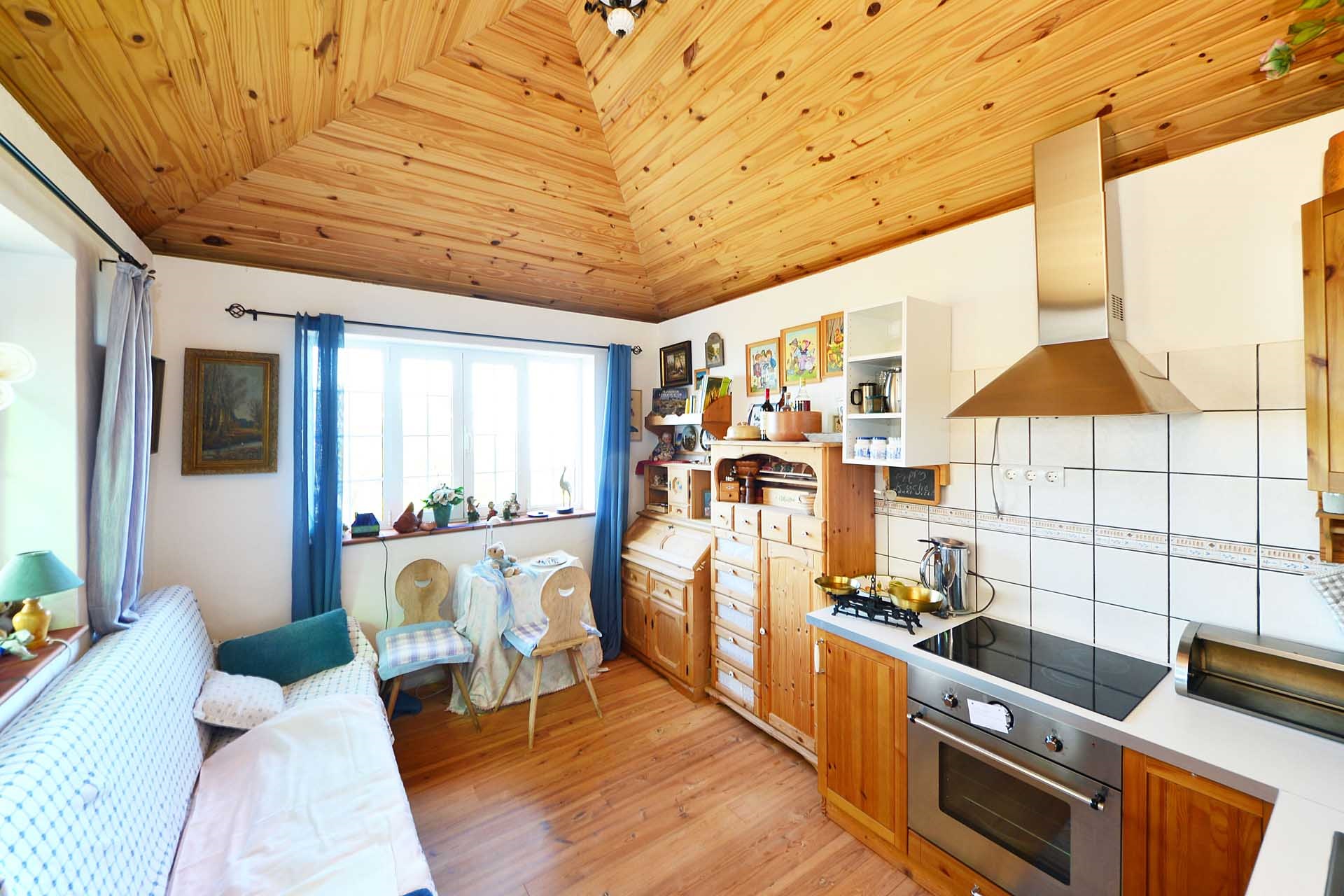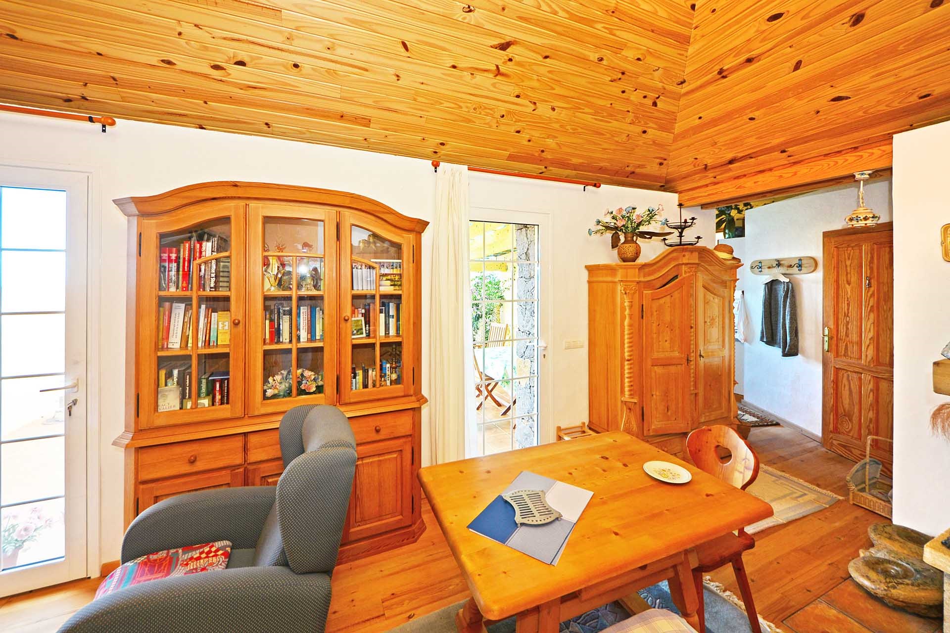 Die Kanarischen Dachstühle wurden mit Sichtholzverkleidung ausgebildet, der Fußboden in Küche und Wohnzimmer mit Massivholzboden belegt.