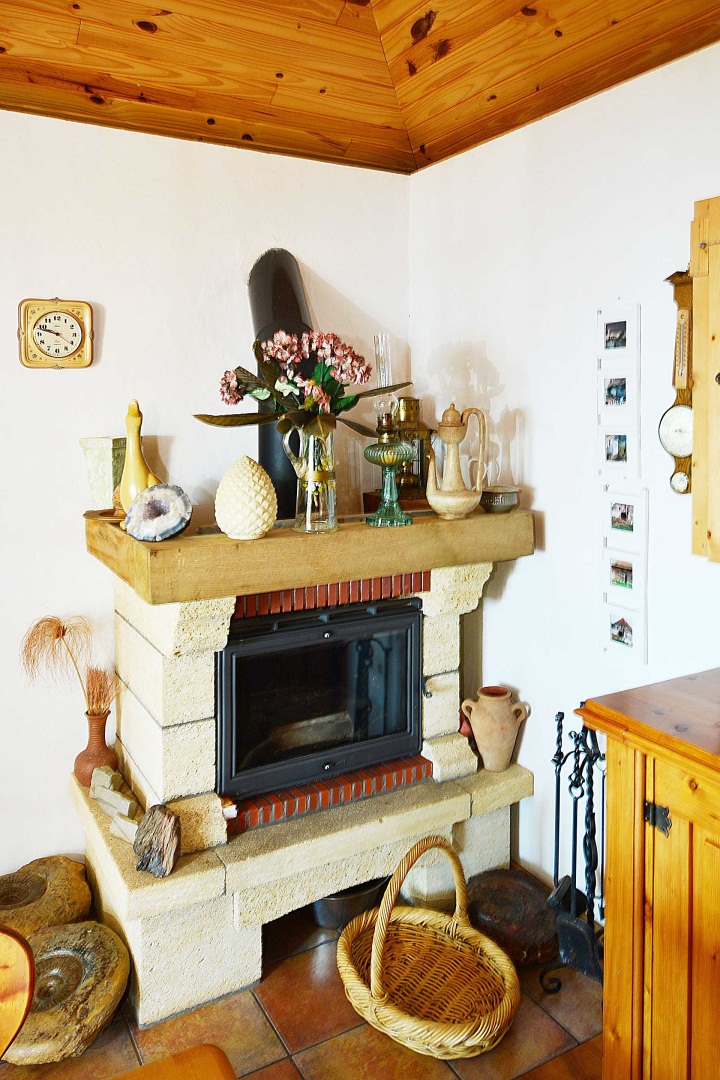 Das Hauptgebäude wurde in 2011 neu und in sehr guter Qualität, überwiegend von deutschen Handwerkern, gebaut und bildet ein sehr gemütliches und raumoptimiertes Ferienhaus, vorallem für Menschen, die sich gerne viel im Freien aufhalten oder auch einen sehr schönen Dauerwohnsitz suchen. Das Gebäude ist L-förmig angelegt, wobei der durch die beiden Schenkel gebildete Terrassenplatz zum großen Teil mit einem festen Dach beschattet wurde. Diese überdachte Terrasse bildet das Zentrum des Hauses, von ihr aus gelangt man in das Wohnzimmer mit einem gemütlichen, qualitativ sehr hochwertigen Kaminofen und einem, durch einen Schrank etwas abgeteilten Bett. Durch eine zweite Glastür zur Terrasse wäre diese Teilung auch mit einer festen Wand möglich.