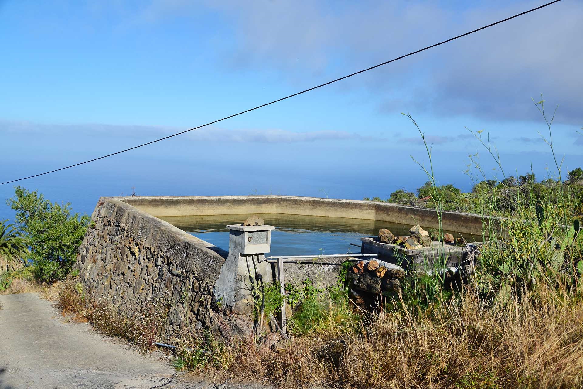 Oberhalb des eigentlichen Grundstücks gehört noch ein großer Wassertank zu der Finca, der Aufgrund seiner Lage das gesamte Gelände ohne Energieaufwand für eine Pumpe bewässern kann. Er wird durch eine eigene Wasseraktie mit einer Kapazität von ca. 1,7 l/Minute landwirtschaftlichem Wasser gespeist. Die Wasseraktie ist im Kaufpreis inbegriffen.