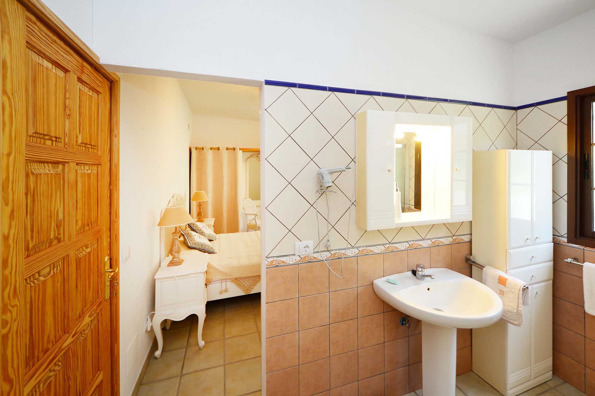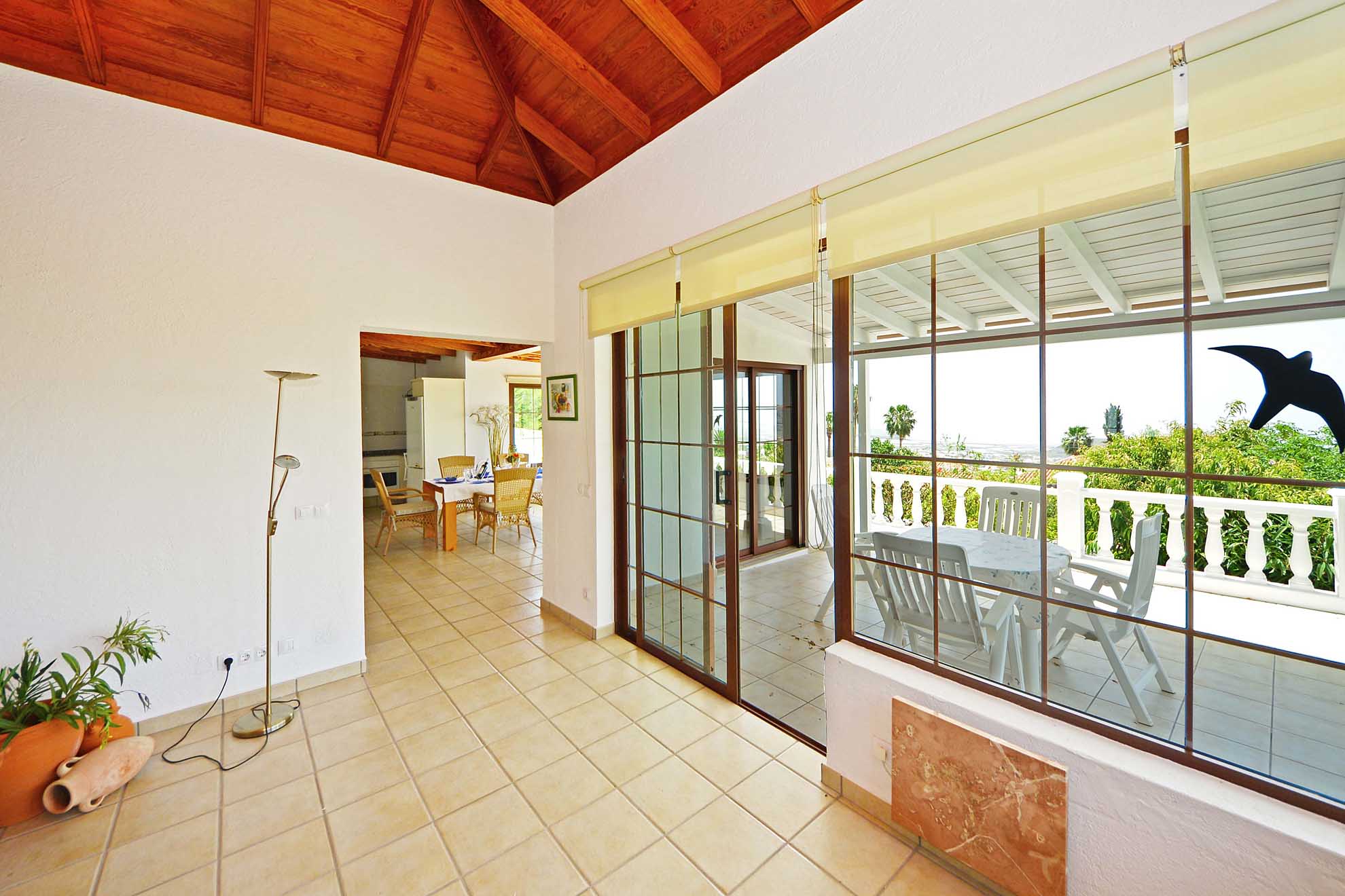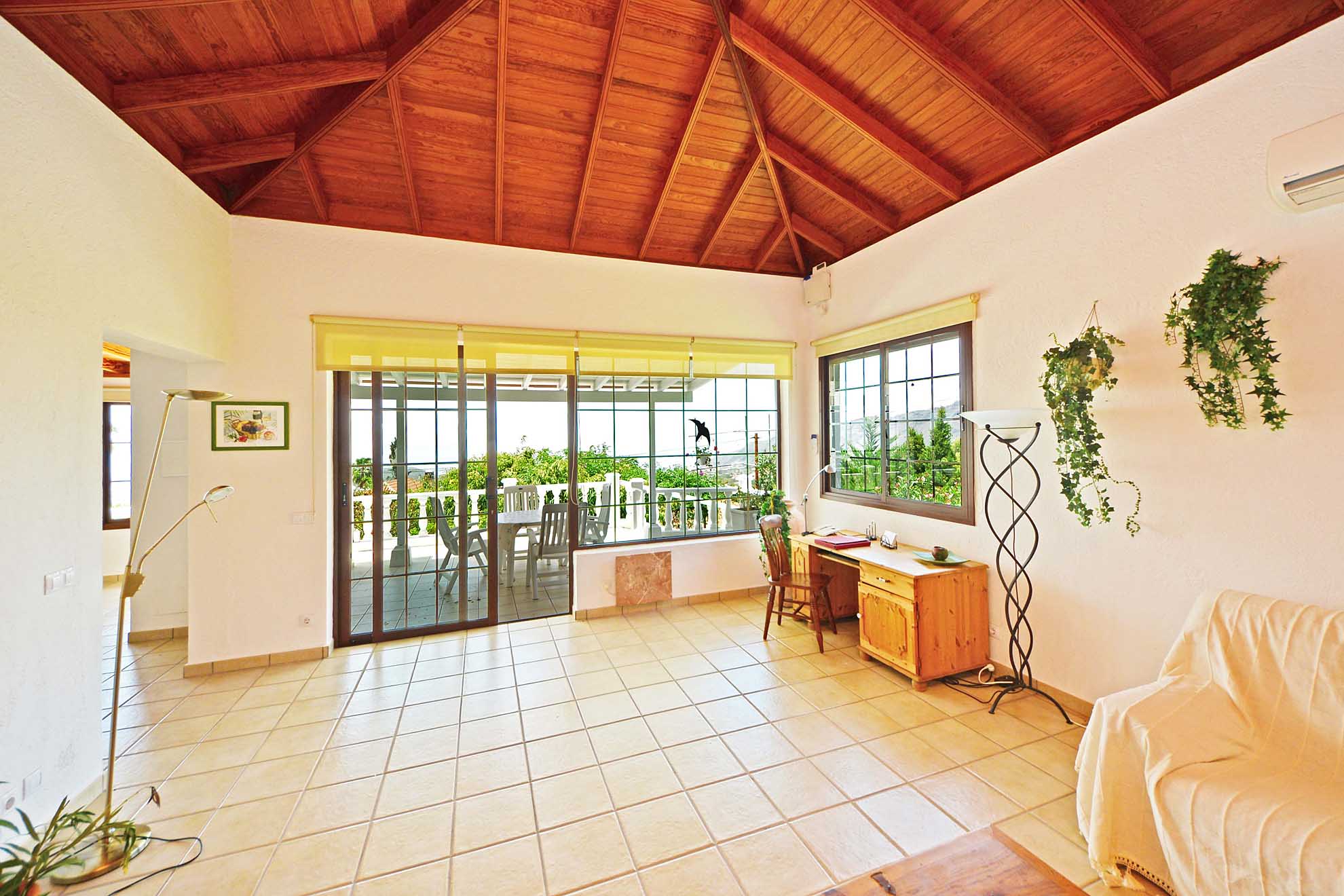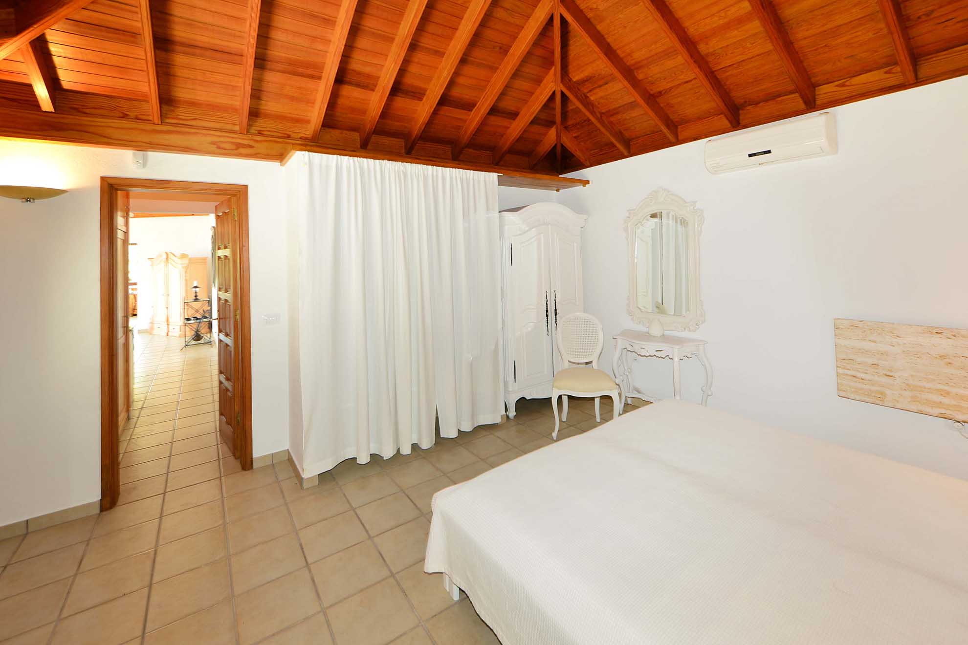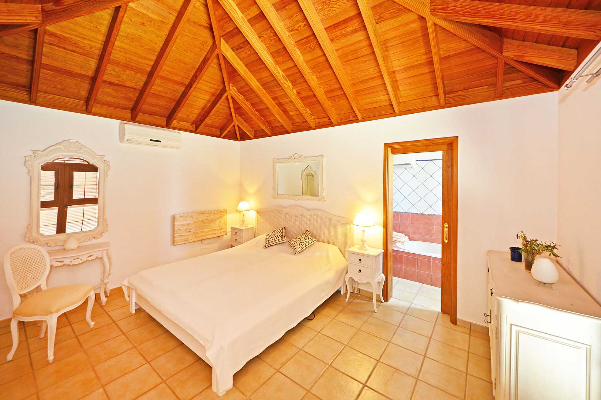 Vom Wohn-Essbereich gelangen Sie durch einen kleinen Flur mit Einbauschrank zum Ruhebereich, der durch zwei große Schlafzimmer, die jeweils über ein eigenes Bad "on suite" verfügen und ein kleines Schlaf- oder Arbeitszimmer gebildet wird. Die Räume sind durch hohe, kanarische Dachstühle bereits natürlich gut klimatisiert. Der Master-Bedroom wird zusätzlich durch eine hochwertige Aluminium-Jalousie mit integriertem Insektengitter geschützt.