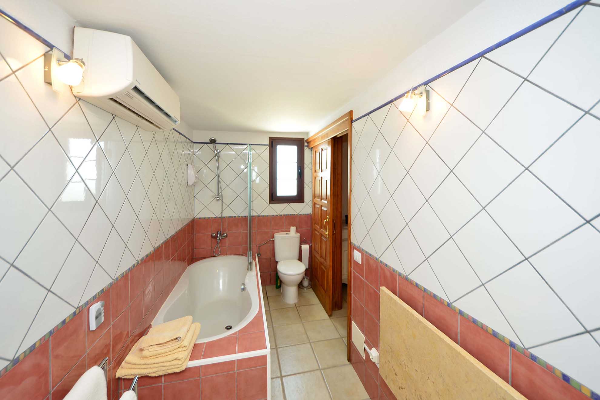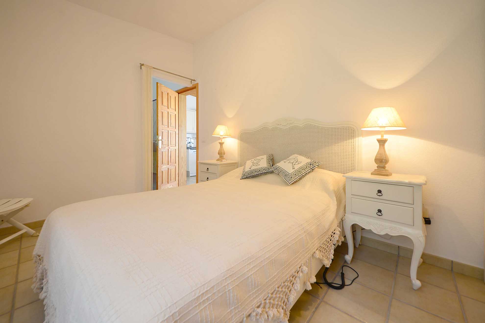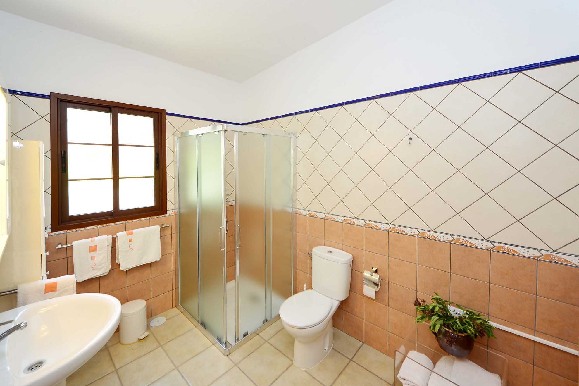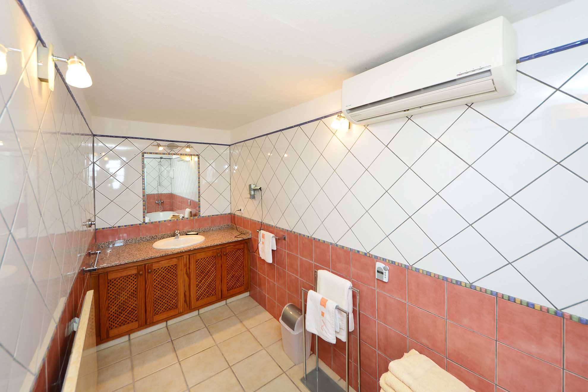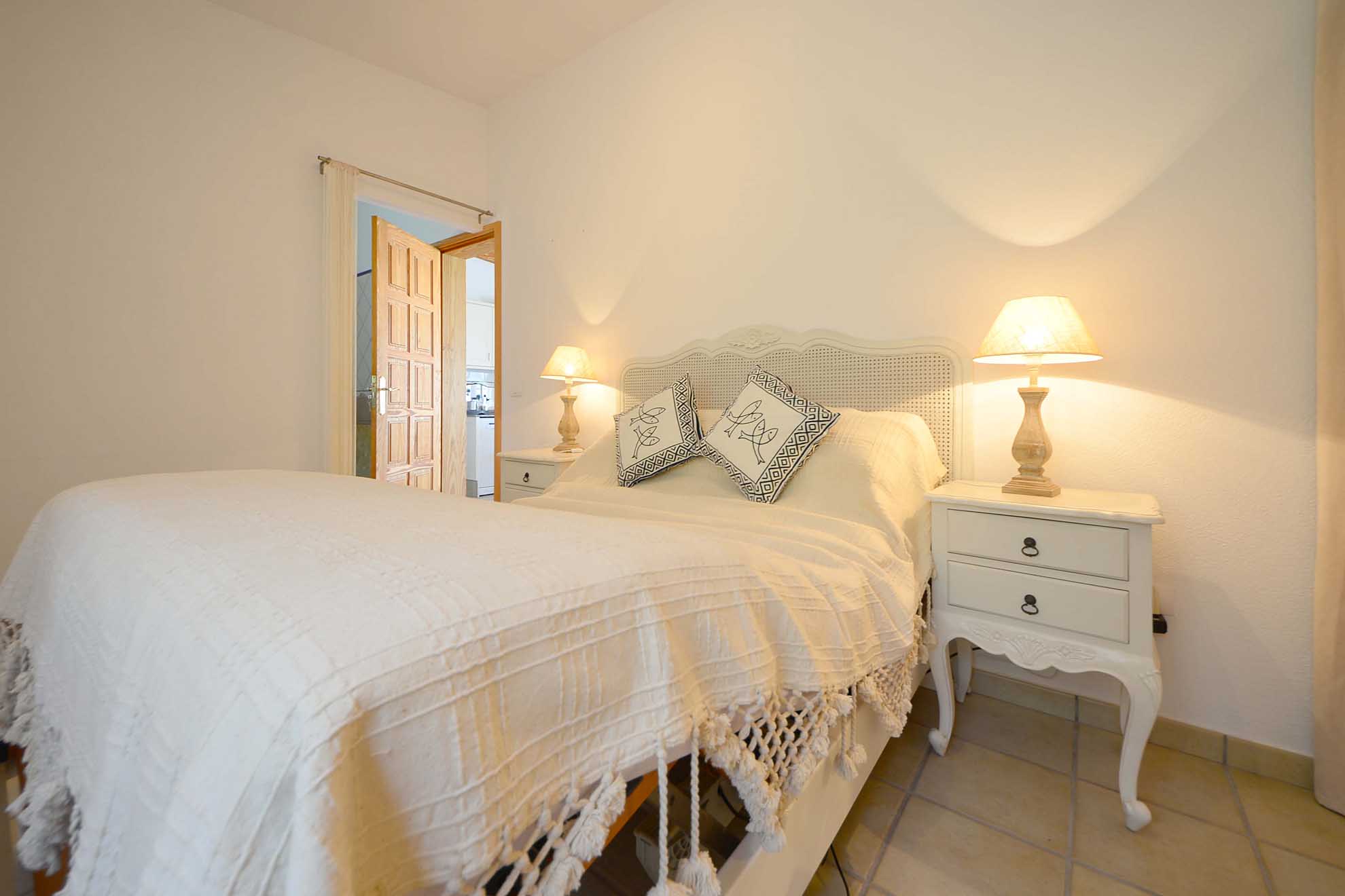 Vom Wohn-Essbereich gelangen Sie durch einen kleinen Flur mit Einbauschrank zum Ruhebereich, der durch zwei große Schlafzimmer, die jeweils über ein eigenes Bad "on suite" verfügen und ein kleines Schlaf- oder Arbeitszimmer gebildet wird. Die Räume sind durch hohe, kanarische Dachstühle bereits natürlich gut klimatisiert. Der Master-Bedroom wird zusätzlich durch eine hochwertige Aluminium-Jalousie mit integriertem Insektengitter geschützt.