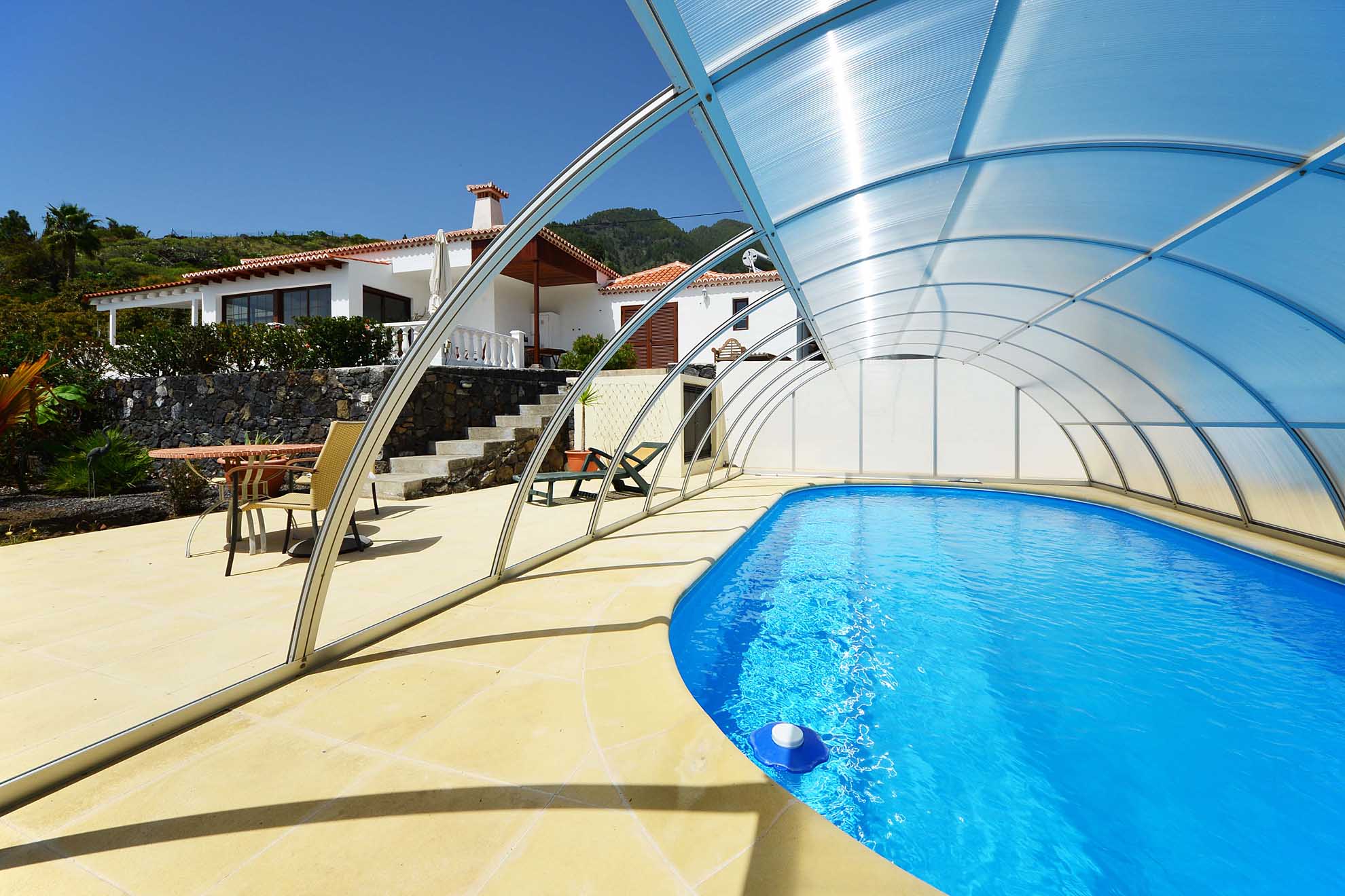 Seitlich vor dem Haus befindet sich ein Pool (28 m²), der mit einer variablen Abdeckung versehen wurde. So temperiert die Sonne das Wasser auf angenehme Badetemperatur, ganz ohne Energiekosten. Während des Schwimmens kann die Abdeckung geöffnet werden, so dass Sie frische Luft und Sonne auch im Pool genießen können. Durch den festen Teil der Abdeckung ist der Pool vollständig blickgeschützt. Die gesamte Poolterrasse wurde mit einem italienischen Spezialboden belegt, der auch mit nassen Füßen absolut rutschfest ist.