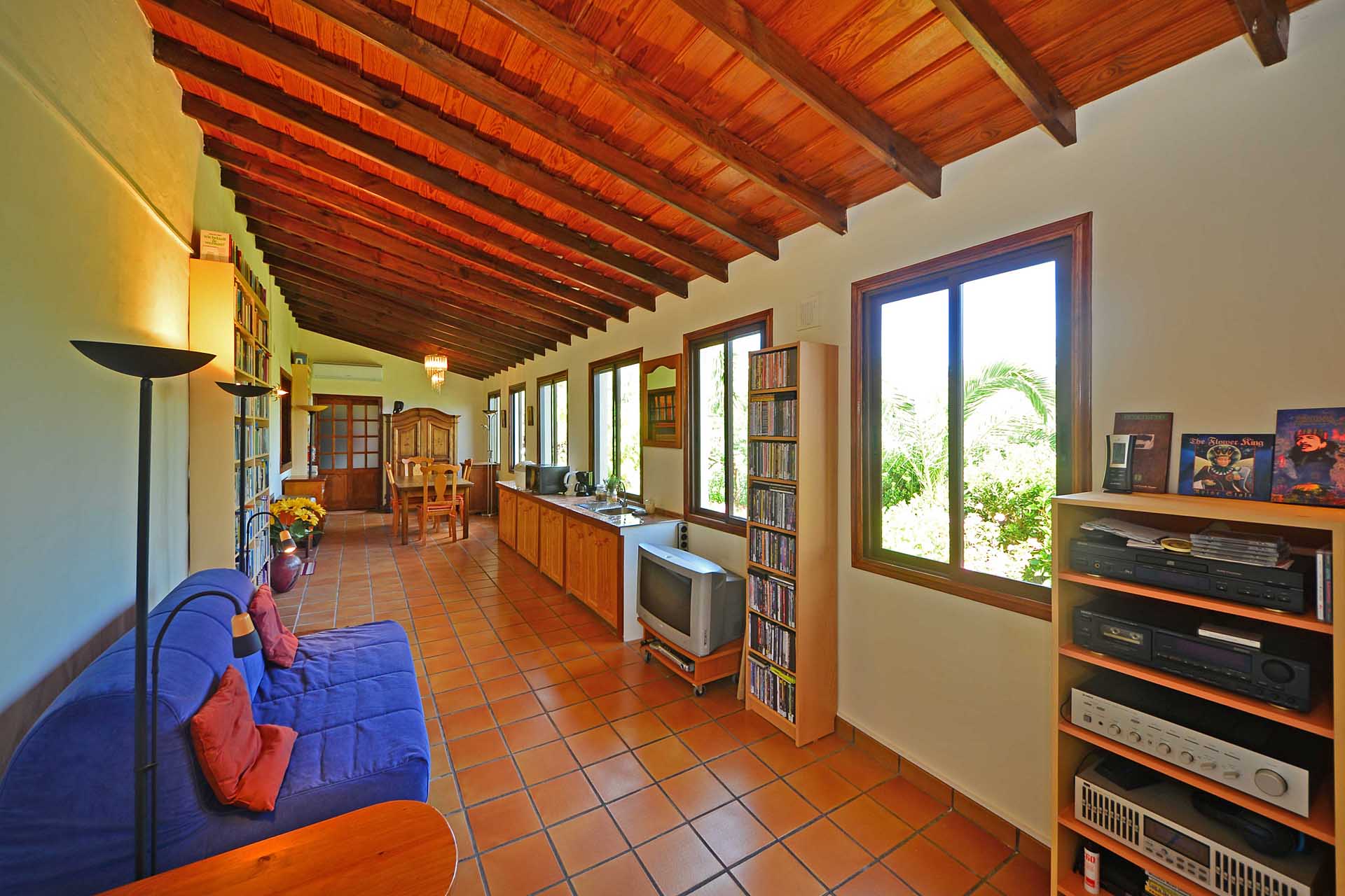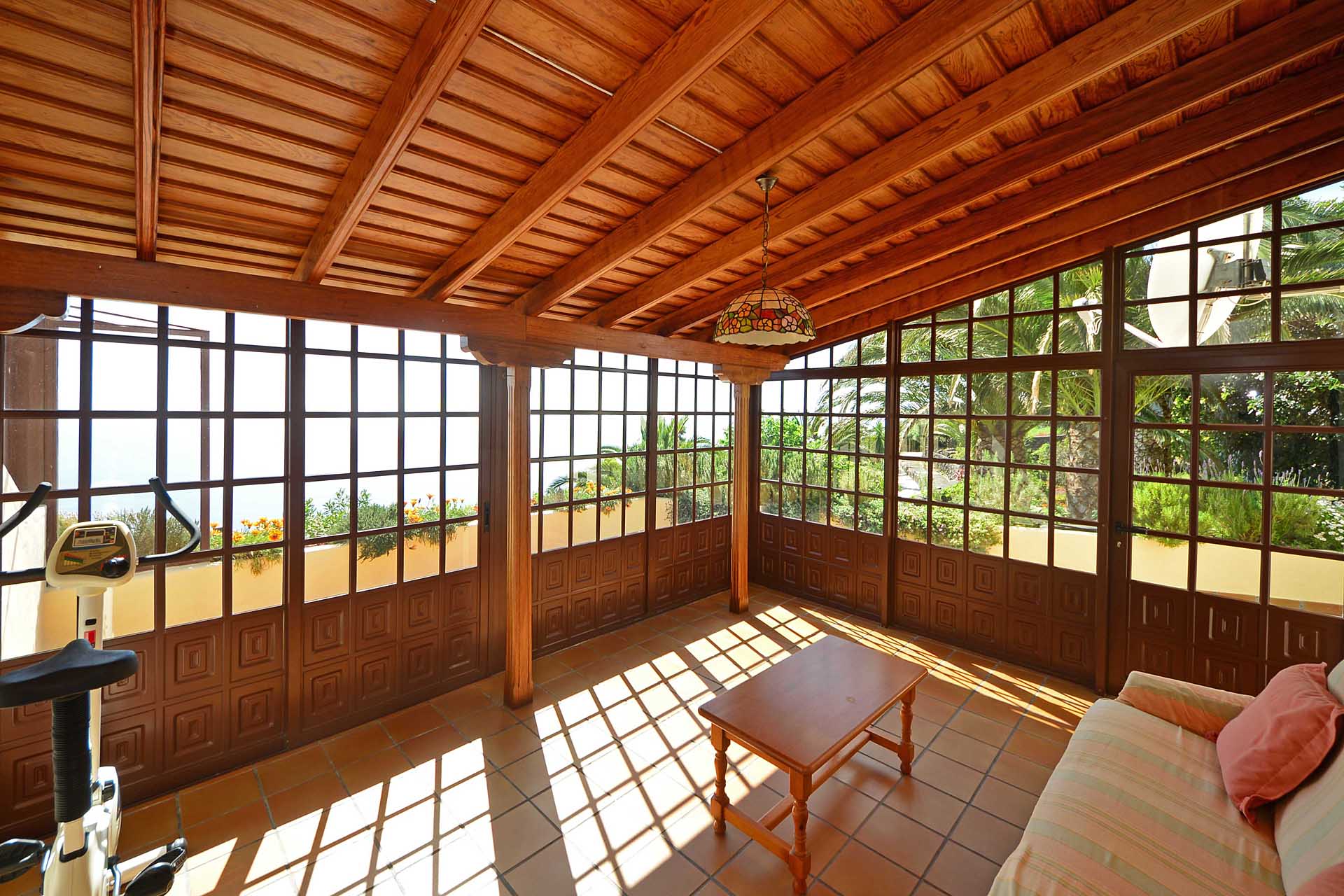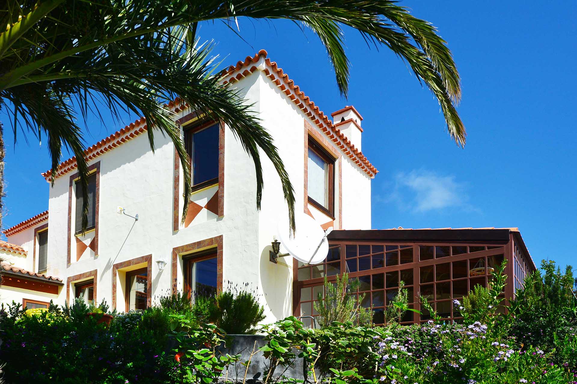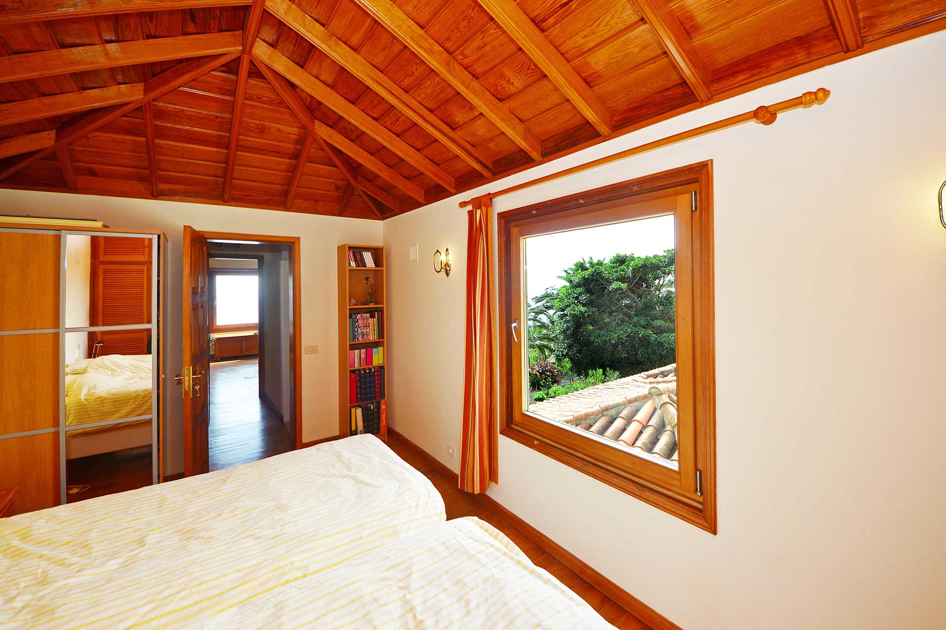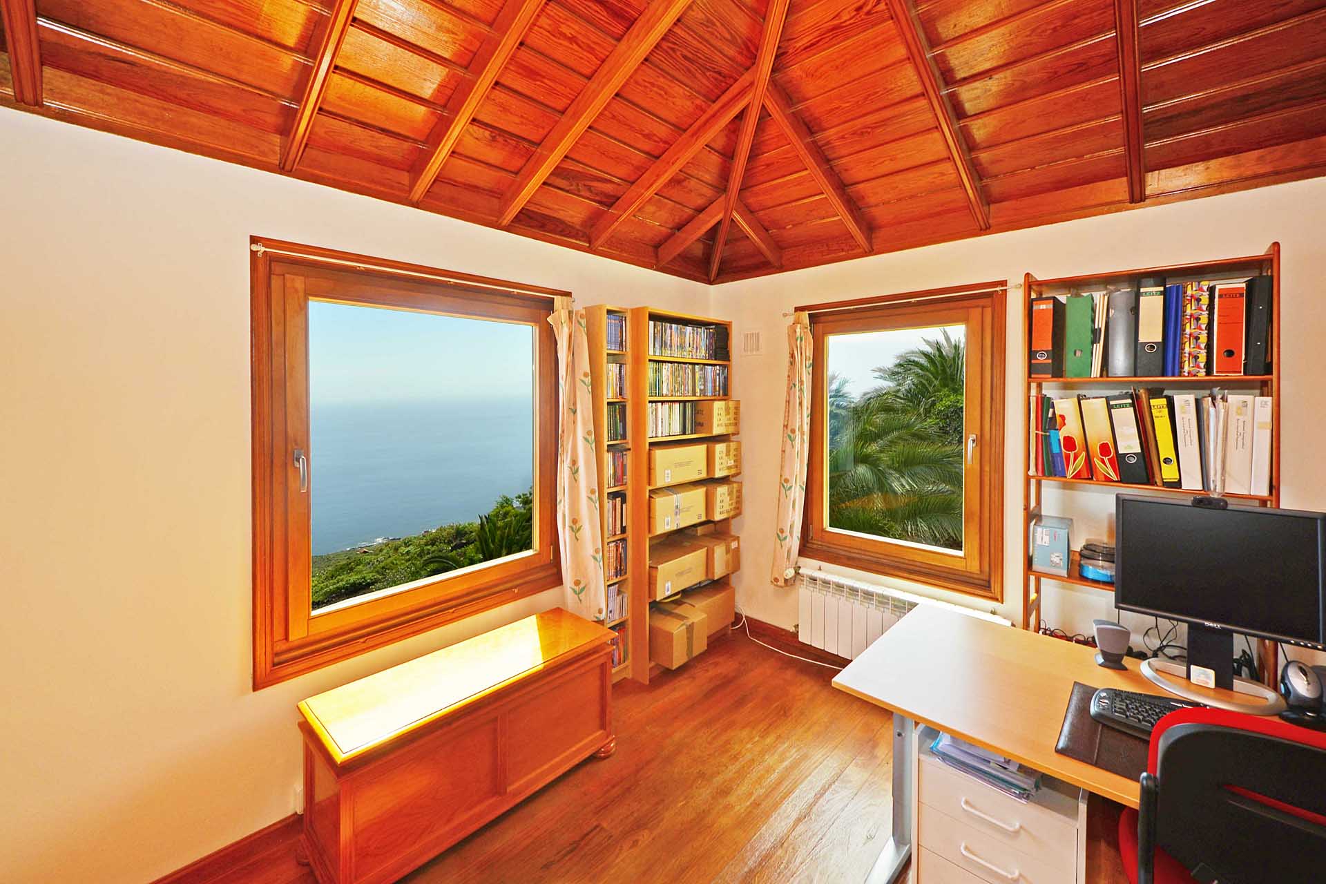 Das zweigeschossige, in kanarischem Stil gebaute Hauptgebäude (165 m²) beherbergt im Erdgeschoss ein gemütliches Kaminzimmer, eine Küche mit Essplatz, einen großen Wohnbereich der derzeit teilweise als Künstleratelier genutzt wird sowie einen Wintergarten und einen Hauswirtschaftsraum. Im Obergeschoss befinden sich ein Arbeitszimmer mit fantastischem Ausblick, ein Wannenbad, ein WC und ein geräumiges und gemütliches Schlafzimmer. Die hohen, kanarischen Dachstühle sorgen für ganzjährig angenehmes Klima und eine heimelige, warme Ausstrahlung. Über eine Treppe gelangt man in die Garage, so dass Sie unmittelbaren Zugang von der Garage in das Haupthaus haben. Auch die Garage wurde mit einem kanarischen Dachstuhl versehen, so dass sie auch zu einem vollwertigen Wohnraum umgebaut werden kann.