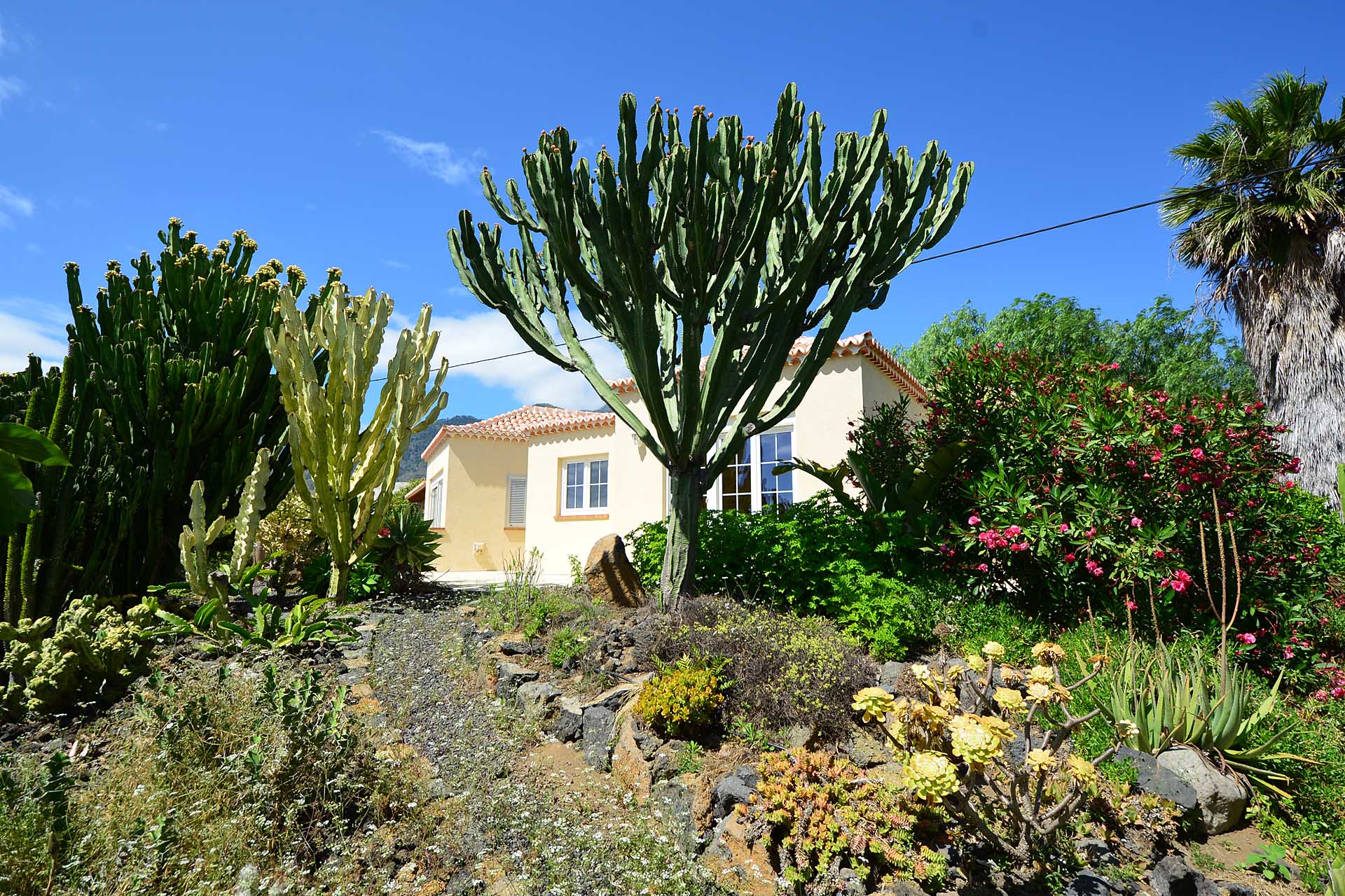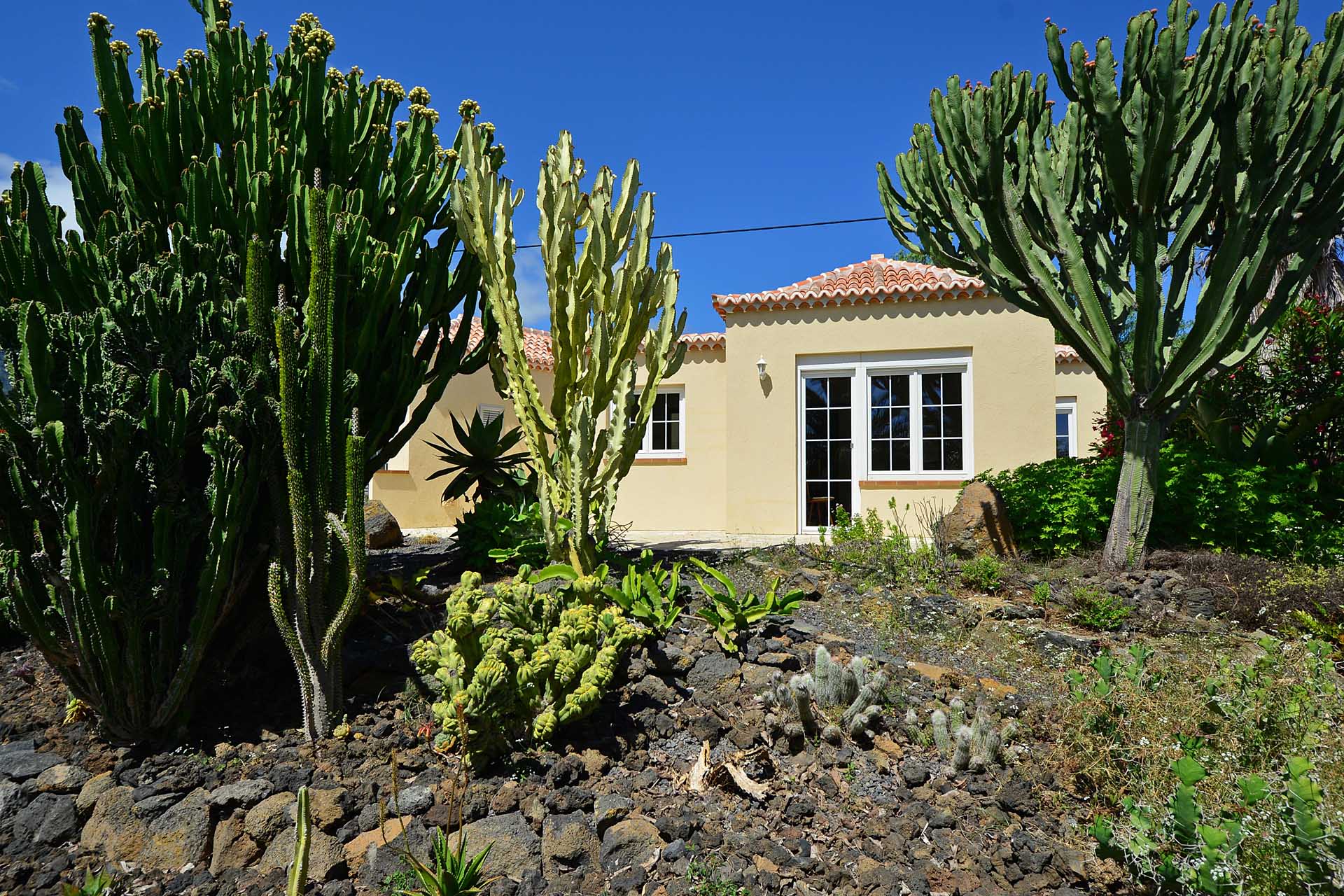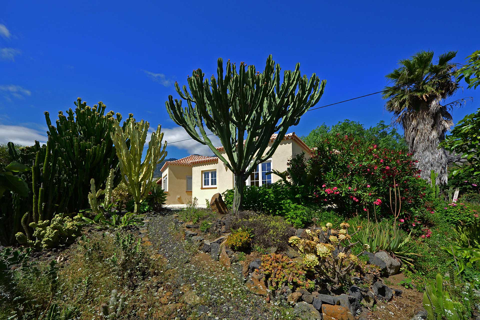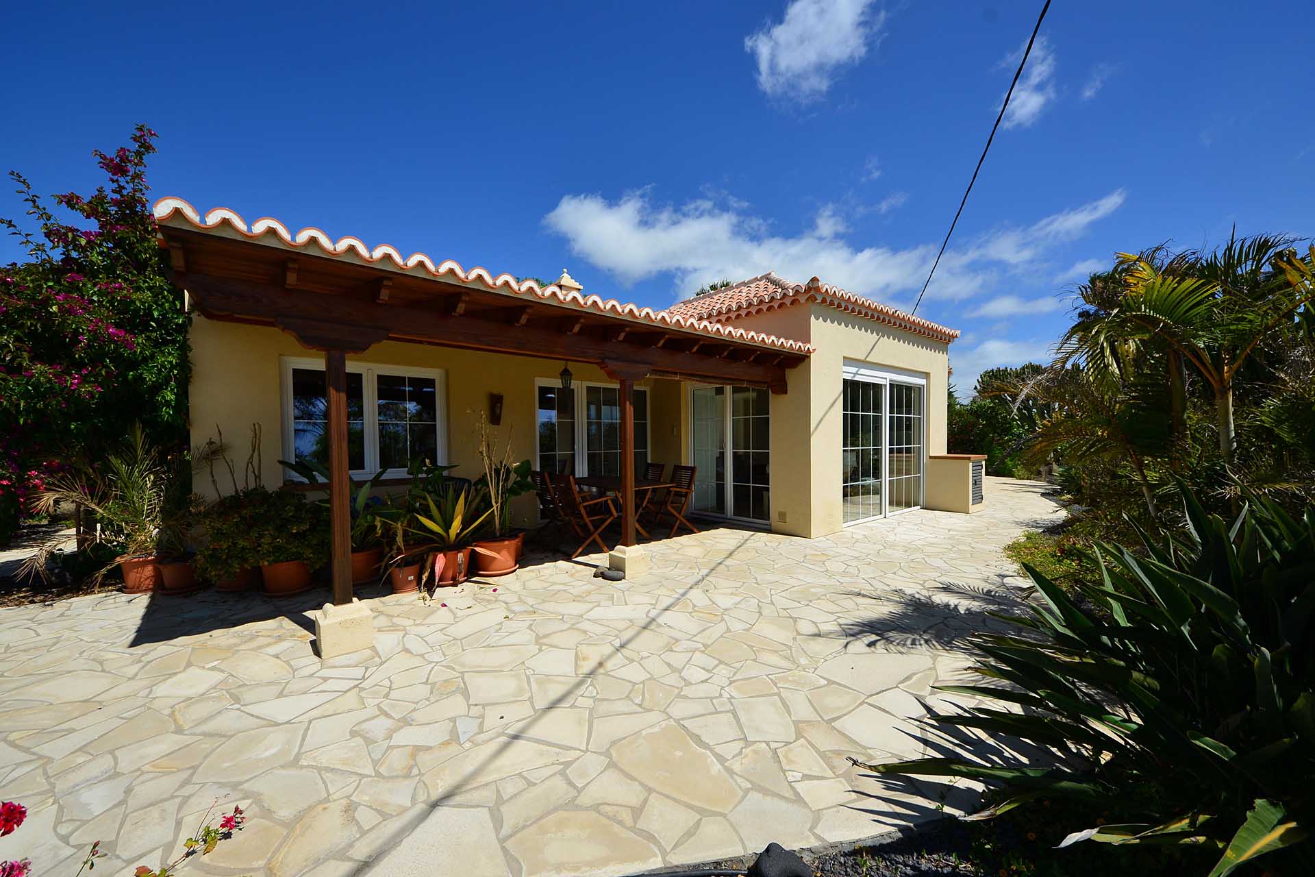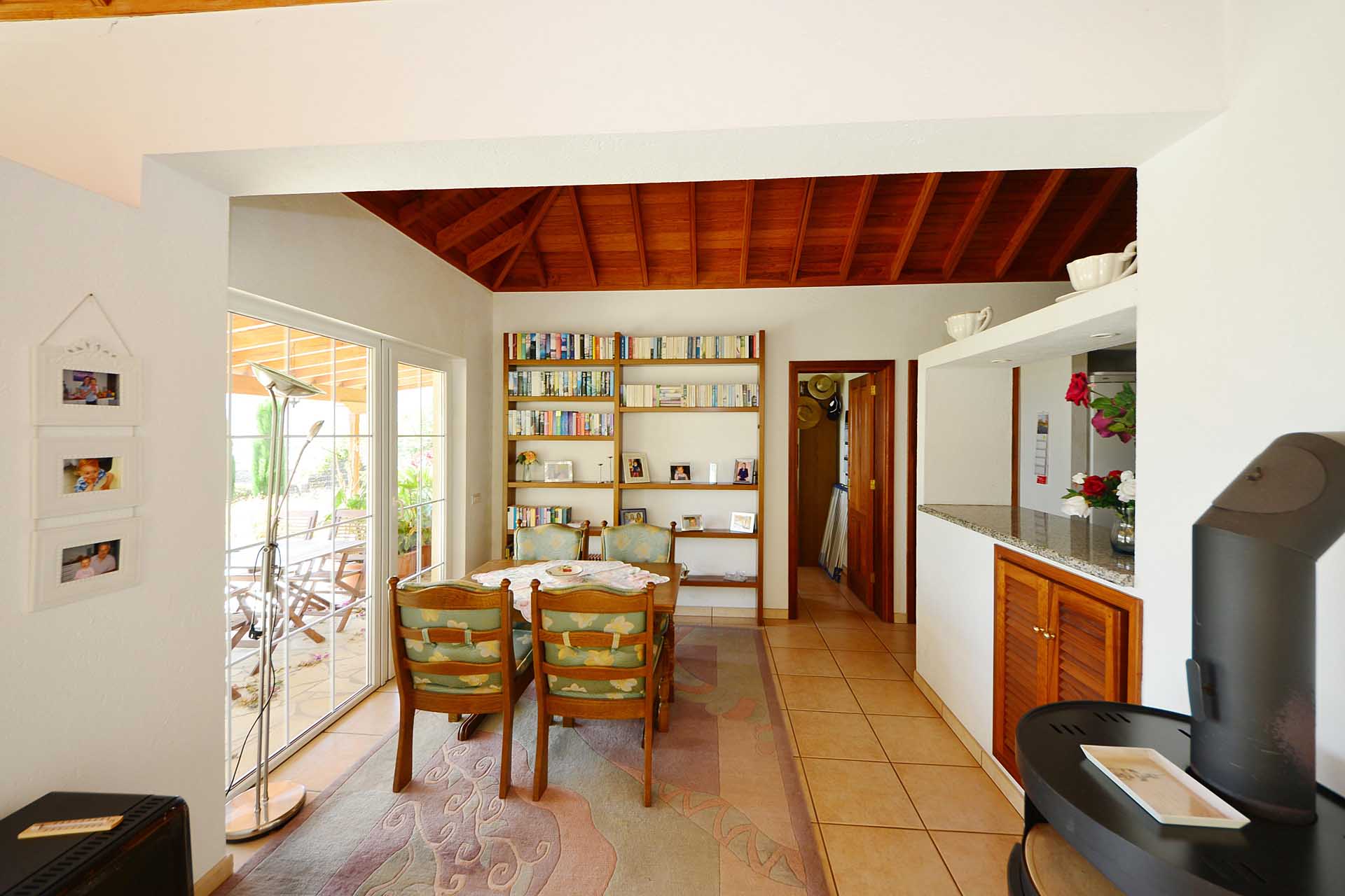 Das Wohnhaus wurde 1999 mit modernem, hellen und praktischem Grundriss neu errichtet und bietet mit seinen kanarischen Sichtholz-Dachstühlen neben herrlichem Panoramablick auf den Atlantik und die Berge auch die landestypische Gemütlichkeit des reichlich verarbeiteten Naturholzes. Sie betreten das Gebäude über eine überdachte Ostterrasse, den idealen Platz für das Frühstück bei den ersten Sonnenstrahlen. Das großzügige Wohnzimmer geht in den Ess- und Kochbereich über so dass diese zwar separiert erscheinen, jedoch nicht isoliert sind. An der Nordseite schließt sich ein Arbeitszimmer, an der Südseite zwei Schlafzimmer mit jeweils eigenem Tageslichtbad (eines mit Dusche, das andere mit Badewanne) an.
