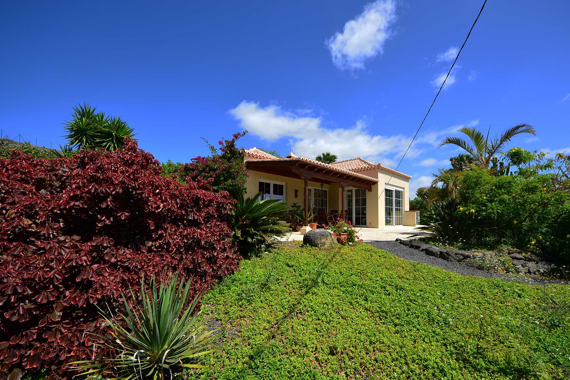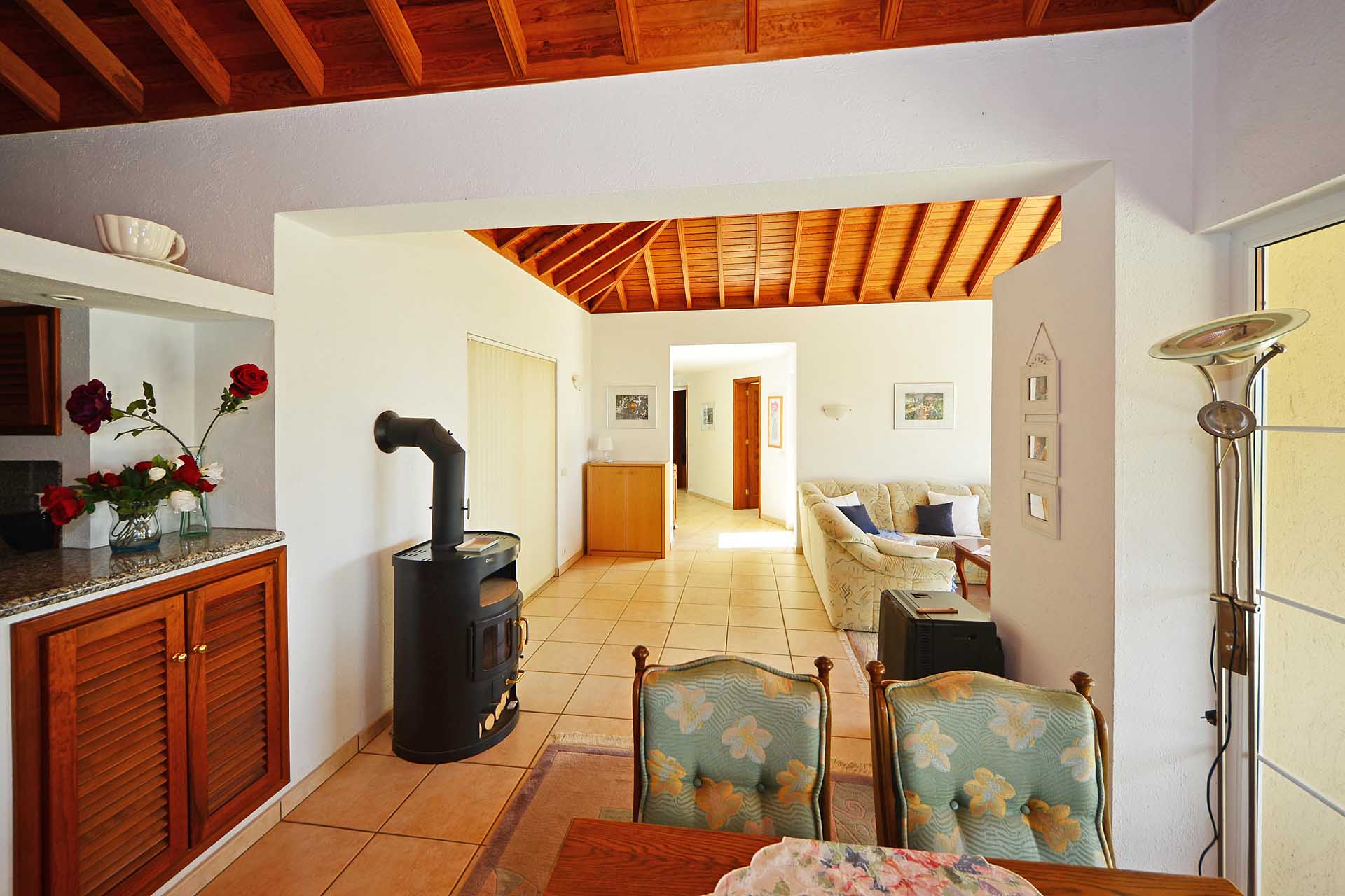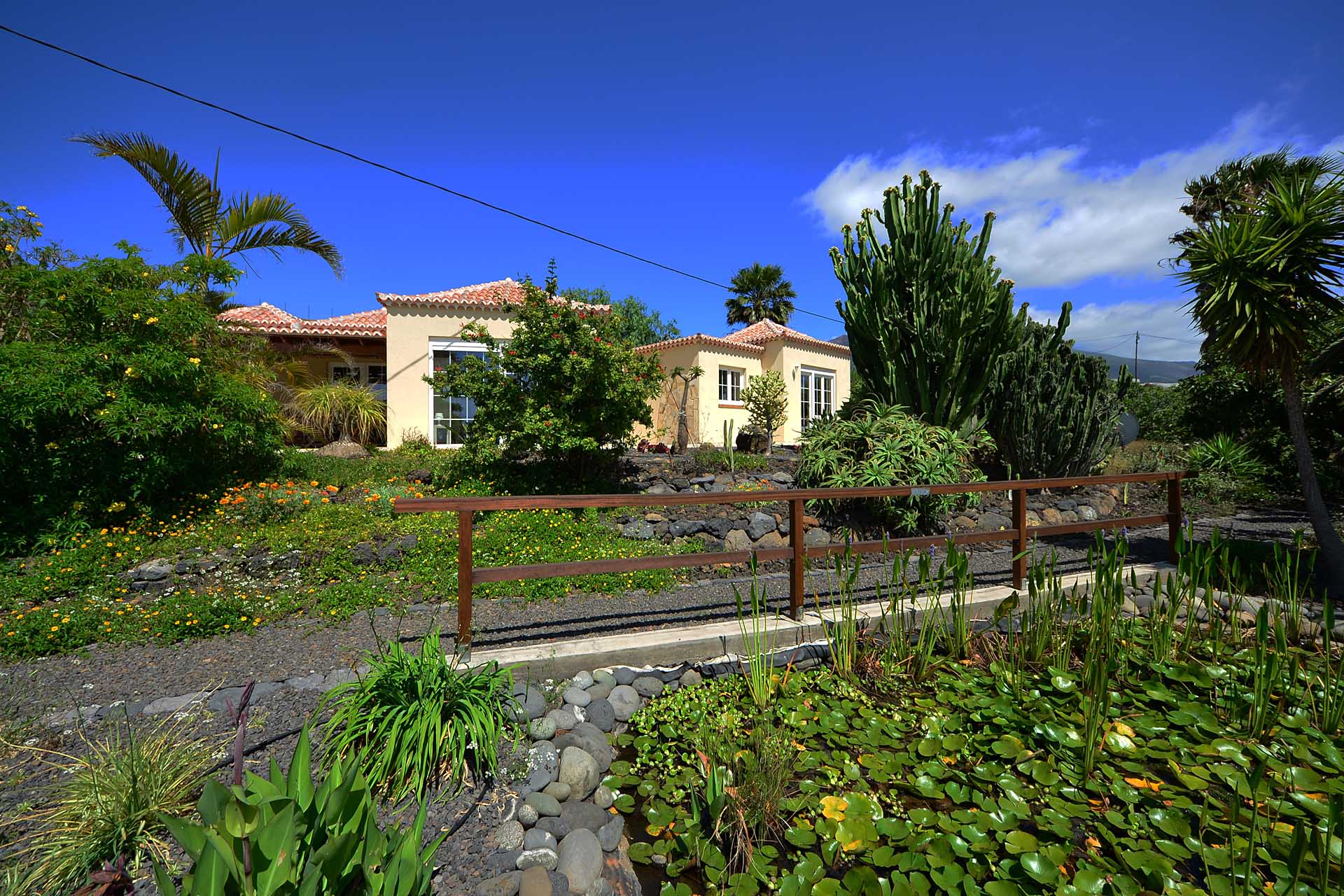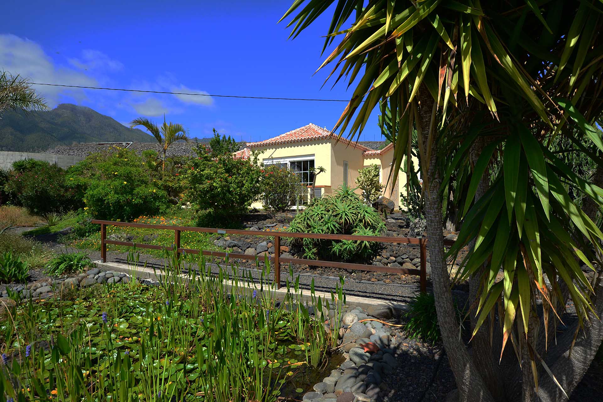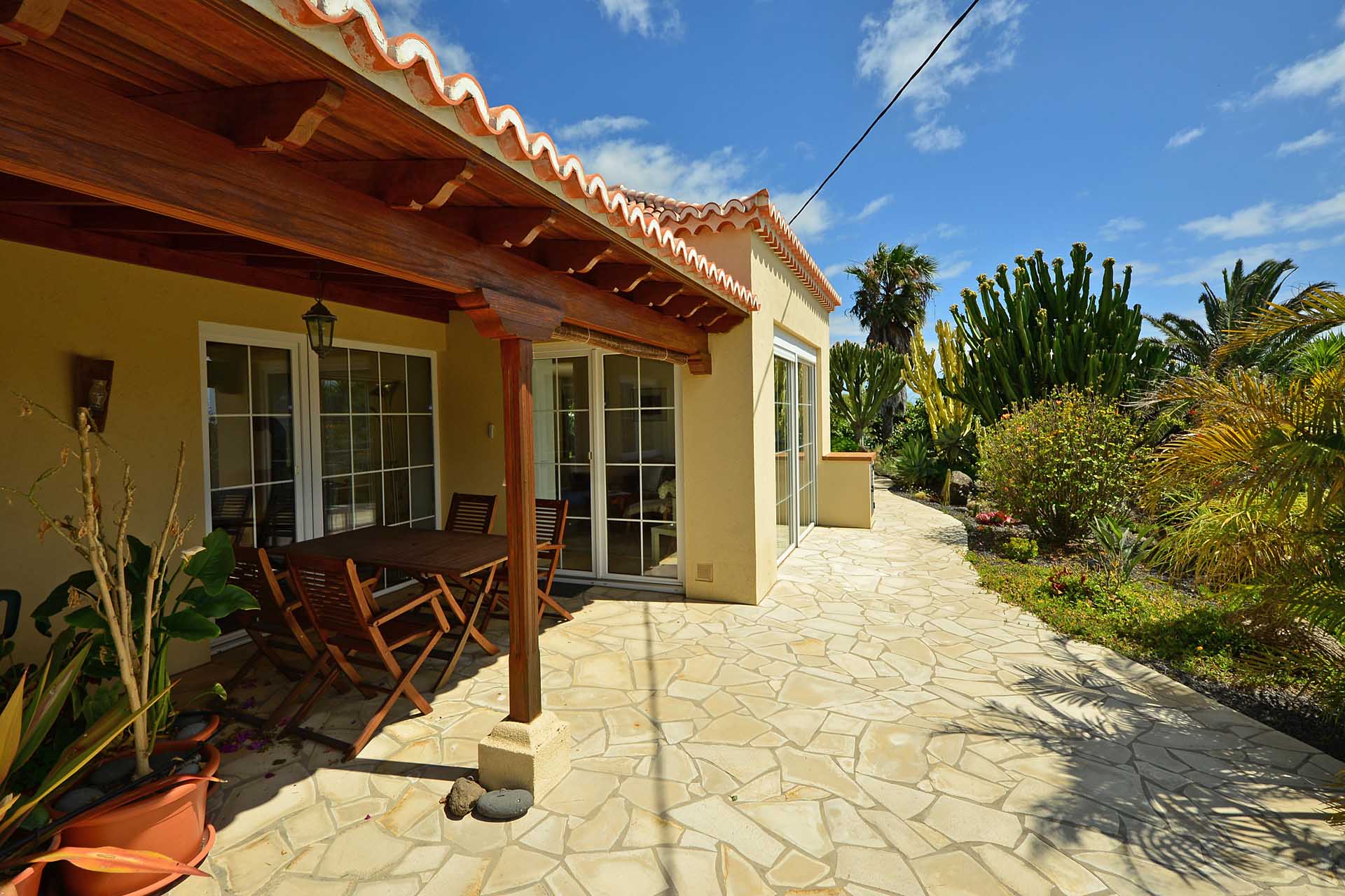 Das Wohnhaus wurde 1999 mit modernem, hellen und praktischem Grundriss neu errichtet und bietet mit seinen kanarischen Sichtholz-Dachstühlen neben herrlichem Panoramablick auf den Atlantik und die Berge auch die landestypische Gemütlichkeit des reichlich verarbeiteten Naturholzes. Sie betreten das Gebäude über eine überdachte Ostterrasse, den idealen Platz für das Frühstück bei den ersten Sonnenstrahlen. Das großzügige Wohnzimmer geht in den Ess- und Kochbereich über so dass diese zwar separiert erscheinen, jedoch nicht isoliert sind. An der Nordseite schließt sich ein Arbeitszimmer, an der Südseite zwei Schlafzimmer mit jeweils eigenem Tageslichtbad (eines mit Dusche, das andere mit Badewanne) an.