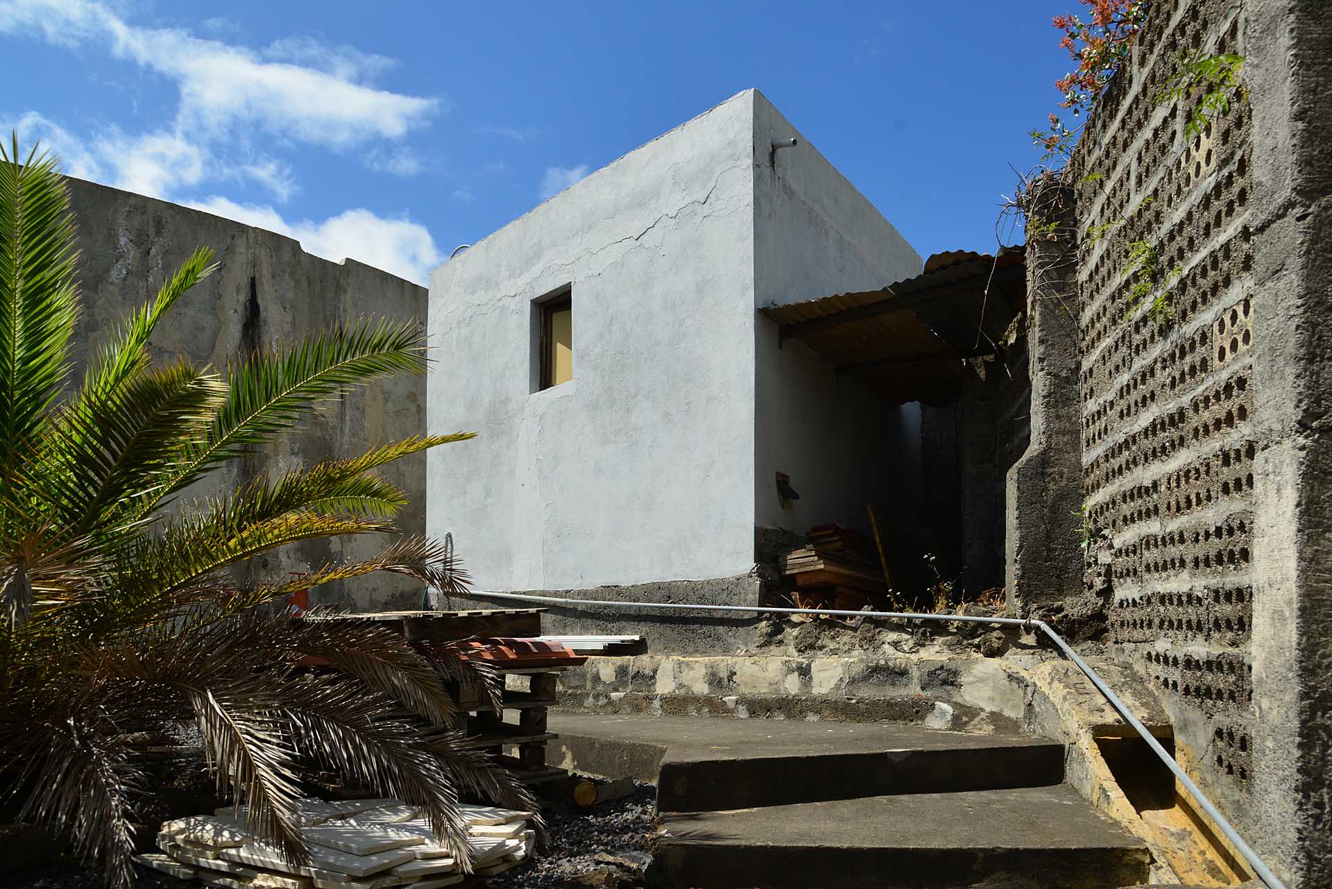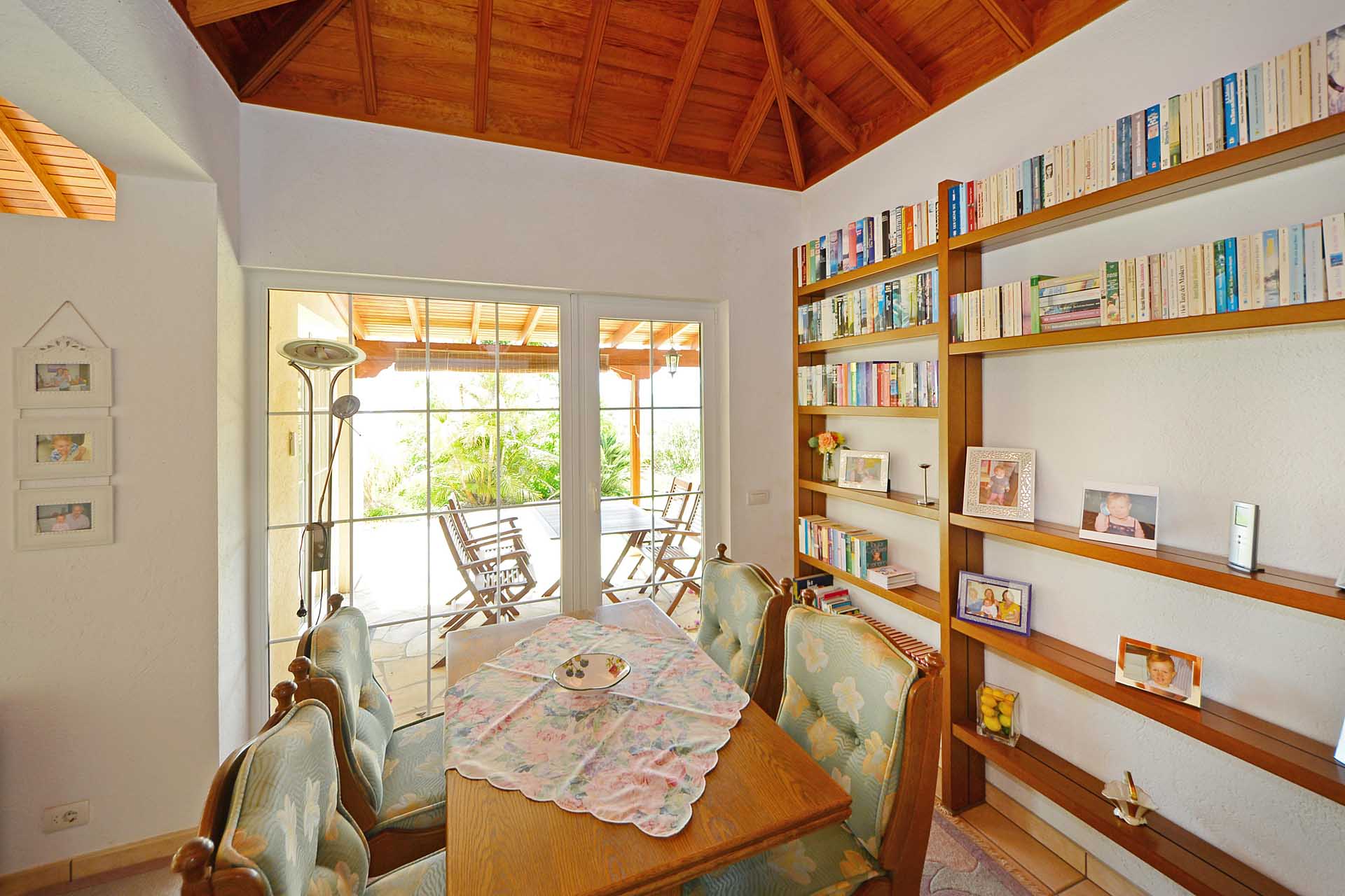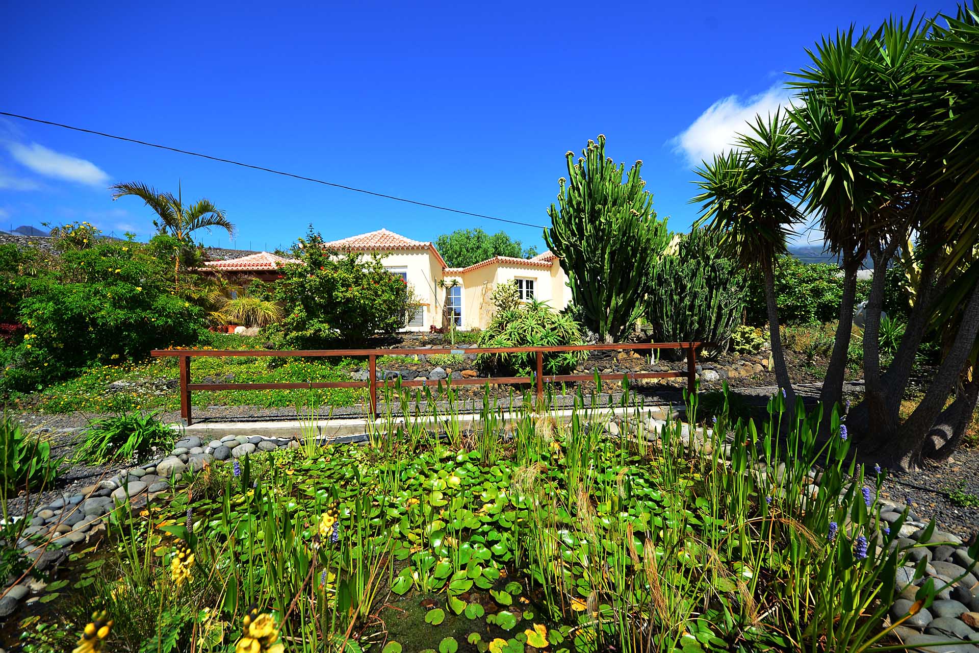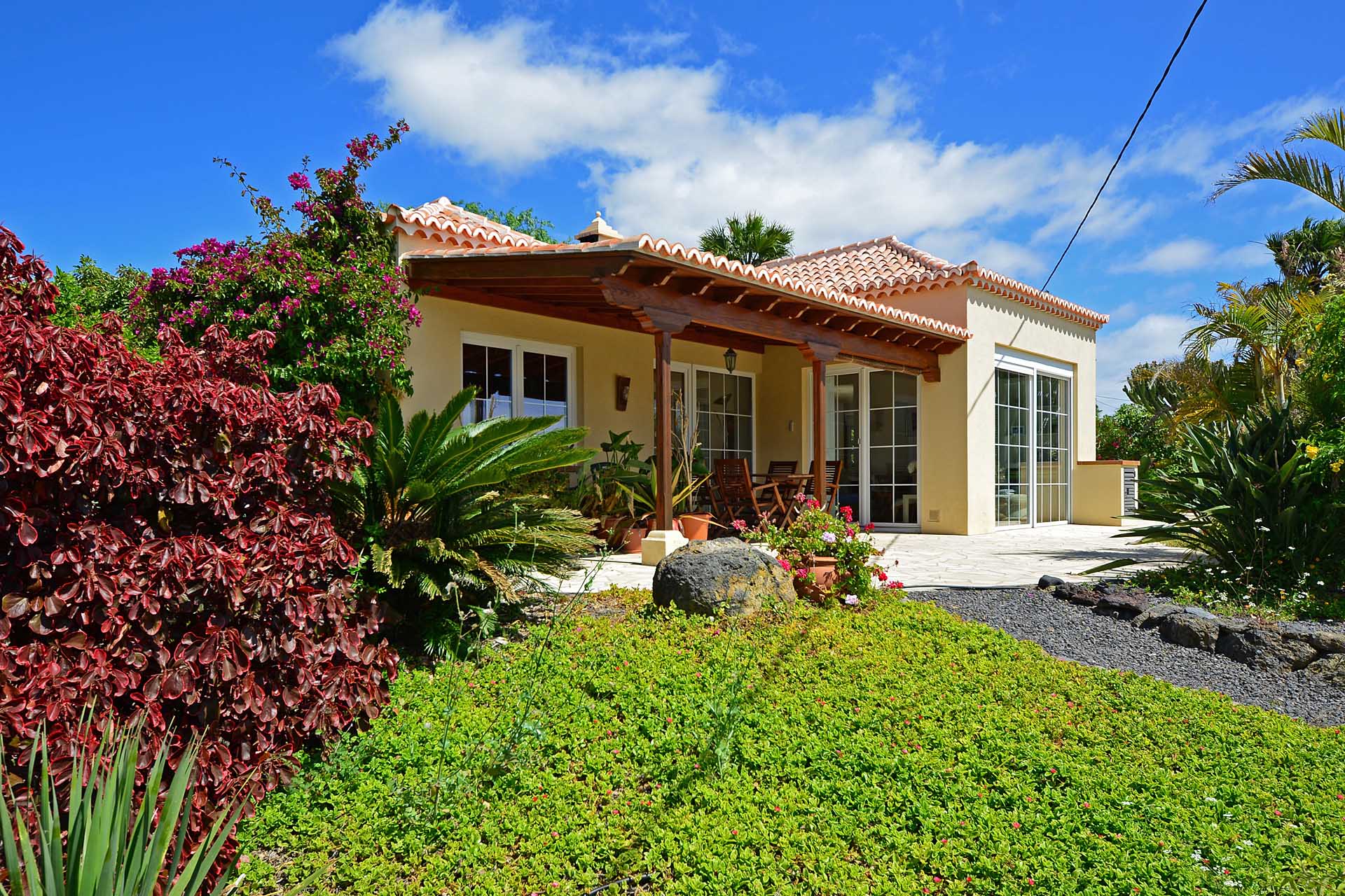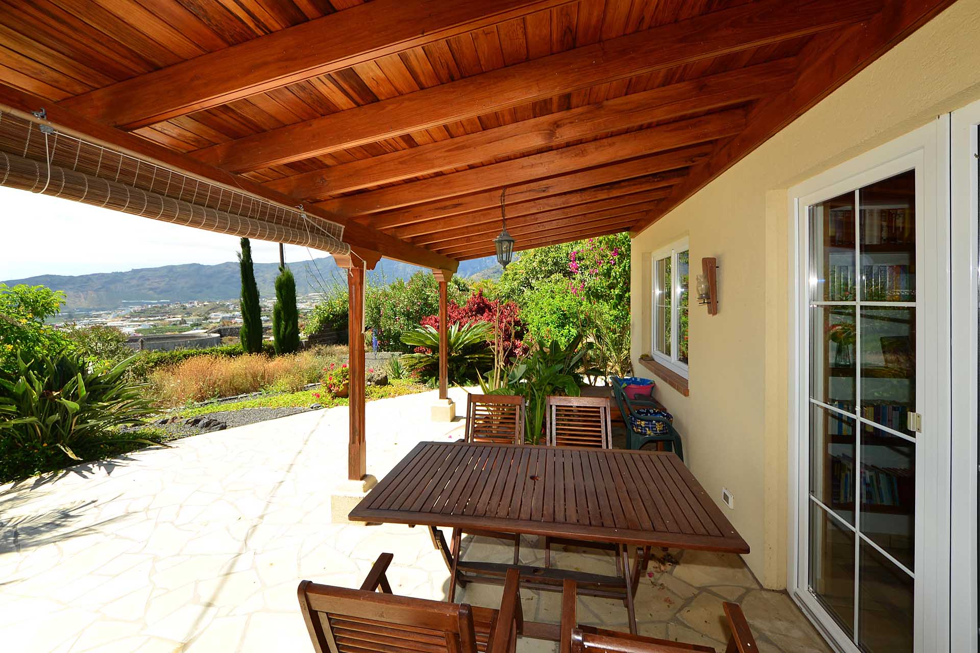 Das Wohnhaus wurde 1999 mit modernem, hellen und praktischem Grundriss neu errichtet und bietet mit seinen kanarischen Sichtholz-Dachstühlen neben herrlichem Panoramablick auf den Atlantik und die Berge auch die landestypische Gemütlichkeit des reichlich verarbeiteten Naturholzes. Sie betreten das Gebäude über eine überdachte Ostterrasse, den idealen Platz für das Frühstück bei den ersten Sonnenstrahlen. Das großzügige Wohnzimmer geht in den Ess- und Kochbereich über so dass diese zwar separiert erscheinen, jedoch nicht isoliert sind. An der Nordseite schließt sich ein Arbeitszimmer, an der Südseite zwei Schlafzimmer mit jeweils eigenem Tageslichtbad (eines mit Dusche, das andere mit Badewanne) an.