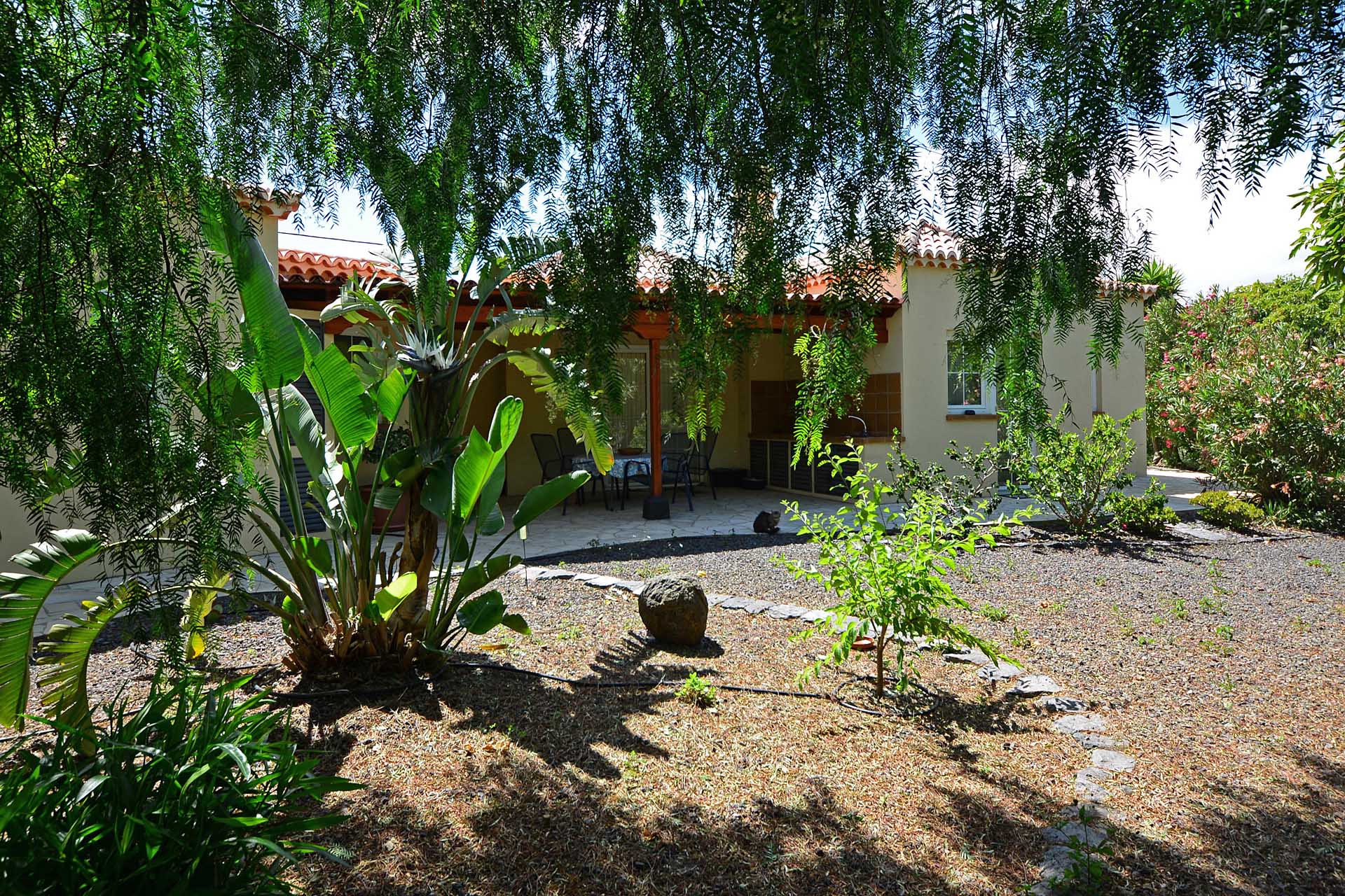 Über große Glas-Schiebetüren erreichen Sie von der Wohnküche, dem Arbeitszimmer und einem Schlafzimmer unmittelbar den sehr schön angelegten Garten, die weitere, überdachte Ostterrasse mit Außenküche und genießen den herrlichen Ausblick sowie den Sonnenuntergang über dem Atlantik.