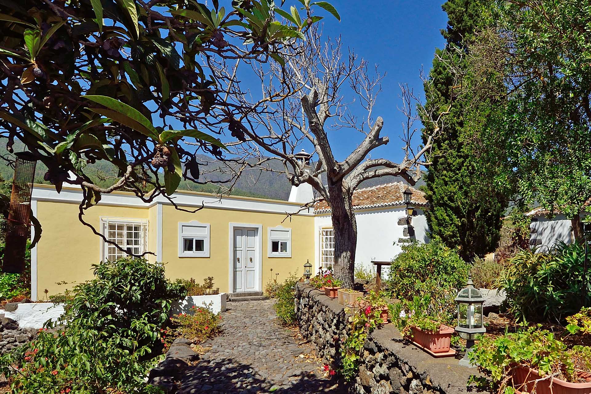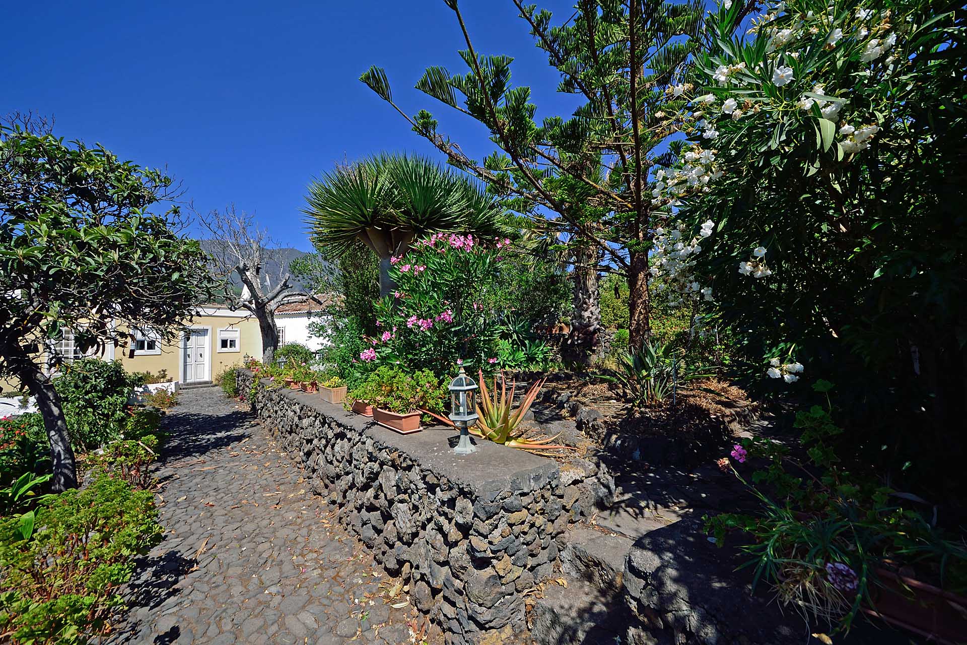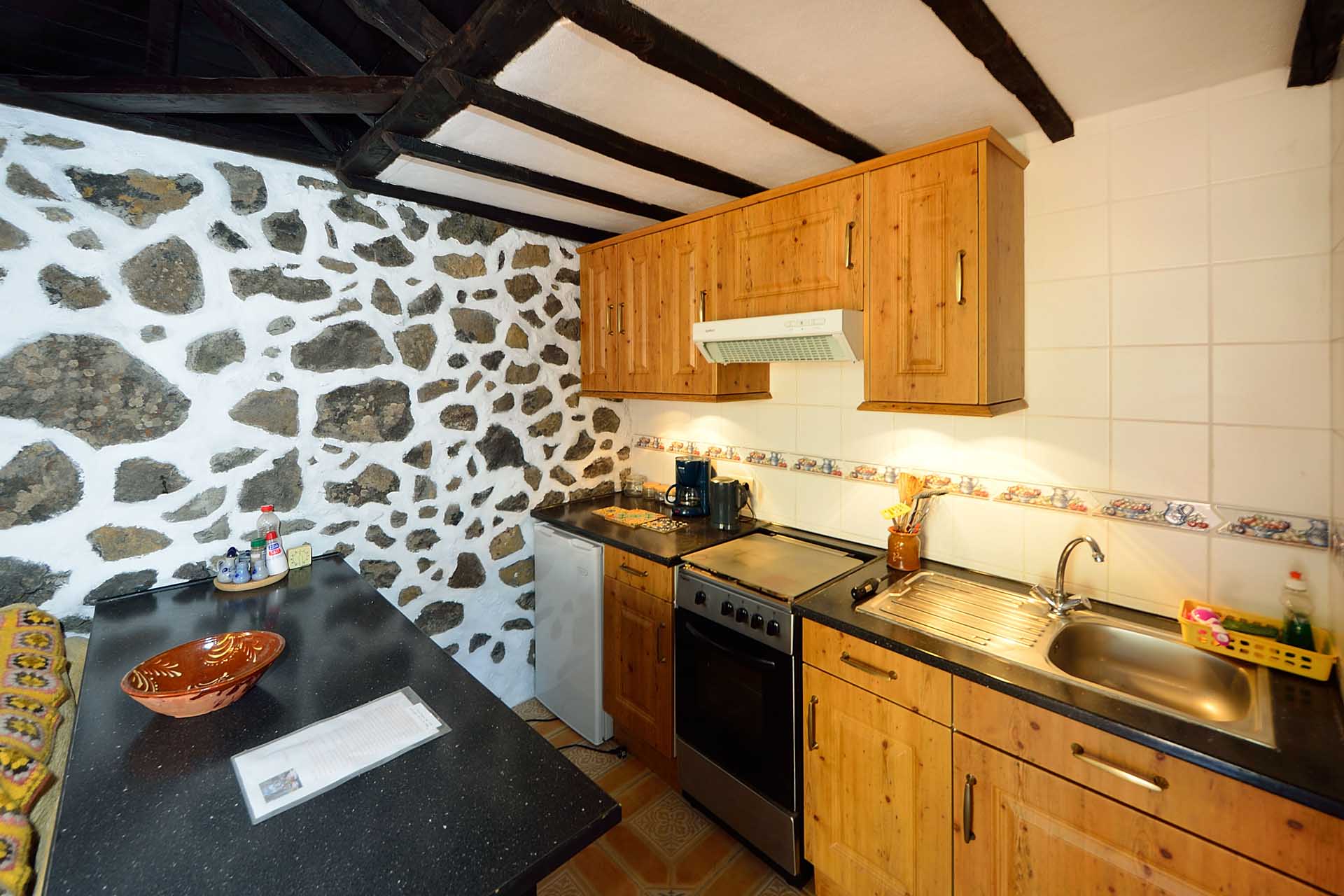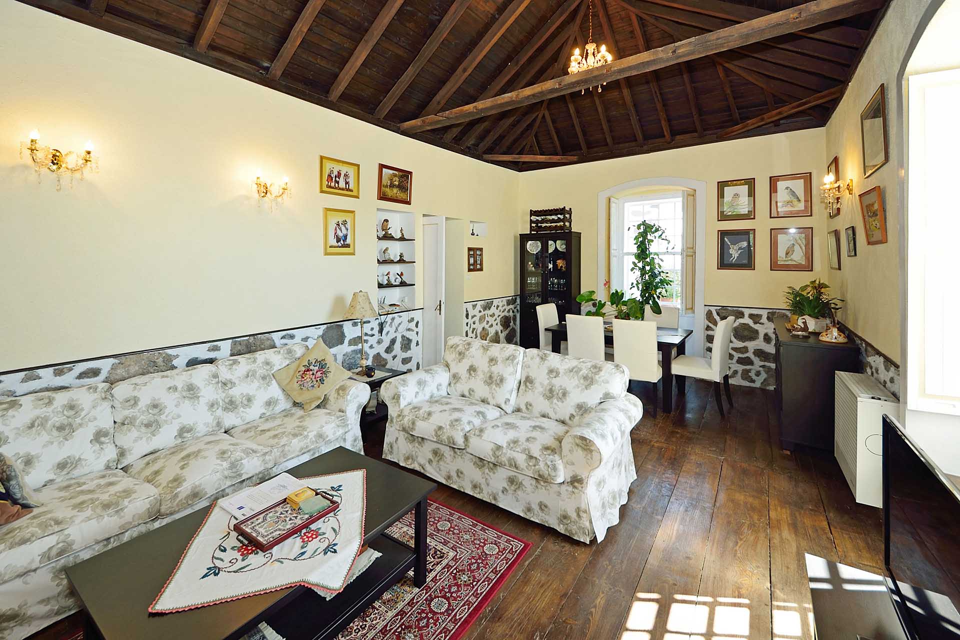 Das Hauptgebäude empfängt Sie in einem hellen Eingangsbereich von dem aus Sie in das sehr große Wohnzimmer gelangen. Es bildet den Kern der altkanarischen Finca und wurde vor ca. 200 Jahren aus Basaltgestein mit ca. 60 cm dicken Wänden erbaut. Diese klimatisieren das Gebäude heute noch besser, als die meisten modernen Baustoffe und überdauern die Jahrhunderte ohne jede Veränderung. Das herrschaftliche Flair des Salons wird durch den sehr hohen und damit klimatisch ausgleichenden, kanarischen Dachstuhl hervorgehoben. Sowohl das Dachgebälk, als auch der historische Dielenboden wurden einst aus Teaholz, dem unvergänglichen Kernholz der kanarischen Kiefer, errichtet und originalgetreu restauriert. Ein stilvoller Kaminofen sorgt nicht nur im Wohnzimmer für wohlige Wärme (sollte es nachts einmal kühl werden), sondern versorgt auch weitere Räume über Warmluftschächte mit angenehmer Temperierung. Wem das Anheizen mit Holz jedoch zu viel Arbeit ist, der kann auf die in den meisten Räumen fest installierten Gasöfen zurückgreifen, die über eigene Abgasrohre ins Freie sowie Zündautomatik und zentrale Gasversorgung verfügen. Ein stilistisches Highlight bilden die Sitzbänke für Verliebte (las sillas para los enamorados), auf denen sich früher die frisch verliebten von der Familie separierten. Der opulente Raum schließt an die stilvolle Küche mit fünfflammigem Herd und übergroßem Backofen sowie Speisekammer an.