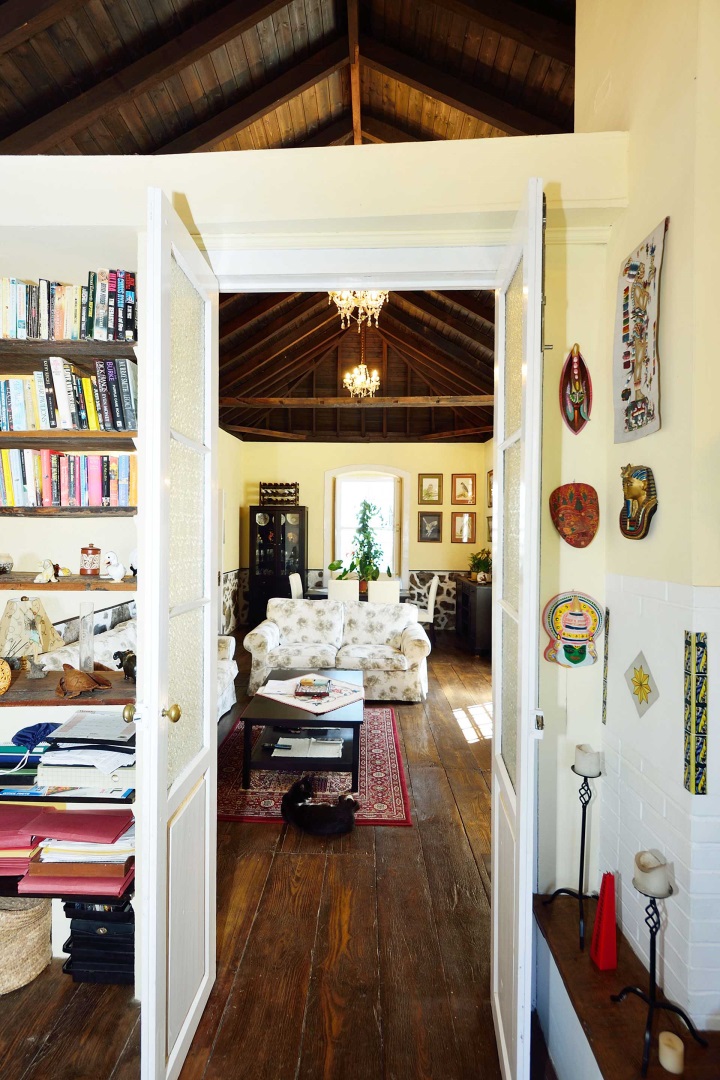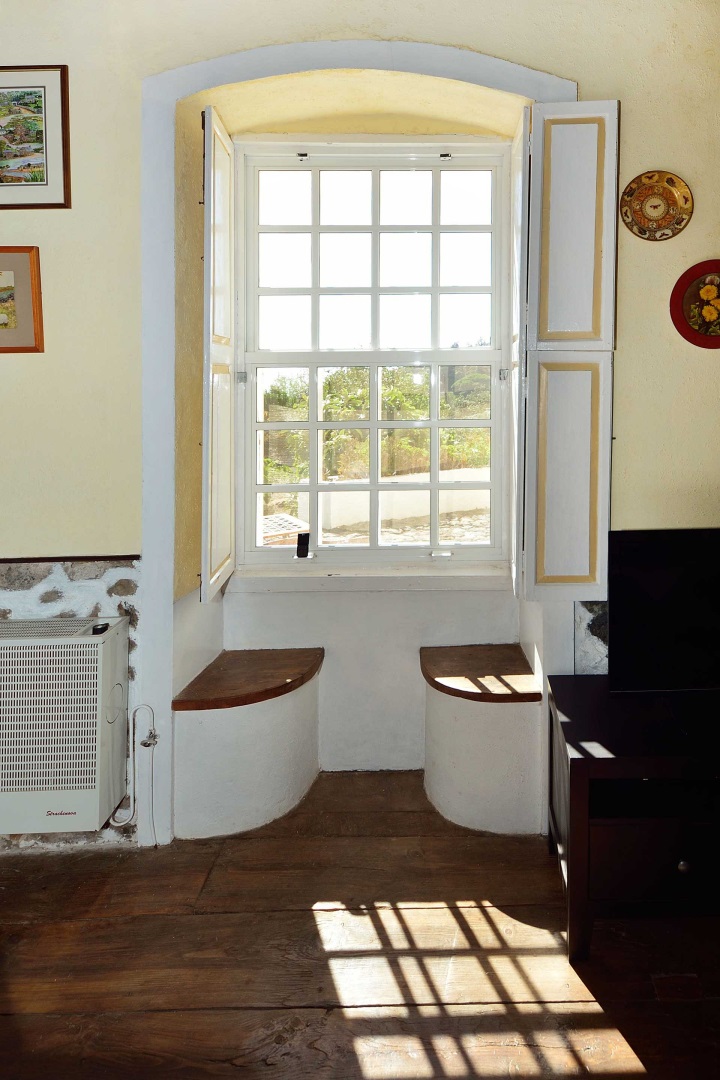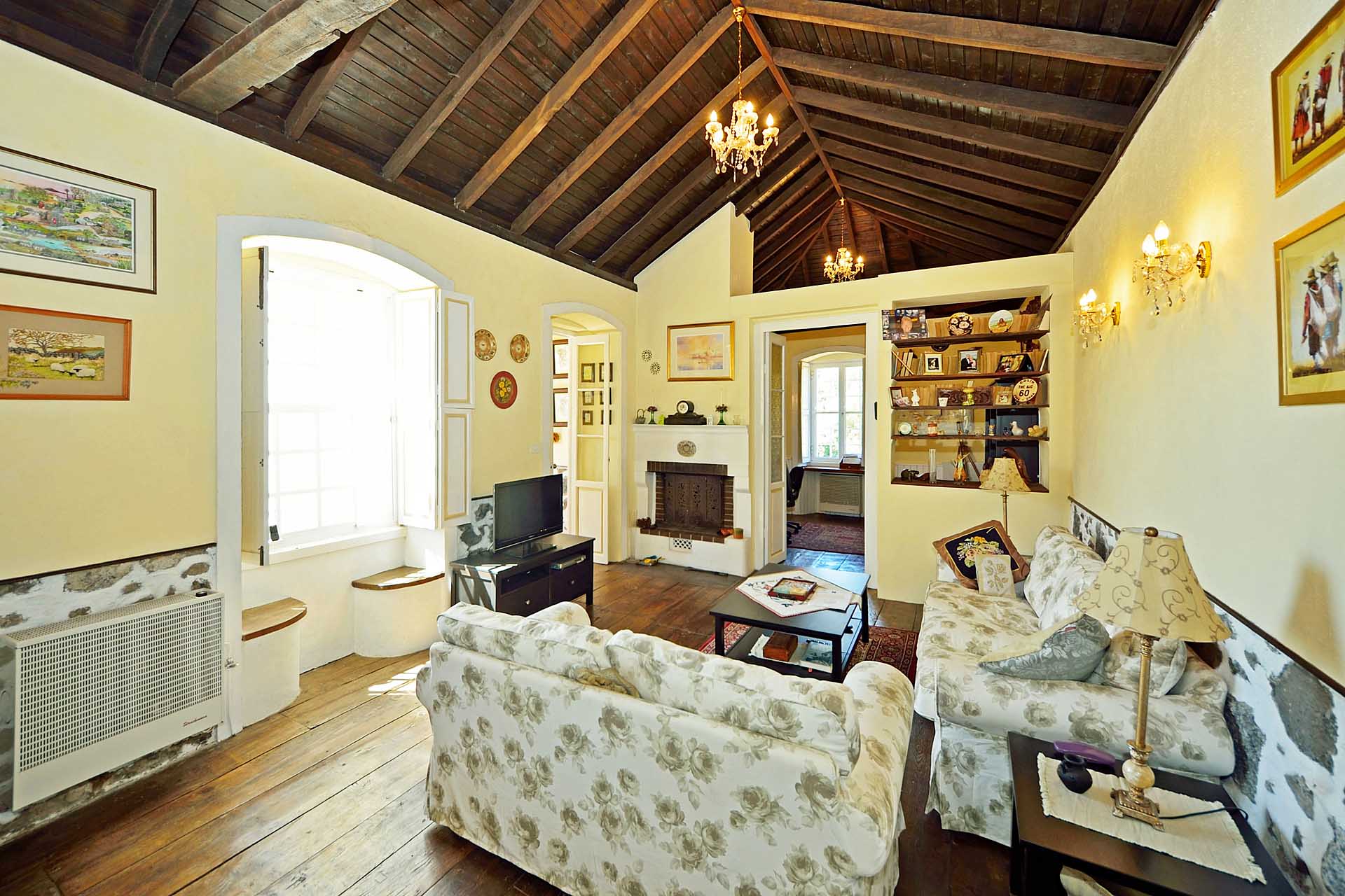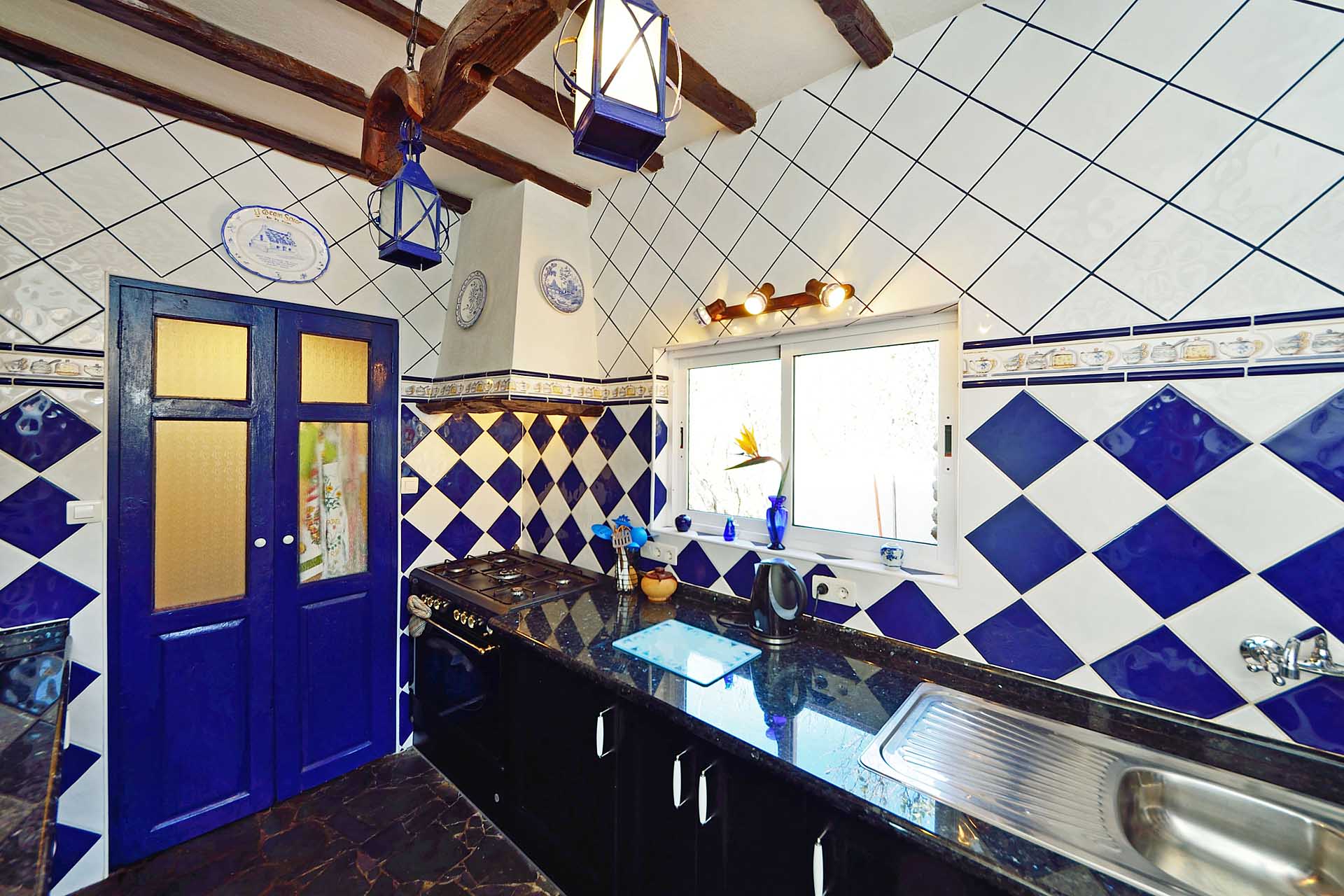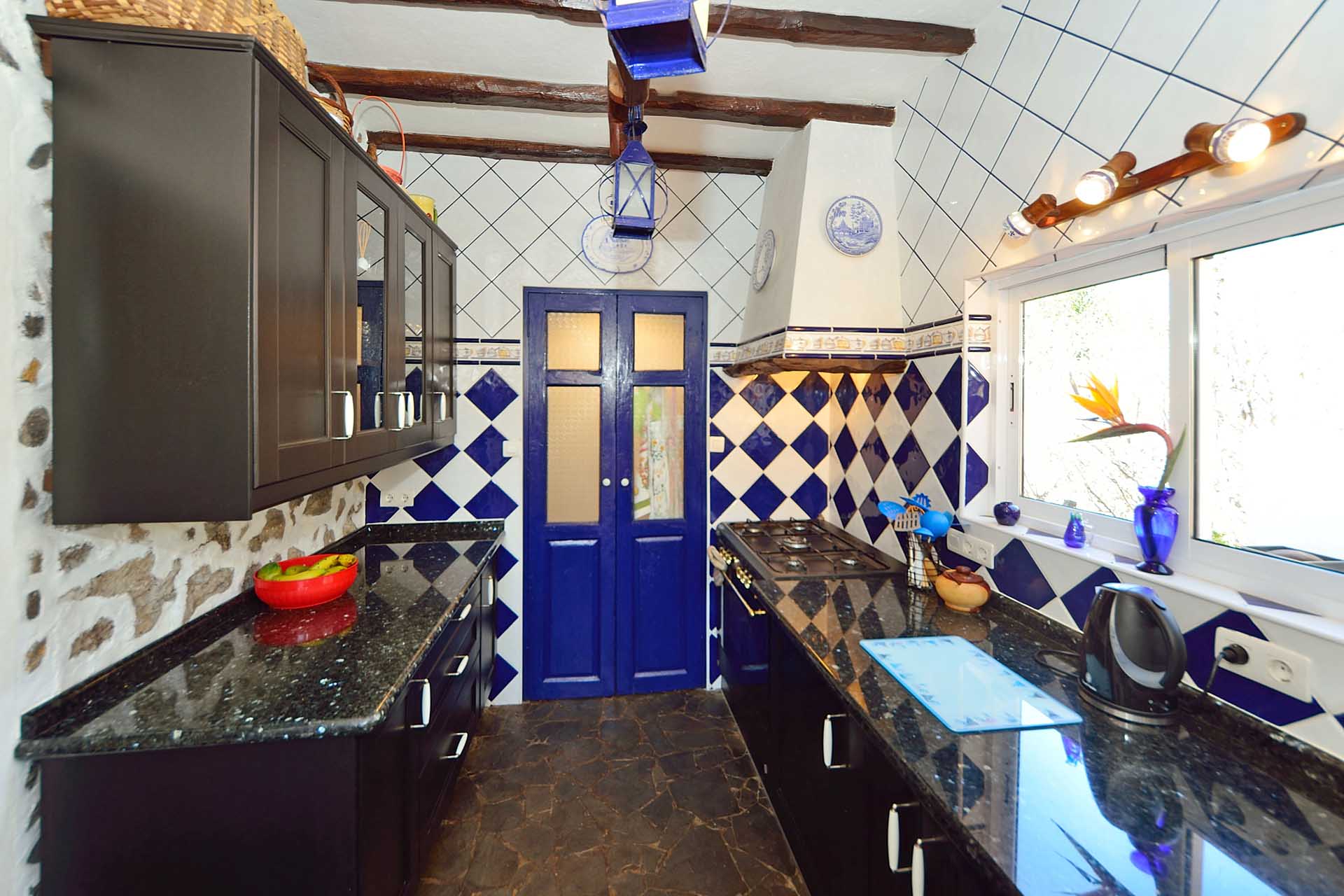 Das Hauptgebäude empfängt Sie in einem hellen Eingangsbereich von dem aus Sie in das sehr große Wohnzimmer gelangen. Es bildet den Kern der altkanarischen Finca und wurde vor ca. 200 Jahren aus Basaltgestein mit ca. 60 cm dicken Wänden erbaut. Diese klimatisieren das Gebäude heute noch besser, als die meisten modernen Baustoffe und überdauern die Jahrhunderte ohne jede Veränderung. Das herrschaftliche Flair des Salons wird durch den sehr hohen und damit klimatisch ausgleichenden, kanarischen Dachstuhl hervorgehoben. Sowohl das Dachgebälk, als auch der historische Dielenboden wurden einst aus Teaholz, dem unvergänglichen Kernholz der kanarischen Kiefer, errichtet und originalgetreu restauriert. Ein stilvoller Kaminofen sorgt nicht nur im Wohnzimmer für wohlige Wärme (sollte es nachts einmal kühl werden), sondern versorgt auch weitere Räume über Warmluftschächte mit angenehmer Temperierung. Wem das Anheizen mit Holz jedoch zu viel Arbeit ist, der kann auf die in den meisten Räumen fest installierten Gasöfen zurückgreifen, die über eigene Abgasrohre ins Freie sowie Zündautomatik und zentrale Gasversorgung verfügen. Ein stilistisches Highlight bilden die Sitzbänke für Verliebte (las sillas para los enamorados), auf denen sich früher die frisch verliebten von der Familie separierten. Der opulente Raum schließt an die stilvolle Küche mit fünfflammigem Herd und übergroßem Backofen sowie Speisekammer an.