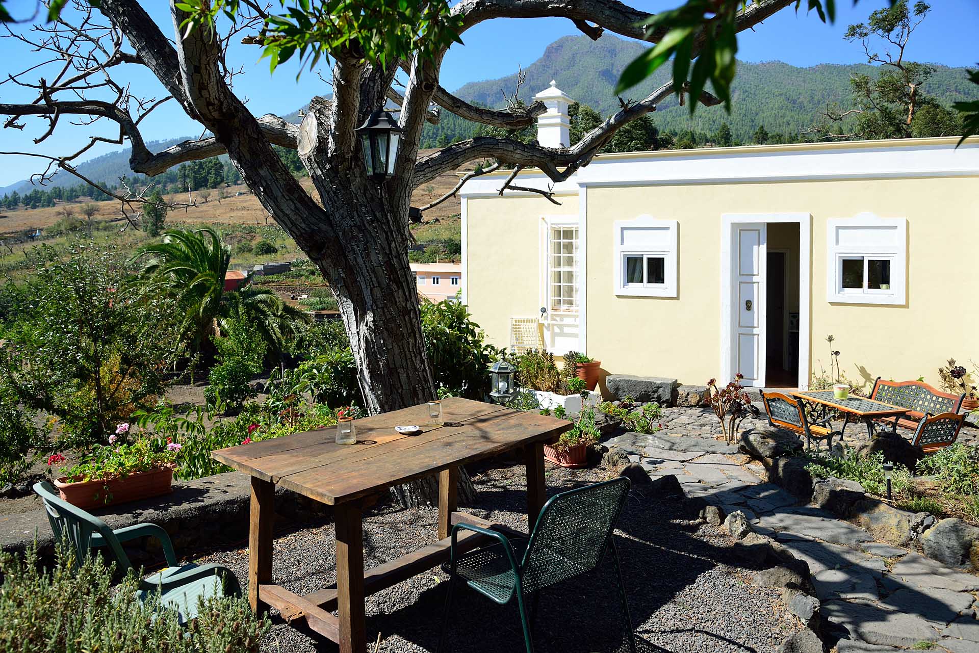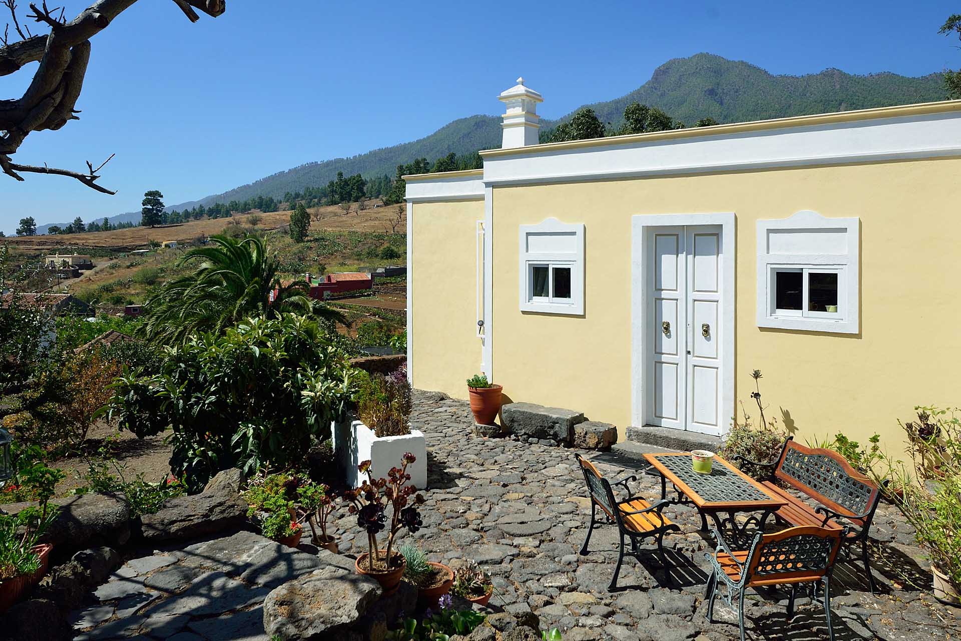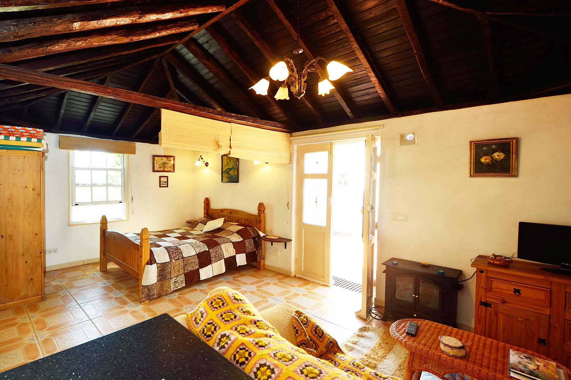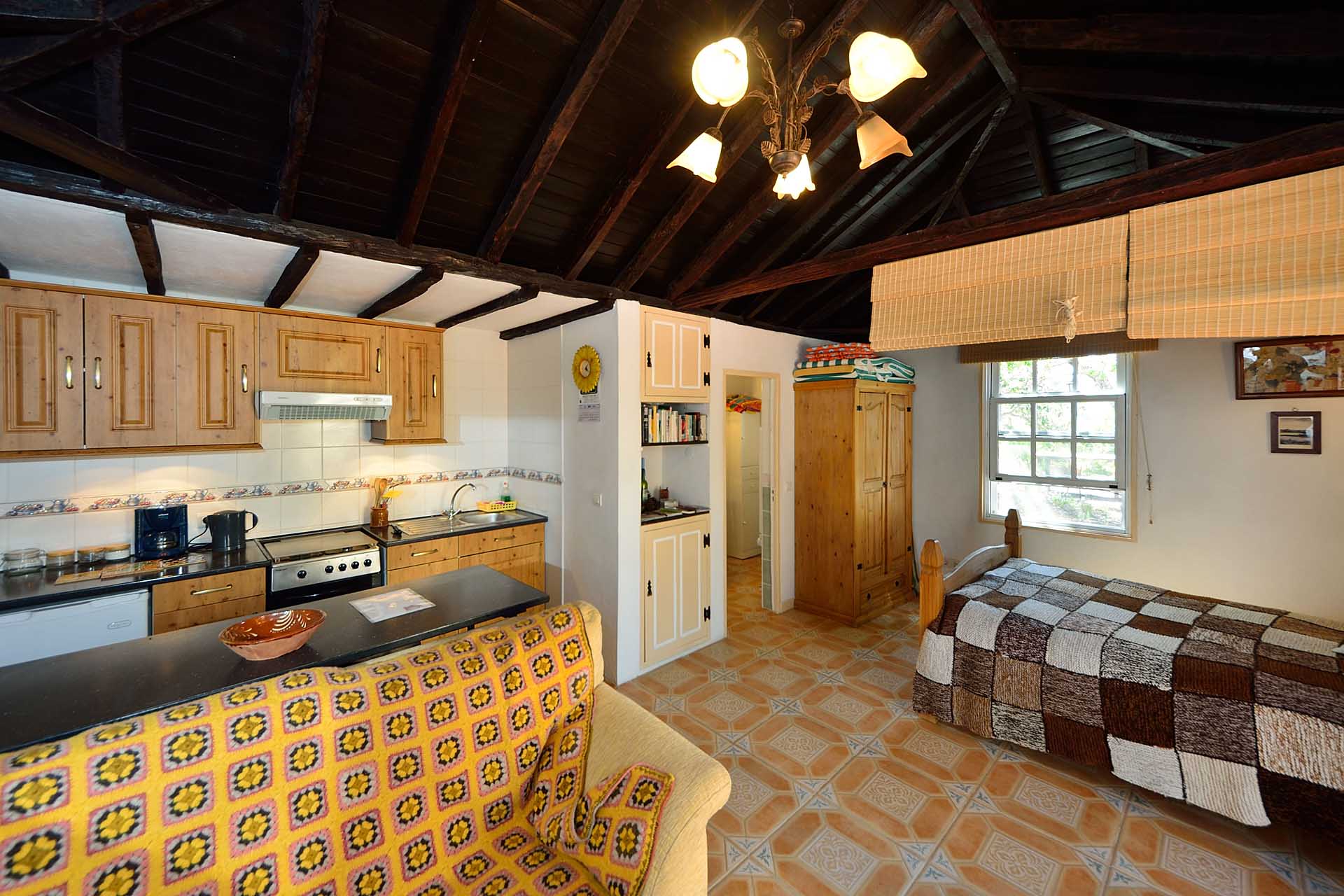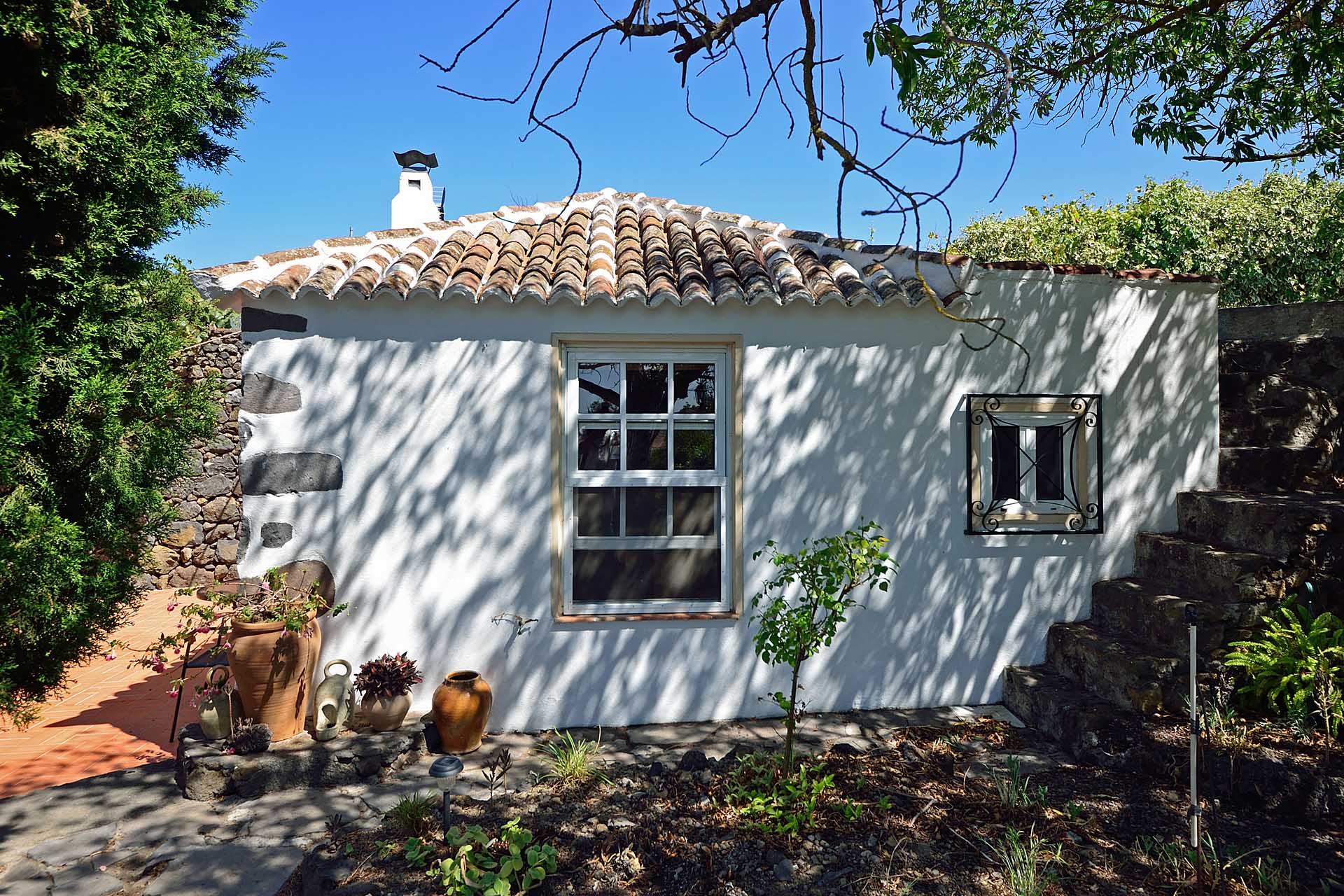 Über einen Innenhof mit Außenküche gelangen Sie zum separaten Gästehaus, das ebenfalls aus Natursteinmauern in historisch kanarischer Bauweise errichtet und liebevoll restauriert wurde. Unter originalem Holz-Dachstuhl beherbergt es ein Studio, also Wohnraum, Küche und Schlafbereich in einem großen Raum, sowie ein eigens Duschbad mit Tageslicht. Hier werden sich Ihre Gäste wohlfühlen und auch ein längerer Besuch aus der Heimat fällt nicht zur Last, weil das separate Gebäude alles bietet, was man für einen Ferienaufenthalt benötigt.
