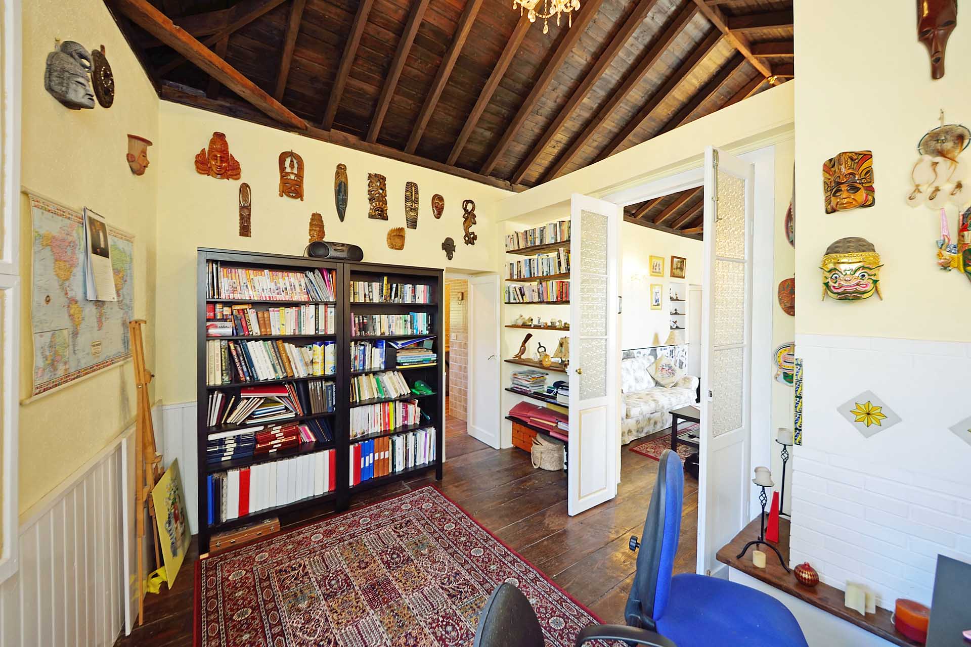 An der anderen Seite erschließt sich unter gleichem Dachstuhl das Arbeitszimmer, durch das Sie in Gästeschlafzimmer und Gästebad gelangen. Ob man in diesem Ambiente wirklich zum Arbeiten kommt, sei dahingestellt, die Möglichkeit besteht zumindest.