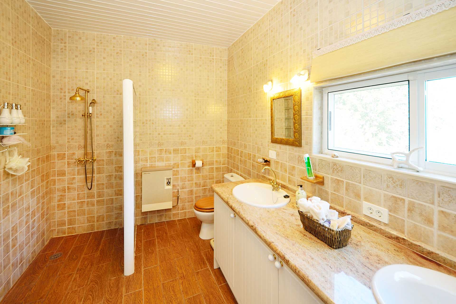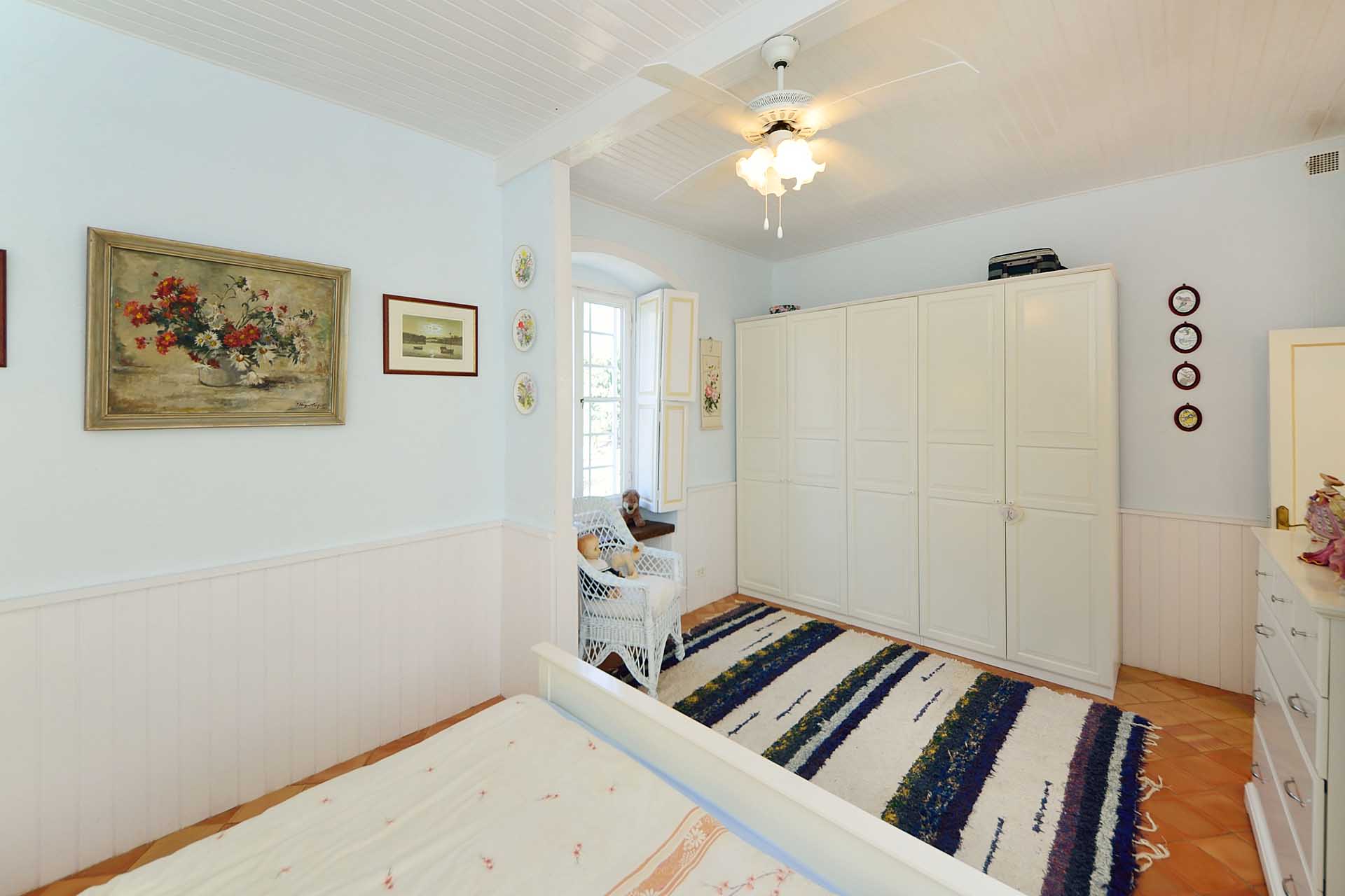 Abseits vom Tagesgeschehen finden wir im Kolonialflügel den Master Bedroom mit viel Platz im großen Kleiderschrank und Fenstern an beiden Seiten. So können Sie nach dem Wachwerden gleich sehen, wie die Sonne auf die Berge scheint oder in das erwachende Tal. Das Masterbad ist über einen breiten Durchgang mit einer Waschküche verbunden, die viel Platz nicht nur zum Waschen, sondern auch zusammenlegen der Wäsche bietet und stilvoll gefliest wurde.