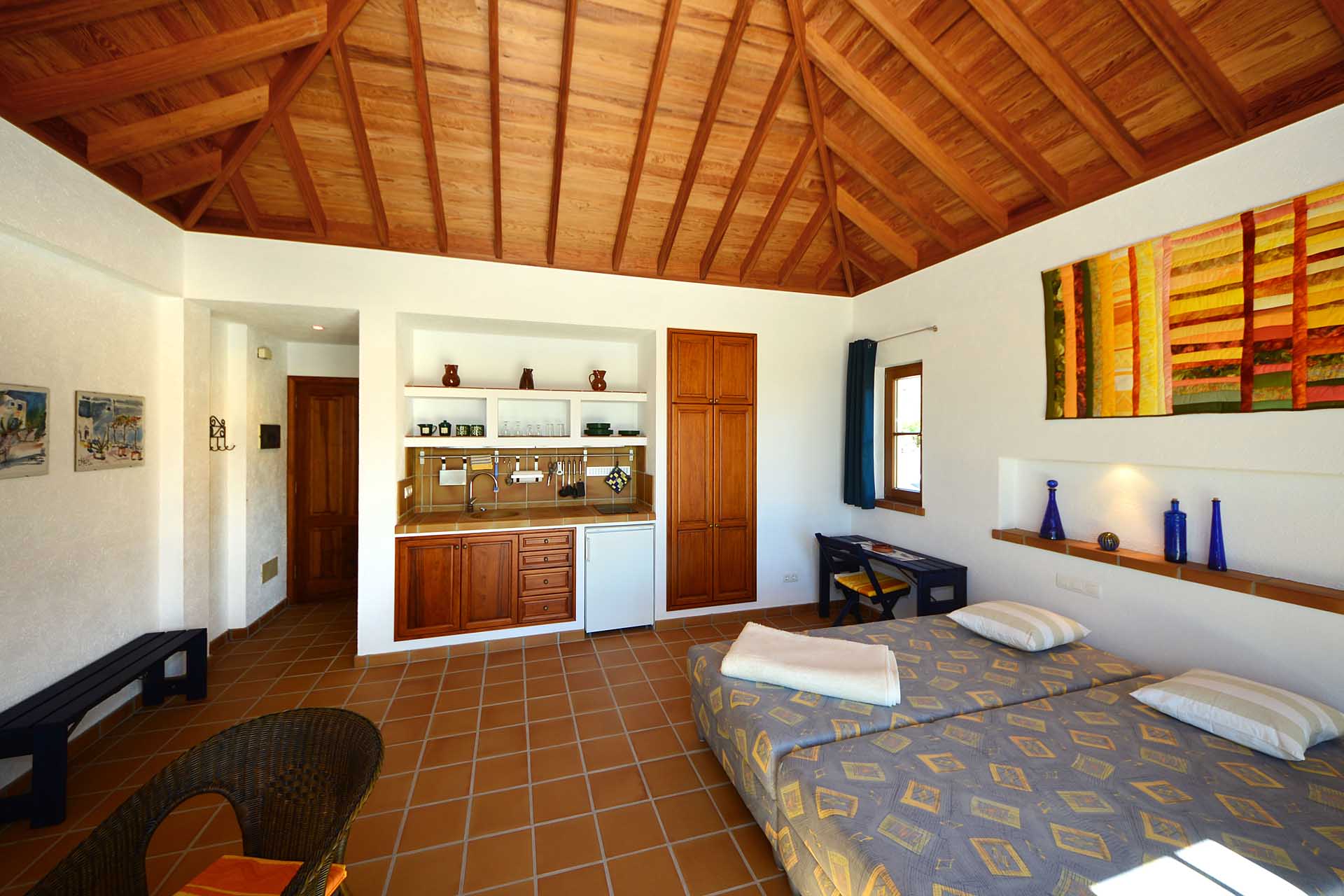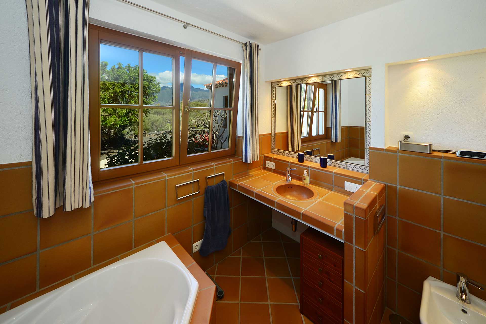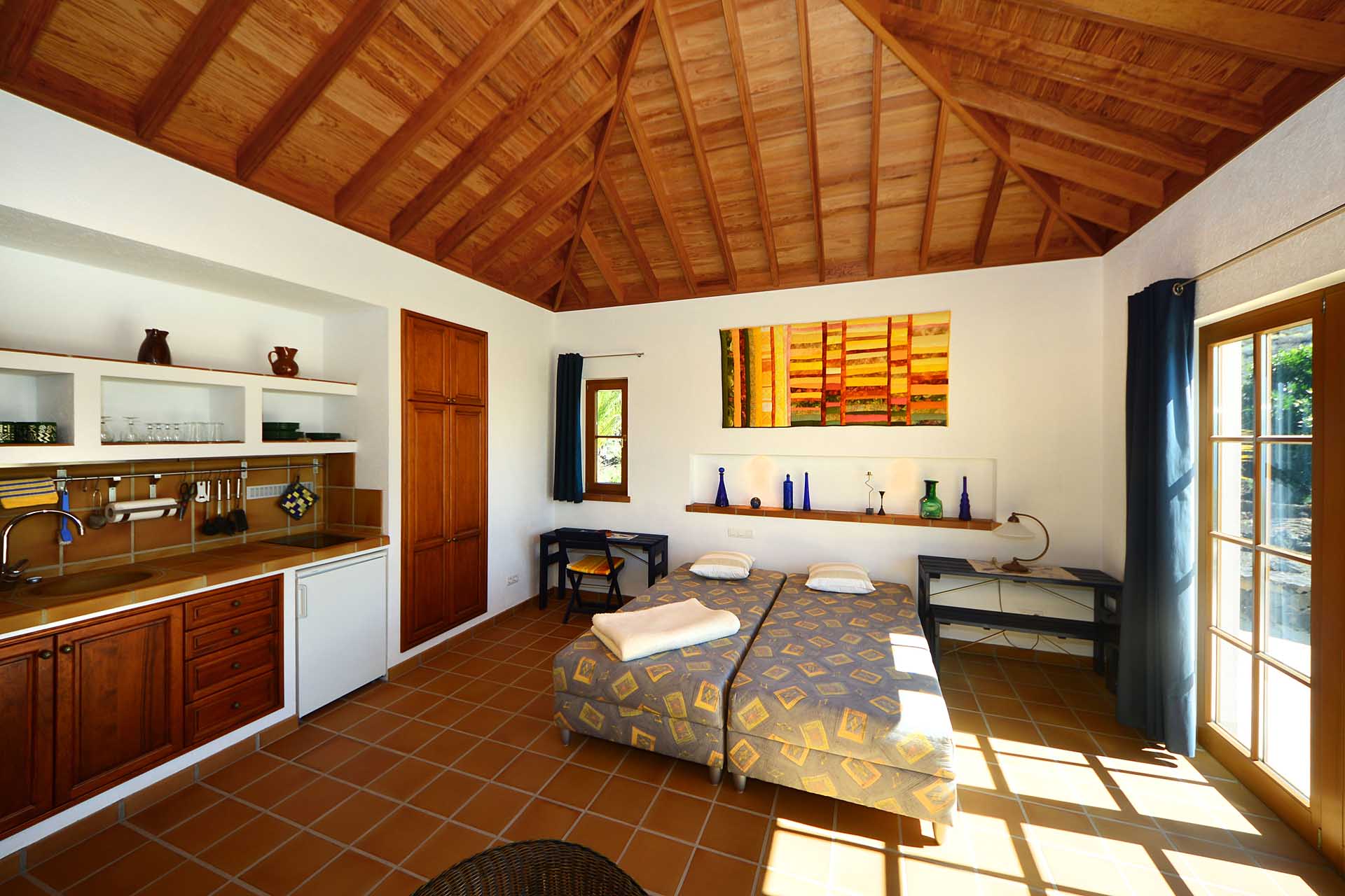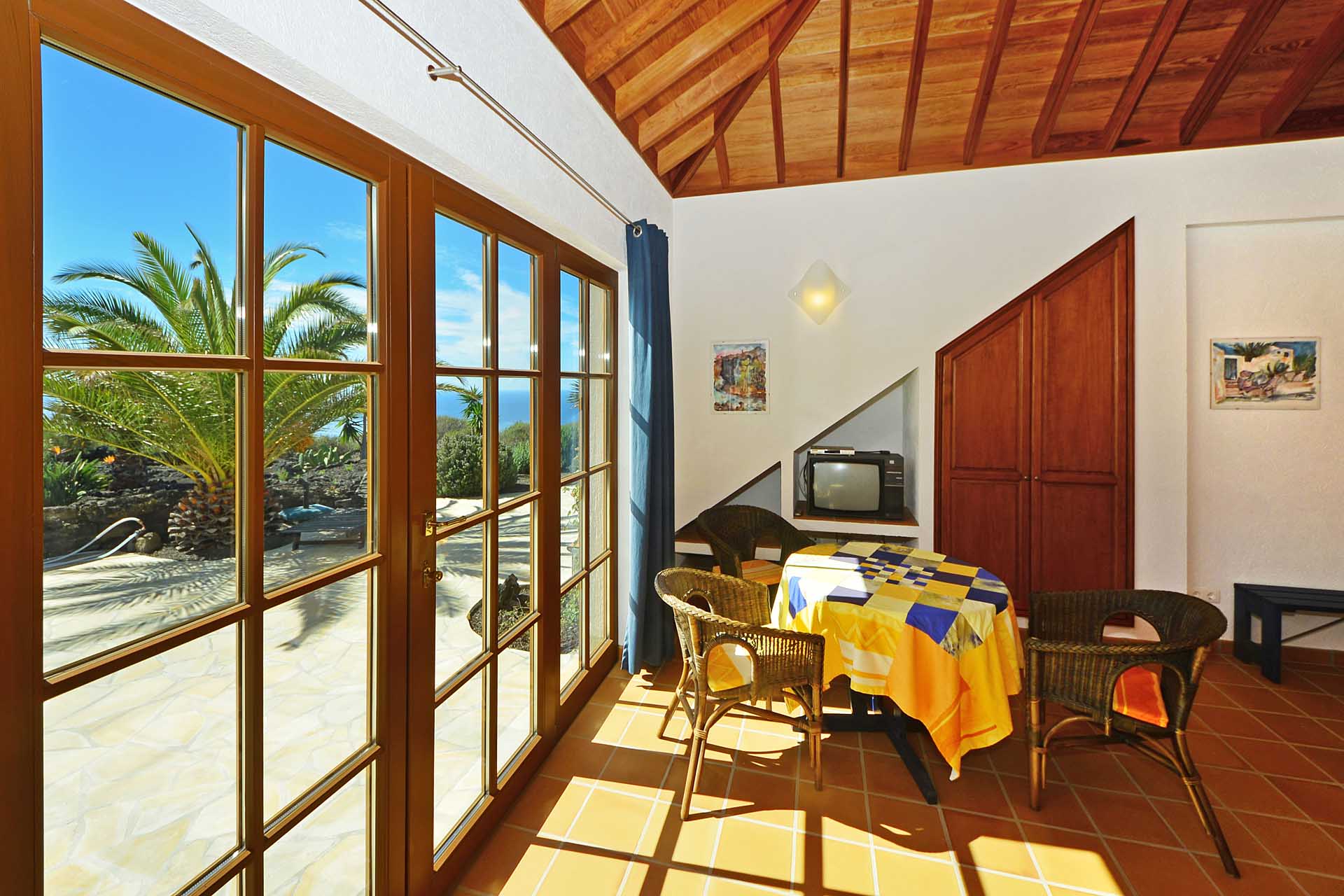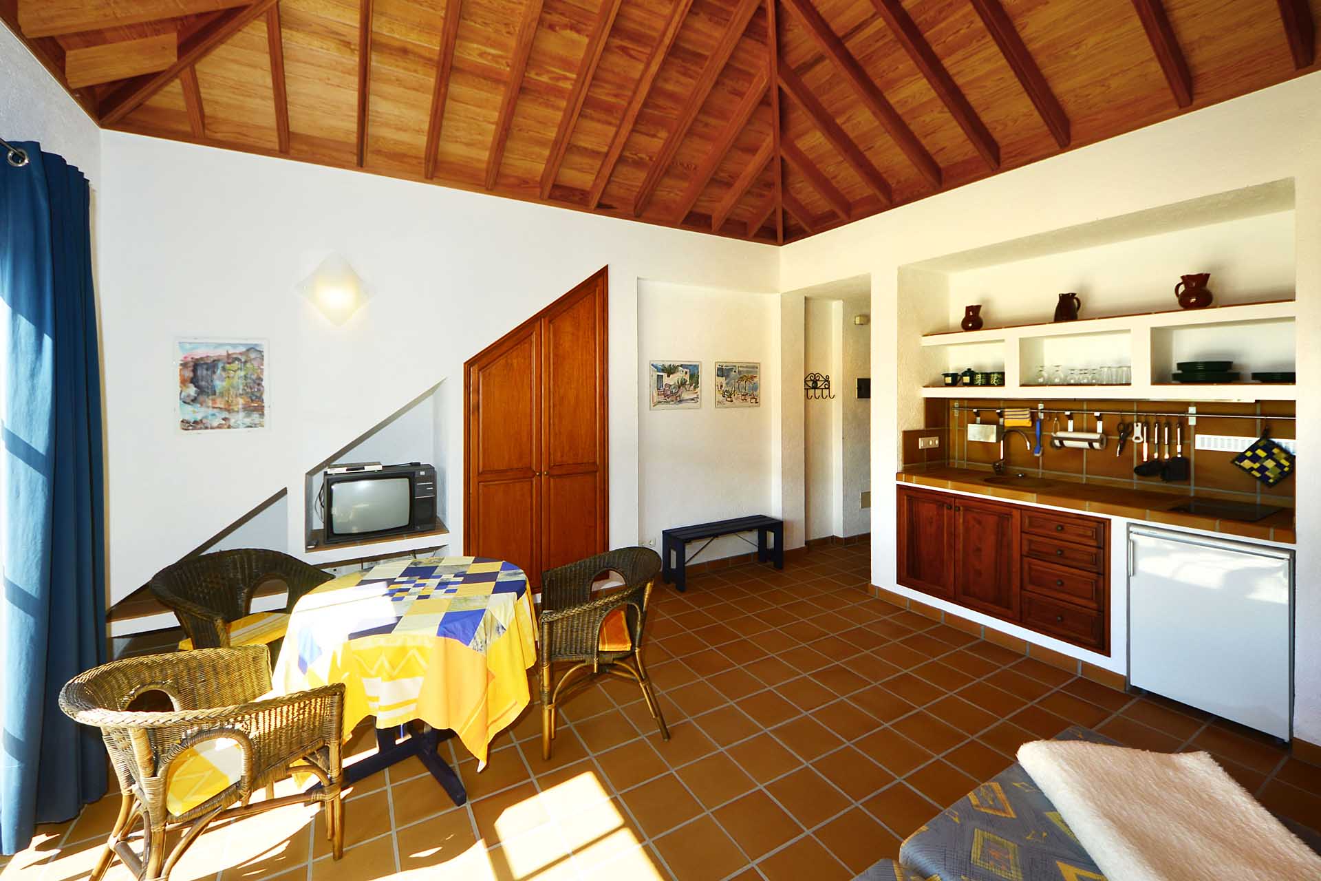 Wesentliches Gestaltungsmerkmal beim Entwurf des Grundrisses waren die Nischen für die Einbauschränke, die die kanarischen Holzdächer der Räume gut zur Geltung kommen lassen. Die große Garage lässt sich neben der Einstellmöglichkeit für ein Fahrzeug auch als Hobby-Werkstatt und zum Abstellen von Gartengeräten nutzen. Die Gartenanlage fügt sich harmonisch in die ursprüngliche, vulkanische, mit Ginster und kanarischem Lavendel bewachsene Landschaft ein. Die lebhafte Mischung aus Palmen, teils blühenden Bäumen und Sträuchern, Kakteen sowie endemischen Pflanzen ermöglicht die pflegeleichte Unterhaltung des Gartens. Eine besondere Attraktion stellt die überall sichtbare Stricklava dar, die in privaten Gärten nur selten anzutreffen ist.
