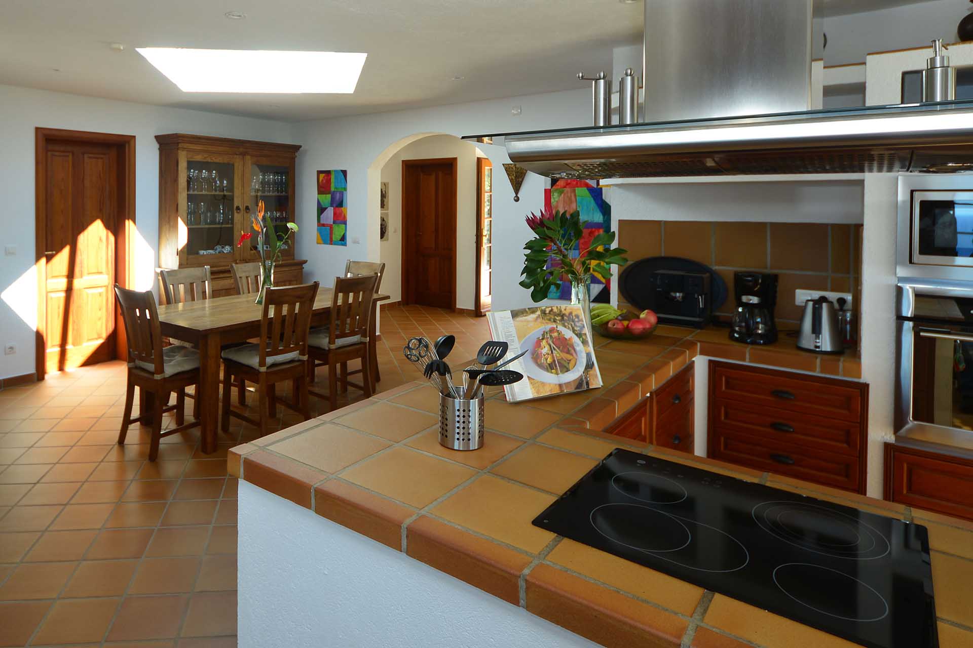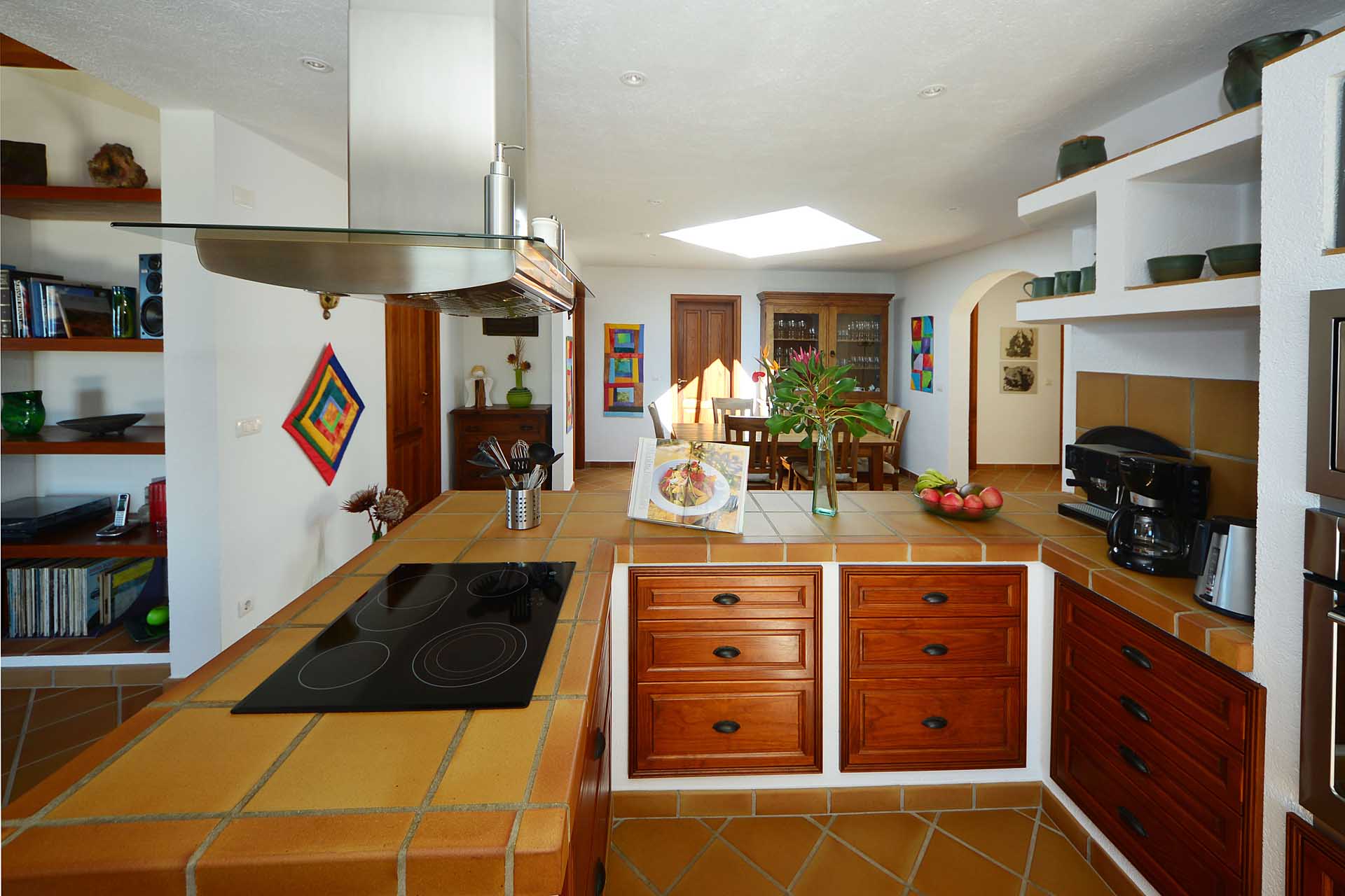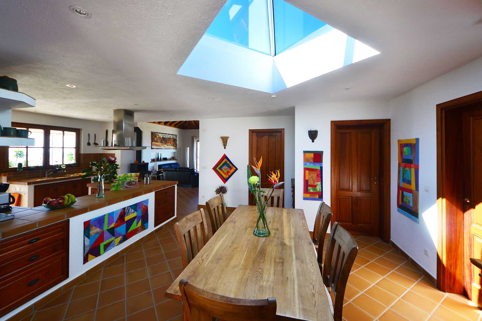 Im Zentrum des Hauses schafft eine große Lichtpyramide über dem Essbereich angenehme Helligkeit. Vom großen Fenster des Wohnbereichs aus blickt man direkt auf das Meer. Die Bodenbeläge, Wand- und Arbeitsflächen von Küche und Bädern aus Feinsteinzeug (Gres de Aragón) betonen den rustikalen Charakter des Hauses. Der Wohnbereich ist vollständig von Terrassen umgeben, die mit Solnhofer Platten belegt sind. Mit Ausnahme der Bäder und des Essbereichs haben alle Räume direkten Zugang zu den Terrassen.