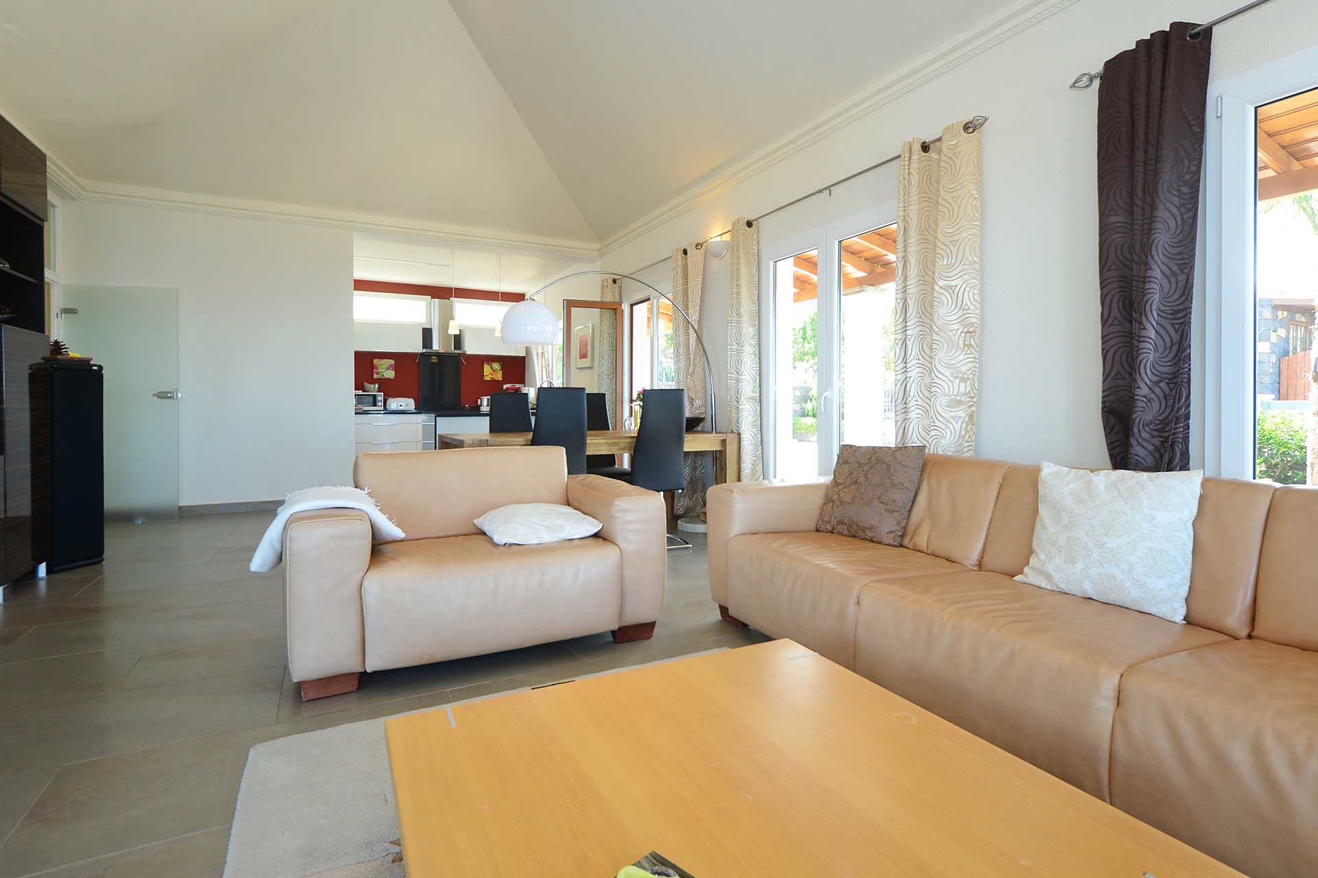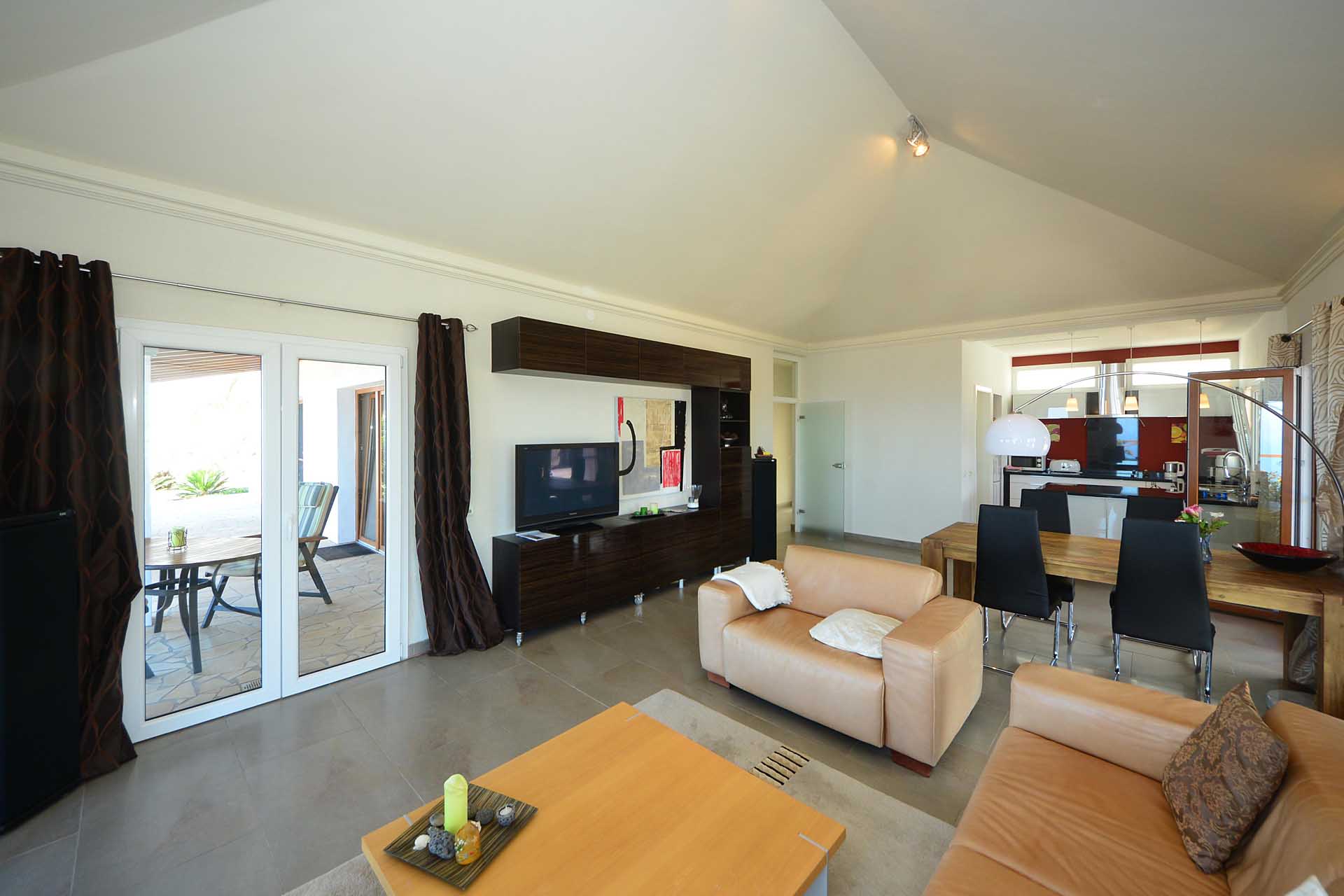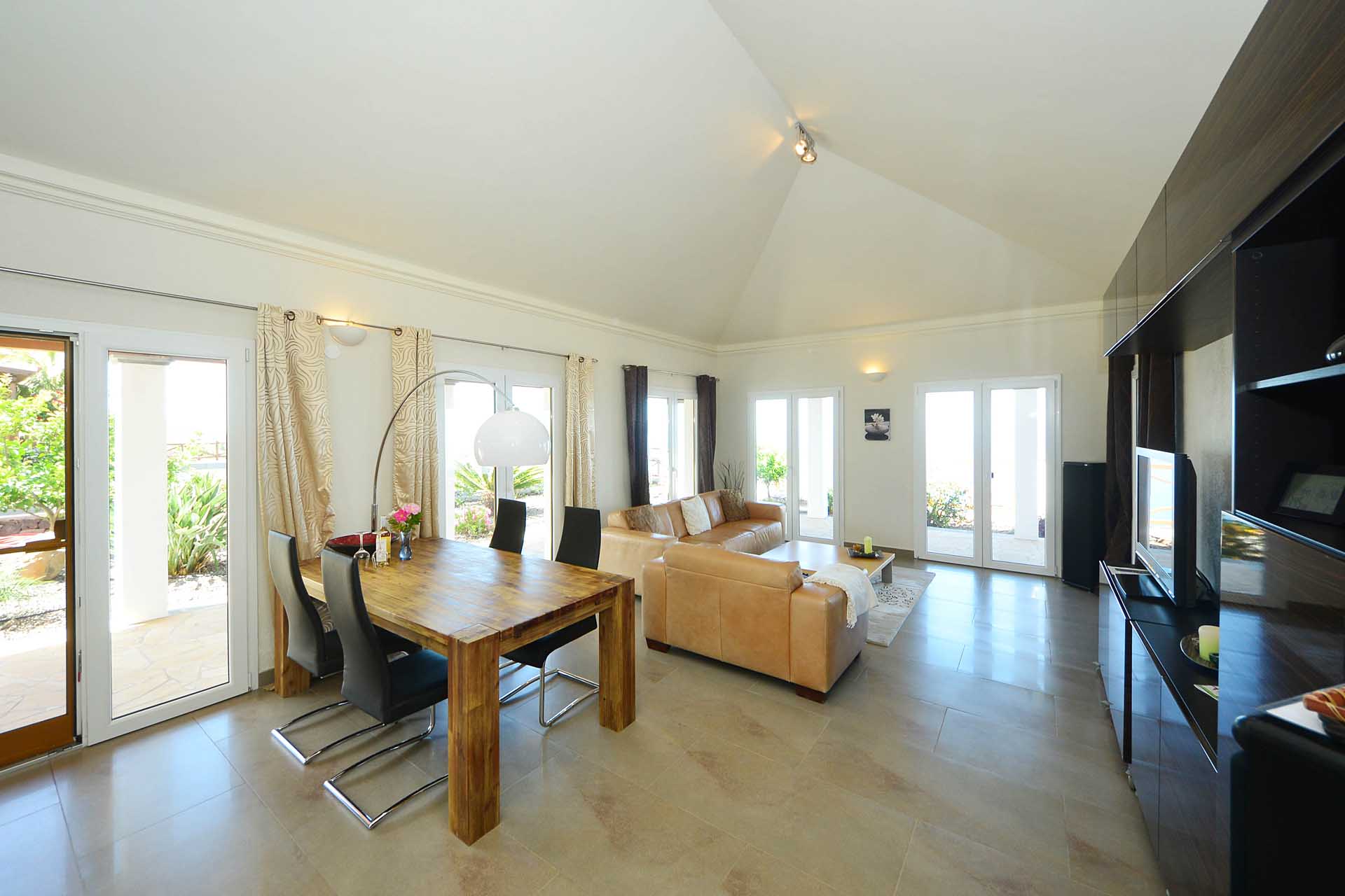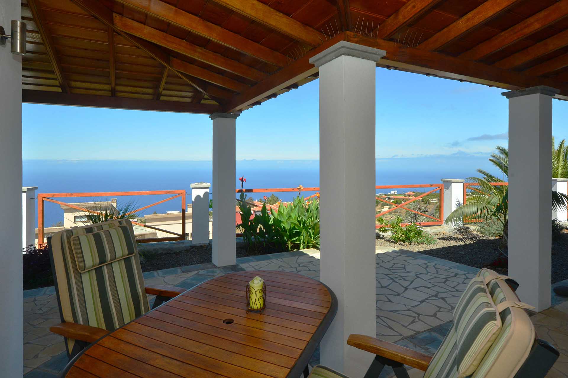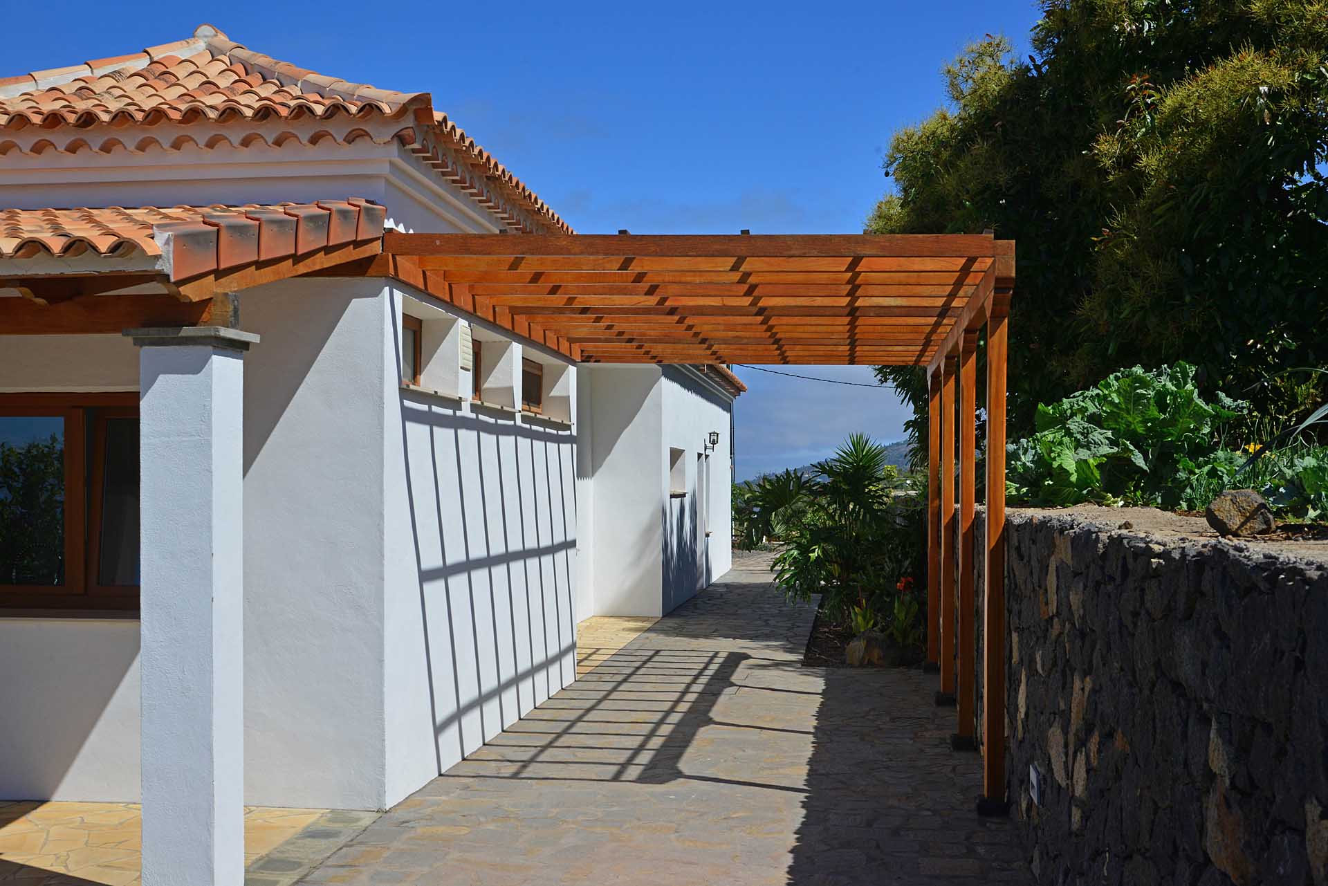 Die 2009 fertig gestellt Villa kombiniert nordeuropäische Wohnbedürfnisse nach hellen und großzügigen Räumen mit sowohl kanarischen Stilelementen als auch mediterranem Flair. Auf 190 m² Grundfläche beherbergt sie eine sehr große Wohnküche mit fantastischem Blick durch die bodengleichen, großen, aus Deutschland importierten Qualitätsfenster, einen anschließenden Hauswirtschaftsraum, zwei Schlafzimmer, ein Arbeits- oder weiteres Schlafzimmer und zwei Bäder und einen hellen Eingangsbereich mit Flur. Bis auf ein Schlafzimmer haben alle Räume herrlichen Meerblick; die bodentiefen Fenster wurden mit einem breiten, ziegelgedeckten Vordach beschattet, so dass sie angenehm temperiert bleiben und Sie von fast allen Räumen unmittelbar auf die Terrasse treten und im Schatten oder in der Sonne sitzen können.