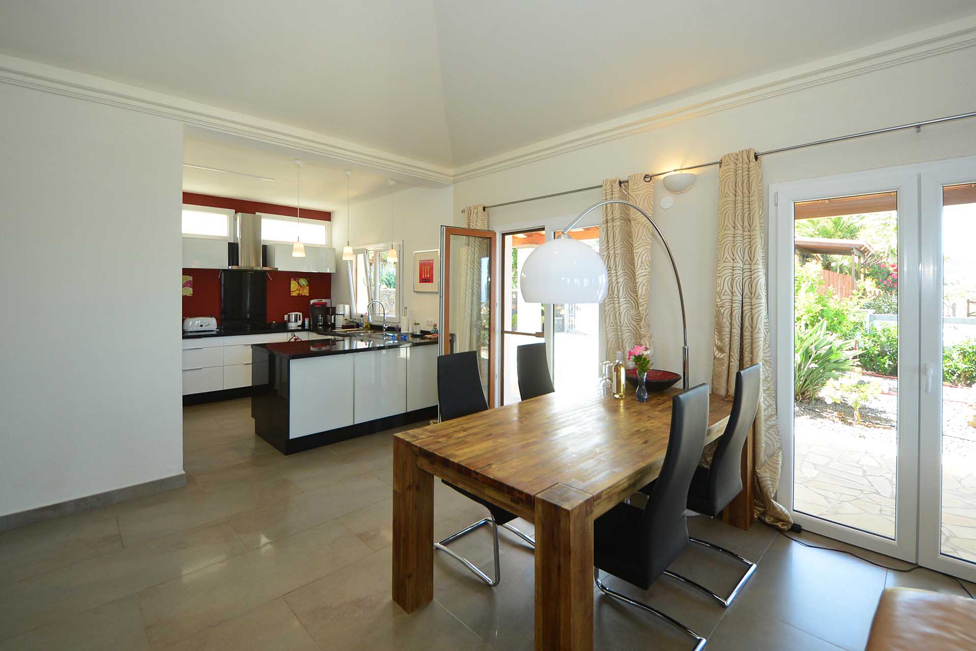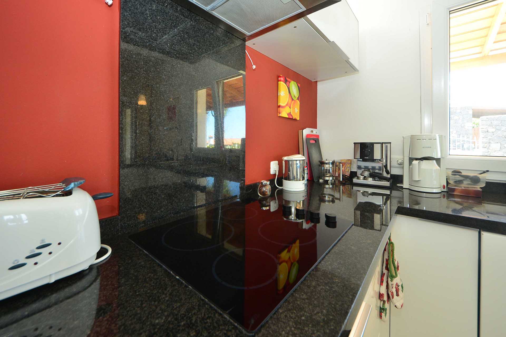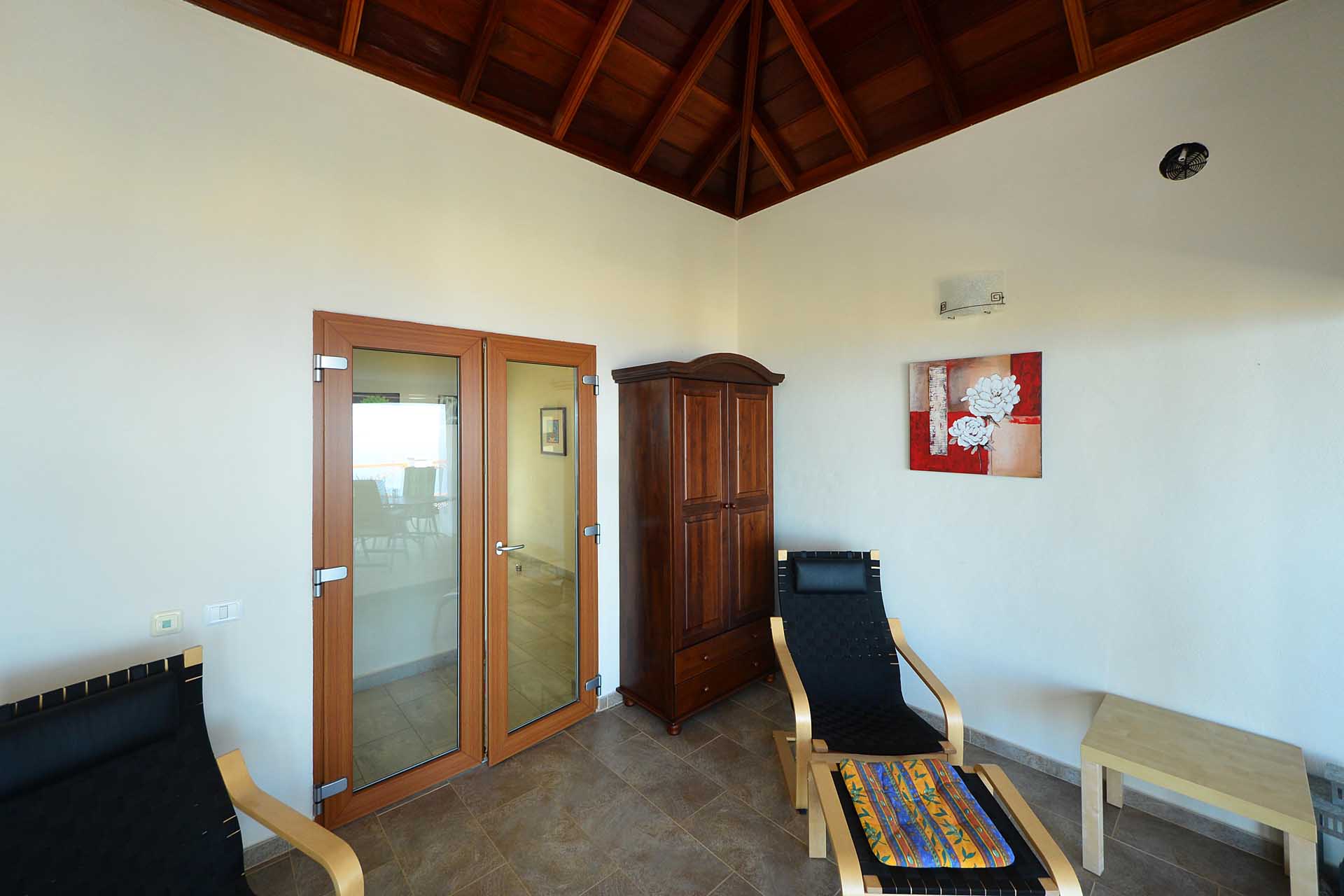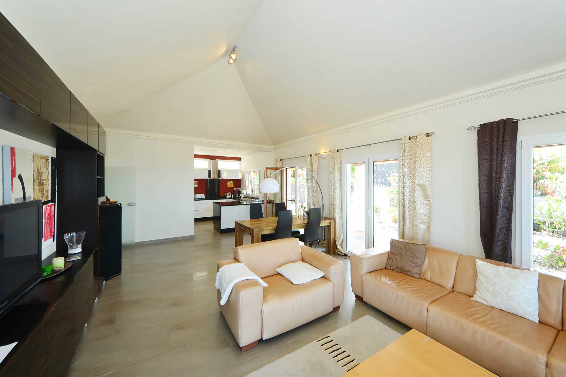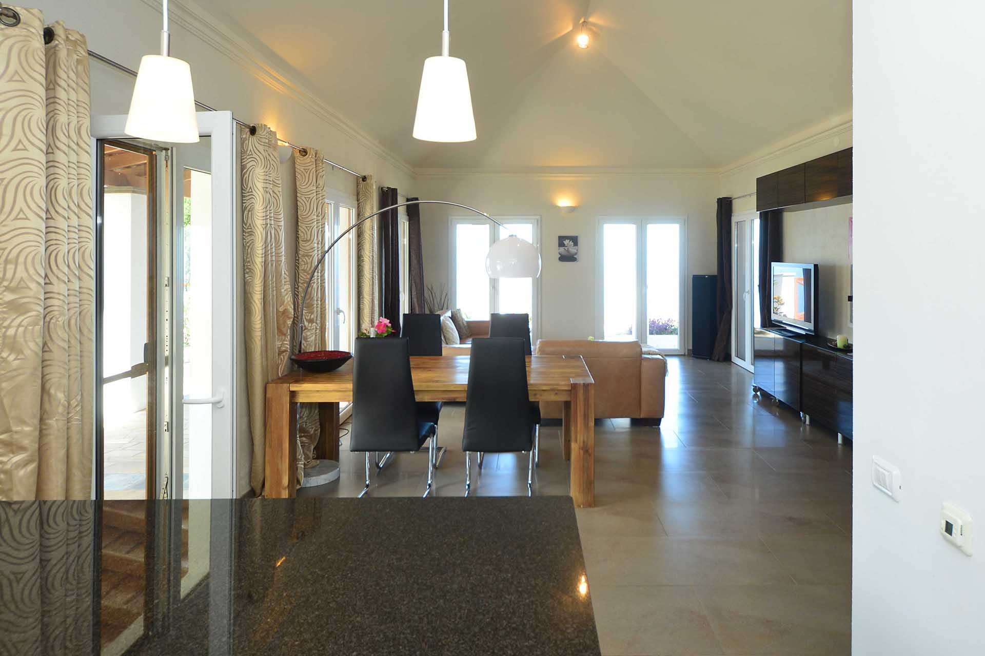 Die 2009 fertig gestellt Villa kombiniert nordeuropäische Wohnbedürfnisse nach hellen und großzügigen Räumen mit sowohl kanarischen Stilelementen als auch mediterranem Flair. Auf 190 m² Grundfläche beherbergt sie eine sehr große Wohnküche mit fantastischem Blick durch die bodengleichen, großen, aus Deutschland importierten Qualitätsfenster, einen anschließenden Hauswirtschaftsraum, zwei Schlafzimmer, ein Arbeits- oder weiteres Schlafzimmer und zwei Bäder und einen hellen Eingangsbereich mit Flur. Bis auf ein Schlafzimmer haben alle Räume herrlichen Meerblick; die bodentiefen Fenster wurden mit einem breiten, ziegelgedeckten Vordach beschattet, so dass sie angenehm temperiert bleiben und Sie von fast allen Räumen unmittelbar auf die Terrasse treten und im Schatten oder in der Sonne sitzen können.