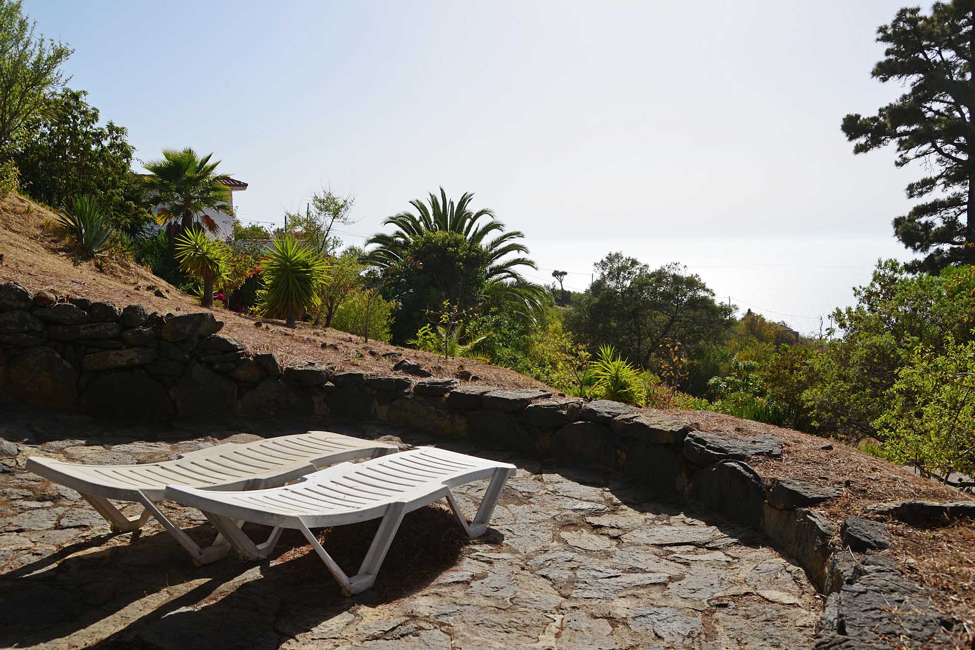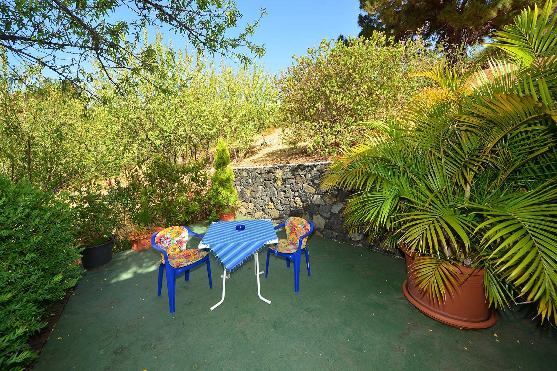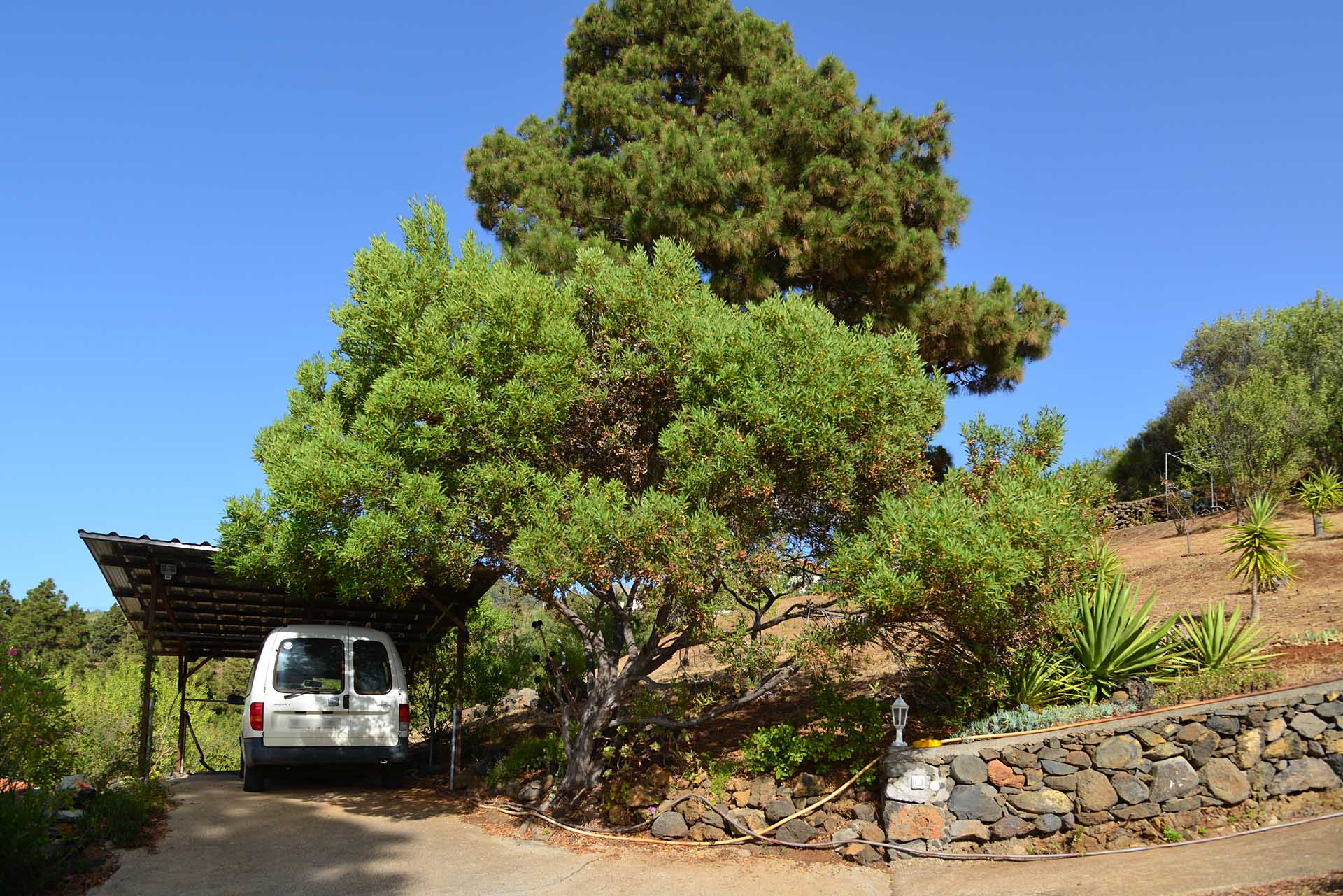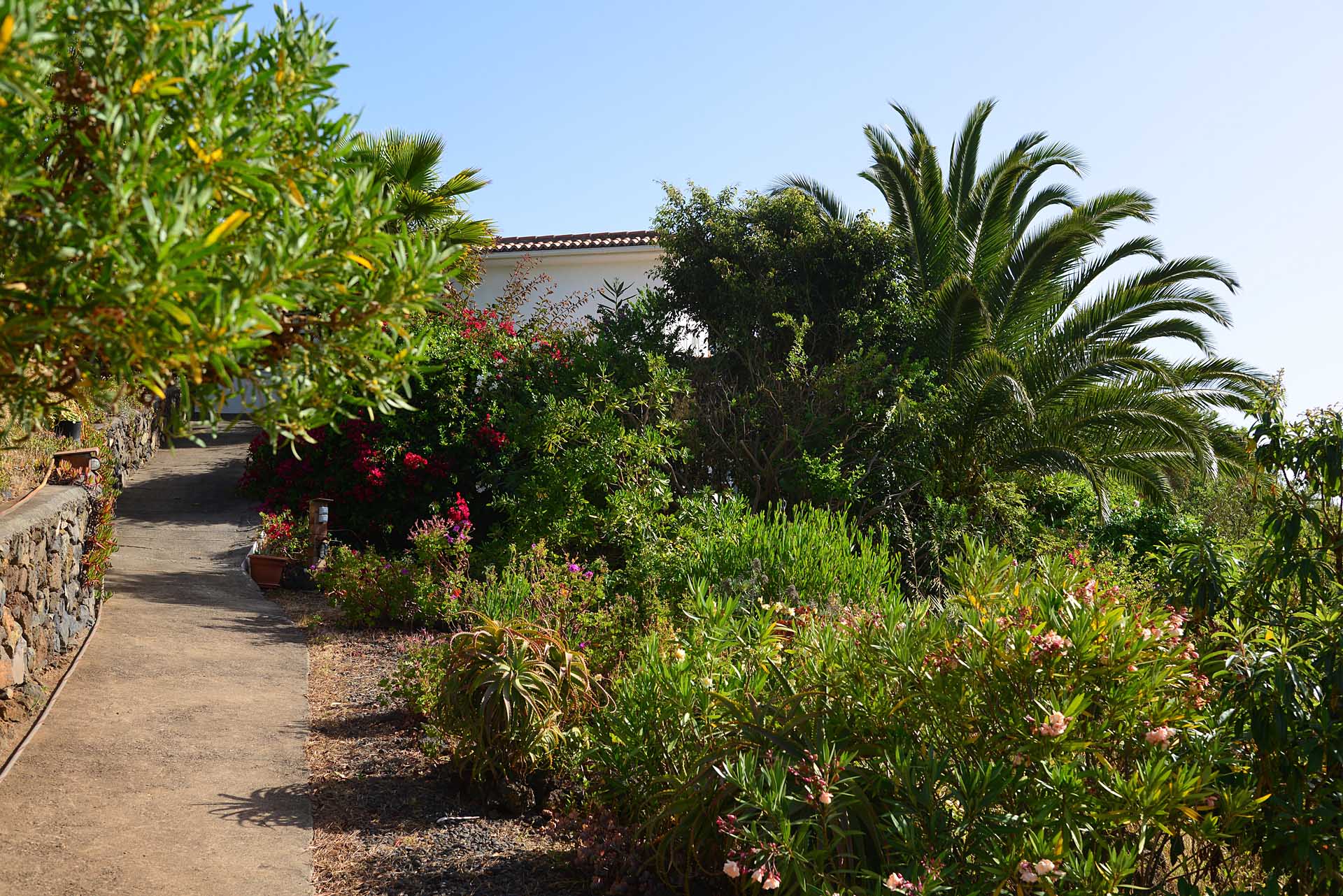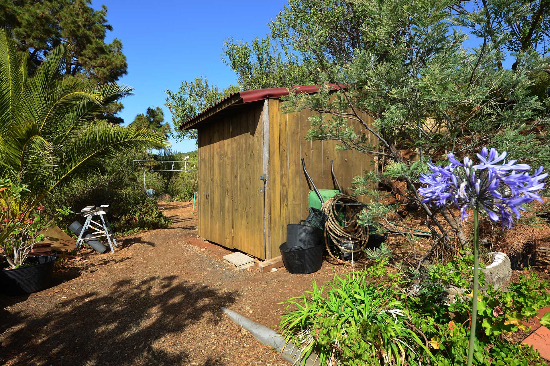 Der schön angelegte und gepflegte Garten bietet Obst und Gemüse sowie eine Vielzahl subtropischer Zierpflanzen und eine riesige kanarische Kiefer, die einen historischen Dreschplatz beschattet, der heute als Sonnenterrasse mit fantastischem Meerblick genutzt wird. Ebenso finden sich ein Gartenhäuschen für die Gartenwerkzeuge und ein Carport, so dass für alles gesorgt ist.