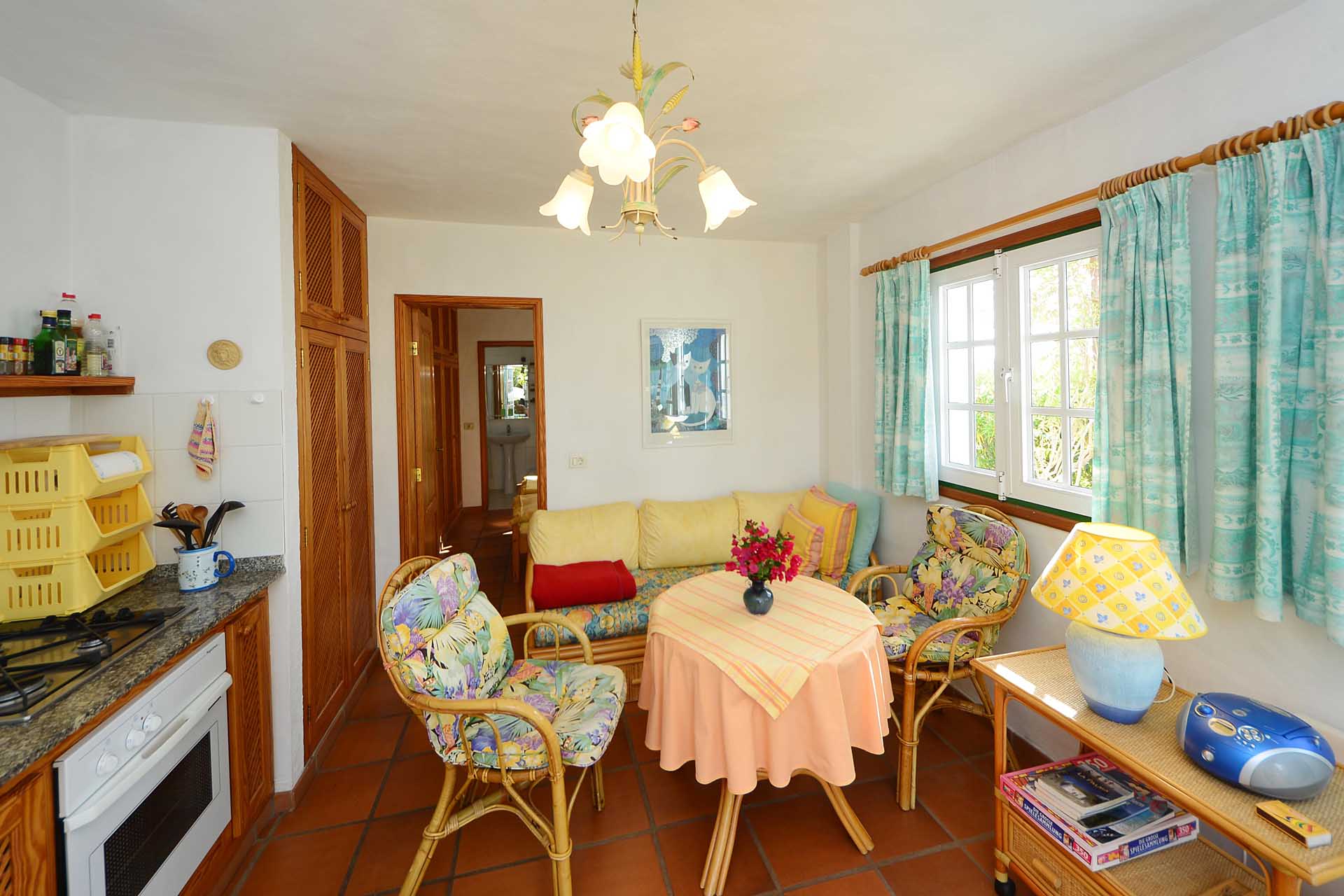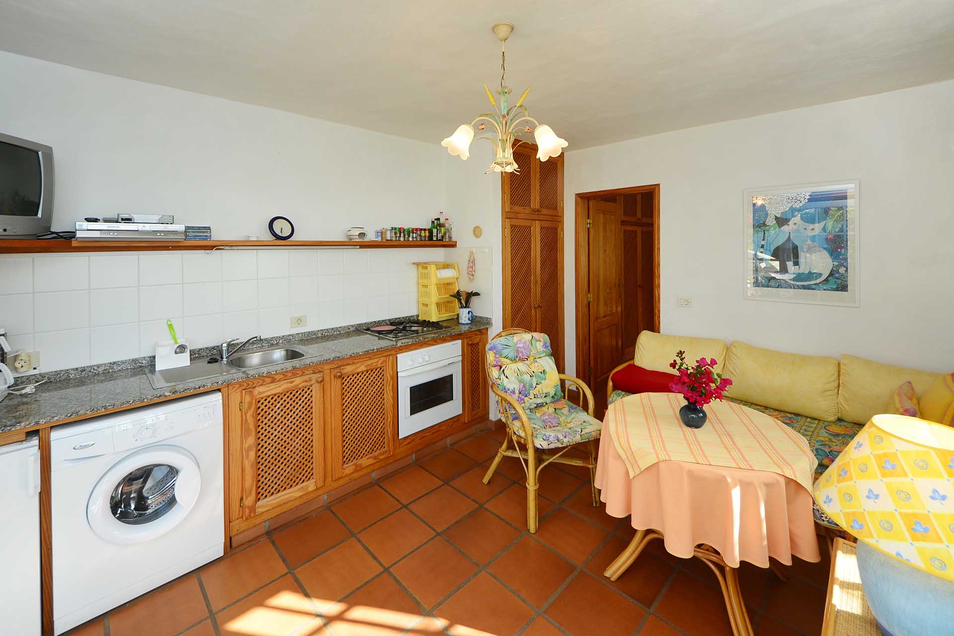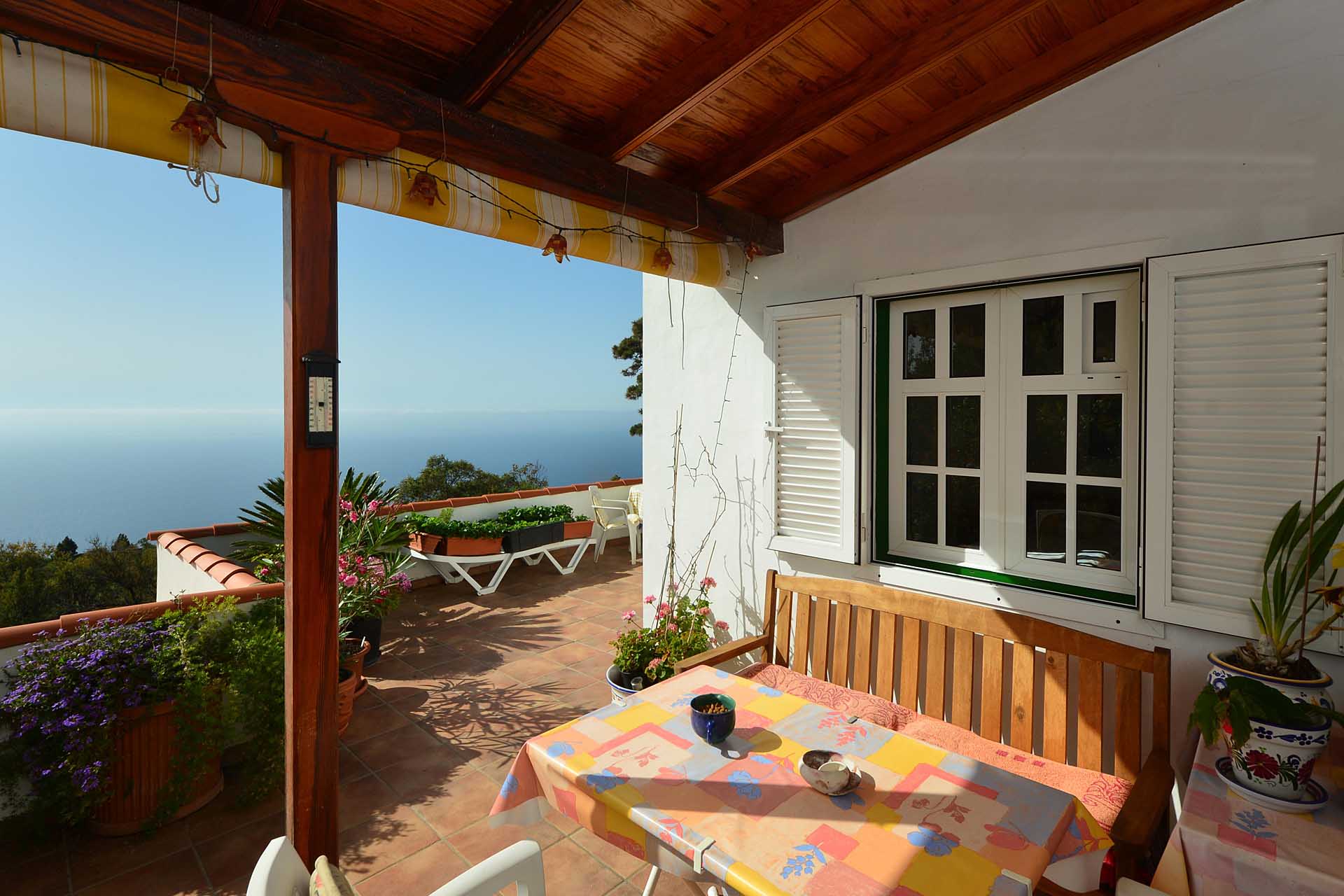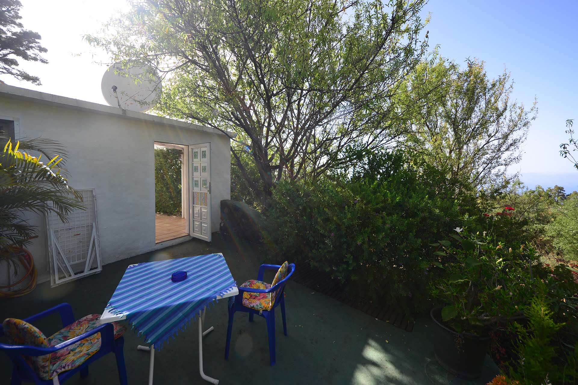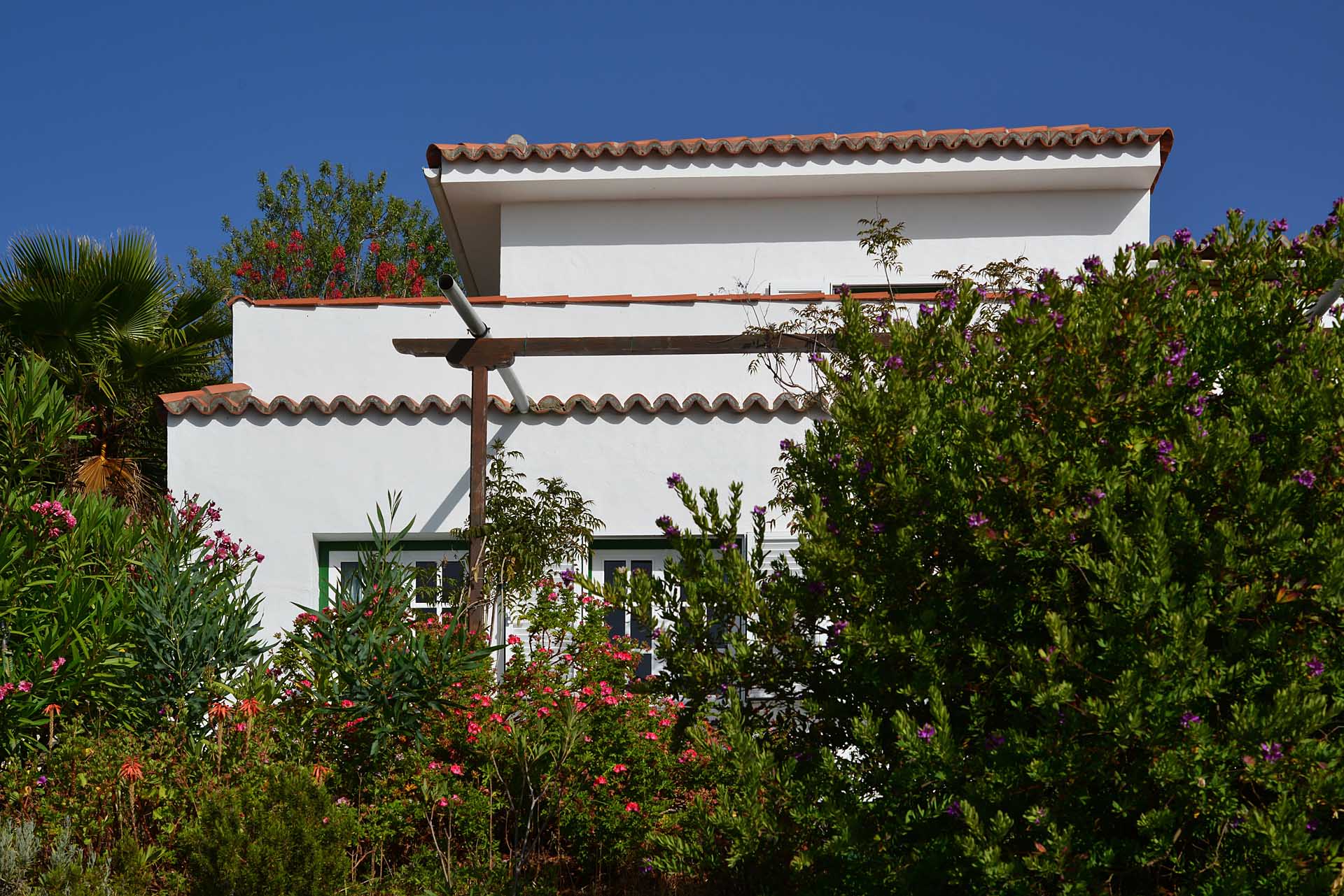 Das Haupthaus bietet mit einer großzügigen Wohnküche, zwei Schlafzimmern und einem Badezimmer auf 68 m² Grundfläche durch eine geschickte Raumaufteilung alles, was man zum Leben unter südlicher Sonne braucht. Dabei wird der Wohnraum erheblich durch eine überdachte Terrasse erweitert, die in einen Balkon mit fantastischem Blick übergeht und der gleichzeitig das Dach des, wie hier allgemein üblich, vor- und untergesetzten Gästehauses bildet. Die nach Süden, Westen und Norden weisenden Terrassen bieten für jedes Sonnen- oder Schattenbedürfnis ausreichend Platz, eine weitere, nach Osten ausgerichtete Terrasse wurde lichtdämpfend für die Anzucht subtropischer Pflanzenvielfalt überdacht.