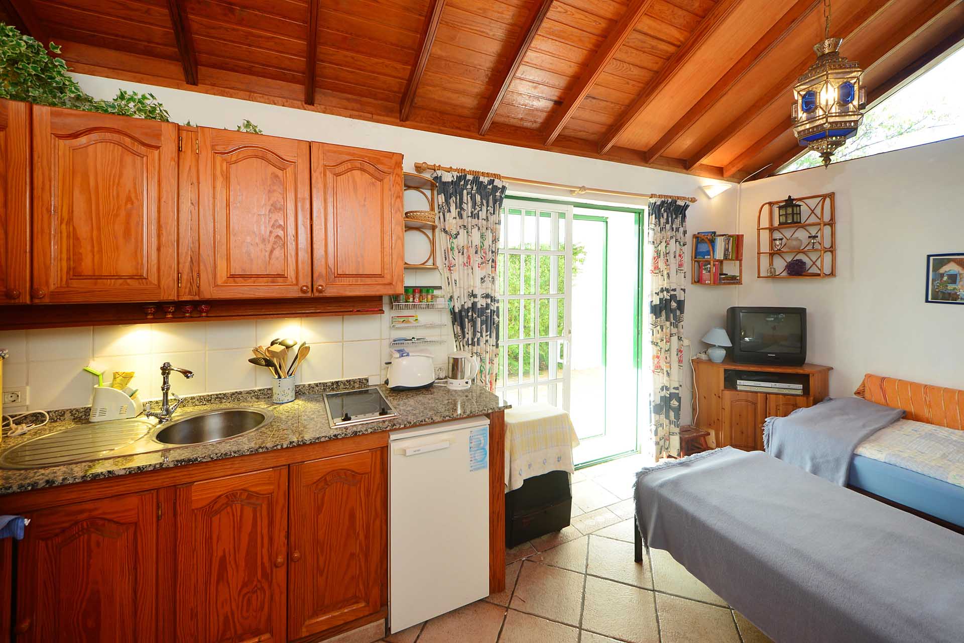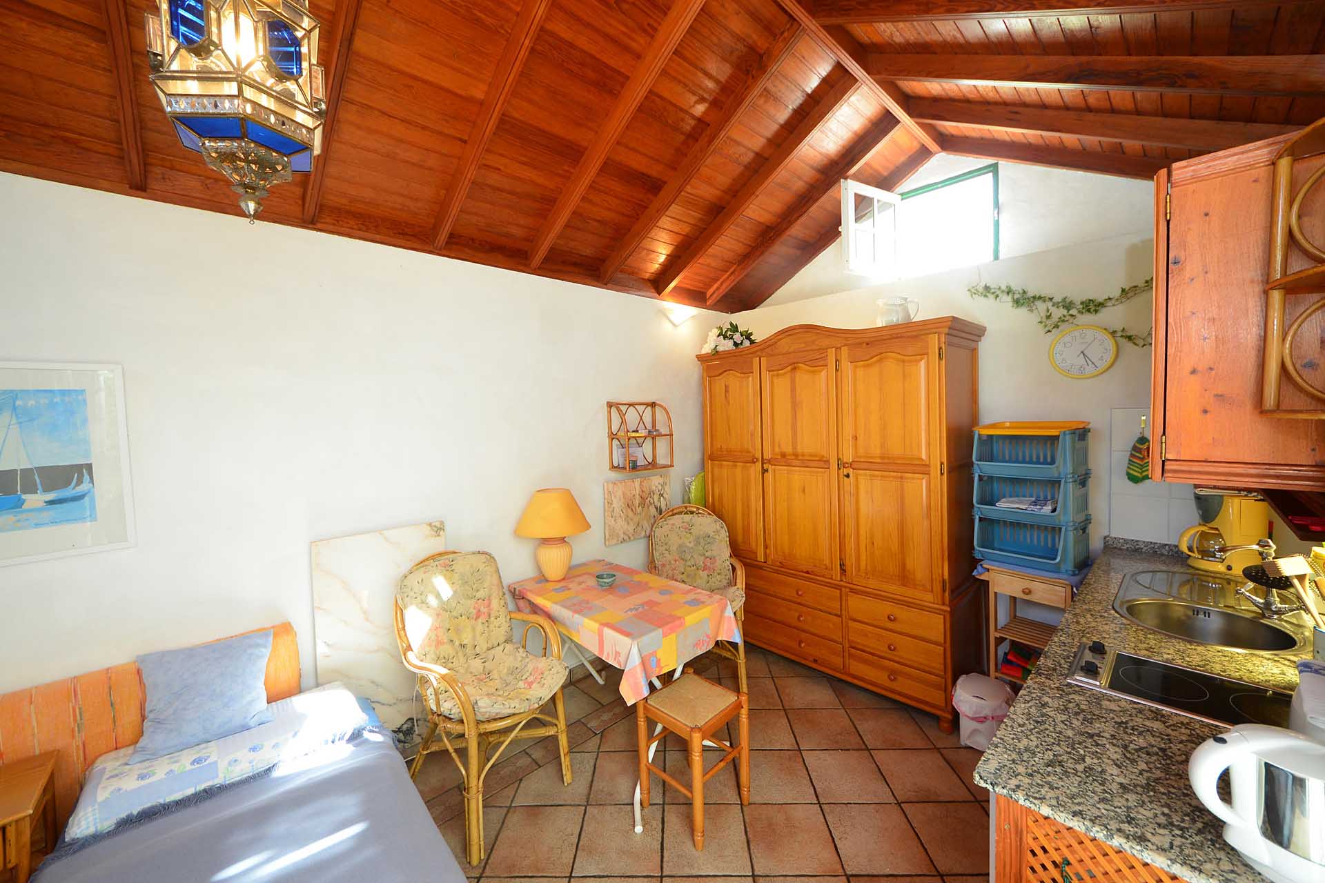 Etwas abseits liegt in rund 35 m Entfernung ein weiteres Gästehaus, das mit einem Wohn-, Koch- und Schlafbereich, sowie einem Bad ein Studio bildet, das mit einer überdachten Terrasse, zwei offenen Terrassen nach Westen und Norden und einem herrlichen Meerblick einen abgeschlossenen Privatbereich für weitere Gäste bildet.