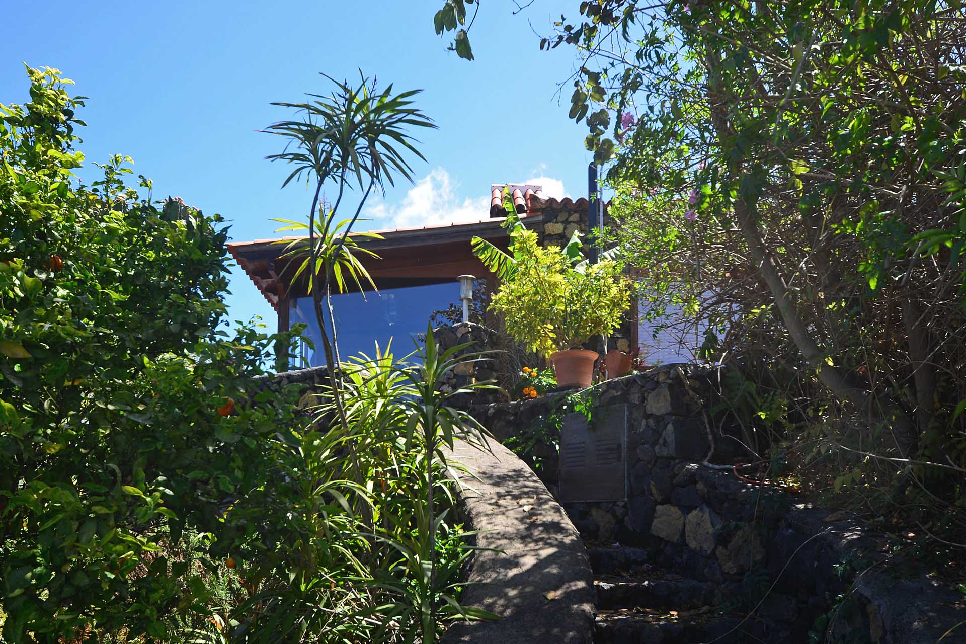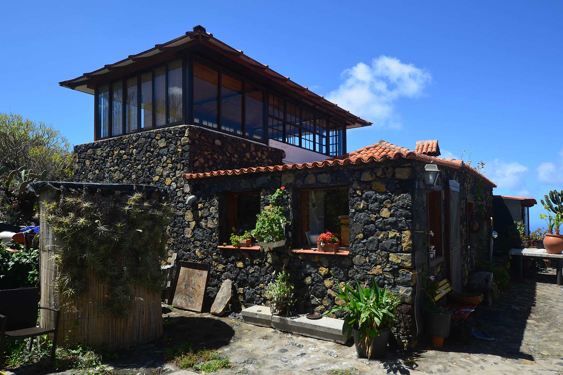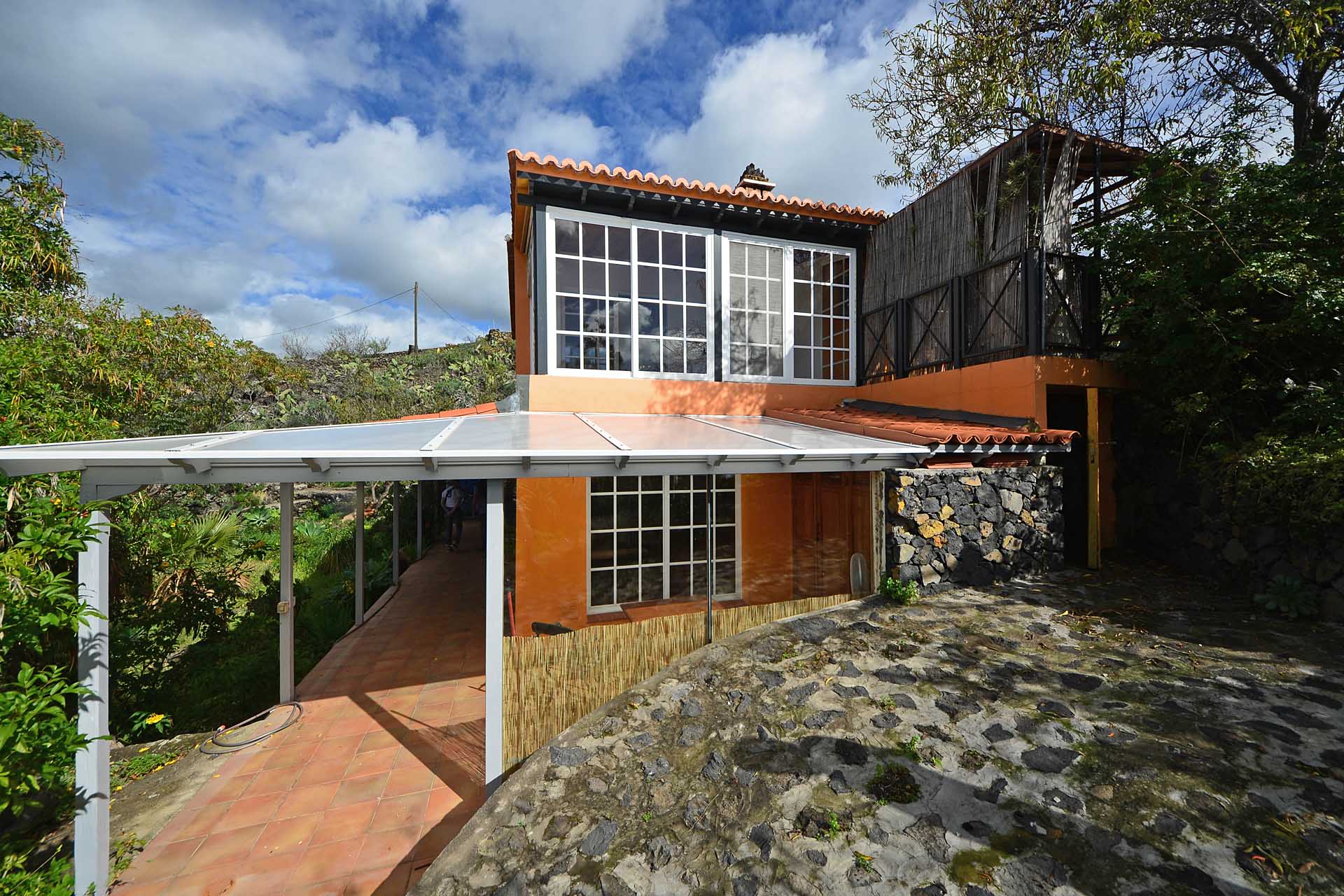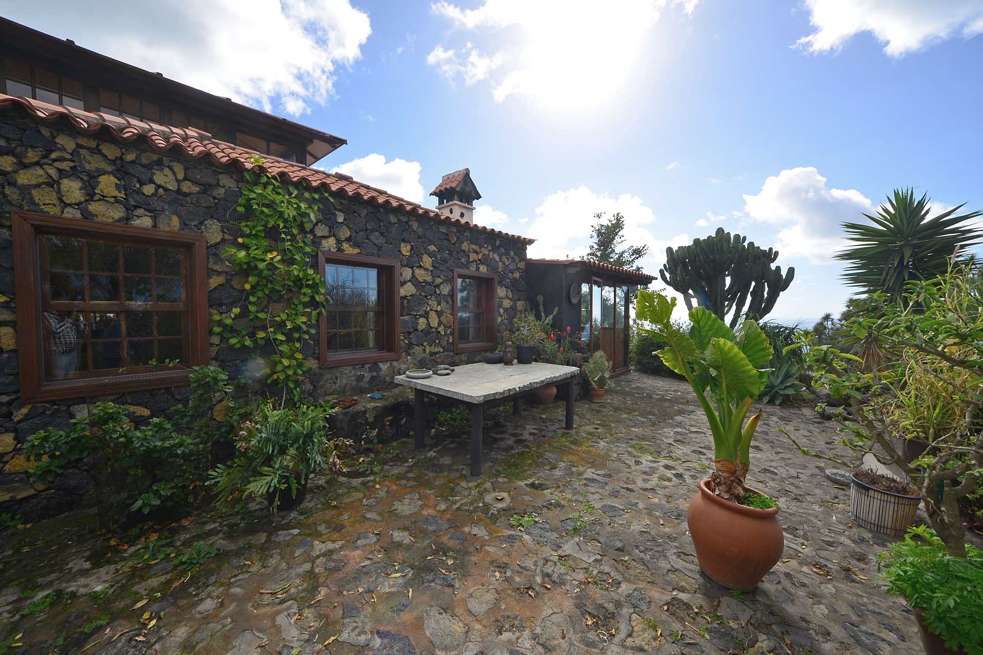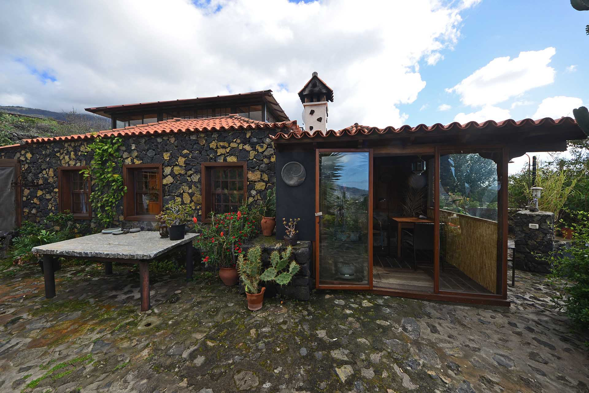 Das Haupthaus wurde in klassischer Bauweise sehr aufwändig aus handbehauenem Blaubasalt gebaut, mit den typischen, kanarischen Sichtholz-Dachstühlen versehen und als Besonderheit mit einem großen Panorama-Wintergarten im Obergeschoss ergänzt. Es beherbergt im Erdgeschoss eine Küche, ein Esszimmer, das in das Wohnzimmer übergeht, zwei Schlafzimmer, ein Tageslichtbadezimmer mit Dusche und ein Arbeits- oder Lesezimmer. Es verfügt über eine eigene Zufahrt und einen separaten Parkplatz für 2 PKW. Ein kleiner Pool steht für besonders warme Sommertage zur Abkühlung Verfügung.