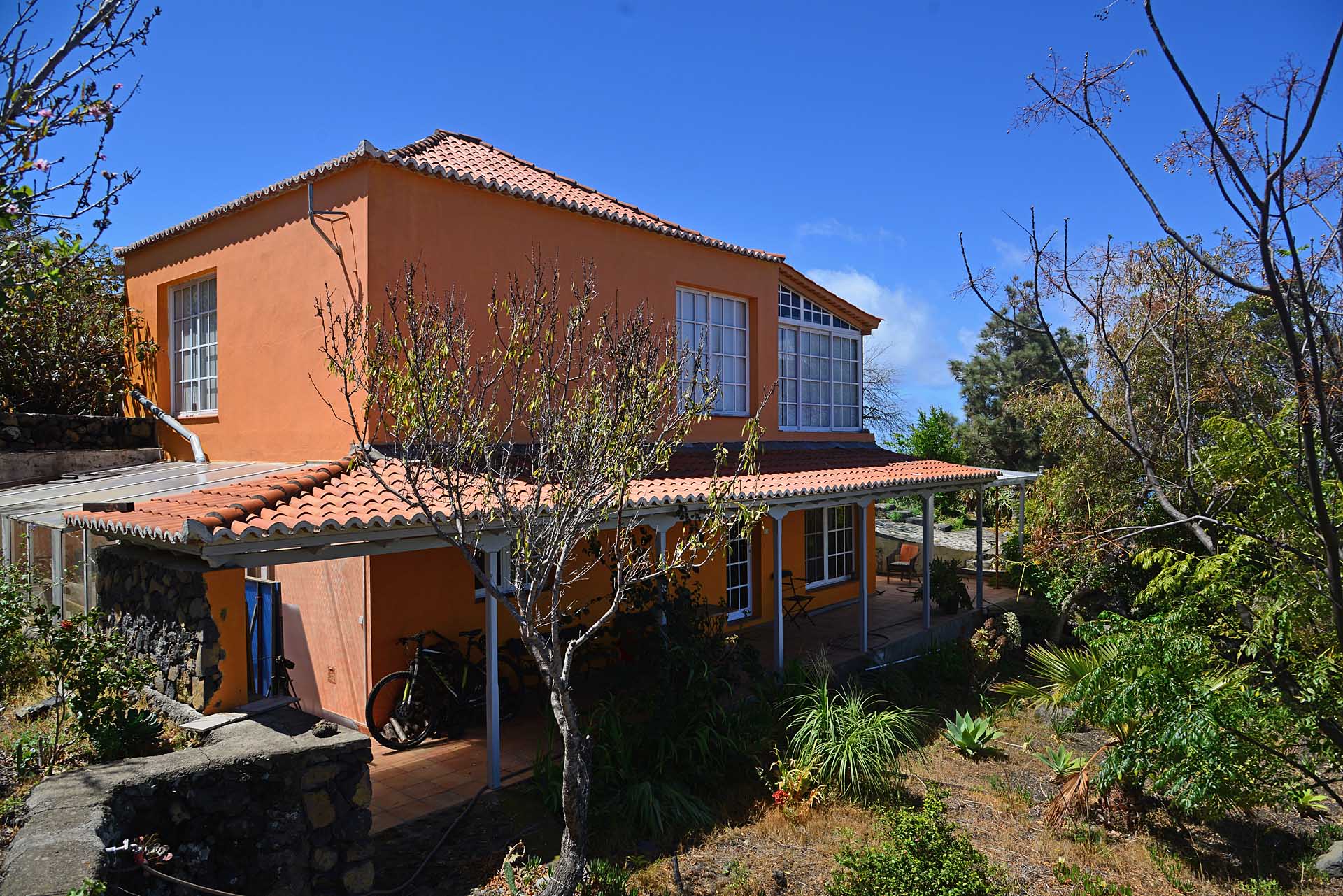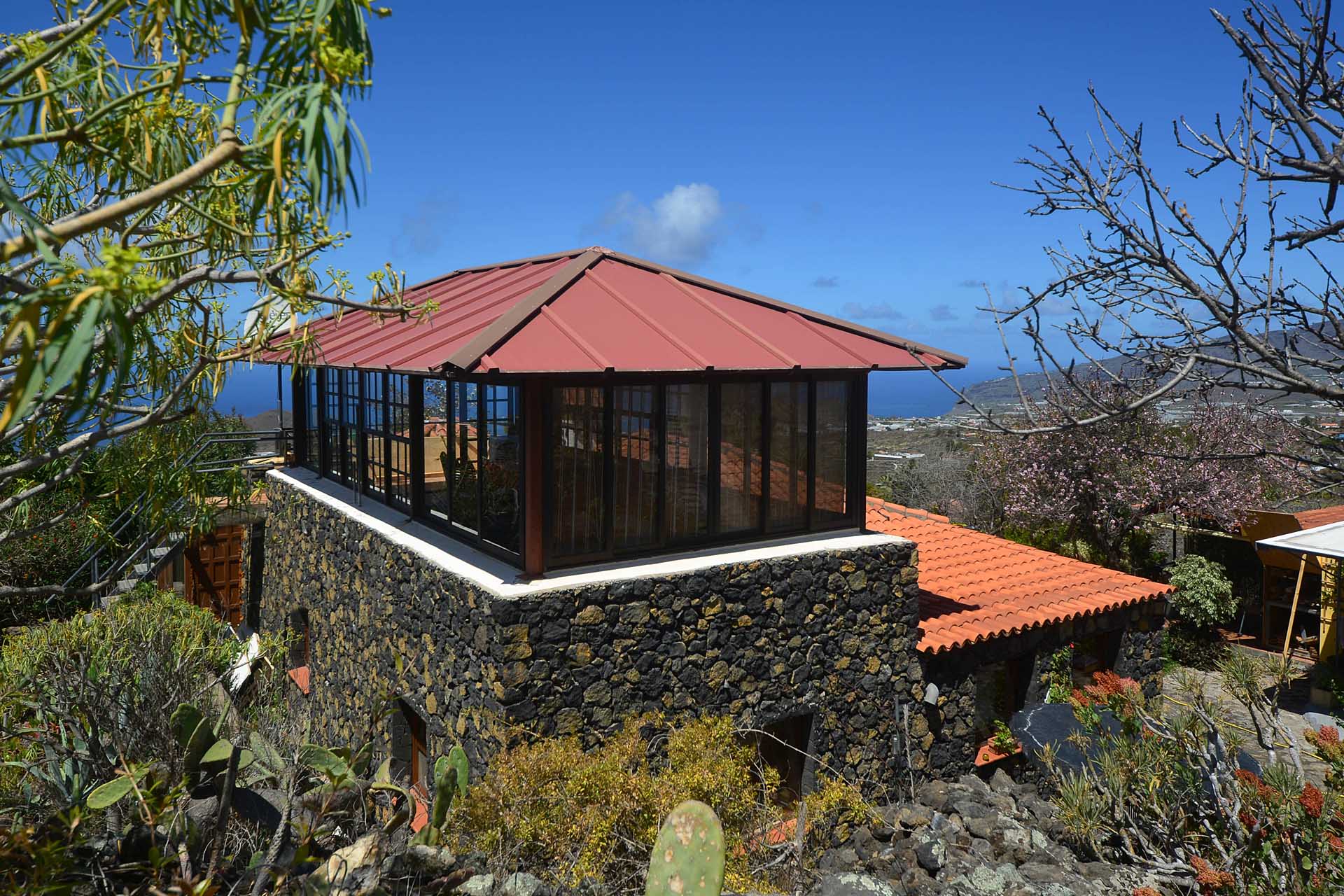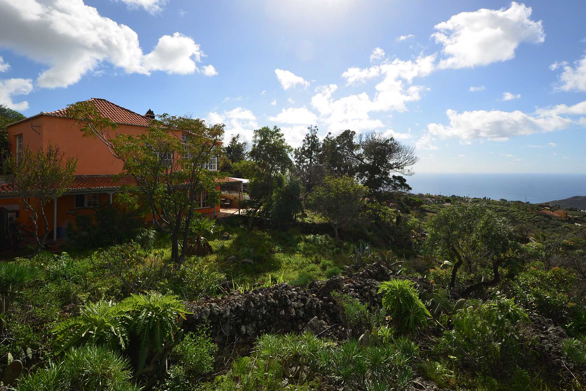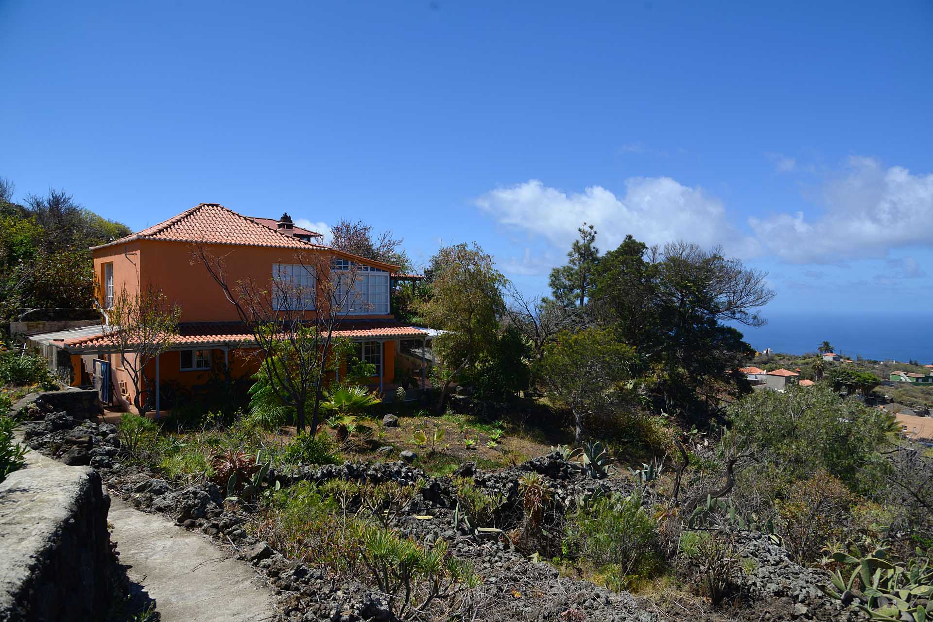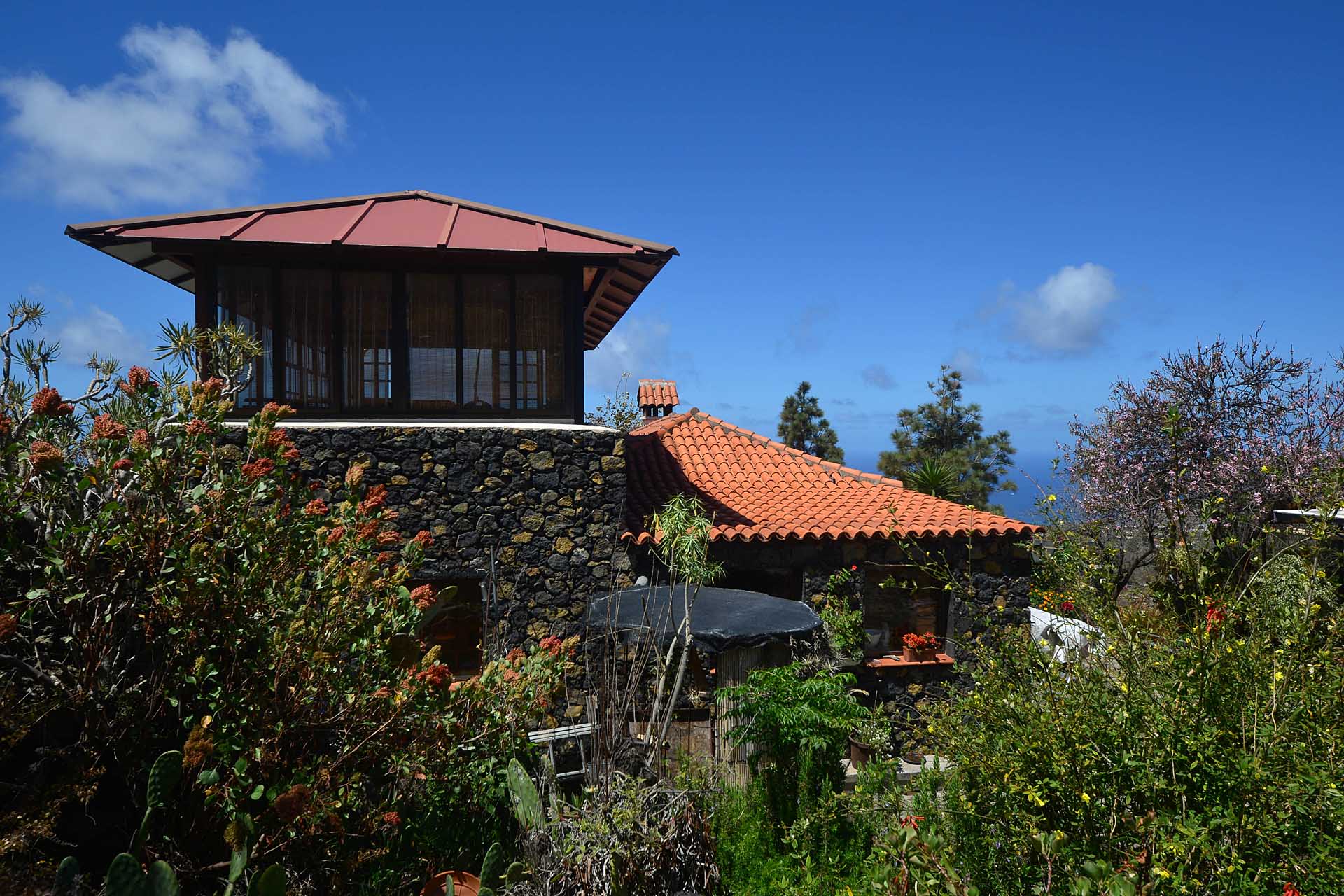 Das Haupthaus wurde in klassischer Bauweise sehr aufwändig aus handbehauenem Blaubasalt gebaut, mit den typischen, kanarischen Sichtholz-Dachstühlen versehen und als Besonderheit mit einem großen Panorama-Wintergarten im Obergeschoss ergänzt. Es beherbergt im Erdgeschoss eine Küche, ein Esszimmer, das in das Wohnzimmer übergeht, zwei Schlafzimmer, ein Tageslichtbadezimmer mit Dusche und ein Arbeits- oder Lesezimmer. Es verfügt über eine eigene Zufahrt und einen separaten Parkplatz für 2 PKW. Ein kleiner Pool steht für besonders warme Sommertage zur Abkühlung Verfügung.
