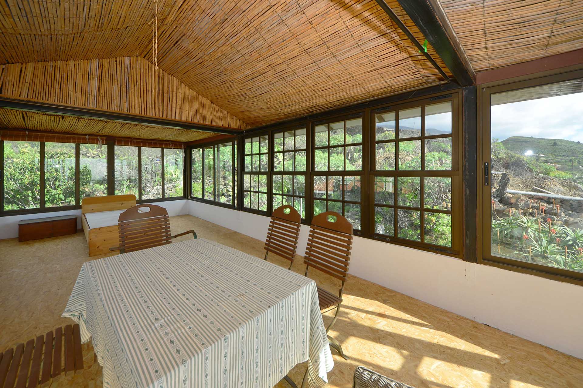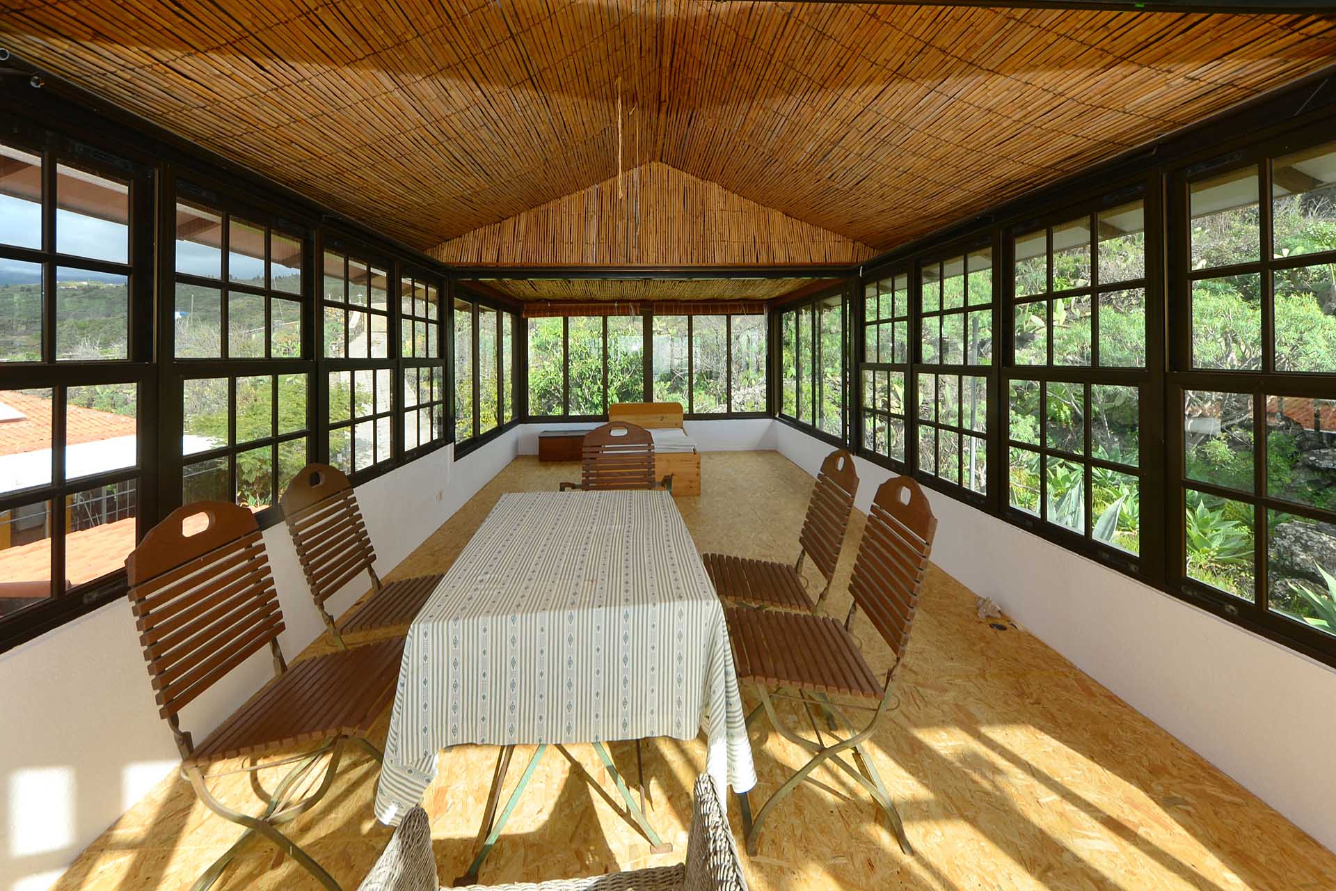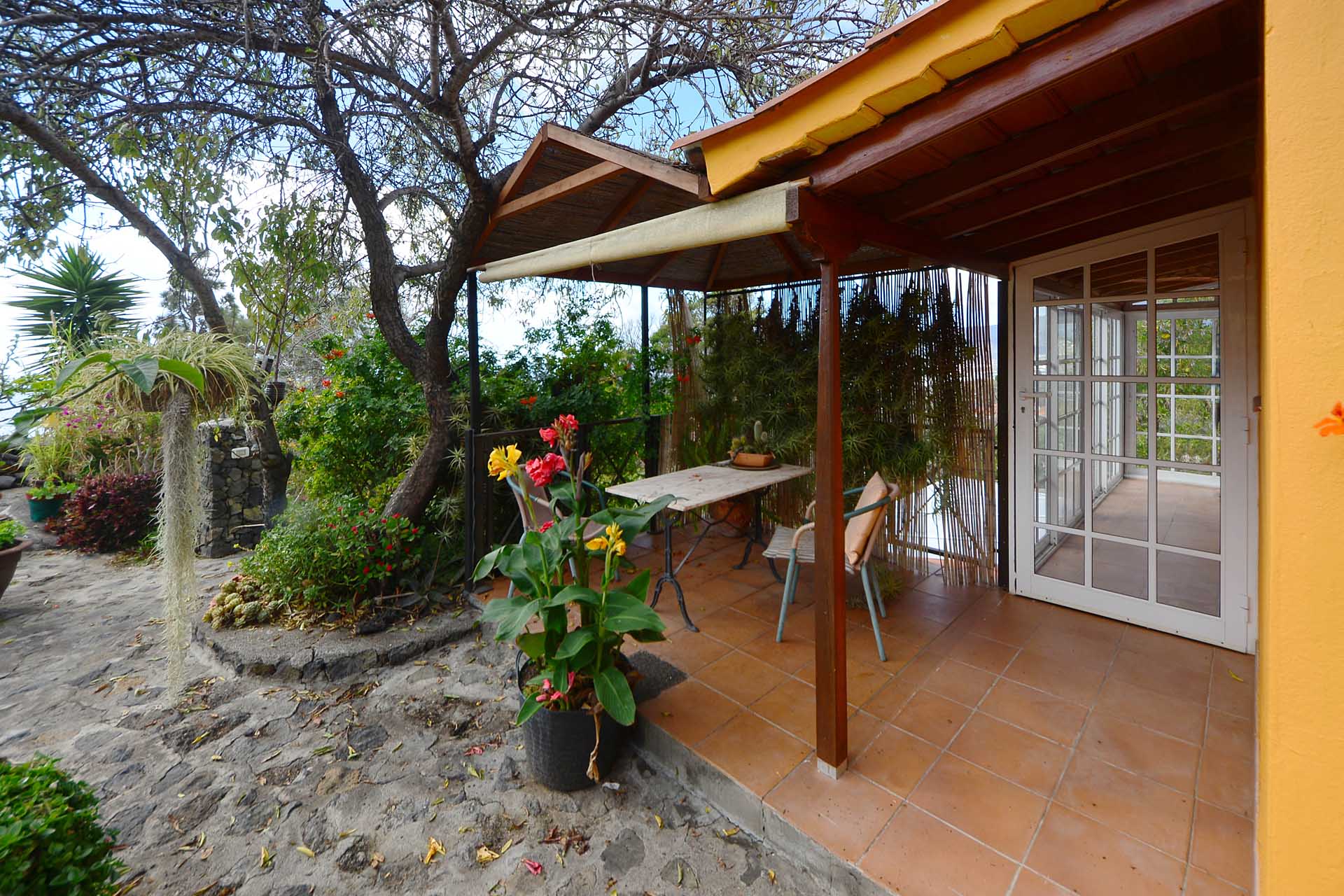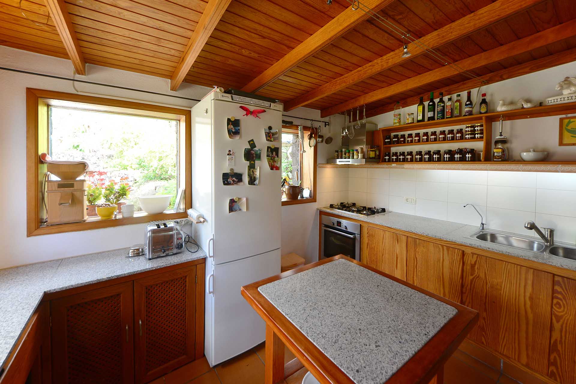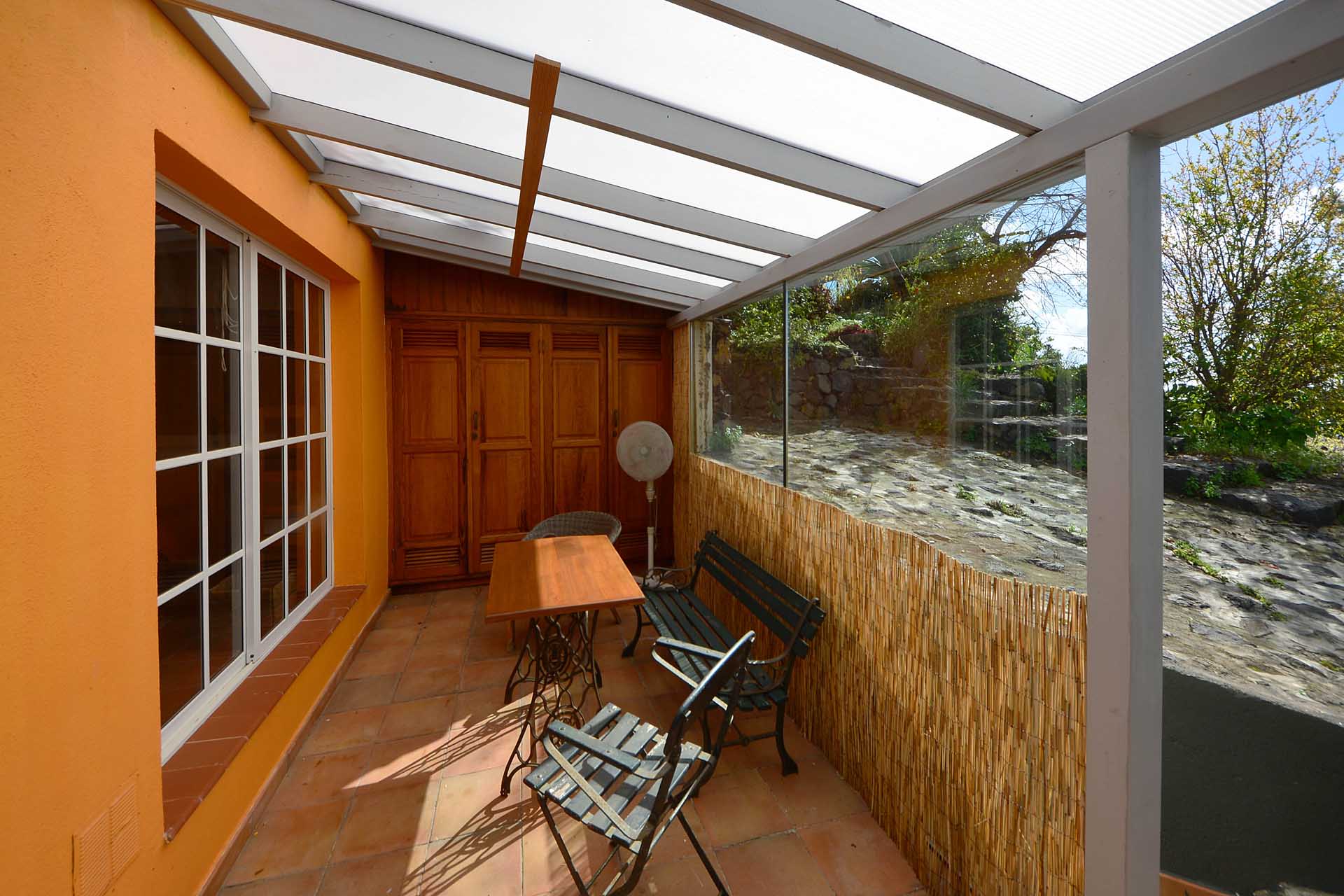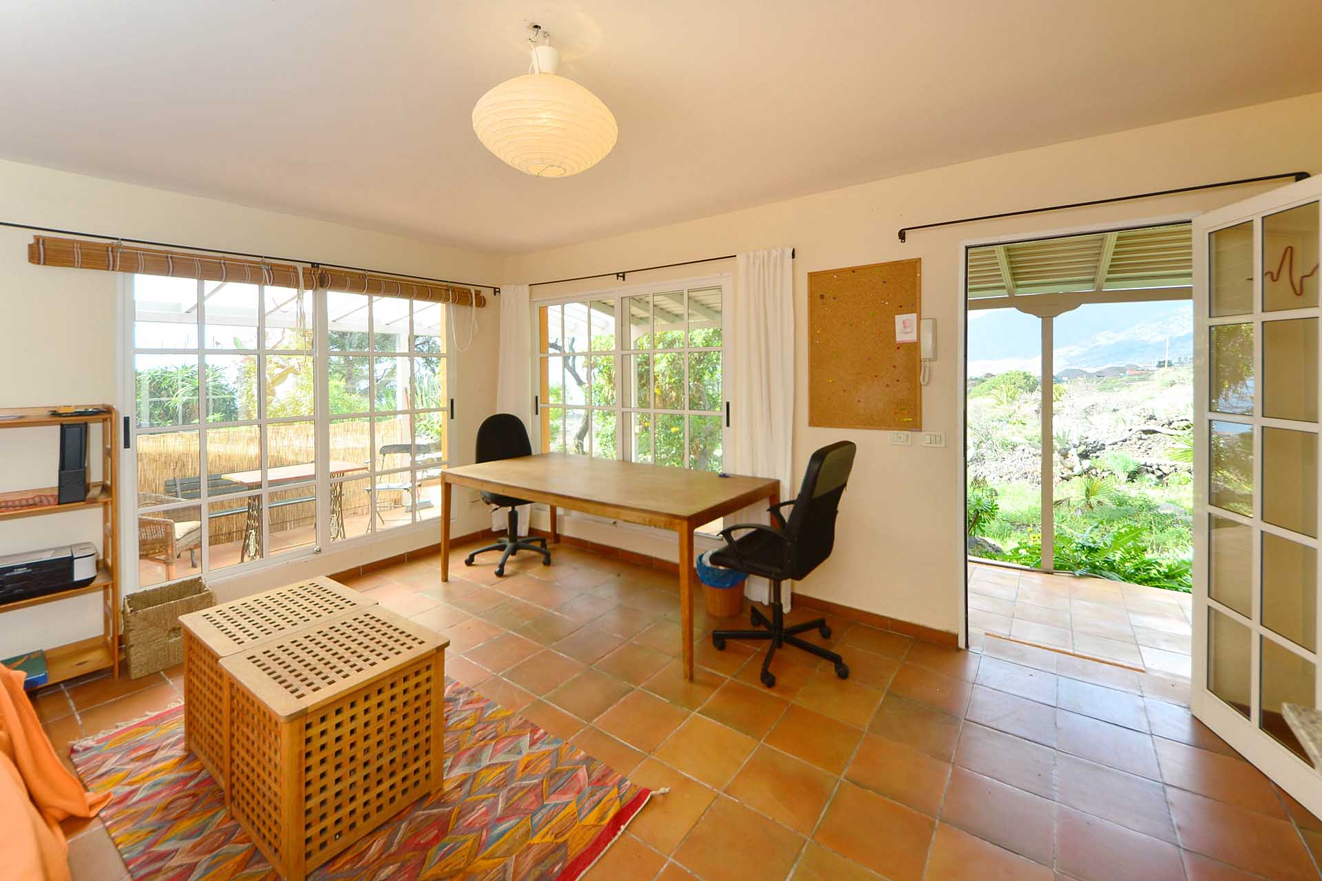 Das Haupthaus wurde in klassischer Bauweise sehr aufwändig aus handbehauenem Blaubasalt gebaut, mit den typischen, kanarischen Sichtholz-Dachstühlen versehen und als Besonderheit mit einem großen Panorama-Wintergarten im Obergeschoss ergänzt. Es beherbergt im Erdgeschoss eine Küche, ein Esszimmer, das in das Wohnzimmer übergeht, zwei Schlafzimmer, ein Tageslichtbadezimmer mit Dusche und ein Arbeits- oder Lesezimmer. Es verfügt über eine eigene Zufahrt und einen separaten Parkplatz für 2 PKW. Ein kleiner Pool steht für besonders warme Sommertage zur Abkühlung Verfügung.