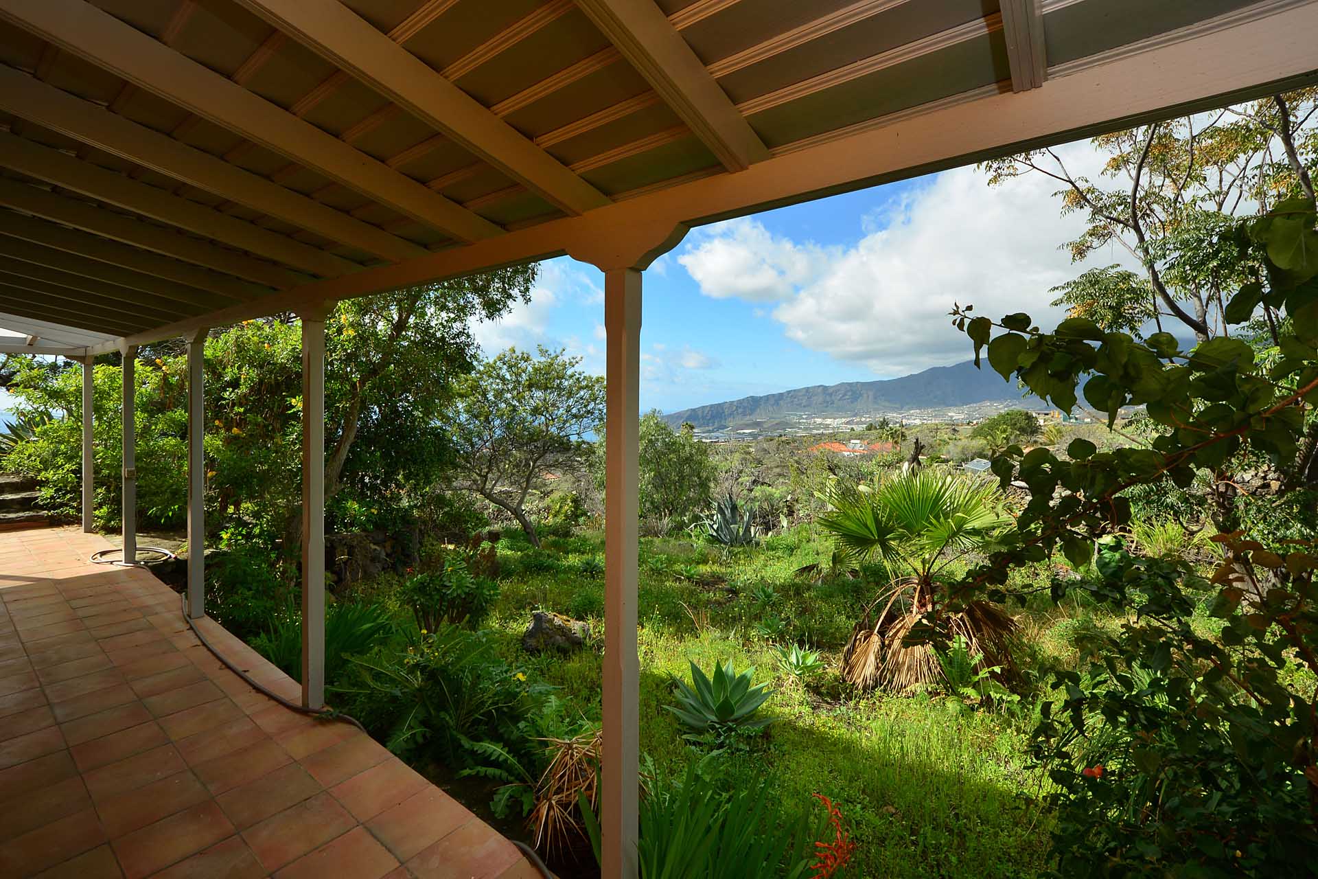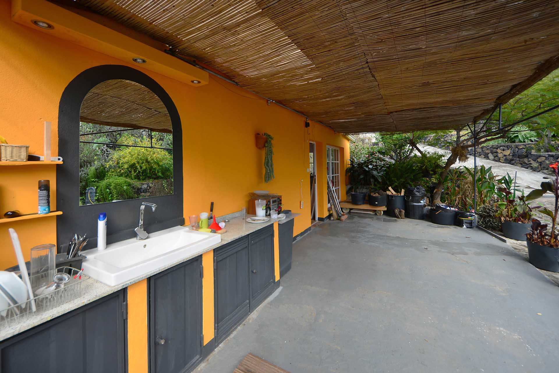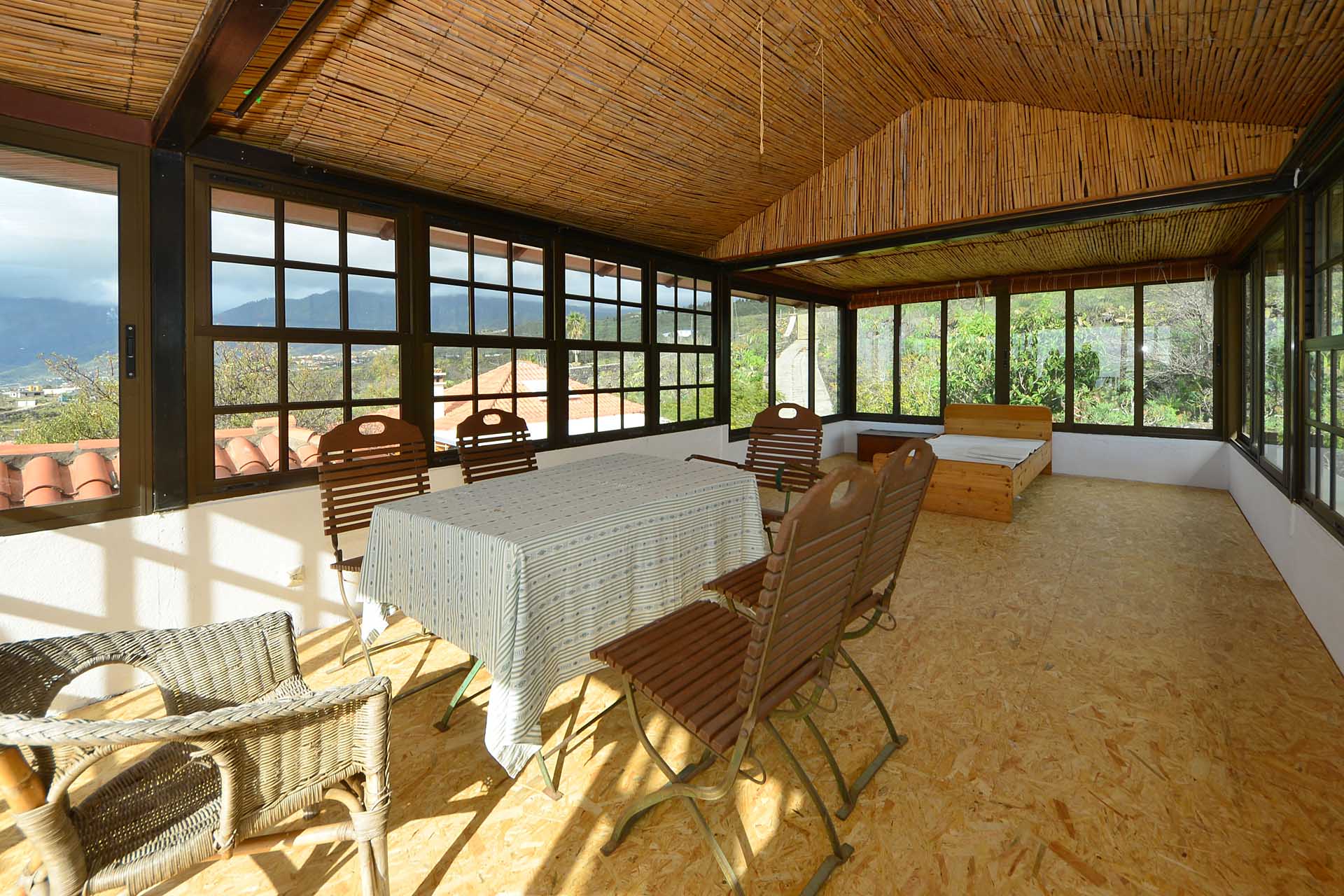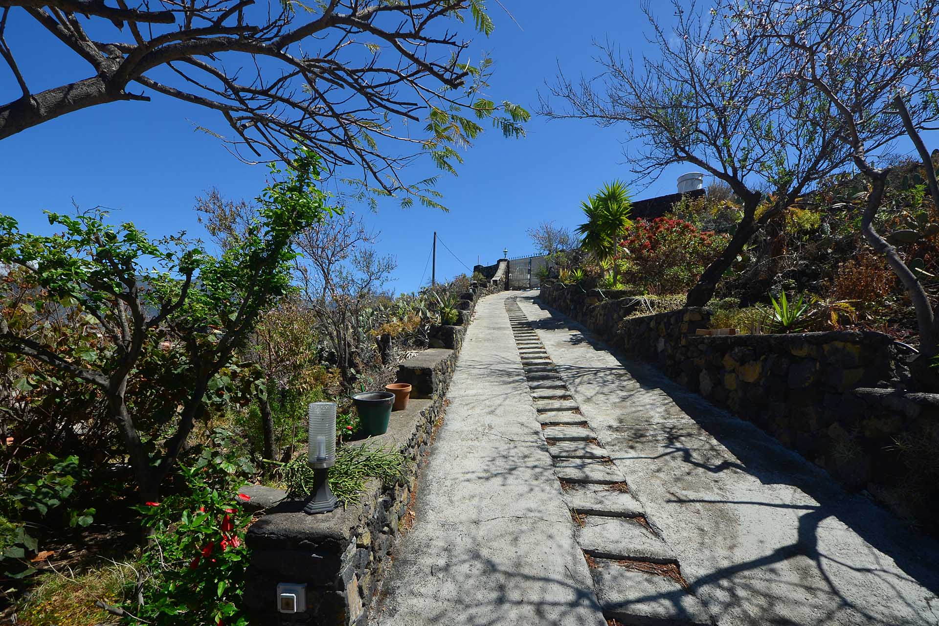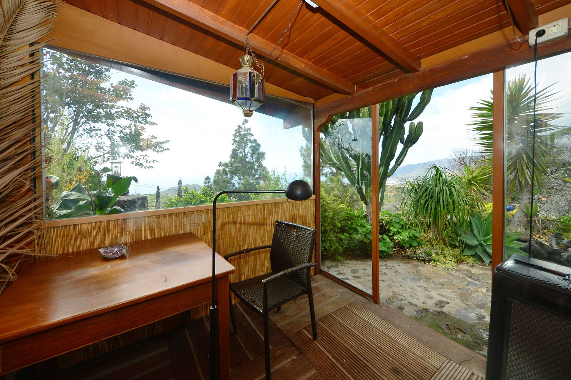 Das Haupthaus wurde in klassischer Bauweise sehr aufwändig aus handbehauenem Blaubasalt gebaut, mit den typischen, kanarischen Sichtholz-Dachstühlen versehen und als Besonderheit mit einem großen Panorama-Wintergarten im Obergeschoss ergänzt. Es beherbergt im Erdgeschoss eine Küche, ein Esszimmer, das in das Wohnzimmer übergeht, zwei Schlafzimmer, ein Tageslichtbadezimmer mit Dusche und ein Arbeits- oder Lesezimmer. Es verfügt über eine eigene Zufahrt und einen separaten Parkplatz für 2 PKW. Ein kleiner Pool steht für besonders warme Sommertage zur Abkühlung Verfügung.