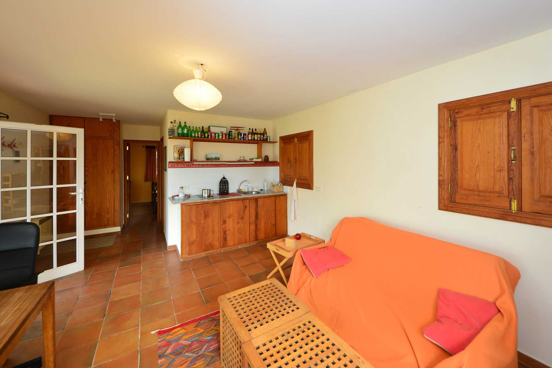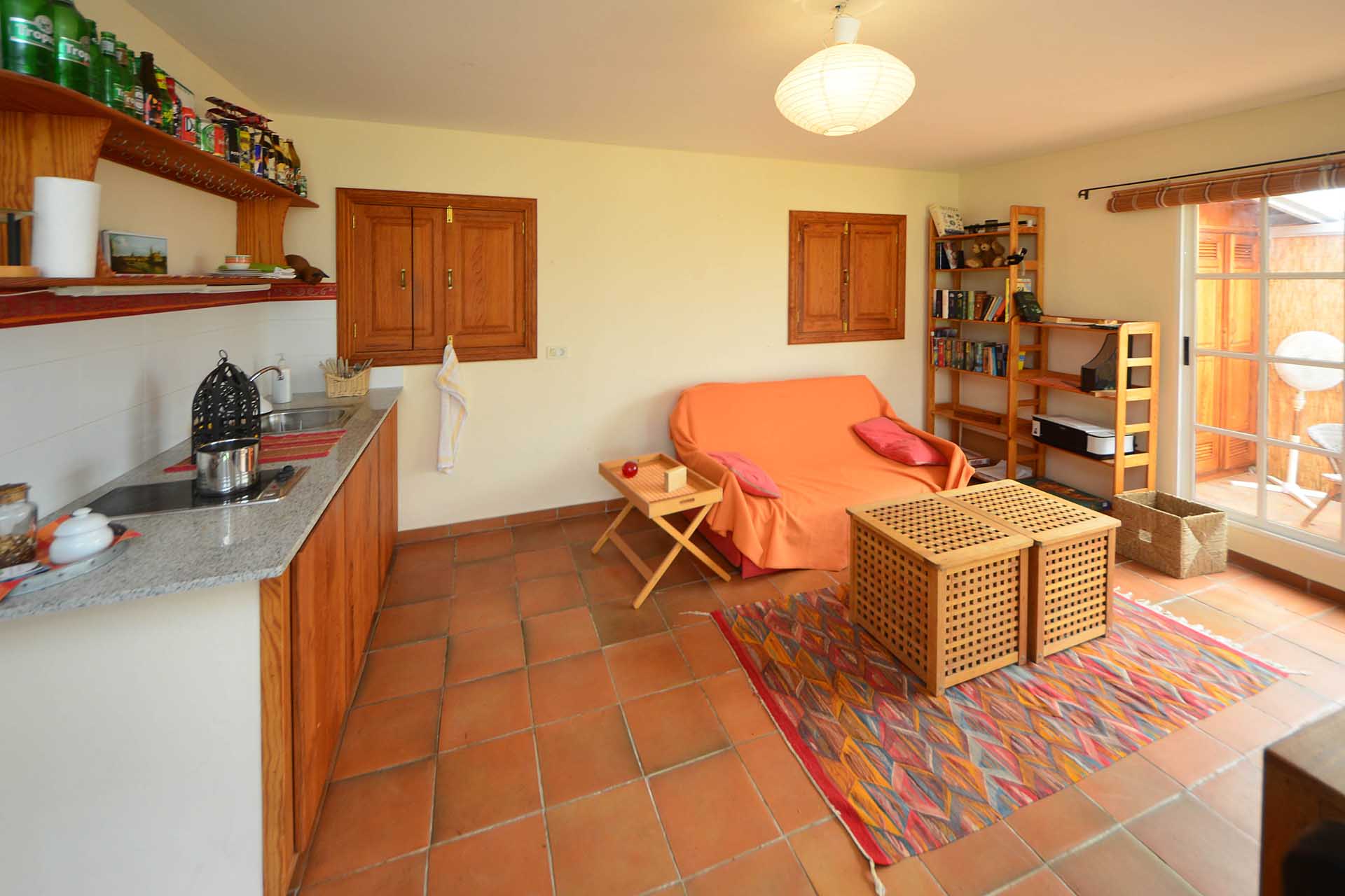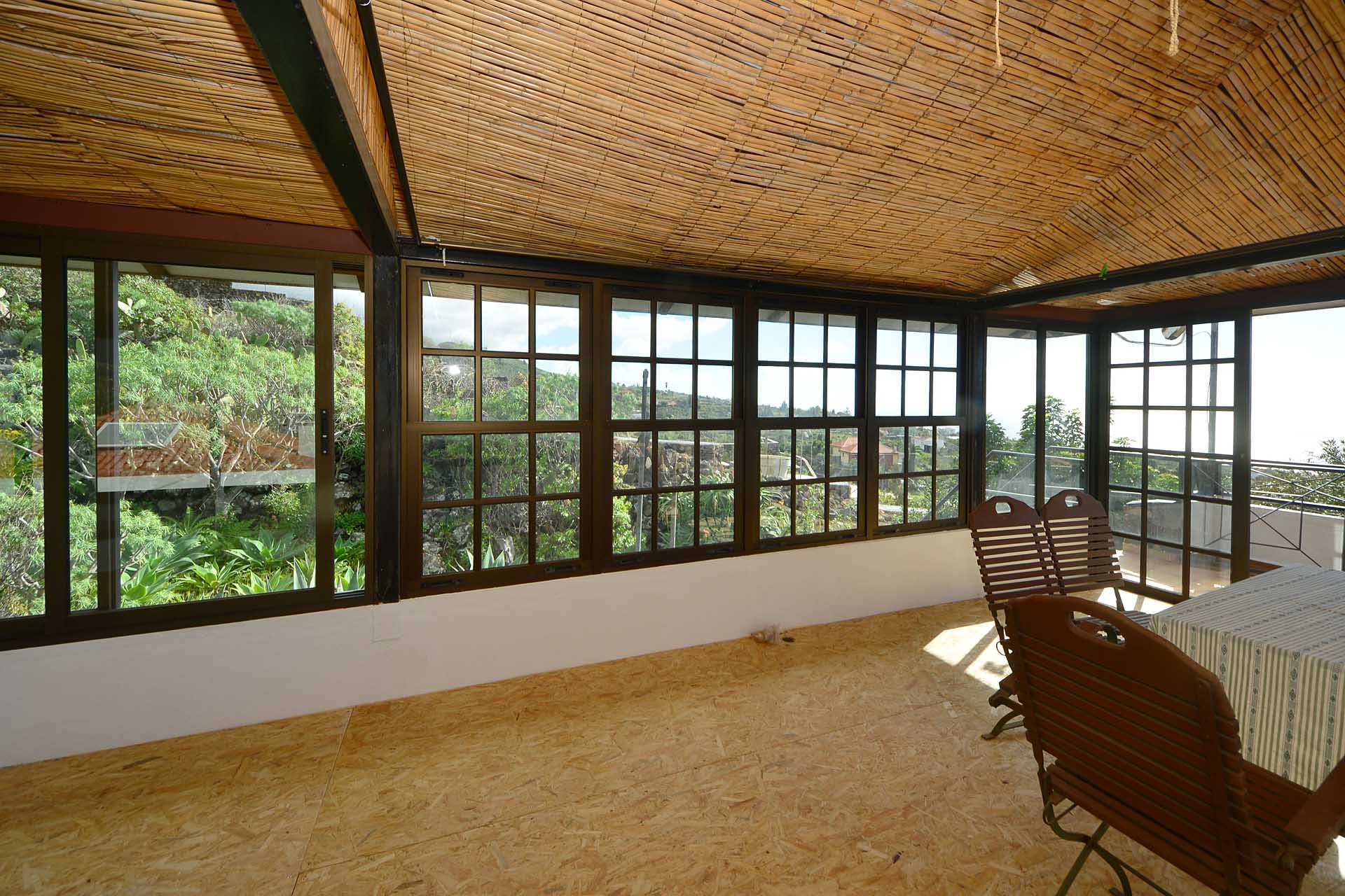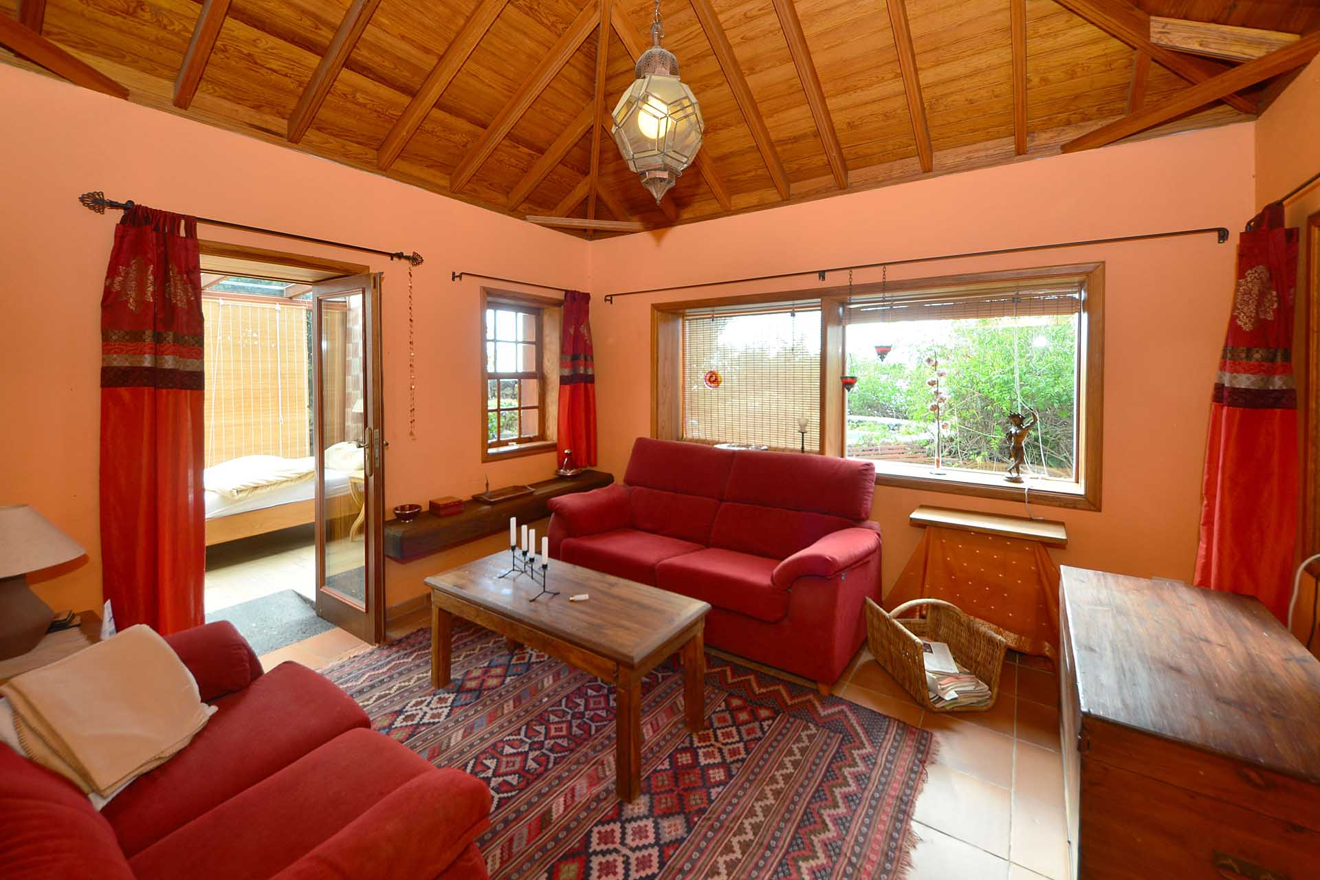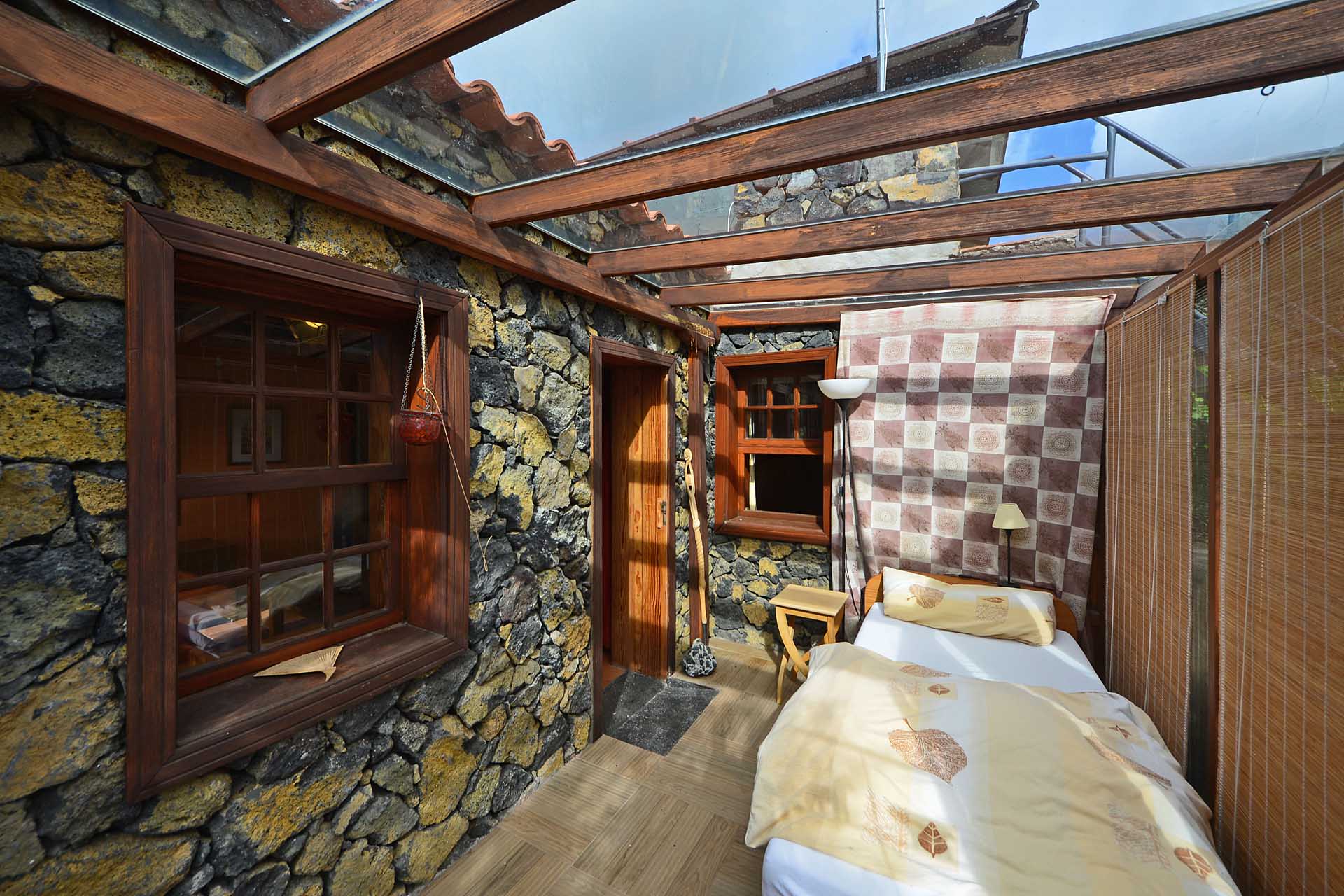Das Gästehaus kann ebenfalls über zwei separate Parkplätze und separate Wege erreicht werden, so dass die in den beiden Stockwerken untergebrachten Gästeapartments separat erreicht werden können und den Gästen größtmögliche Privatsphäre geboten wird. Das Apartment im Obergeschoss besteht aus einem Studio und einem Kaminzimmer mit bodentiefen Panoramafenstern – ein Ausblick, der selbst auf La Palma seines gleichen sucht sowie einem Duschbad. Zum Obergeschoss gehört ein überdachter Frühstücksplatz, der bereits von den ersten Sonnenstrahlen erfasst wird, sowie eine weitere, große und überdachte Terrasse mit einer Außenküche.