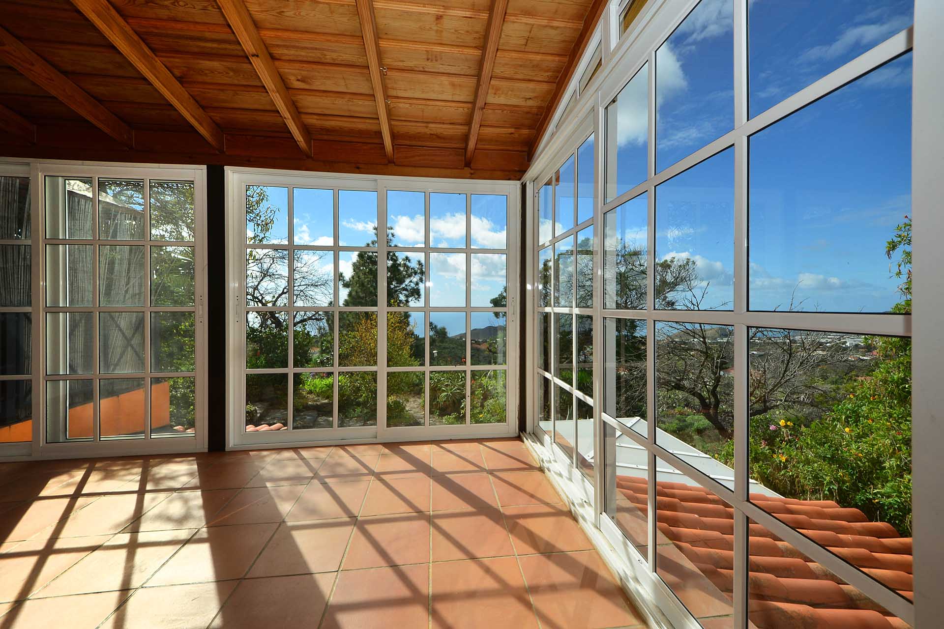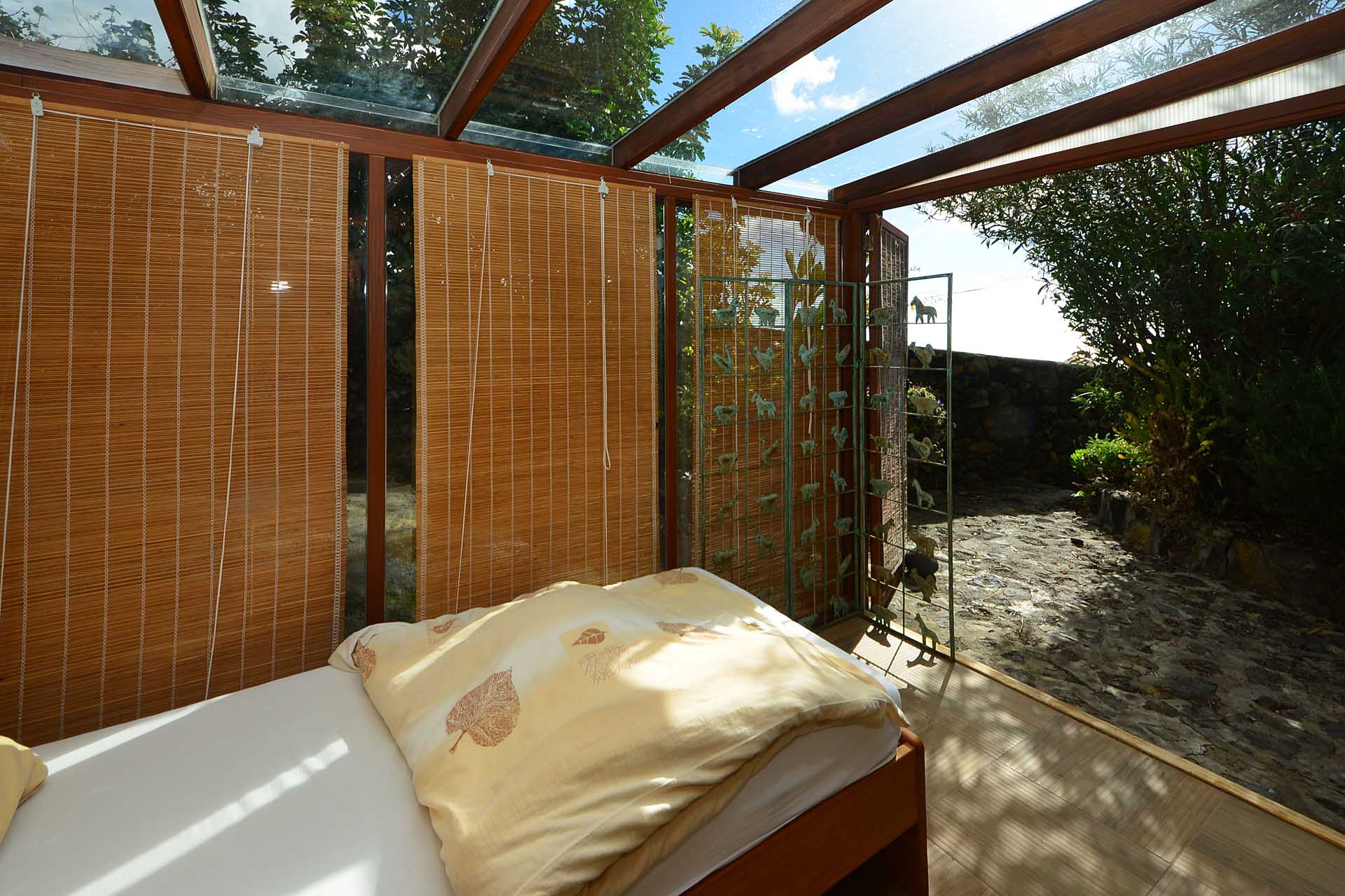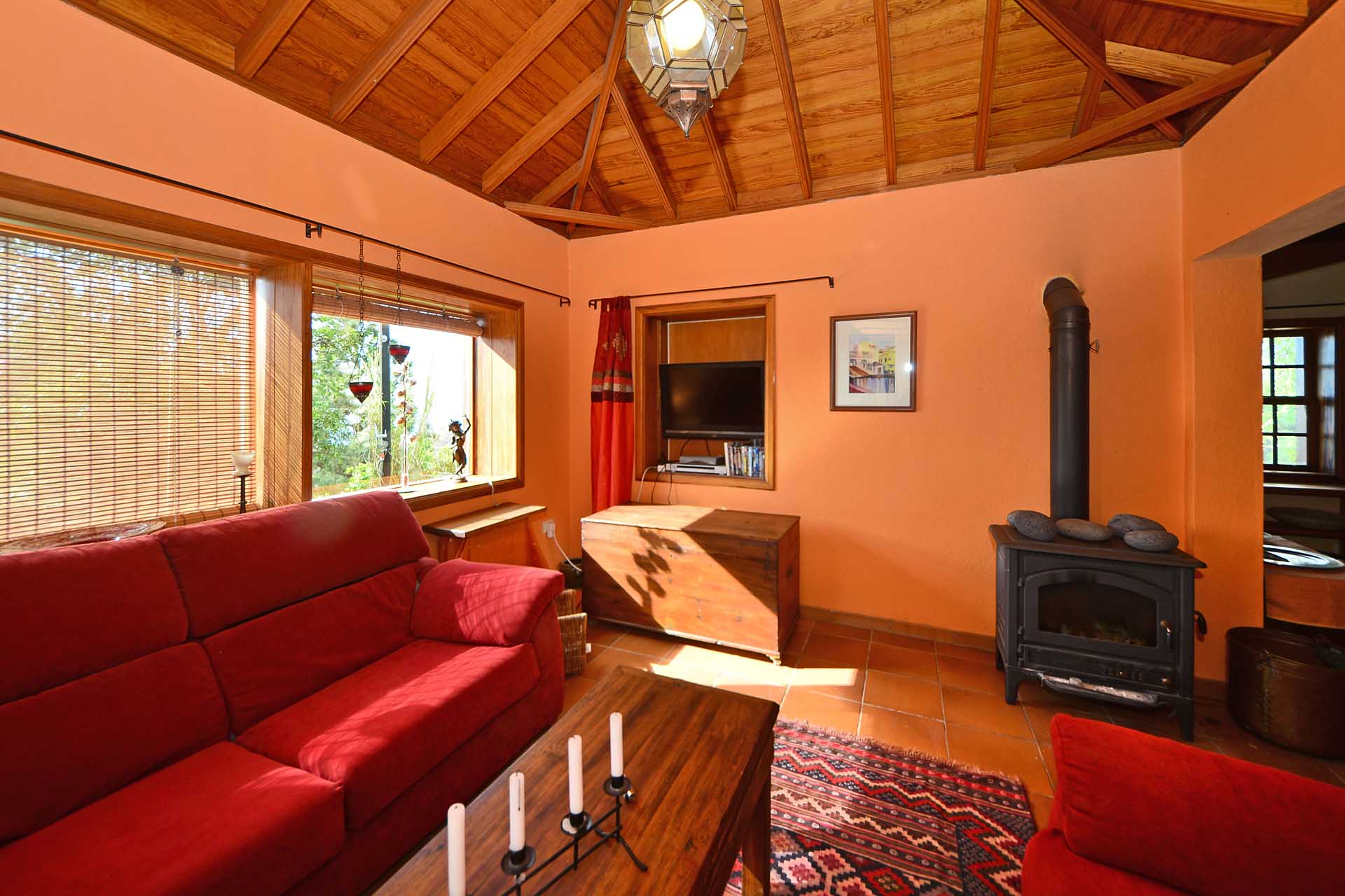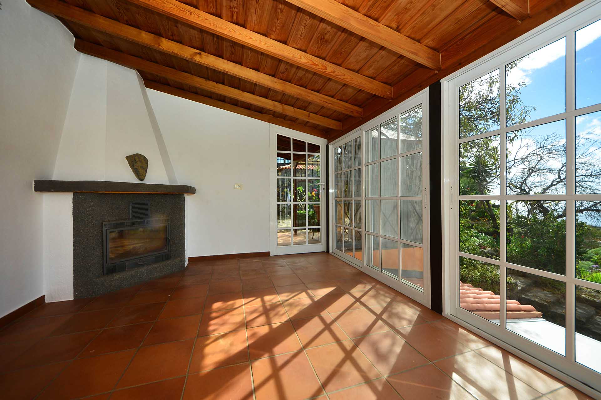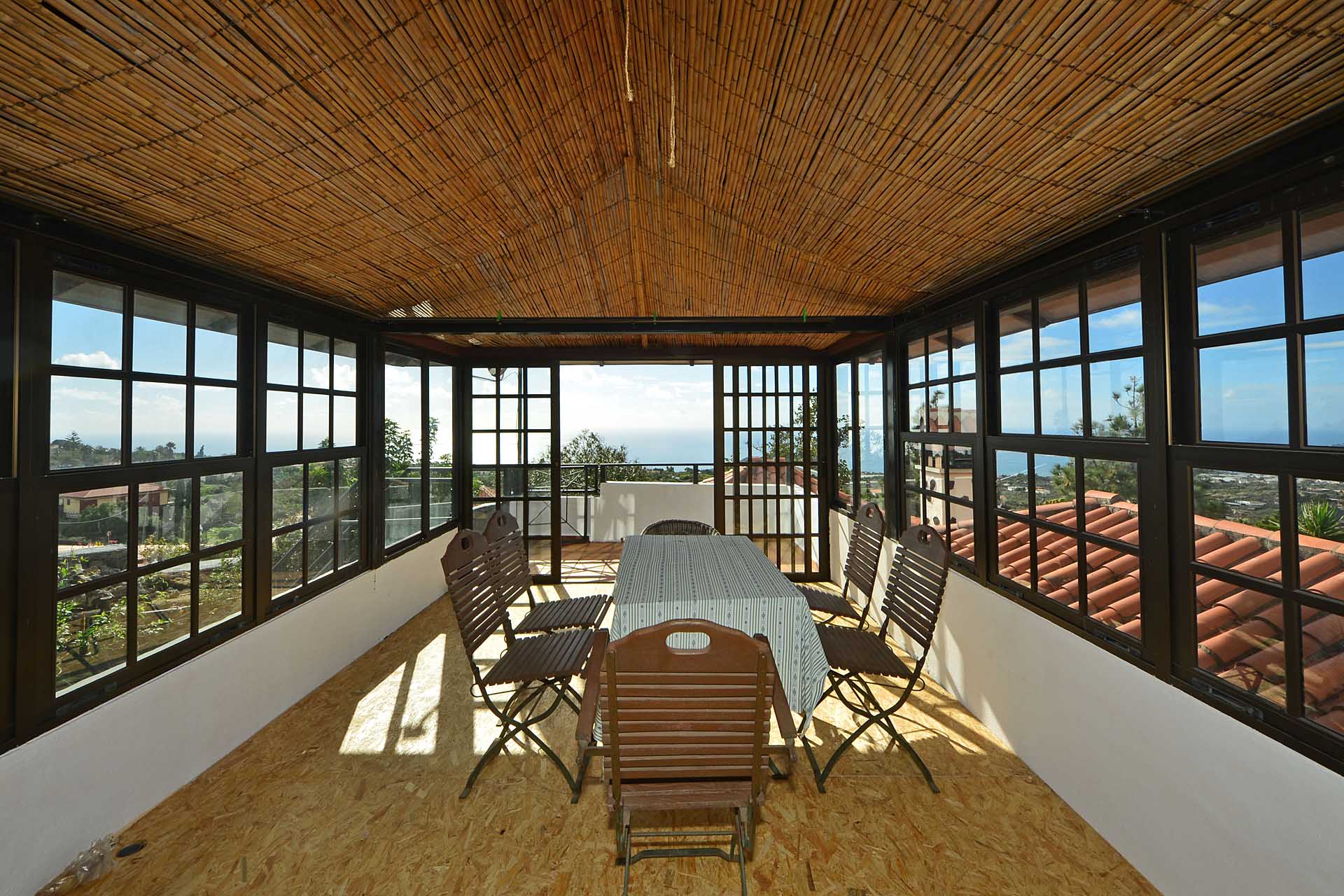 Das Gästehaus kann ebenfalls über zwei separate Parkplätze und separate Wege erreicht werden, so dass die in den beiden Stockwerken untergebrachten Gästeapartments separat erreicht werden können und den Gästen größtmögliche Privatsphäre geboten wird. Das Apartment im Obergeschoss besteht aus einem Studio und einem Kaminzimmer mit bodentiefen Panoramafenstern – ein Ausblick, der selbst auf La Palma seines gleichen sucht sowie einem Duschbad. Zum Obergeschoss gehört ein überdachter Frühstücksplatz, der bereits von den ersten Sonnenstrahlen erfasst wird, sowie eine weitere, große und überdachte Terrasse mit einer Außenküche.