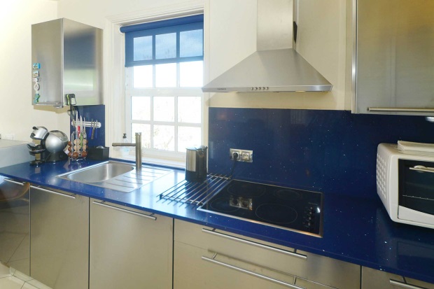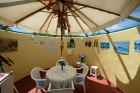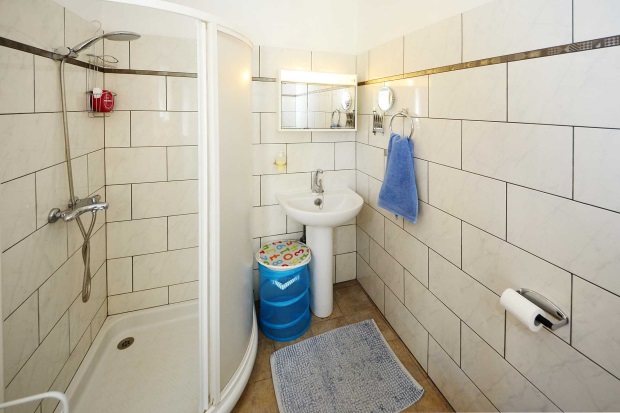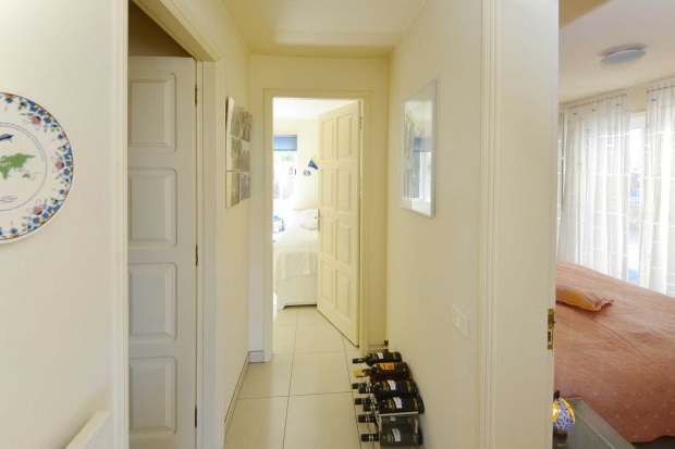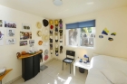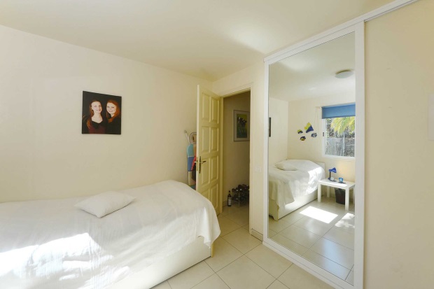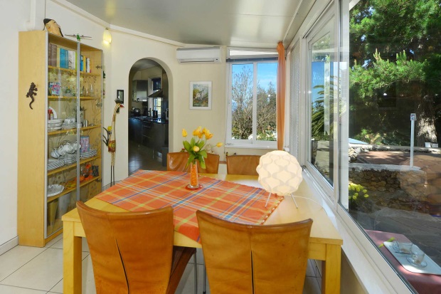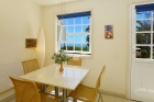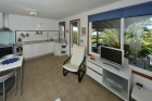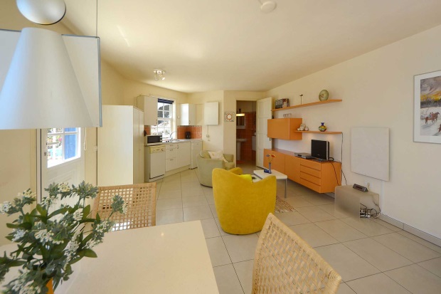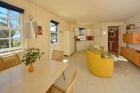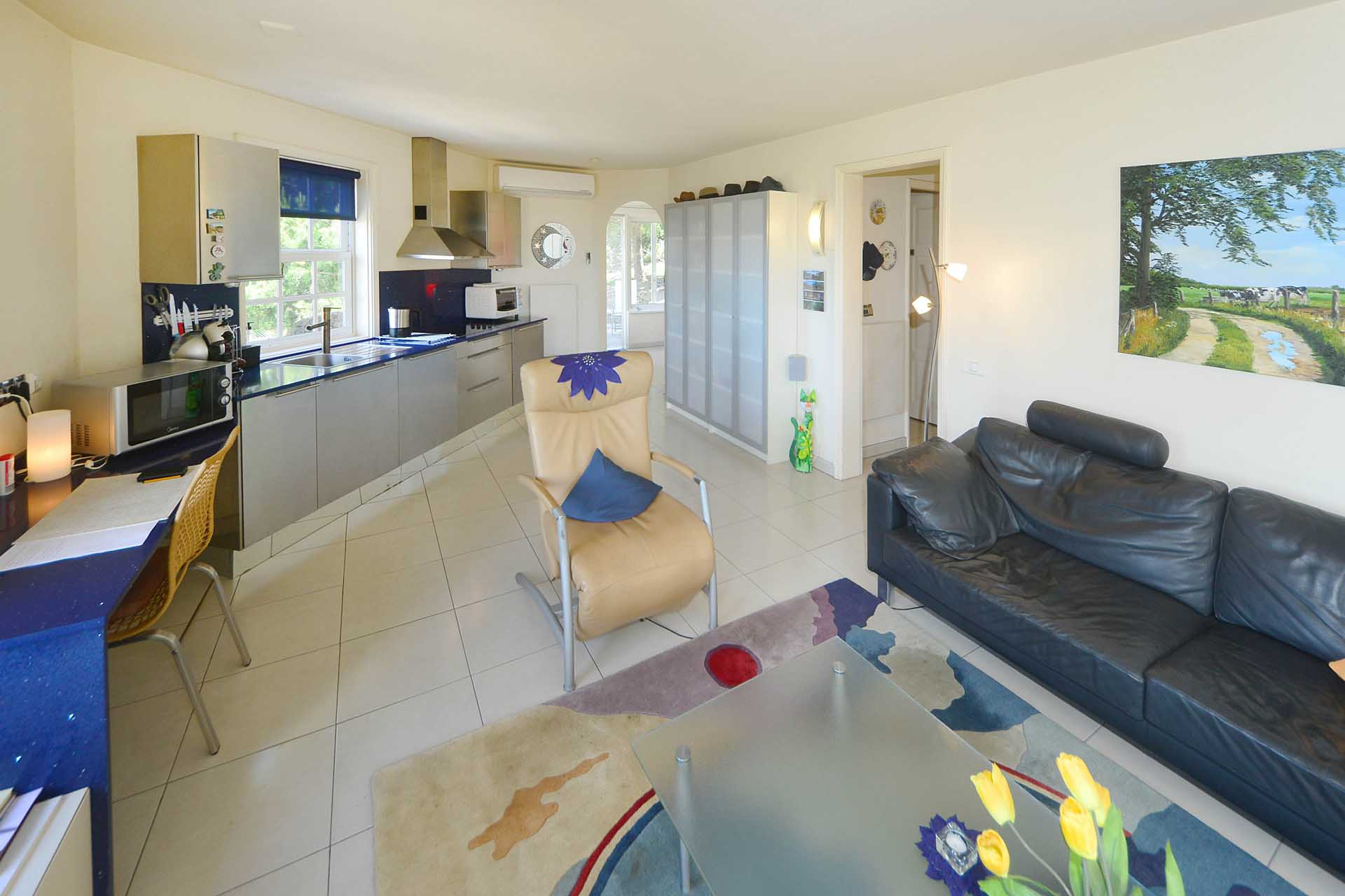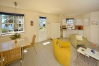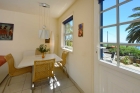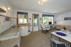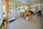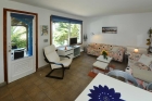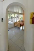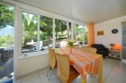Die Eignerwohnung im Obergeschoss beherbergt eine große Wohnküche die in einen ebenfalls großen, Wintergarten ähnlich gestalteten Essraum übergeht. Hier sitzen Sie beim Dinner quasi im Garten, doch die feste Decke schützt vor übermäßiger Sonneneinstrahlung. Natürlich können Sie von diesem Raum ebenerdig den Garten mit seinen diversen Terrassen erreichen, so dass Sie jederzeit zwischen Sonne und Schatten wählen können. Vom Wohnbereich erreichen Sie einen kleinen Flur, der die beiden Schlafzimmer, das Bad und die getrennte Toilette erschließt.