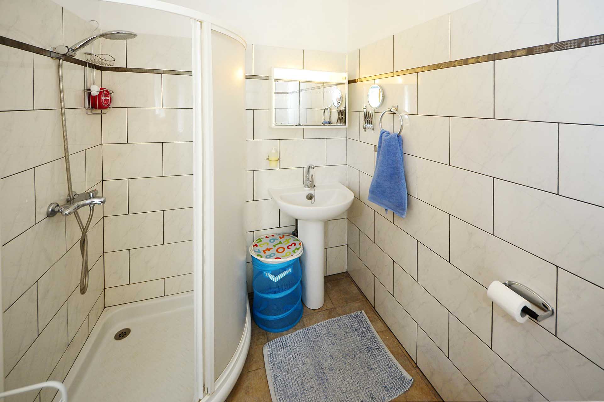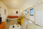 Im Erdgeschoss befindet sich ein ebenfalls sehr schön helles Studio mit kleinem Küchenbereich und Tageslichtbad – Ihren familiären Gästen wird es hier sicherlich gut gefallen, ebenso wie vielleicht einem Dauermieter. Dem Studio steht eine eigene, große geflieste bzw. mit Solnhofner Sandsteinplatten belegte Terrasse zur Verfügung.