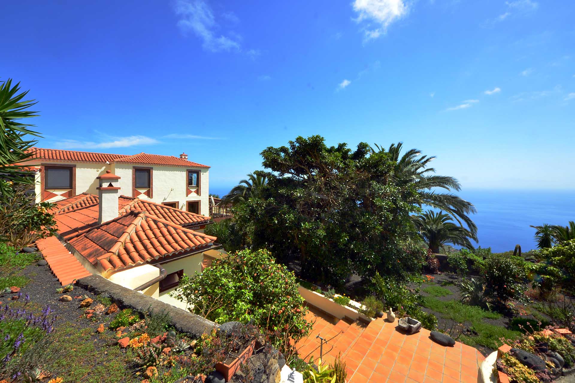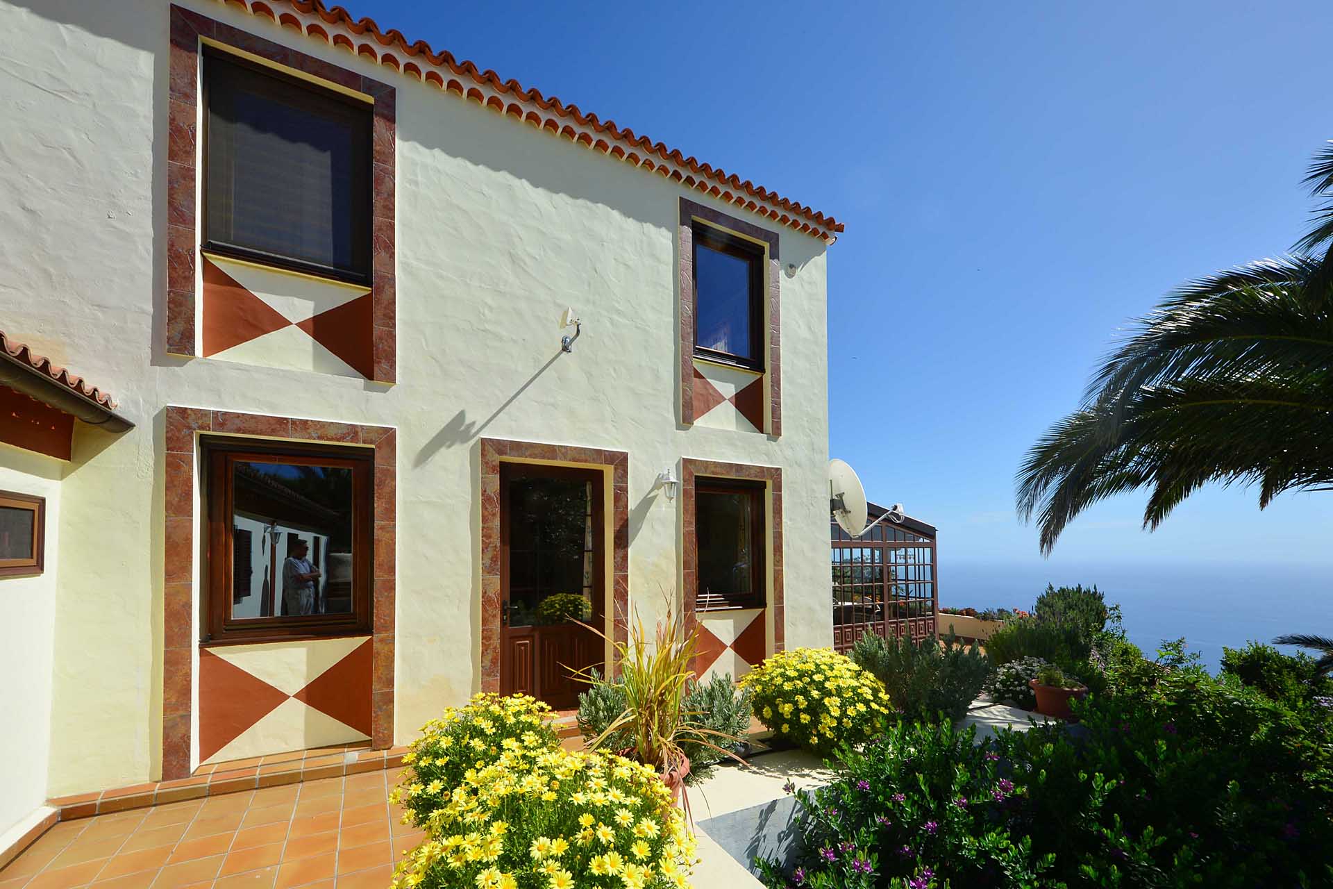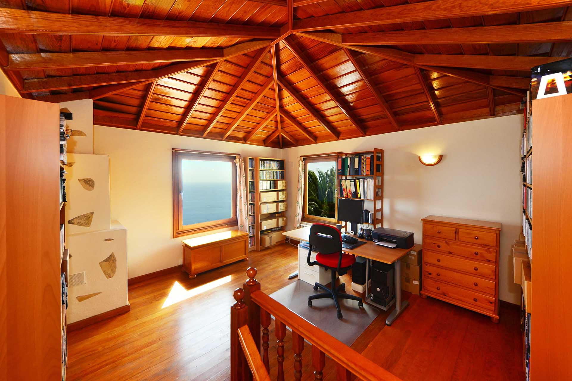 Das zweigeschossige, in kanarischem Stil gebaute Hauptgebäude (165 m²) beherbergt im Erdgeschoss ein gemütliches Kaminzimmer, eine Küche mit Essplatz, einen großen Wohnbereich der derzeit teilweise als Künstleratelier genutzt wird sowie einen Wintergarten und einen Hauswirtschaftsraum. Im Obergeschoss befinden sich ein Arbeitszimmer mit fantastischem Ausblick, ein Wannenbad, ein WC und ein geräumiges und gemütliches Schlafzimmer. Die hohen, kanarischen Dachstühle sorgen für ganzjährig angenehmes Klima und eine heimelige, warme Ausstrahlung. Über eine Treppe gelangt man in die Garage, so dass Sie unmittelbaren Zugang von der Garage in das Haupthaus haben. Auch die Garage wurde mit einem kanarischen Dachstuhl versehen, so dass sie auch zu einem vollwertigen Wohnraum umgebaut werden kann.