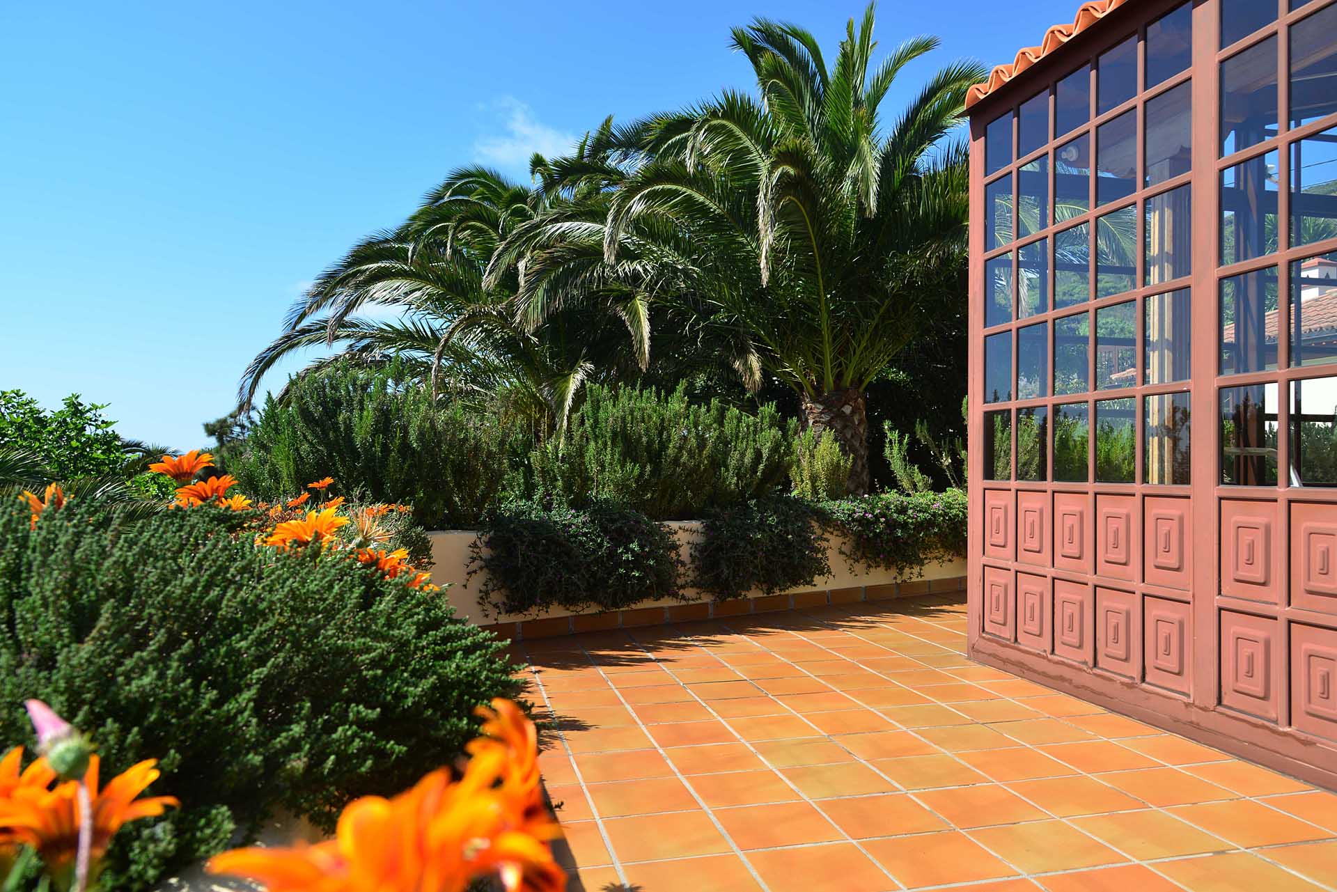 Der Garten ist von hohen Palmen und Zierbäumen beschattet und beherbergt viele Blumen und Zitrusbäume sowie einen Schuppen der früher als Hühnerstall diente. Er ist pflegeleicht angelegt und wird mit drei Bewässerungscomputern automatisch aus der eigenen Zisterne mit preisgünstigem Calderawasser bewässert.