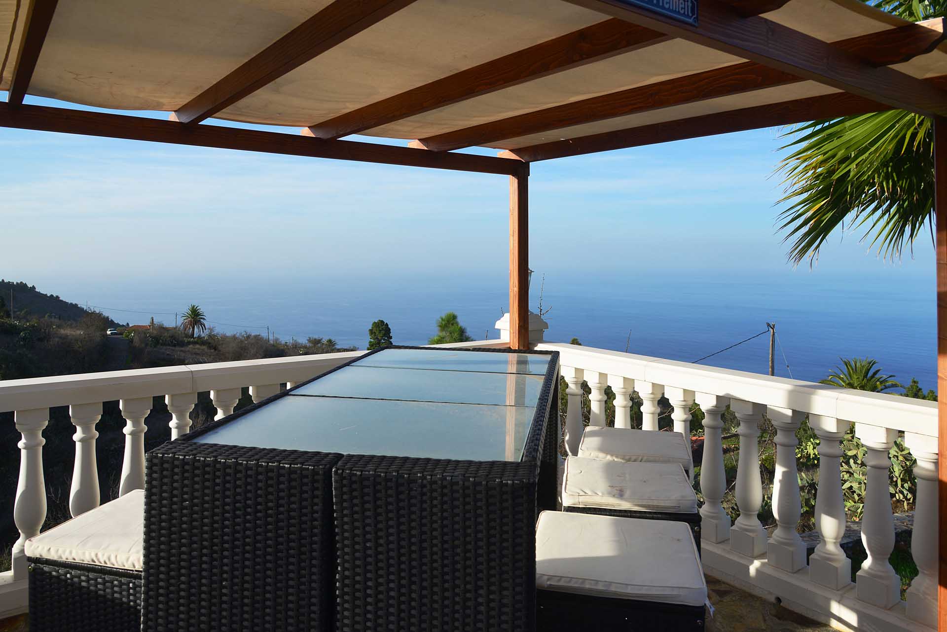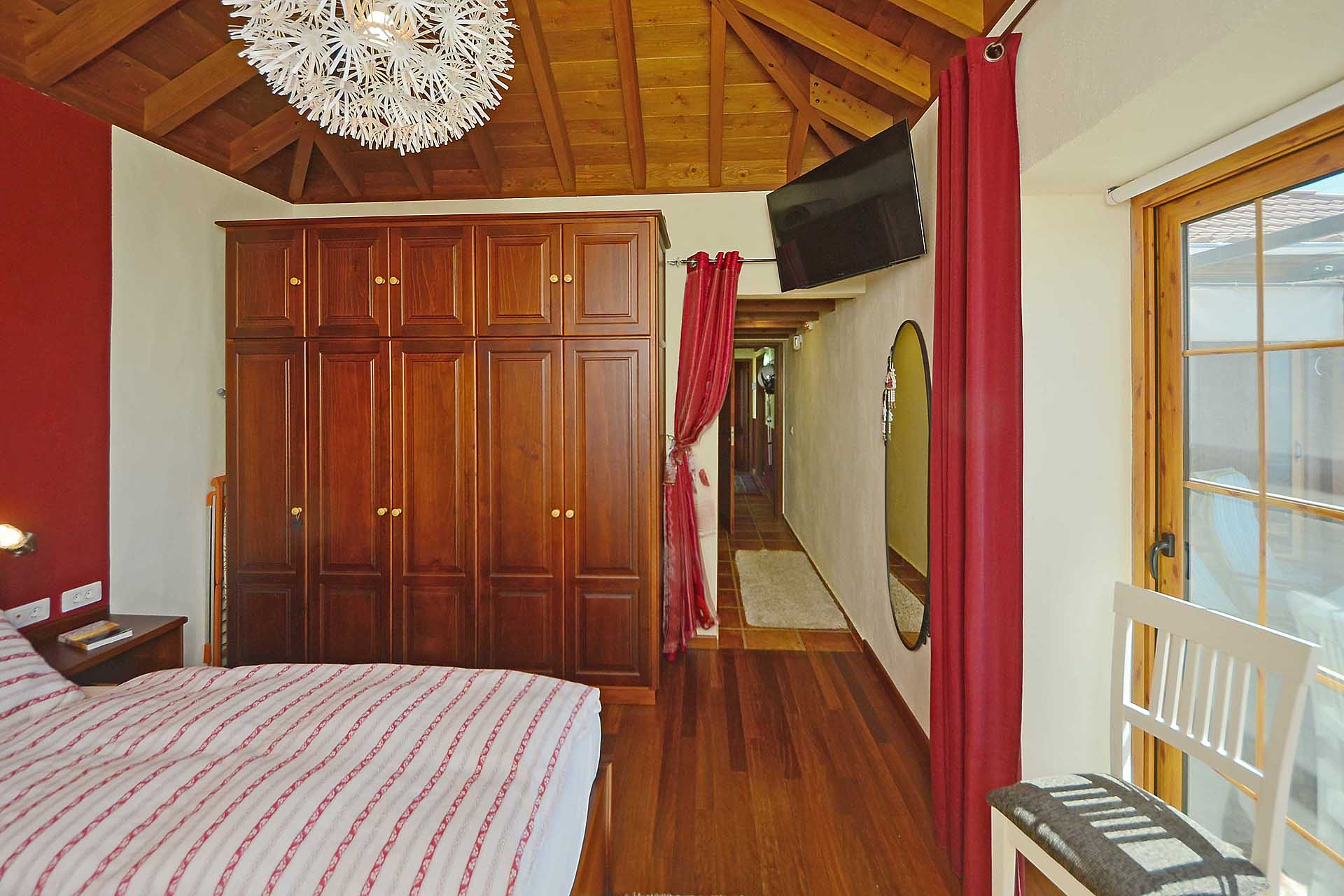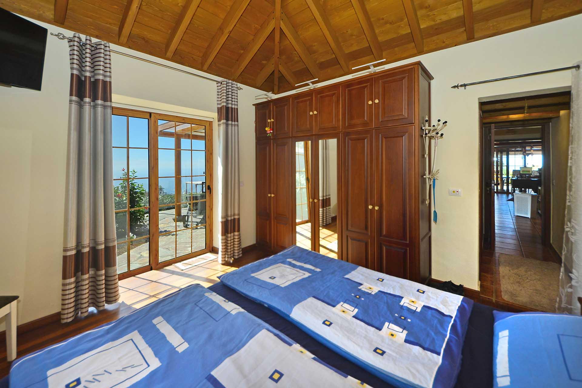 Das Haupthaus betreten Sie durch einen kleinen Windfang, der auch Garderobe aufnimmt und gelangen in das großzügige Wohnzimmer. Dieses gewährt Zugang zu der teilüberdachten und mit variabler Beschattungsanlage versehenen Westterrasse und einem großzügigen Südbalkon, ebenfalls teilüberdacht sowie der sehr gut ausgestatteten Küche mit Essbereich. Auch die Küche gewährt Zugang zum Südbalkon, so dass Sie hier auf kurzem Wege Ihr Essen einnehmen und den herrlichen Rundumblick genießen können. Von der Küche gelangen Sie über einen kleinen Flur zum Masterbad und zum Masterschlafzimmer, ebenfalls mit herrlichem Meerblick und Zugang zur Terrasse.