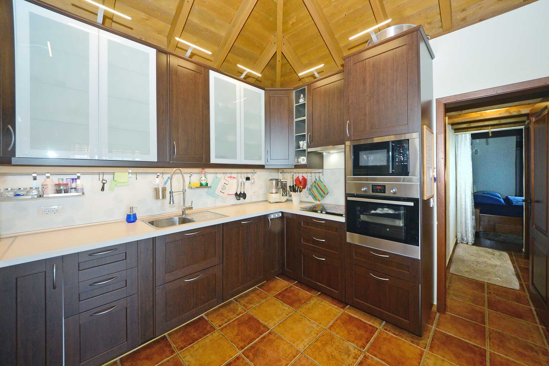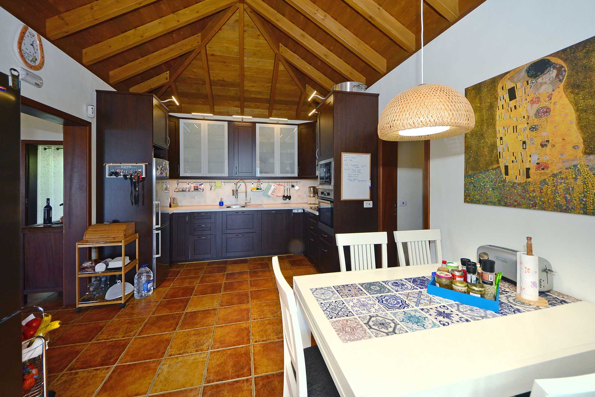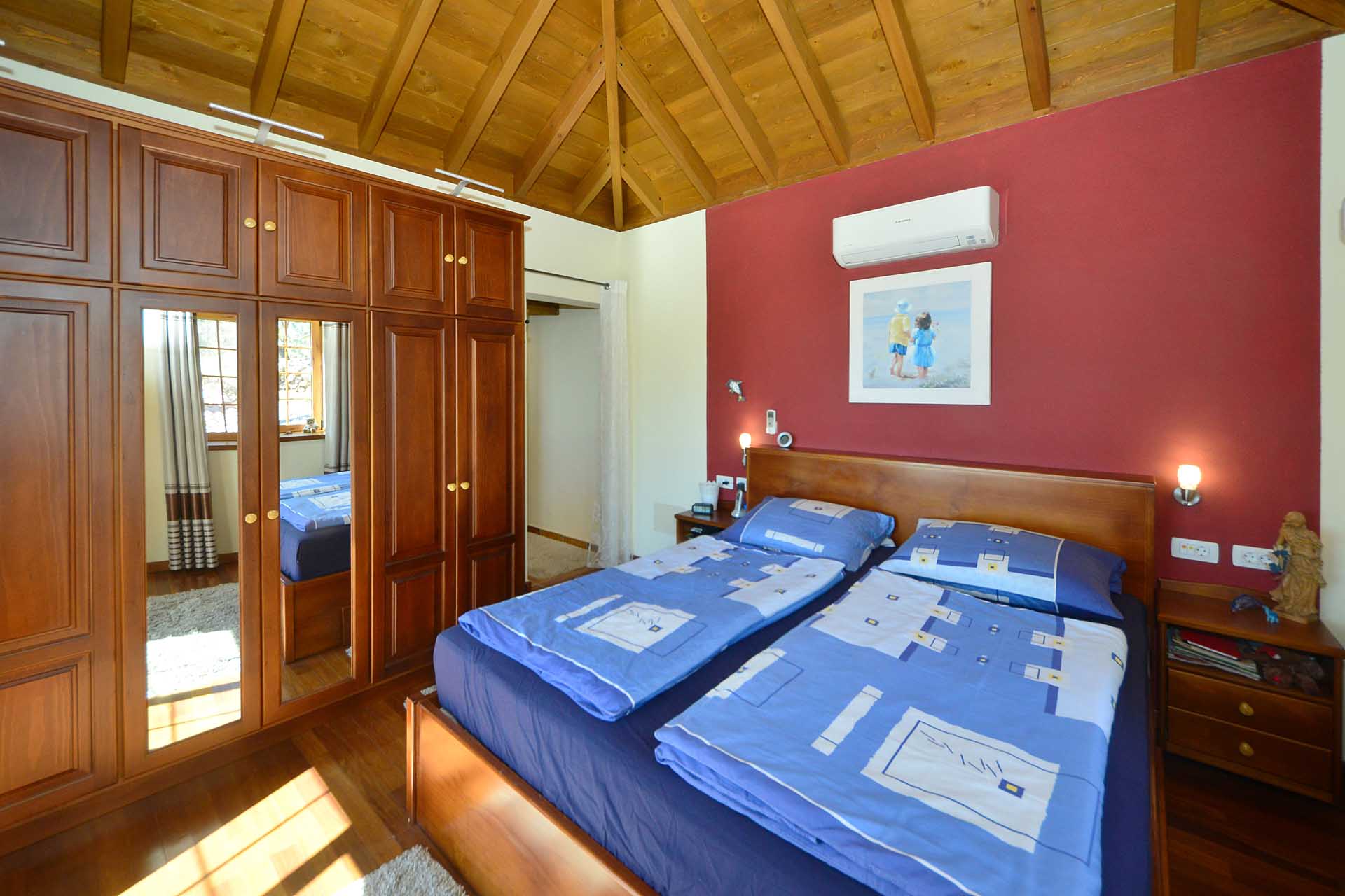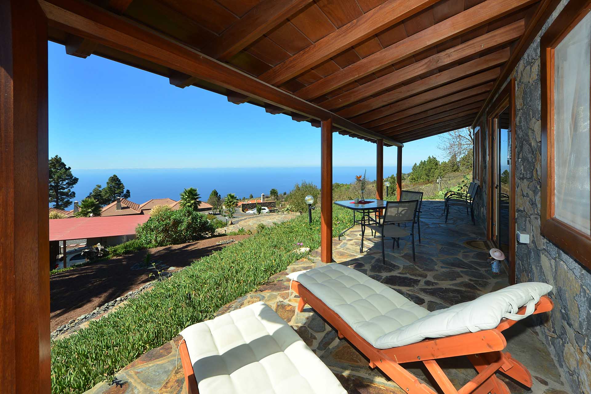 Das Haupthaus betreten Sie durch einen kleinen Windfang, der auch Garderobe aufnimmt und gelangen in das großzügige Wohnzimmer. Dieses gewährt Zugang zu der teilüberdachten und mit variabler Beschattungsanlage versehenen Westterrasse und einem großzügigen Südbalkon, ebenfalls teilüberdacht sowie der sehr gut ausgestatteten Küche mit Essbereich. Auch die Küche gewährt Zugang zum Südbalkon, so dass Sie hier auf kurzem Wege Ihr Essen einnehmen und den herrlichen Rundumblick genießen können. Von der Küche gelangen Sie über einen kleinen Flur zum Masterbad und zum Masterschlafzimmer, ebenfalls mit herrlichem Meerblick und Zugang zur Terrasse.
