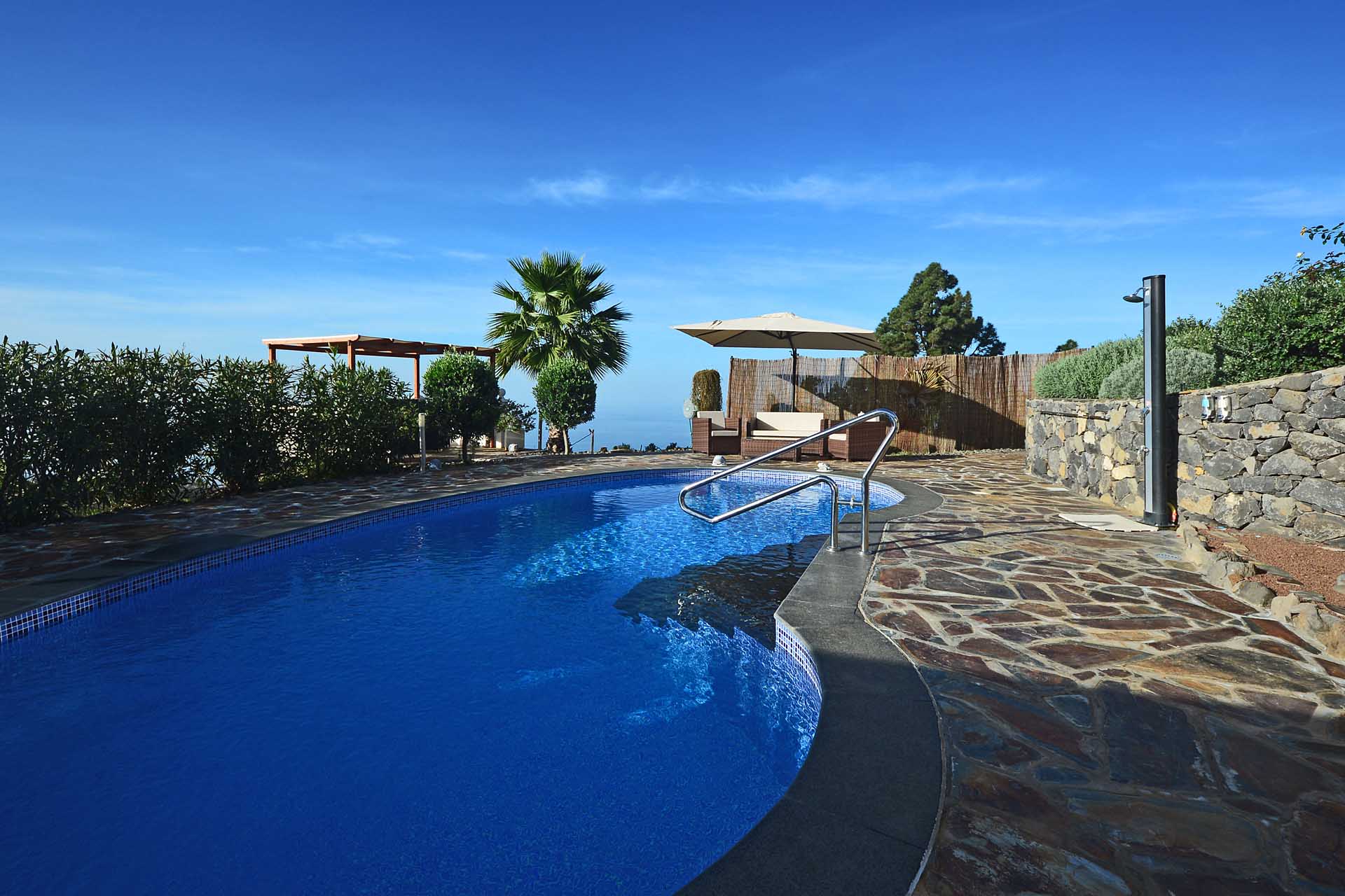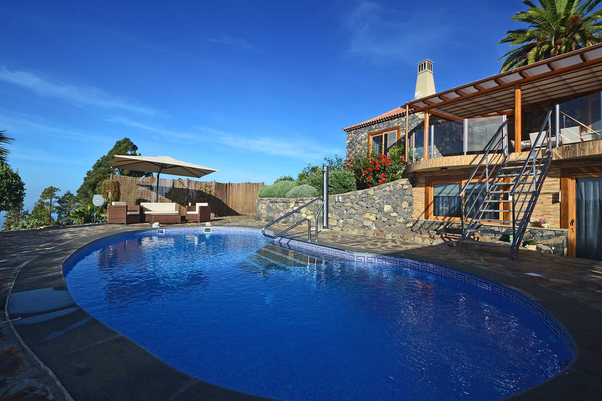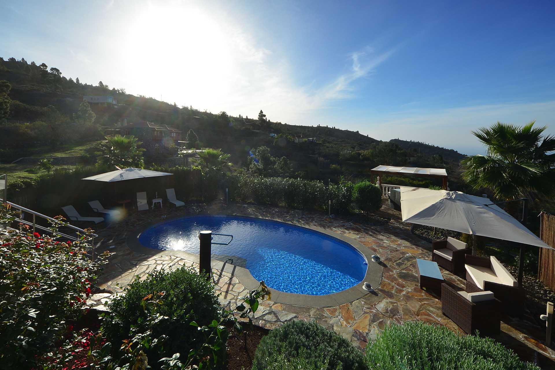 Von hier aus und vom Südbalkon gelangen Sie zur ausgedehnten Poolanlage mit viel Terrassenplatz und einer leistungsfähigen Wärmepumpenheizung, damit Sie auch im Winter uneingeschränkte Badefreuden genießen können. Die leistungsfähige Solaranlage mit ca. 4,5 kW Modulkapazität und eigenem Batteriespeicher produziert bis zu 20 kWh pro Tag und ermöglicht somit einen nahezu energieautarken Betrieb der Finca, lediglich für die Poolheizung muss (je nach Wärmebedürfnis und Wetter) hin und wieder Strom aus dem vorhandenen Netzanschluss verwendet werden.