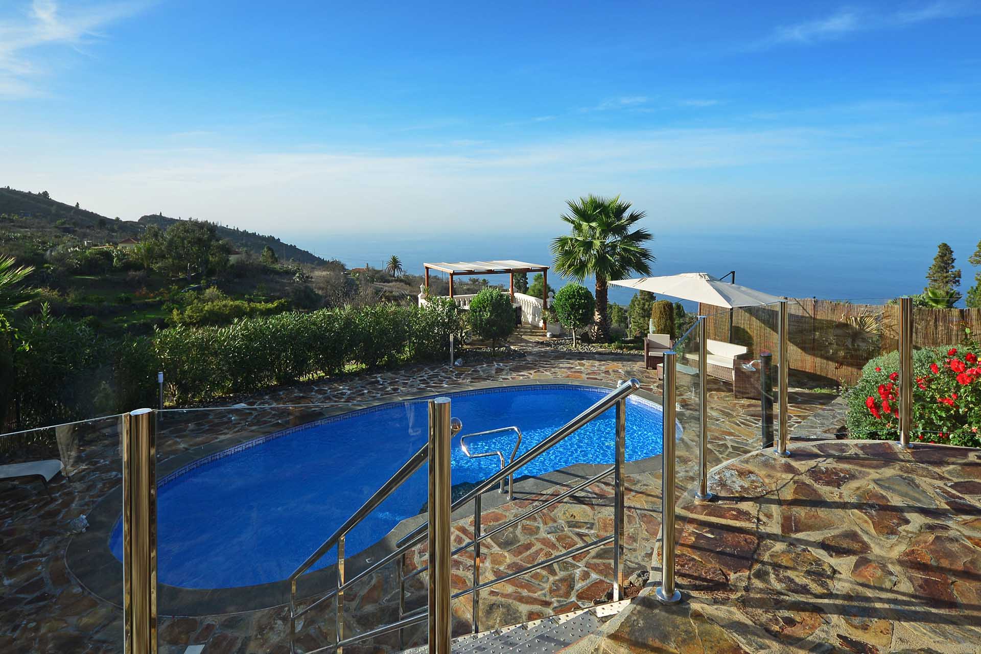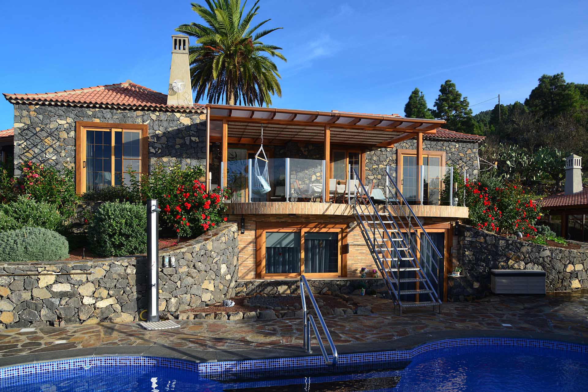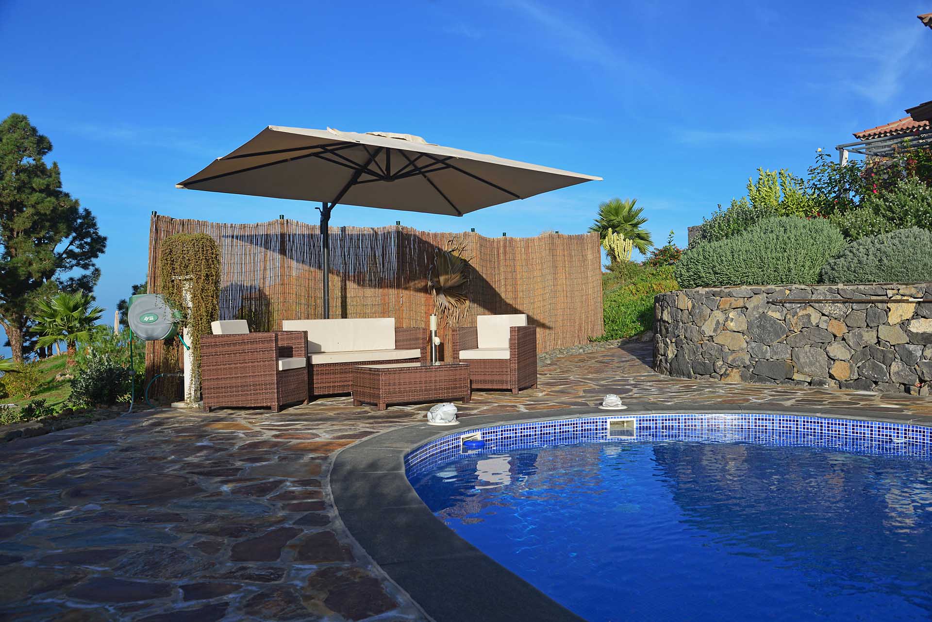 Von hier aus und vom Südbalkon gelangen Sie zur ausgedehnten Poolanlage mit viel Terrassenplatz und einer leistungsfähigen Wärmepumpenheizung, damit Sie auch im Winter uneingeschränkte Badefreuden genießen können. Die leistungsfähige Solaranlage mit ca. 4,5 kW Modulkapazität und eigenem Batteriespeicher produziert bis zu 20 kWh pro Tag und ermöglicht somit einen nahezu energieautarken Betrieb der Finca, lediglich für die Poolheizung muss (je nach Wärmebedürfnis und Wetter) hin und wieder Strom aus dem vorhandenen Netzanschluss verwendet werden.
