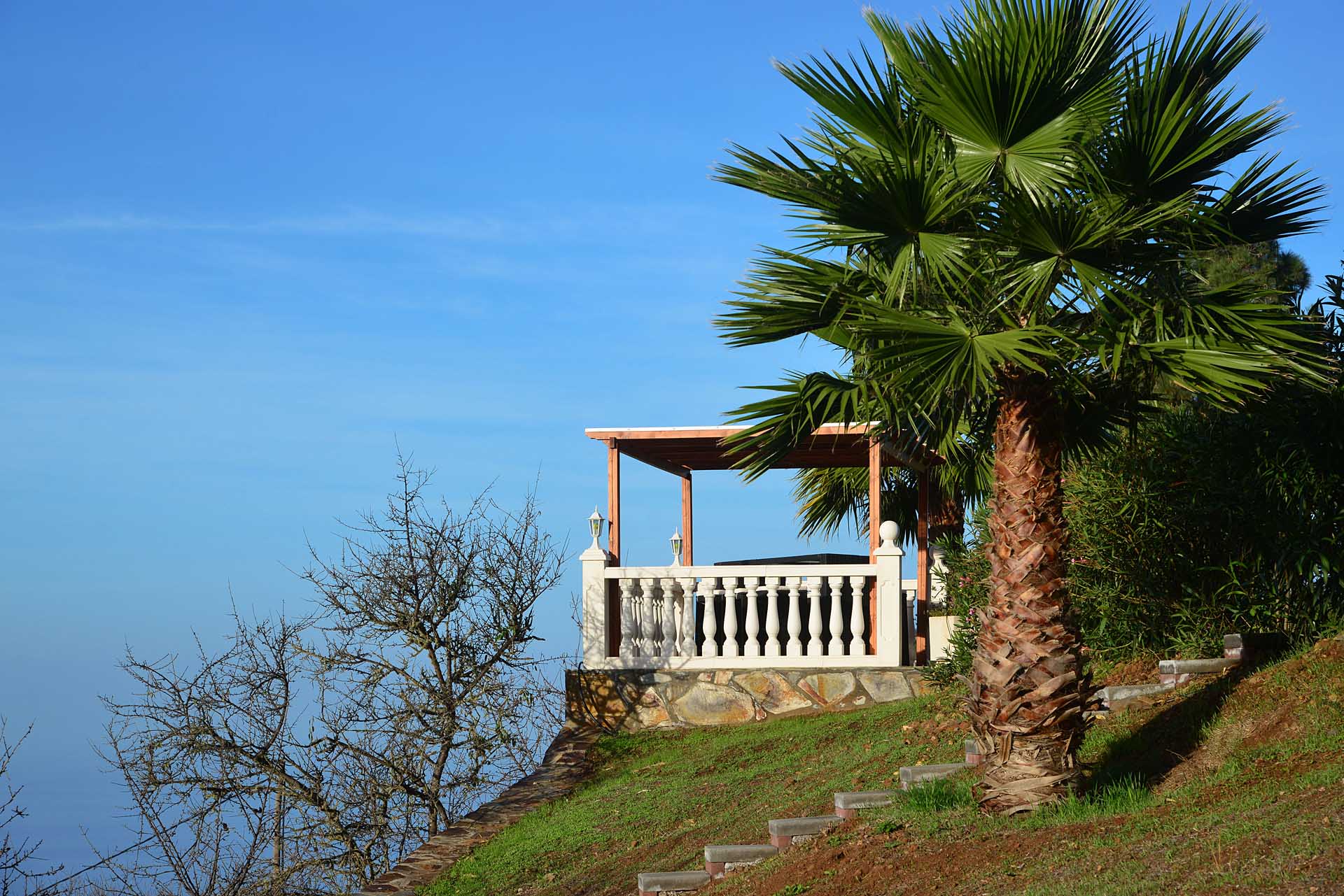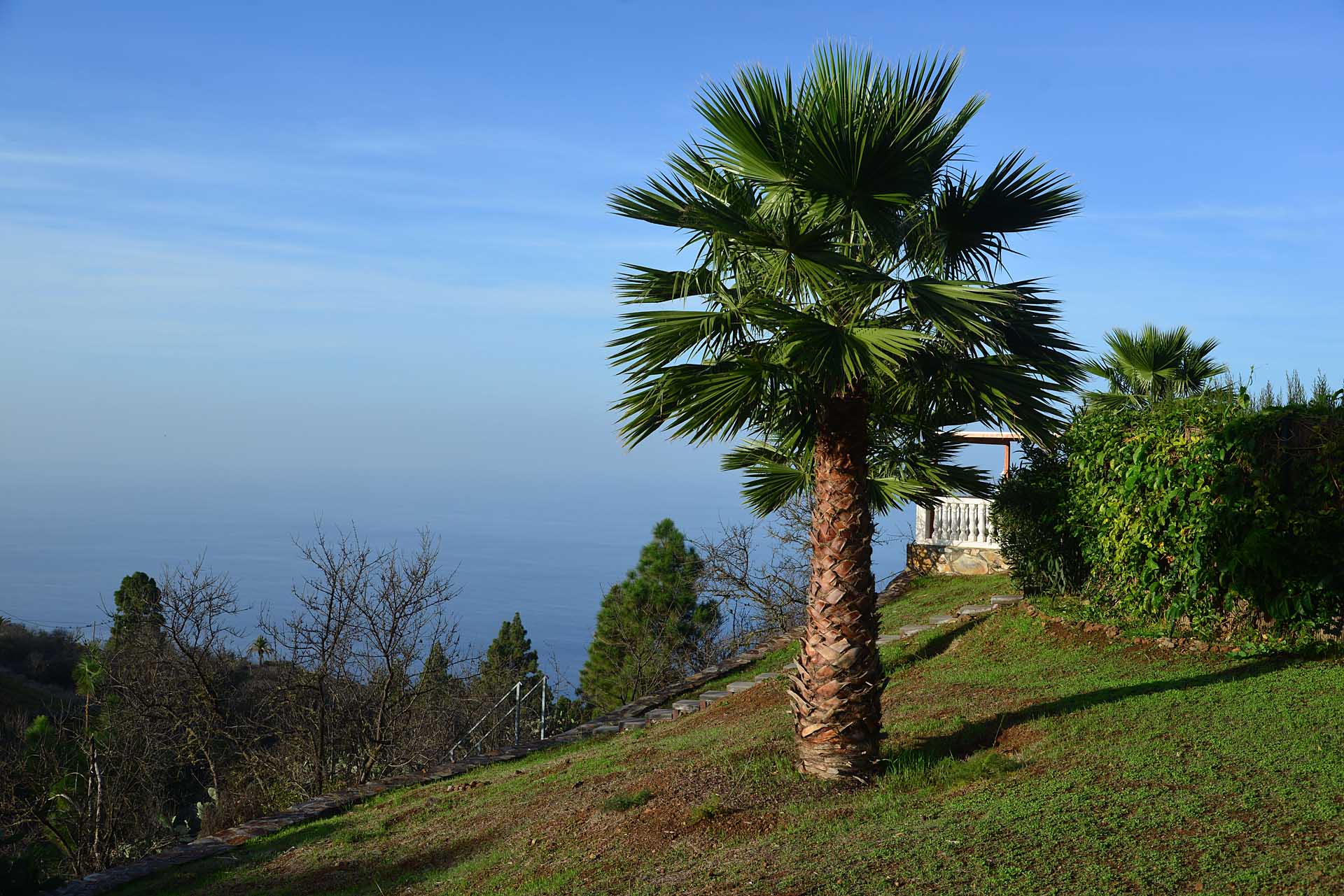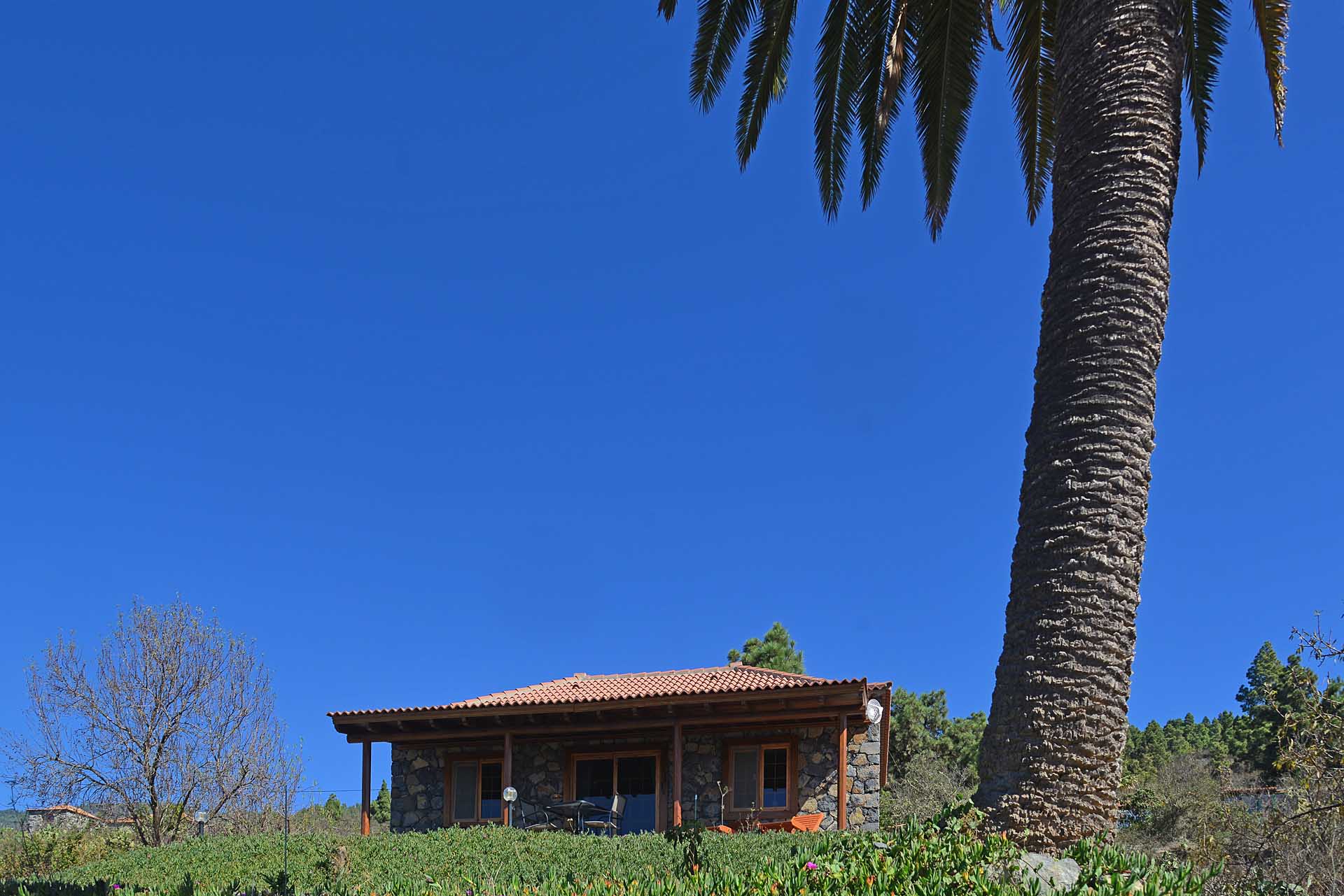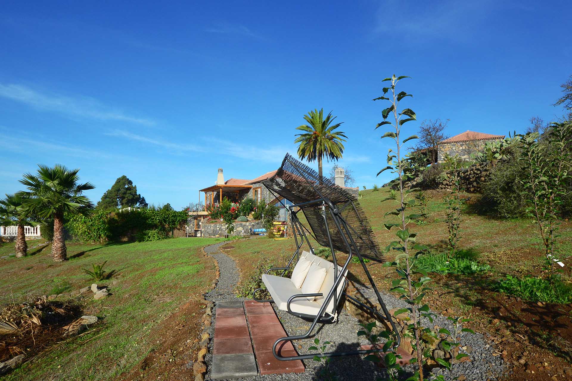 Der Garten wurde liebevoll und pflegeleicht angelegt und beherbergt neben heimischen, teilweise schon sehr großen Palmen, Fruchtbäume, Sukkulenten und Kakteen und bietet noch Platz für eigene Pflanzenträume. Die Wege wurden überwiegend mit Natursteinen ausgestattet, sowohl für das Haupthaus als auch das Gästehaus stehen Parkplätze zur Verfügung, für das Haupthaus auch ein Carport. Das Grundstück ist komplett eingefriedet und mit einem elektrischen Rolltor mit Videoüberwachung ausgestattet.