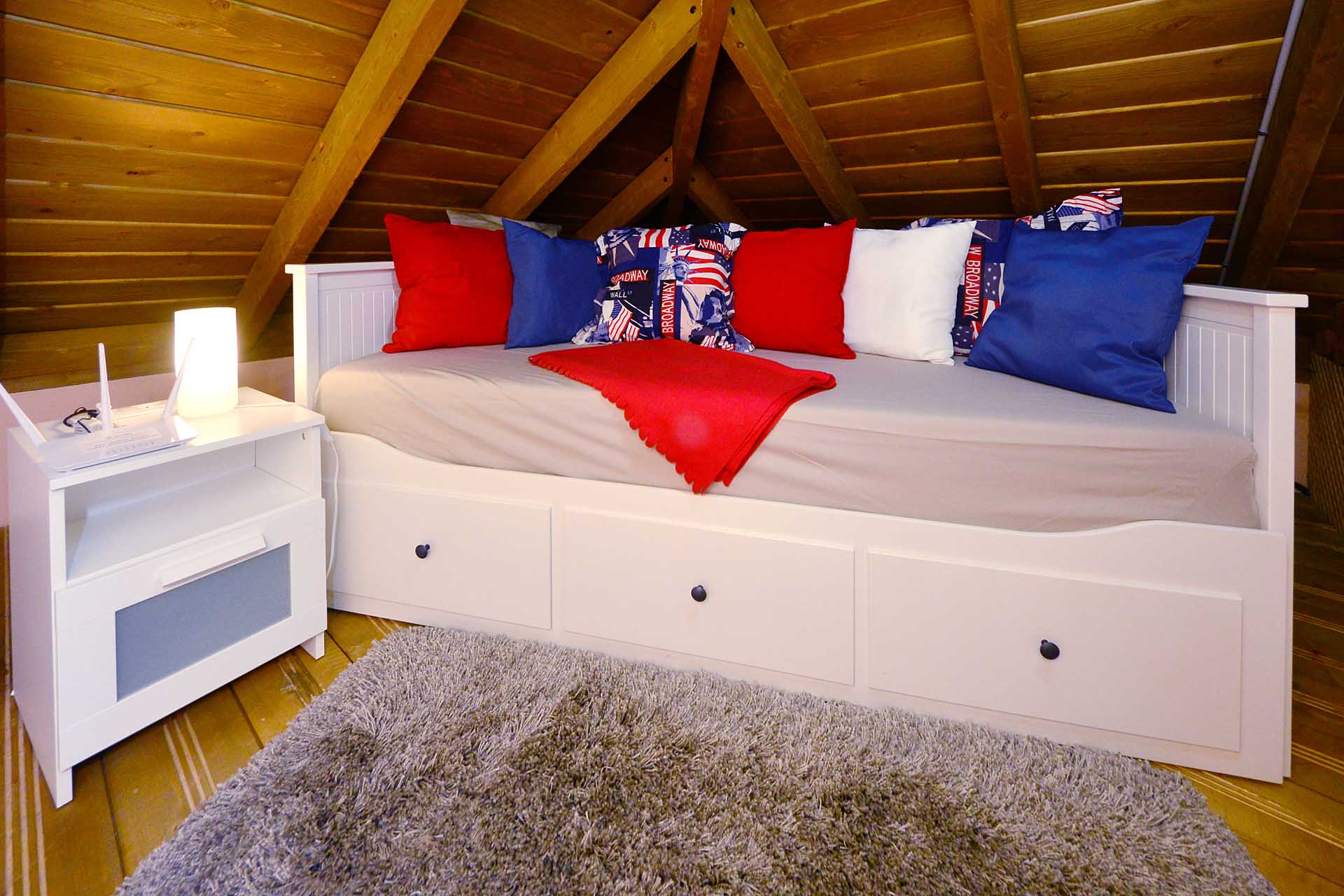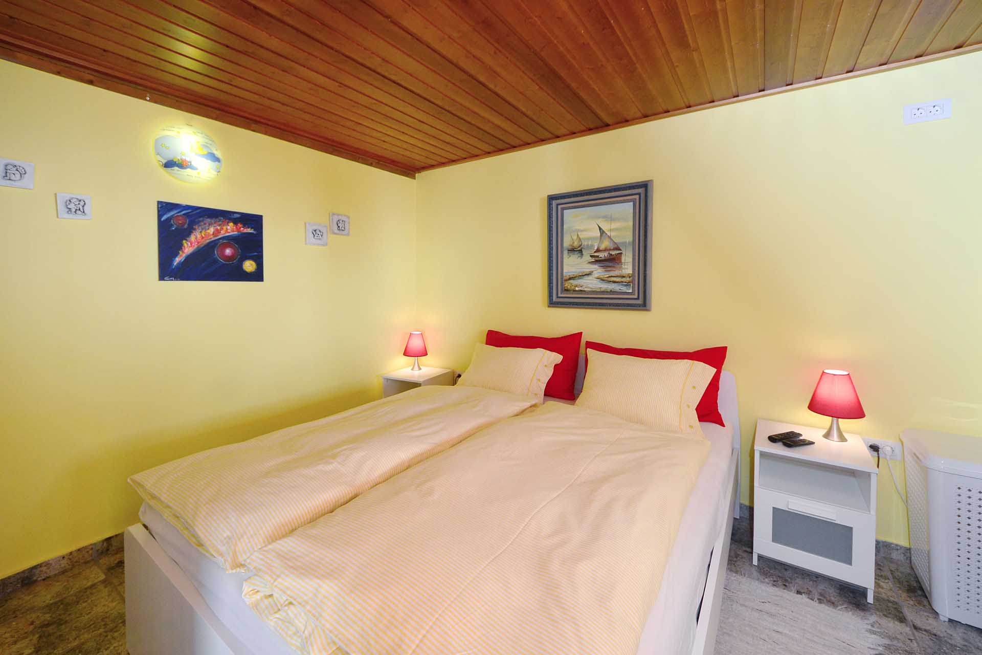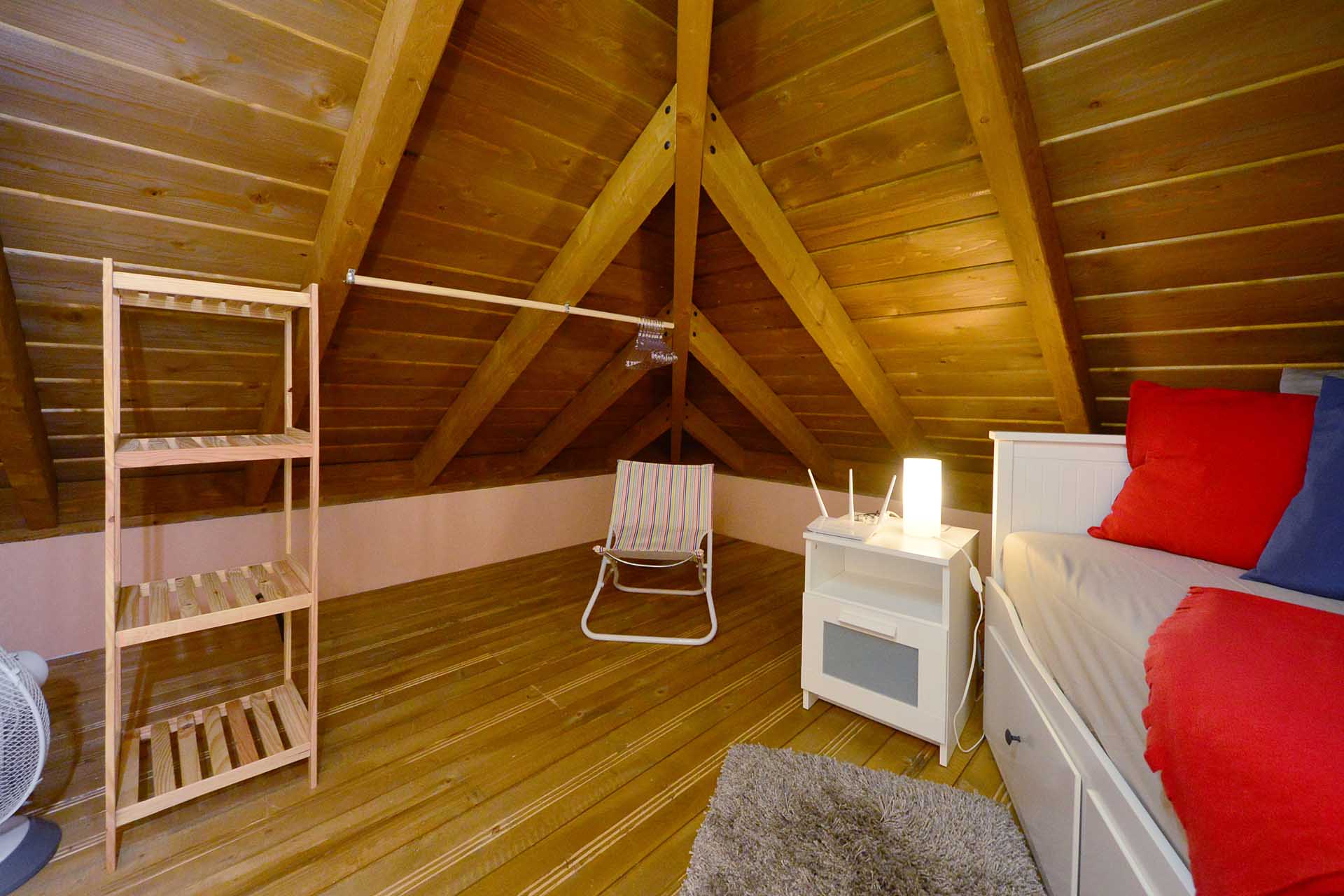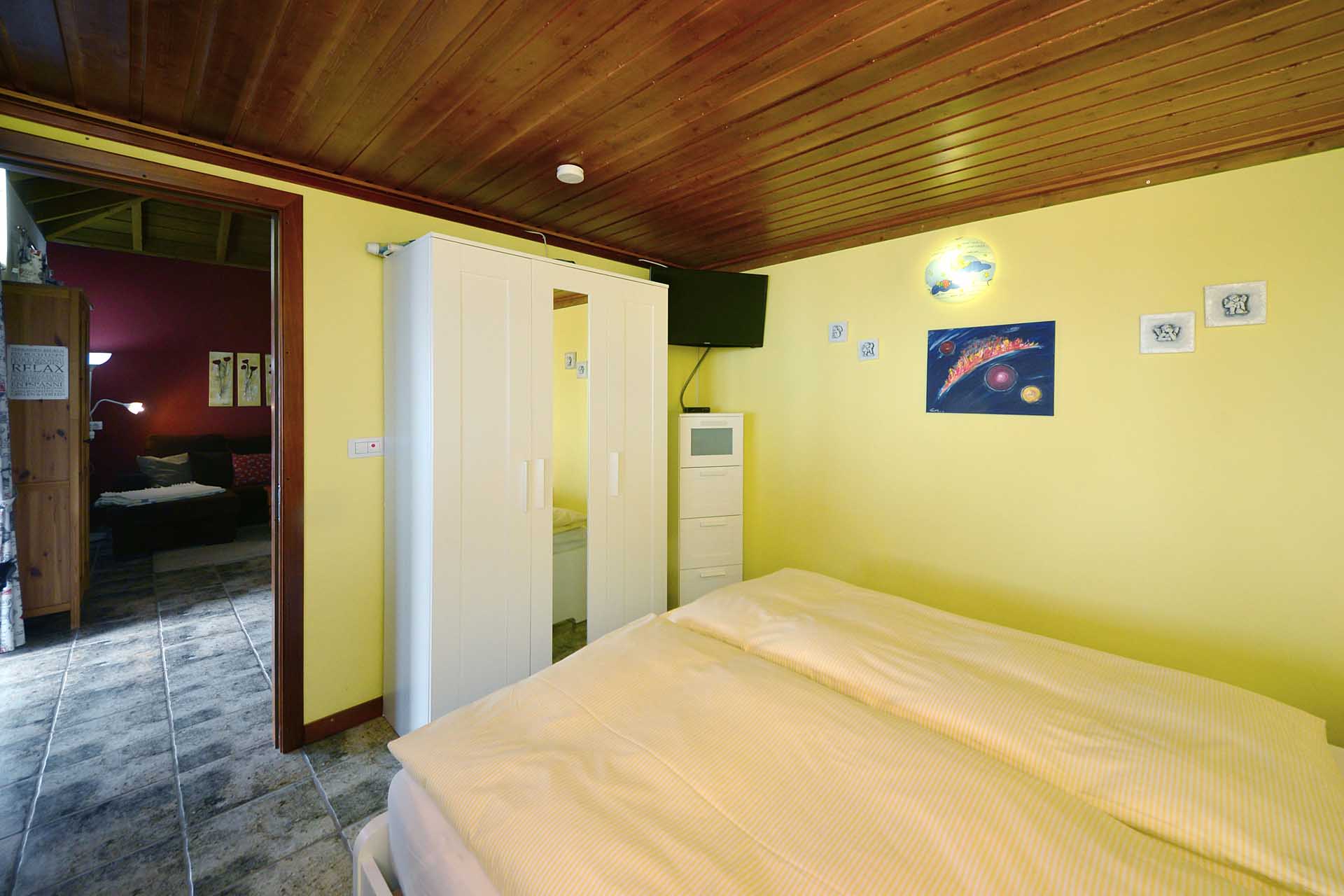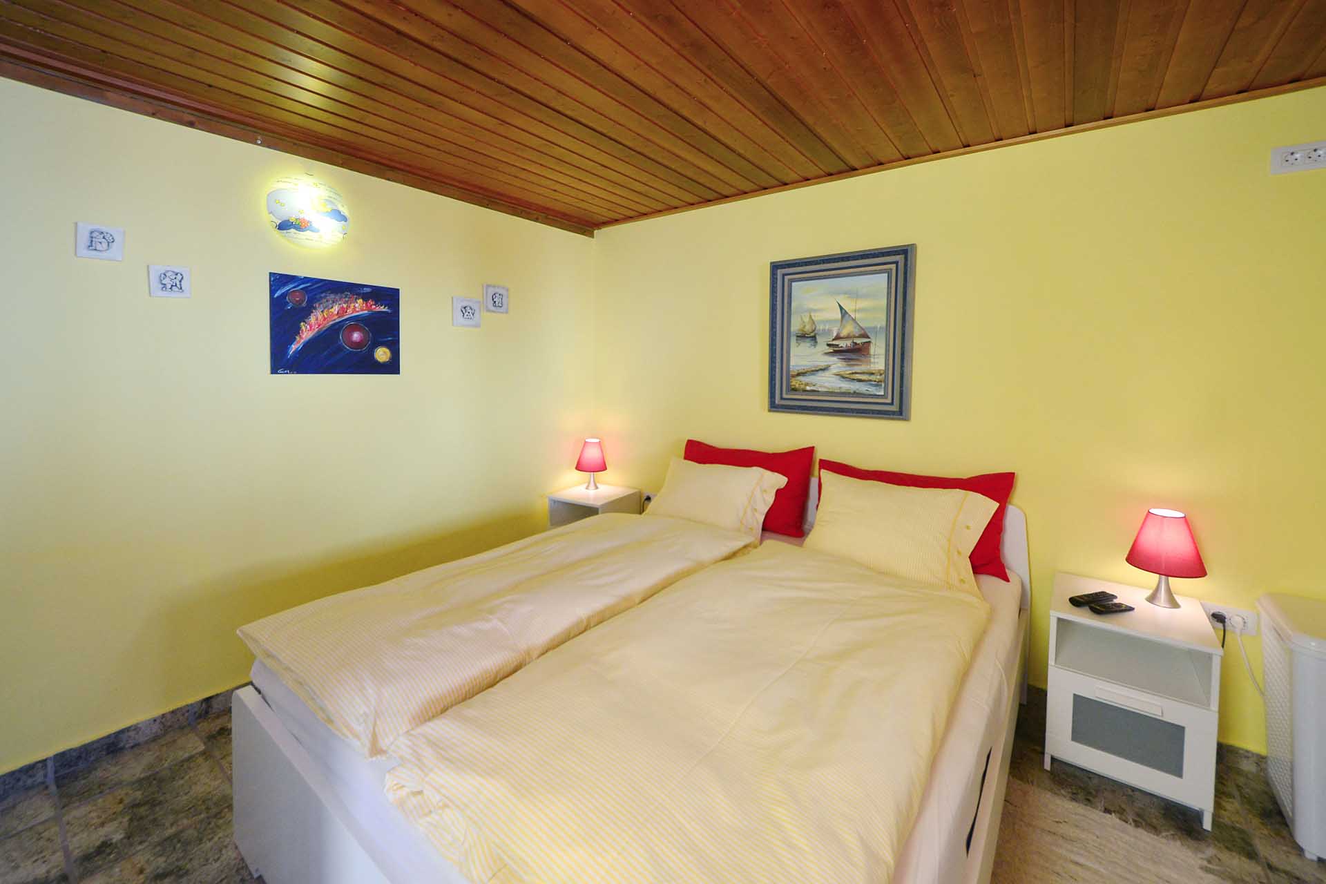 Auf der westlichen Seite erschließt ein kleiner Flur das Gästebad und das Gästeschlafzimmer, das Zugang zur Westterrasse und zum nach historischem Vorbild Holzbeplankten Wassertank gewährt.