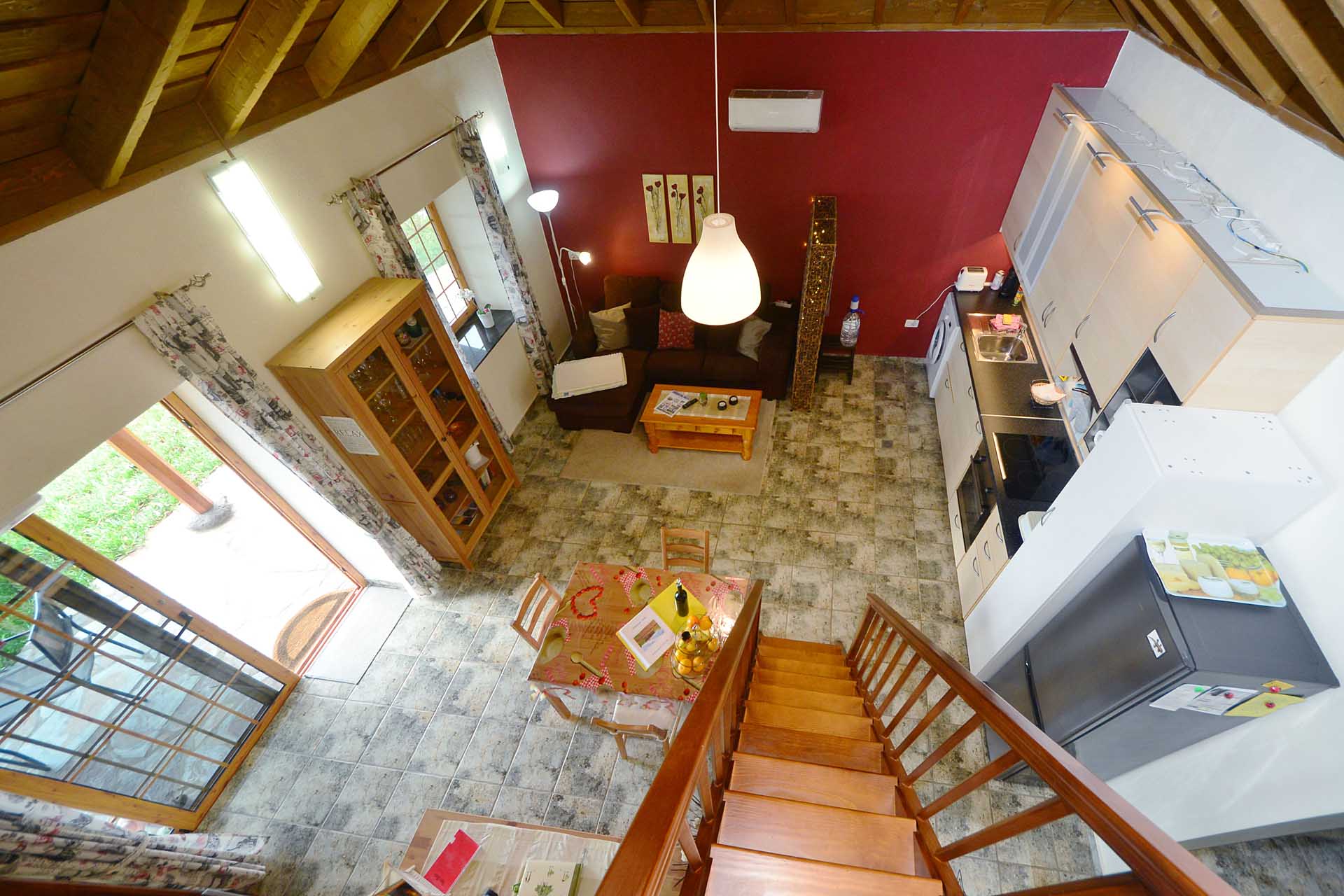 Da die Häuser mit exzellent wärmespeicherndem Blaubasalt errichtet und mit Isolierverglasung ausgestattet sind, müssen sie nur selten geheizt werden. Dafür steht im Haupthaus ein gemütlicher Kaminofen sowie in beiden Häusern Wärmepumpen-Klimaanlagen mit Heizfunktion zur Verfügung.