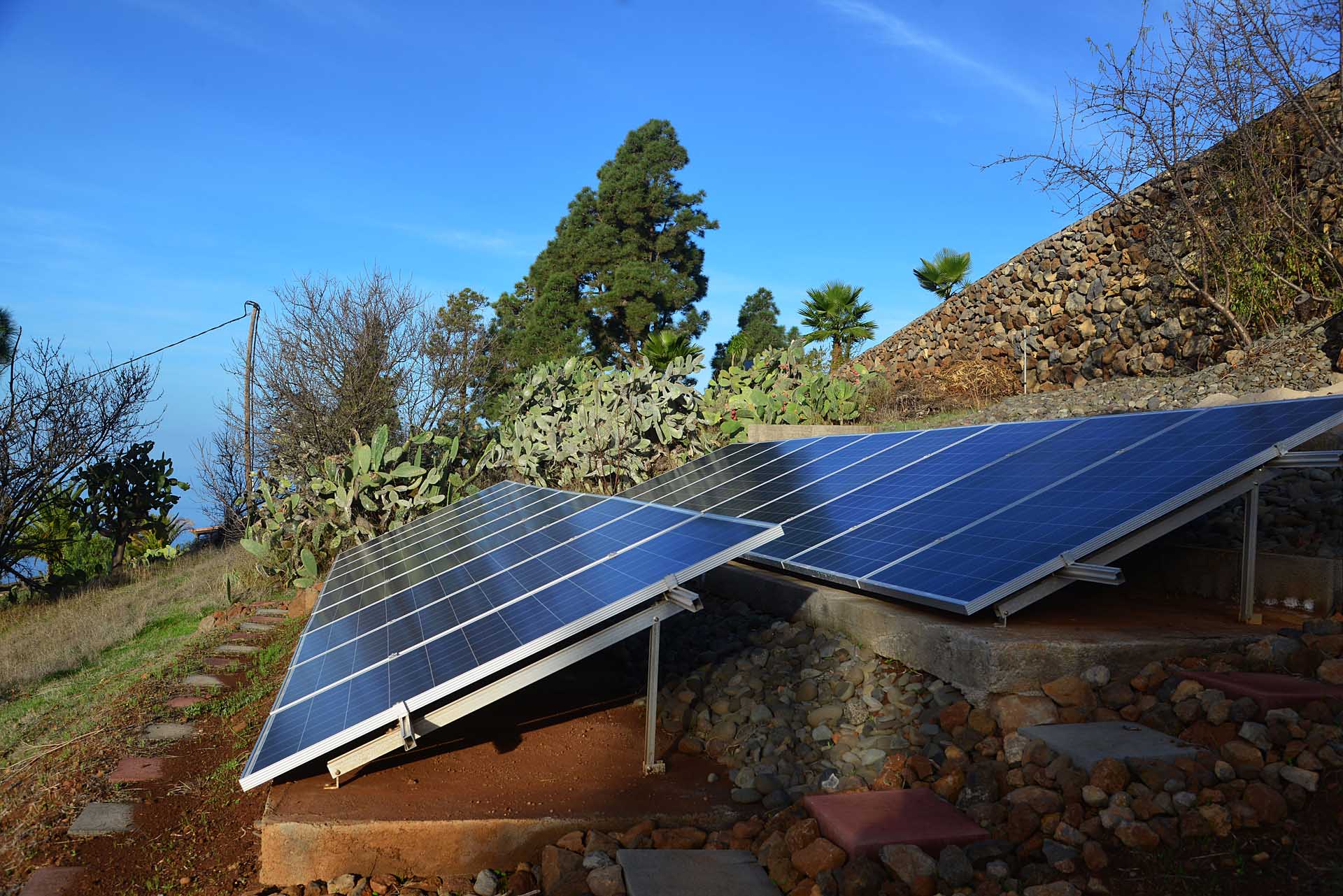 Die Finca ist neben der solaren Stromversorgung auch an das öffentliche Stromnetz angeschlossen, so dass sie jederzeit sicher mit elektrischer Energie versorgt ist. Sie ist selbstverständlich an das öffentliche Stadtwassernetz angeschlossen, für den Garten steht ein Anschluss an das Galeriewassersystem mit einer gemieteten Wasseraktie und eigener Zisterne zur Verfügung. Festnetz Telefon und Internetanbindung wurden mit einem neuen Richtfunksystem eingerichtet.