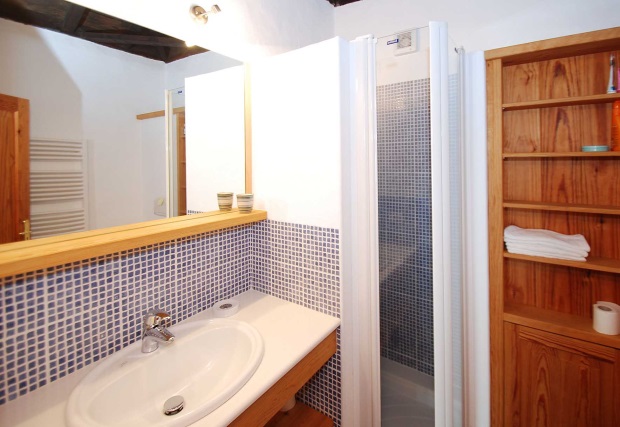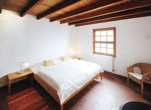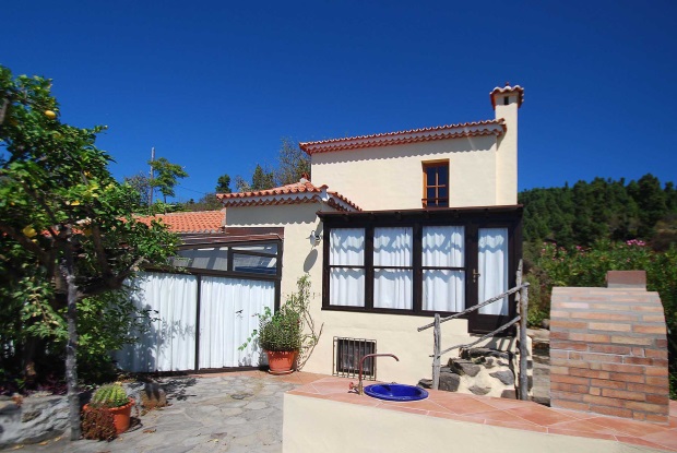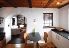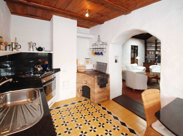 Das Wohnhaus wurde sehr gefühl- und geschmackvoll originalgetreu restauriert und mit modernem Wohnkomfort ausgestattet. Wie auf La Palma üblich betritt man das Haus über einen kleinen Flur und die Küche. So ist der Weg mit Weinglas oder Kaffeepott zur Terrasse kurz, um den fantastischen Meerblick zu genießen. Die Küche wurde authentisch in die altkanarische Umgebung eingepasst, dabei wurden moderne Elemente zurückhaltend mit historischen kombiniert. So findet sich neben dem Edelstahlherd und der Spülmaschine auch ein originalgetreu gebauter Holzofen aus Klinker für die ganz gemütlichen Abende, z.B. mit gerösteten Esskastanien, direkt vor der Tür geerntet. Ein kleiner Essplatz für zwei bis drei Personen ist ideal für das schnelle Frühstück in der Küche oder die beliebten Kochhelfer.