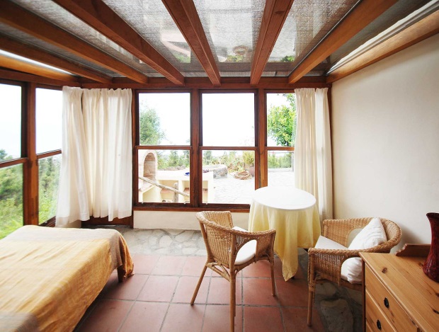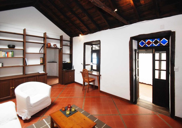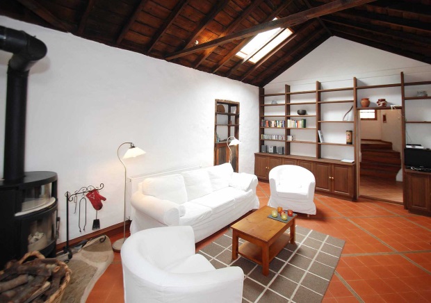 Von der Küche gelangt man in das große und für einen Original-Kanarischen Wohnbau ungewöhnlich hohe Wohnzimmer. Der Dachstuhl aus unvergänglichem Teaholz wurde erhalten und sehr schön restauriert. Diese spezielle kanarische Dachkonstruktion in Kombination mit den dicken Natursteinmauern klimatisiert das Gebäude außerordentlich gut auf natürliche Weise: An heißen Tagen steigt die Wärme in den hohen Dachstuhl und die Natursteine nehmen sie auf. An kühlen Tagen geben die ca. 80 cm starken Wände die gespeicherte Wärme wieder ab. Das Wohnzimmer wurde mit liebevollen Details ausgestattet, wie dem typischen Wandregal aus Tea, sowie dem in die Fensternische eingebauten Sekretär. Ein solches Ambiente lädt zum Lesen ein, weshalb auch ein großes Bücherregal in den Raum integriert wurde. Für kühle Tage stehen neben der Gaszentralheizung ein moderner Kaminofen zur Verfügung, sowie der angrenzende Wintergarten, der bei offenstehenden Türen schon ab dem ersten Sonnenstrahl das Wohnzimmer beheizt.